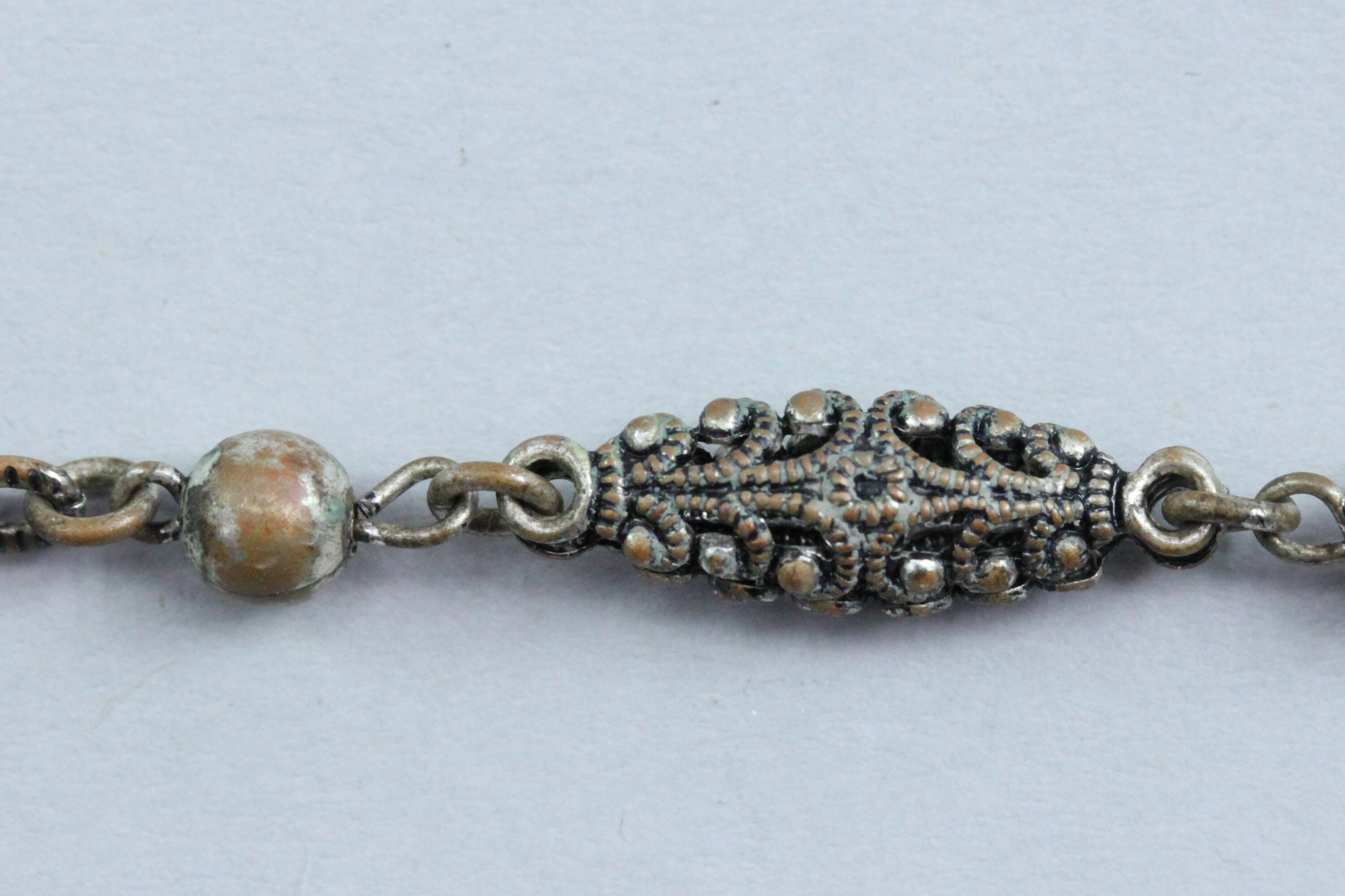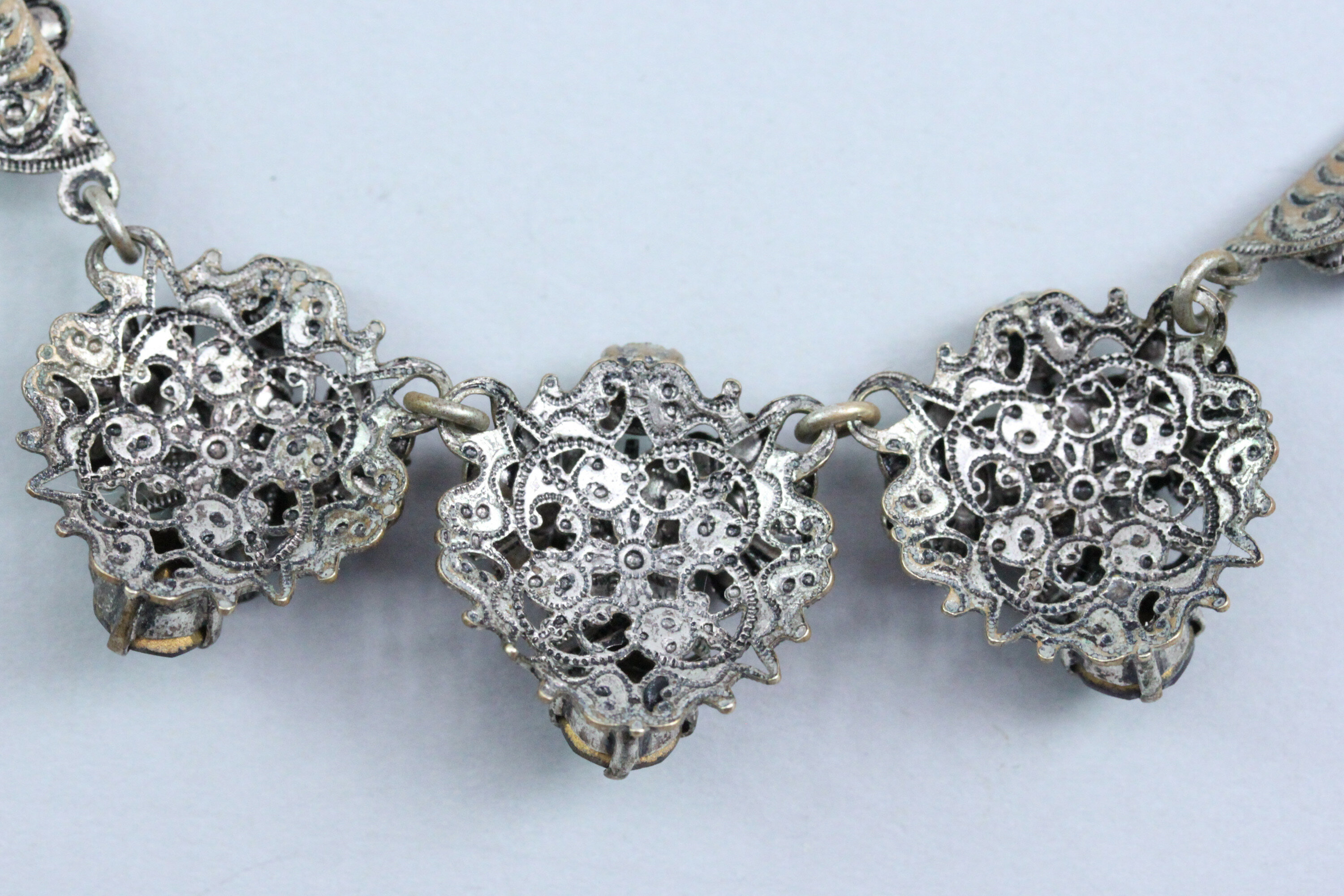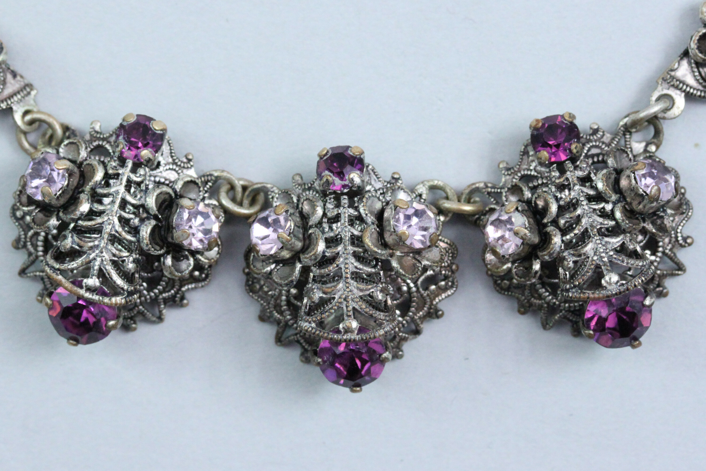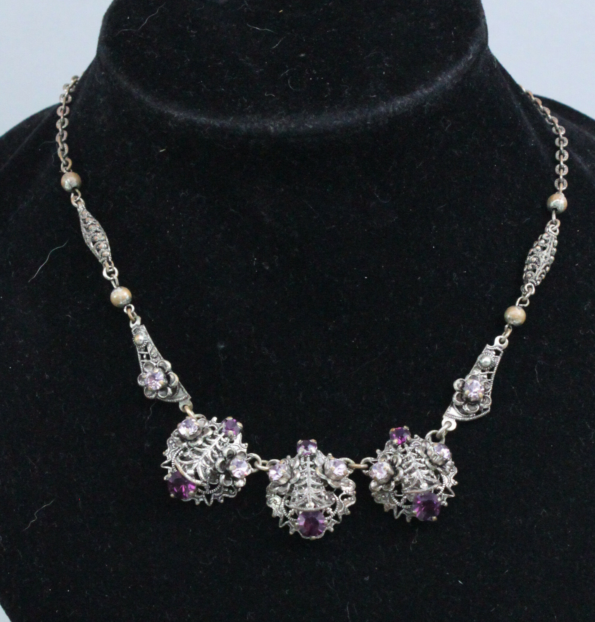 This is a beautiful necklace comprising an intricate multi layered design of stations set with purple and lavender stones. The metal work is in a typical filigree design and is silver tone.| Size: | 40 cm long, stations are 2 x 2 cm |