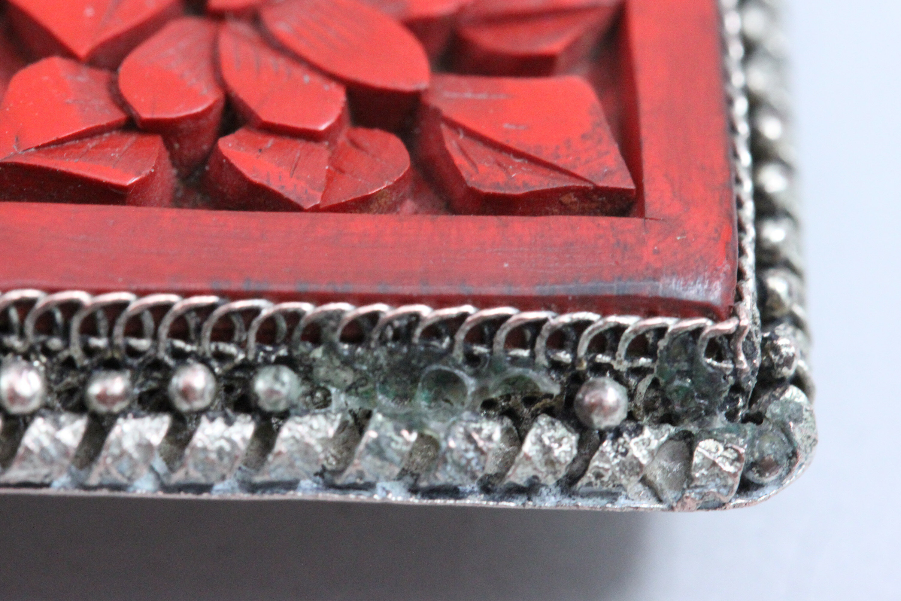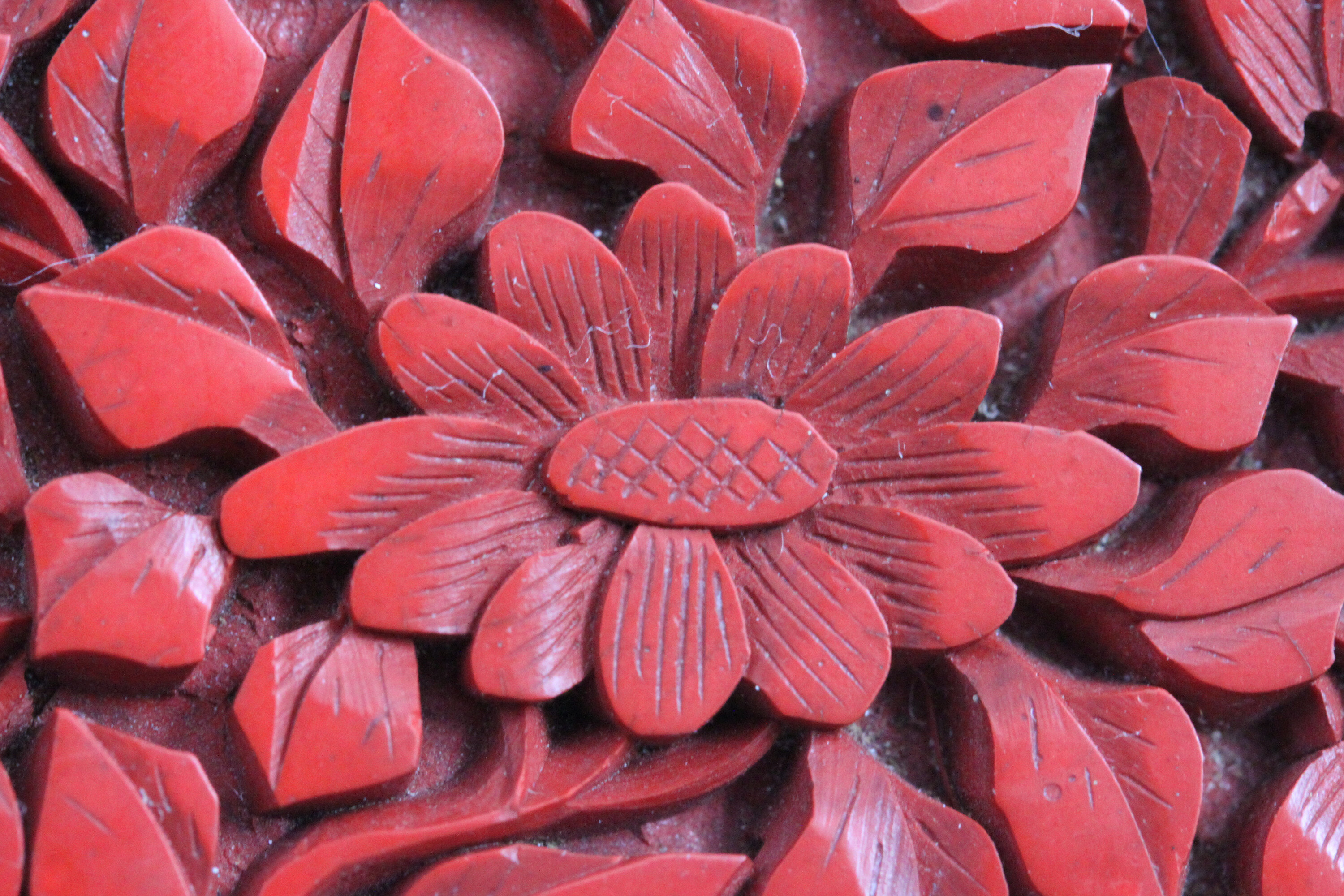 This is a large carved cinnabar lacquer brooch that was very typical of the 1930s. The carefully detailed plaque, modelled with peony blooms, is mounted in silver with a filigree work border.| Size: | 5.5 x 3.7 cm |