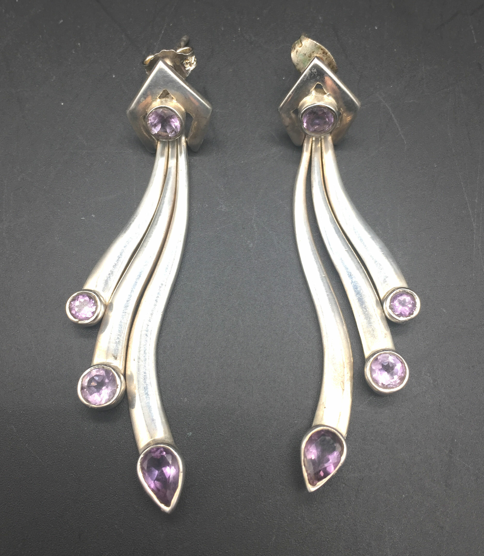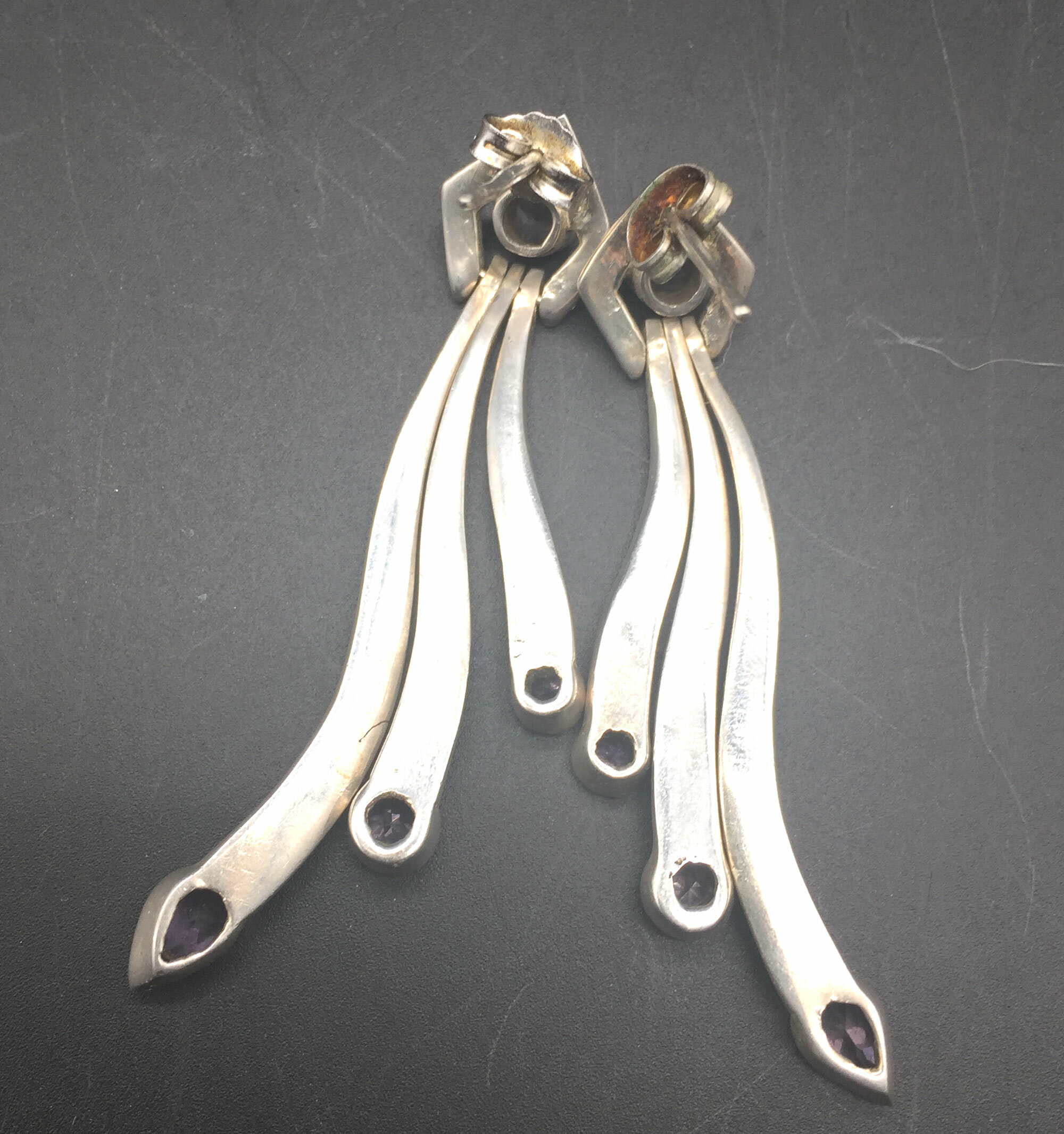 This is a striking pair of silver earrings set with amethyst stones with three articulated drops| Size: | 5.5 cm drop |