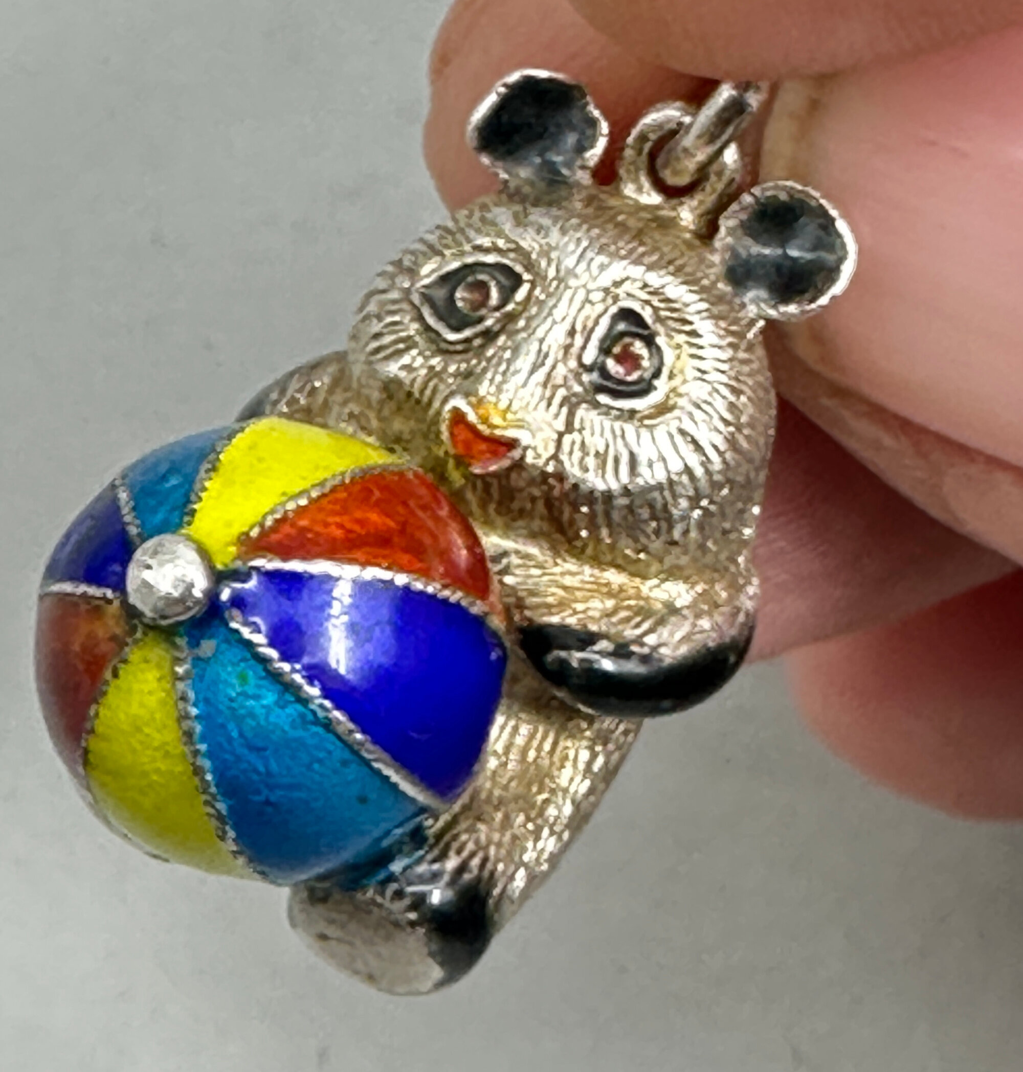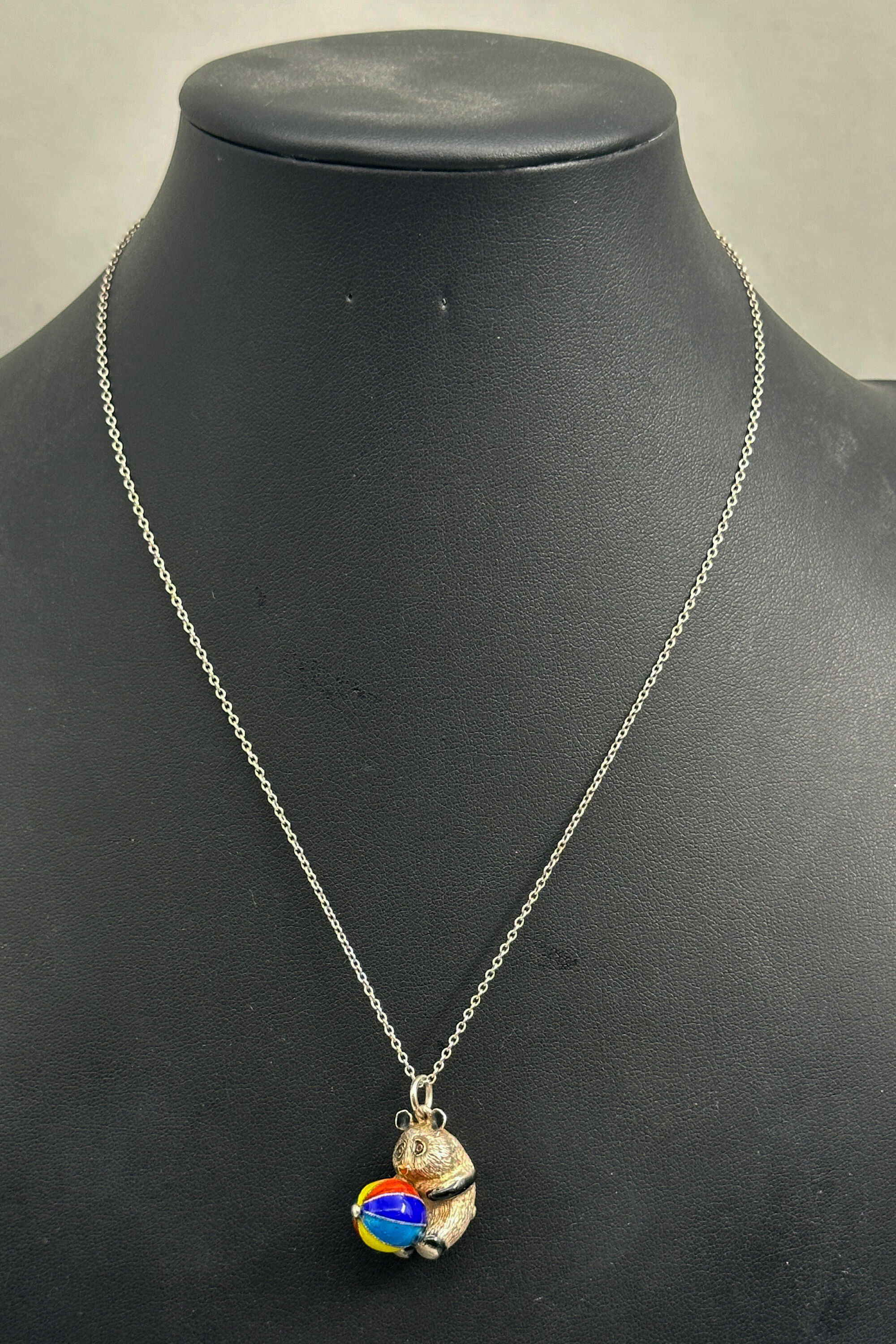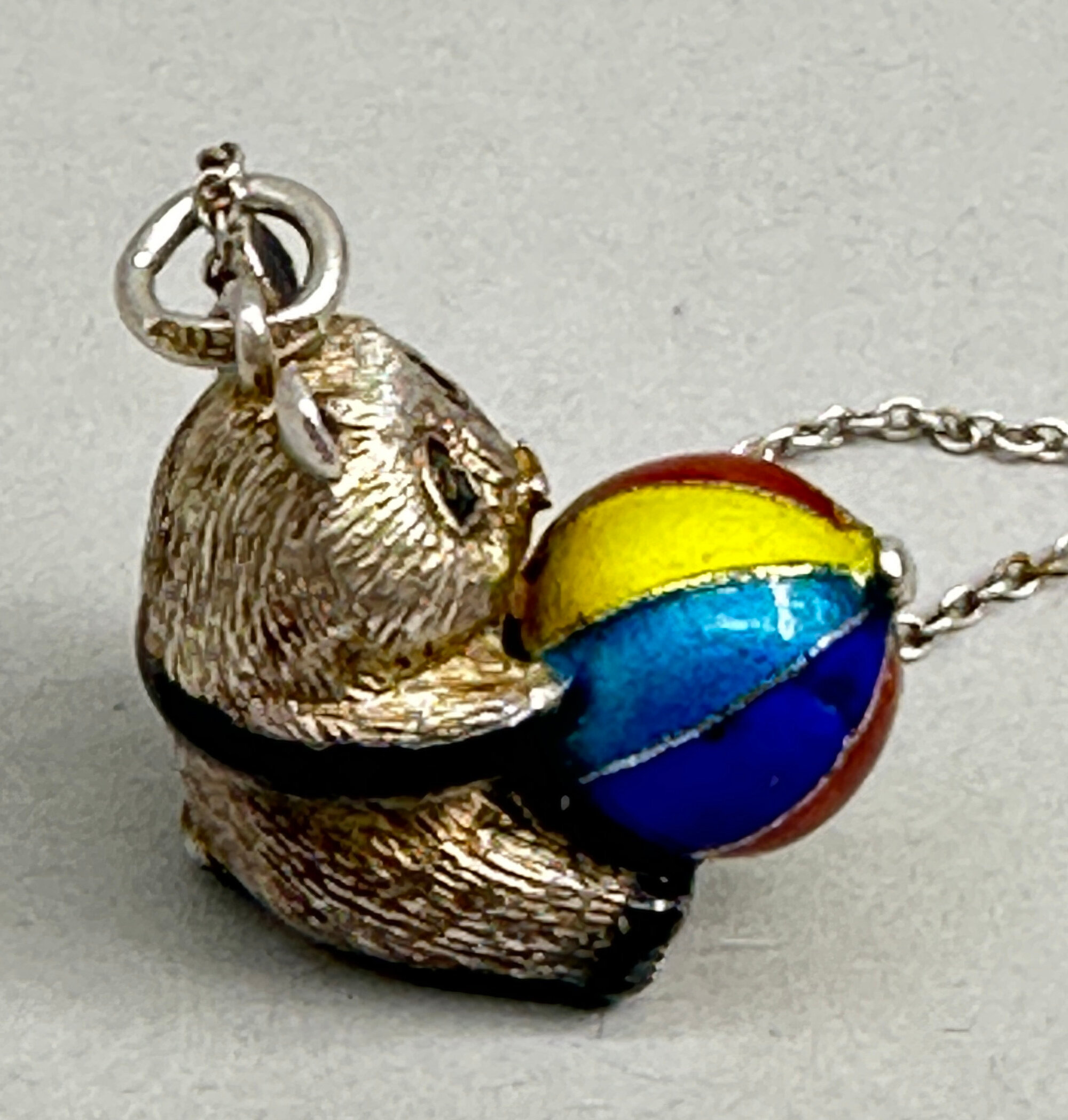 This is a super cute pendant in the form of a panda bear playing with a beach ball.The bear is made from solid silver with a texture to resemble his fur and black enamel detail. The beach ball is also enamel and the piece is marked 'SILVER'.| Size: | Pendant is 20 x 20 mm, The chain is 44 cm |