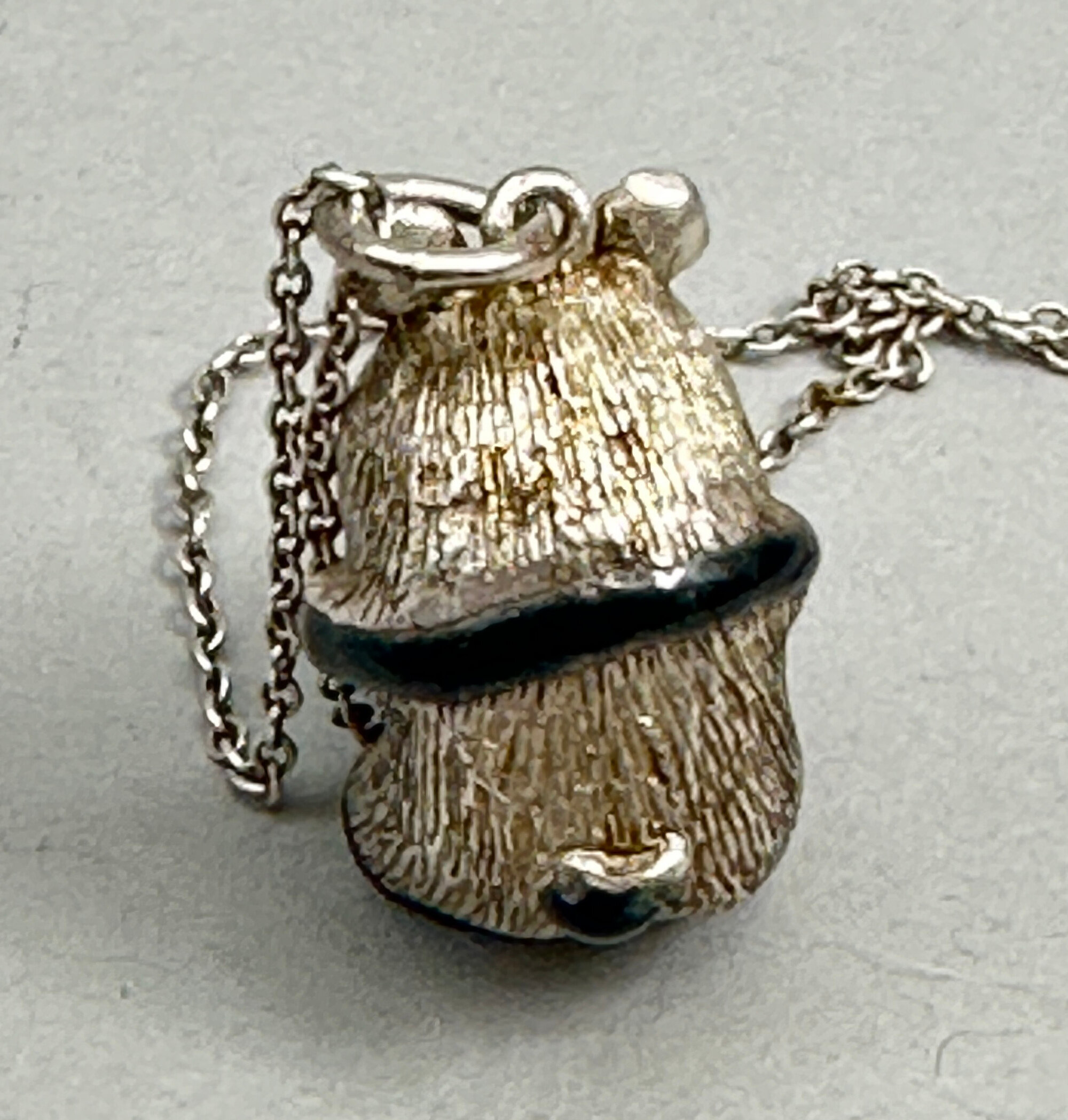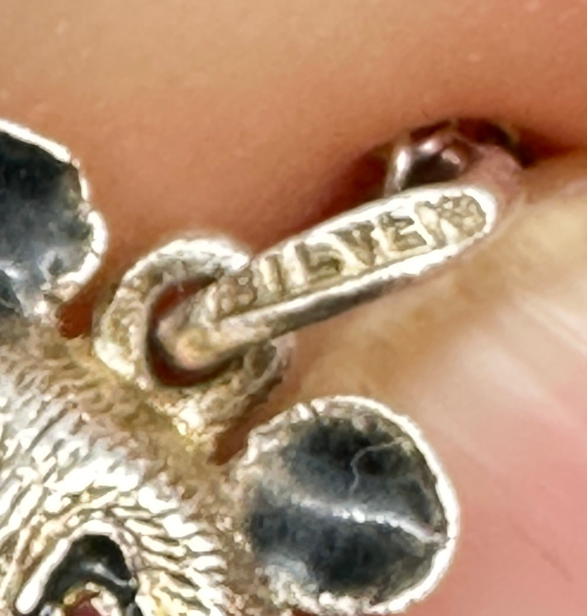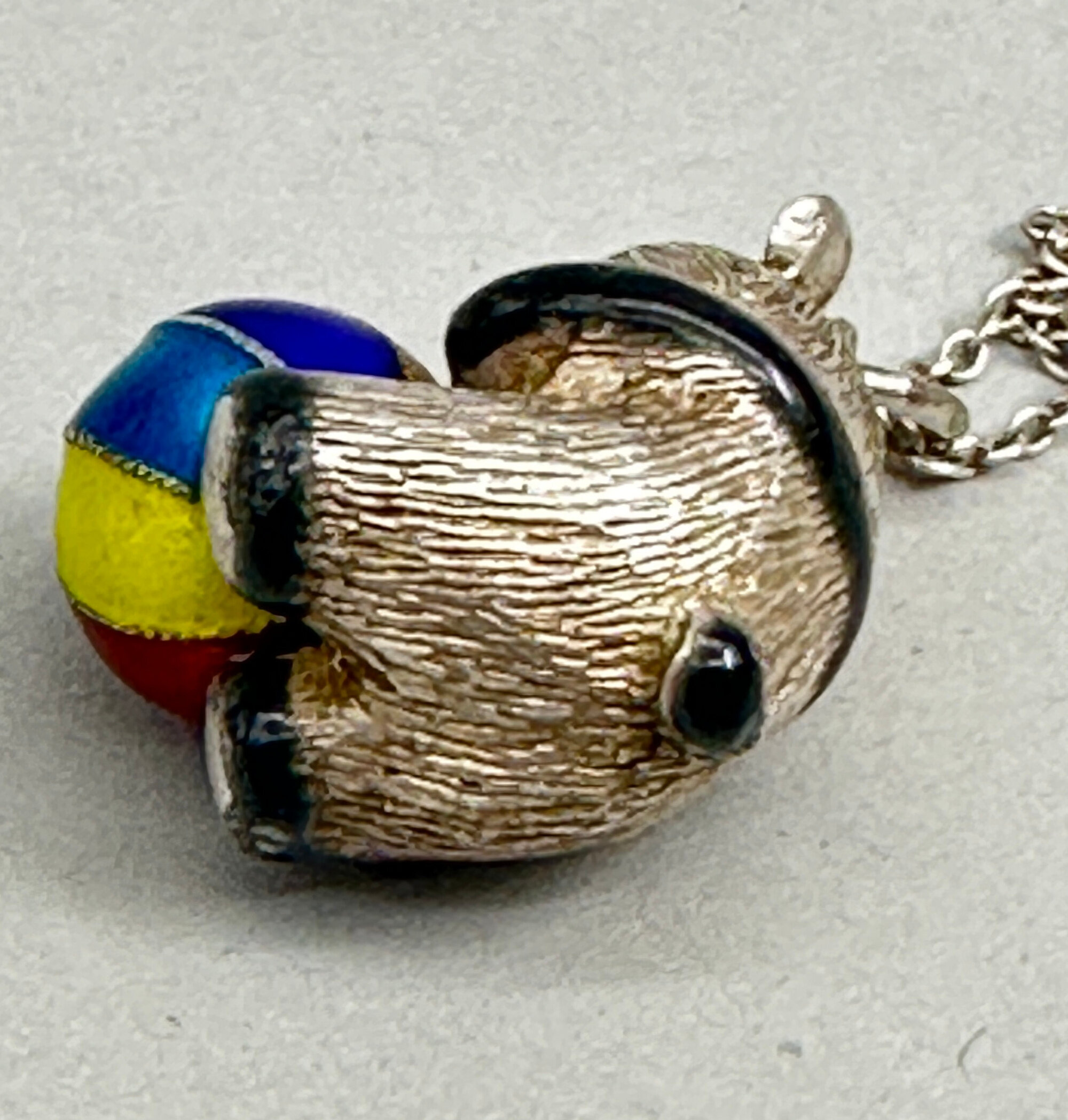 This is a super cute pendant in the form of a panda bear playing with a beach ball.The bear is made from solid silver with a texture to resemble his fur and black enamel detail. The beach ball is also enamel and the piece is marked 'SILVER'.| Size: | Pendant is 20 x 20 mm, The chain is 44 cm |