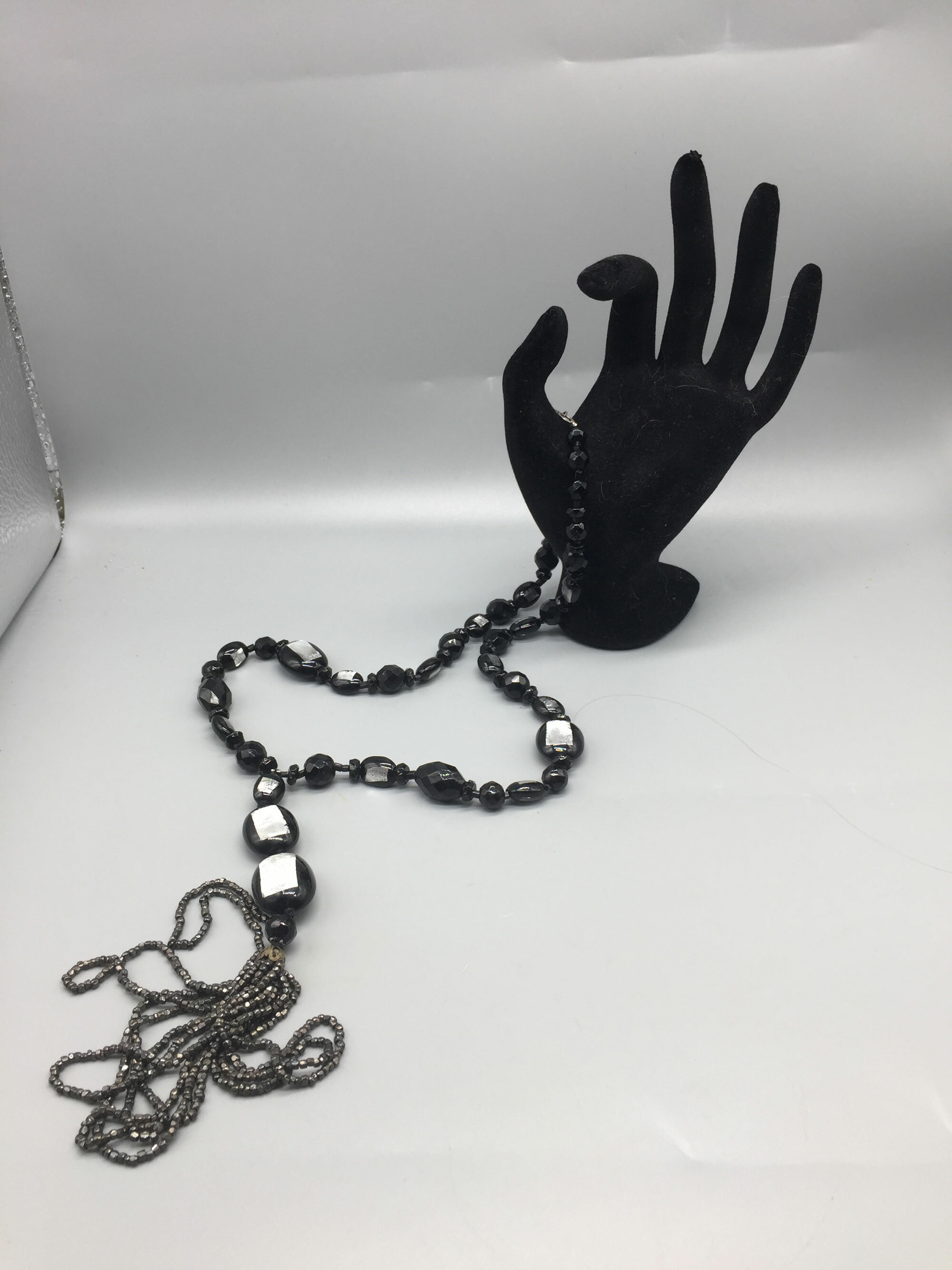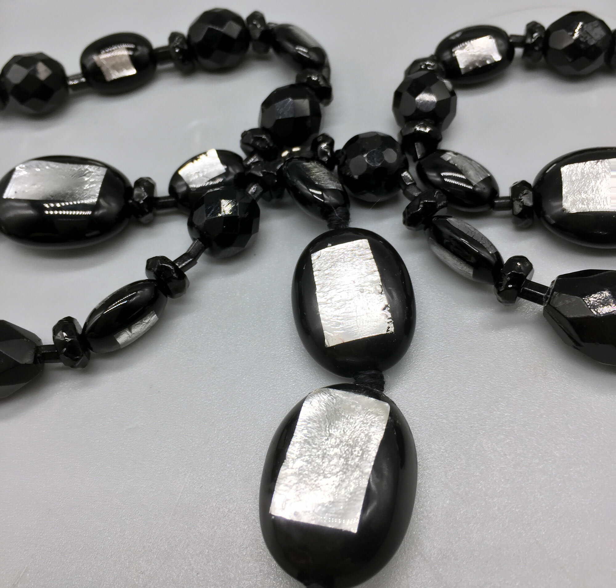 This is a stunning necklace comprising Murano glass beads with silver foil, jet beads and a tassel with marcasite beads.| Size: | Necklace 60 cm, drop 15 cm |