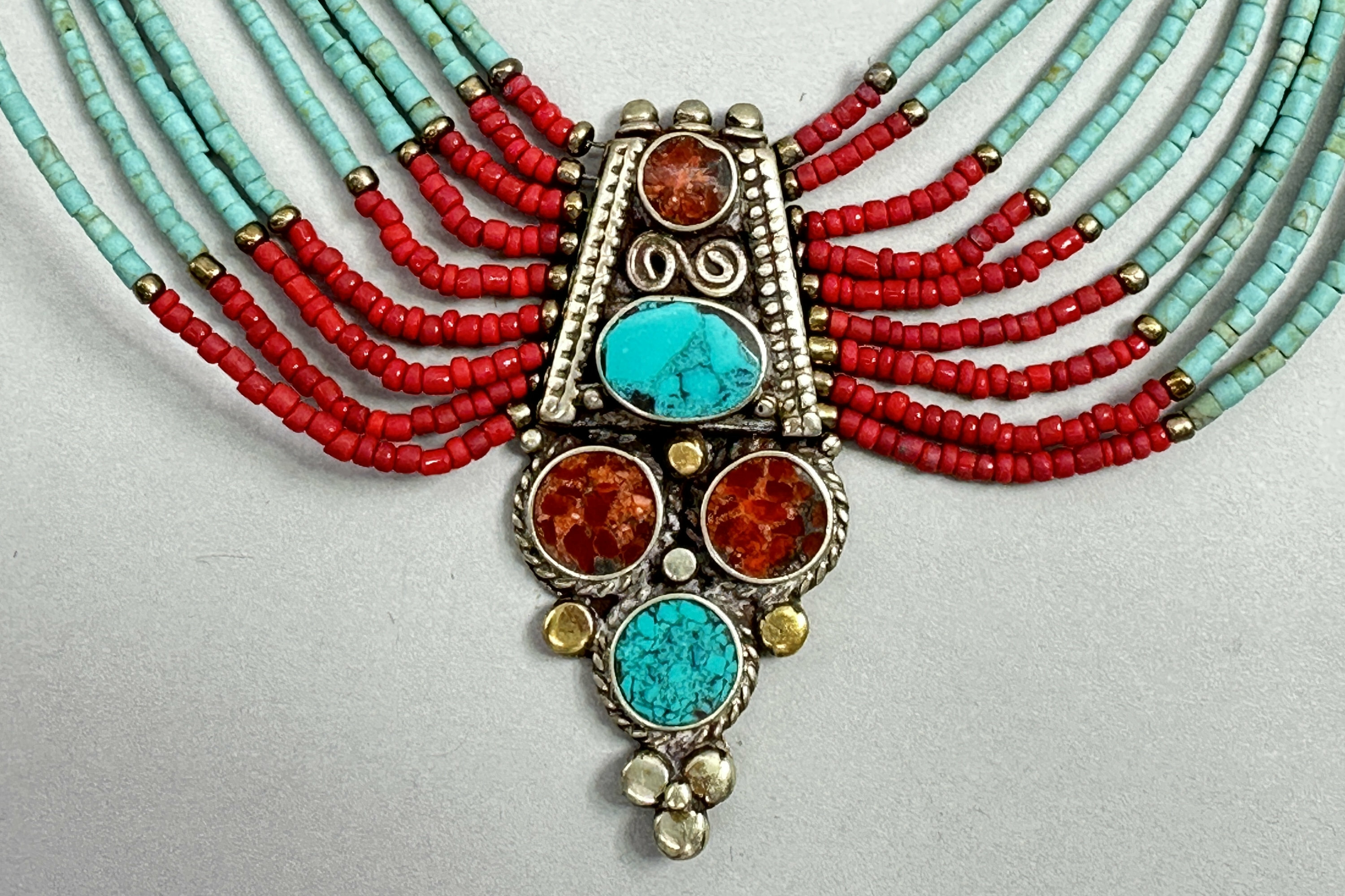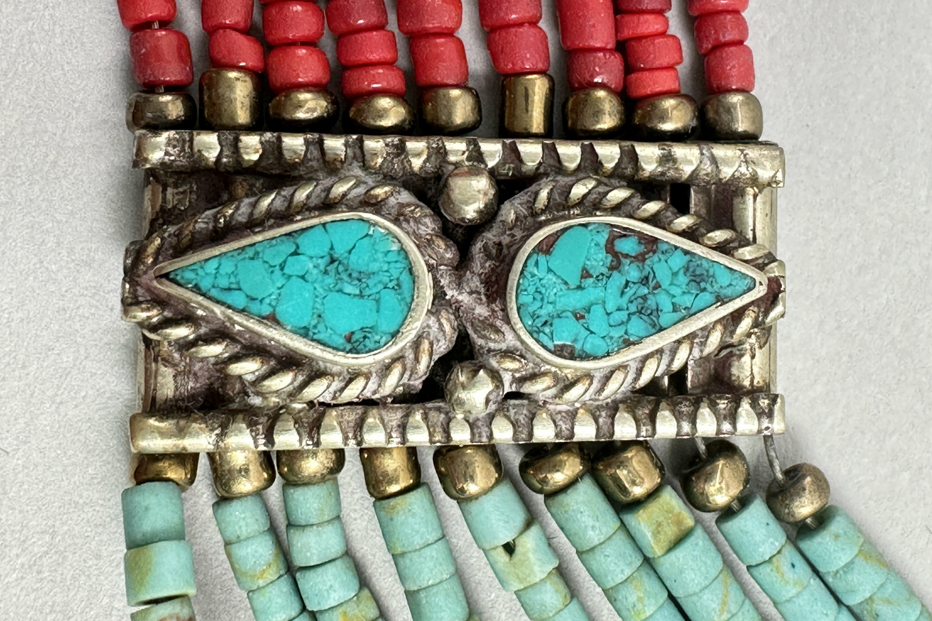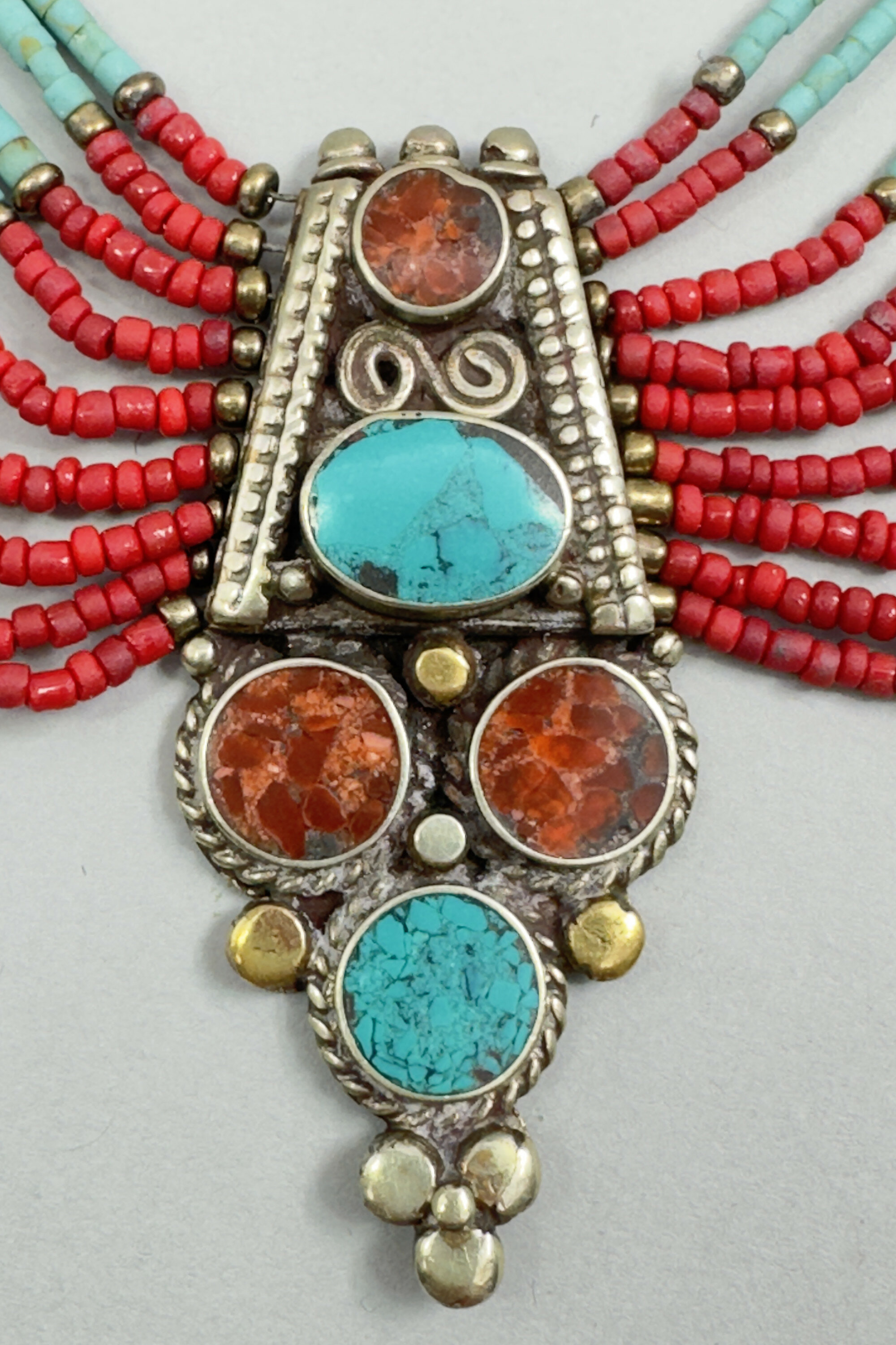 This a very elegant necklace comprising a central pendant with a typical Berber design with turquoise and coral mosaic inlay. This pendand is connected with nine strands of coral and turquoise micro beads. This design is repeated all the way around with a further 4 connecting stations.| Size: | Central pendant is 55 x 25 mm, 40 cm lengh |