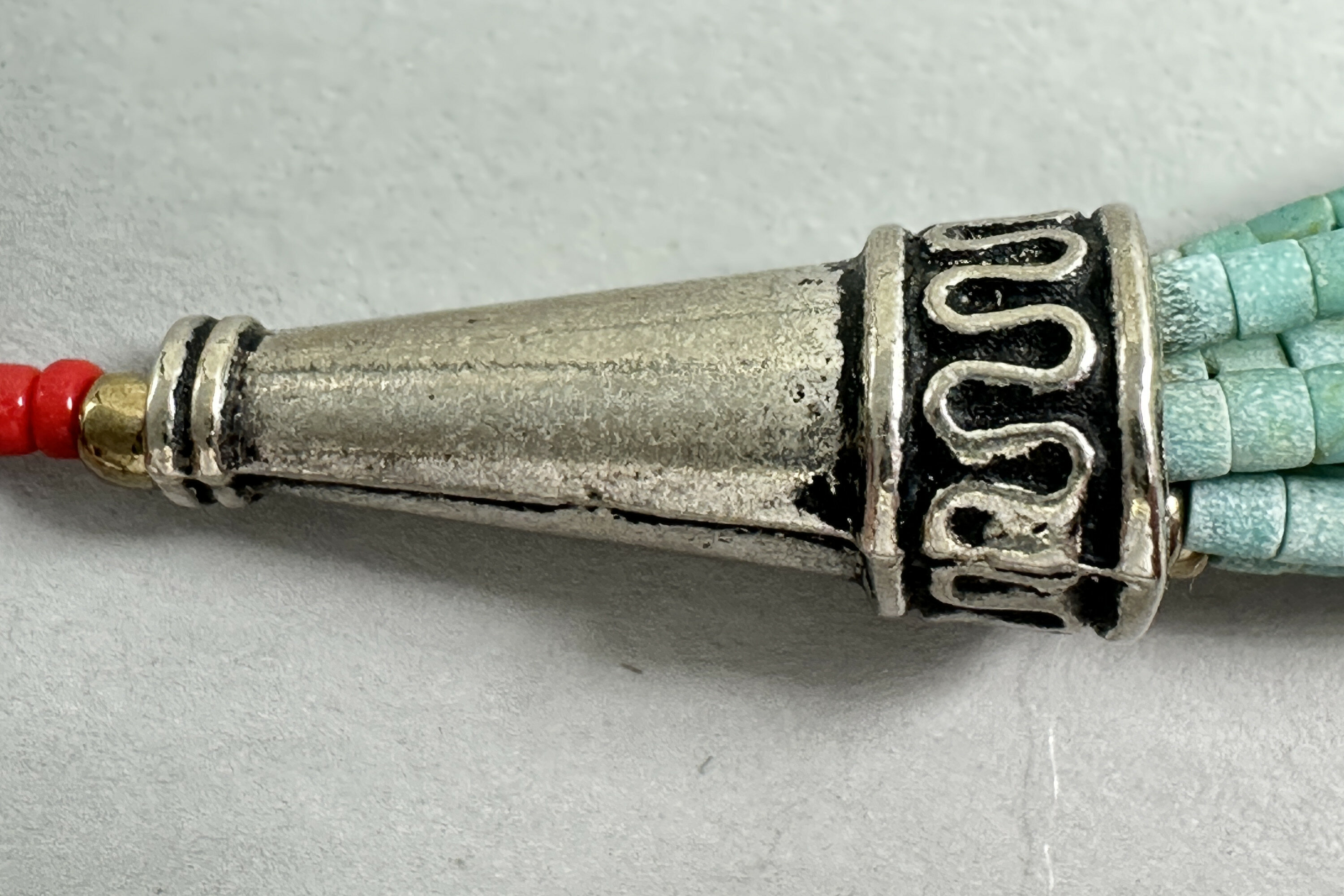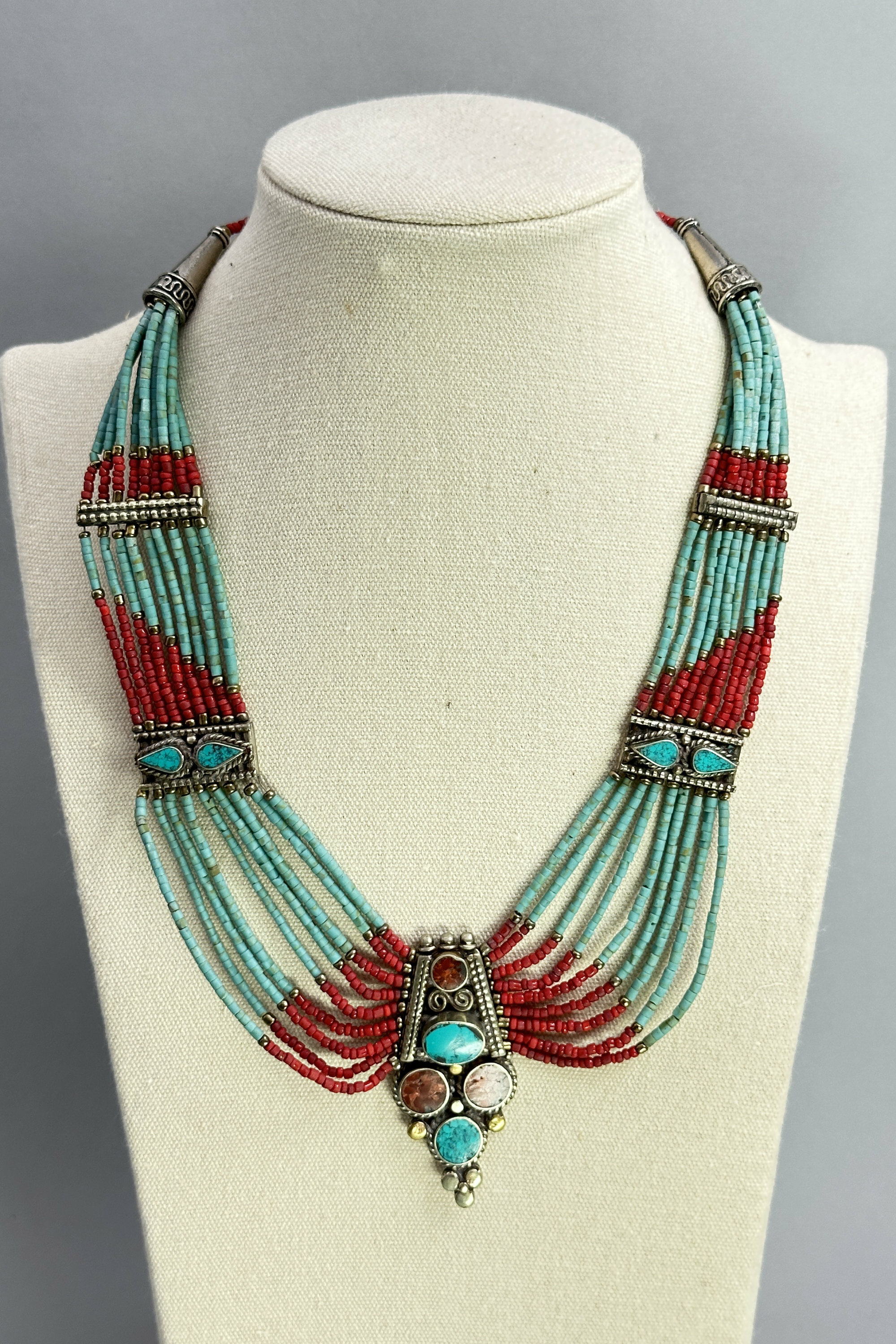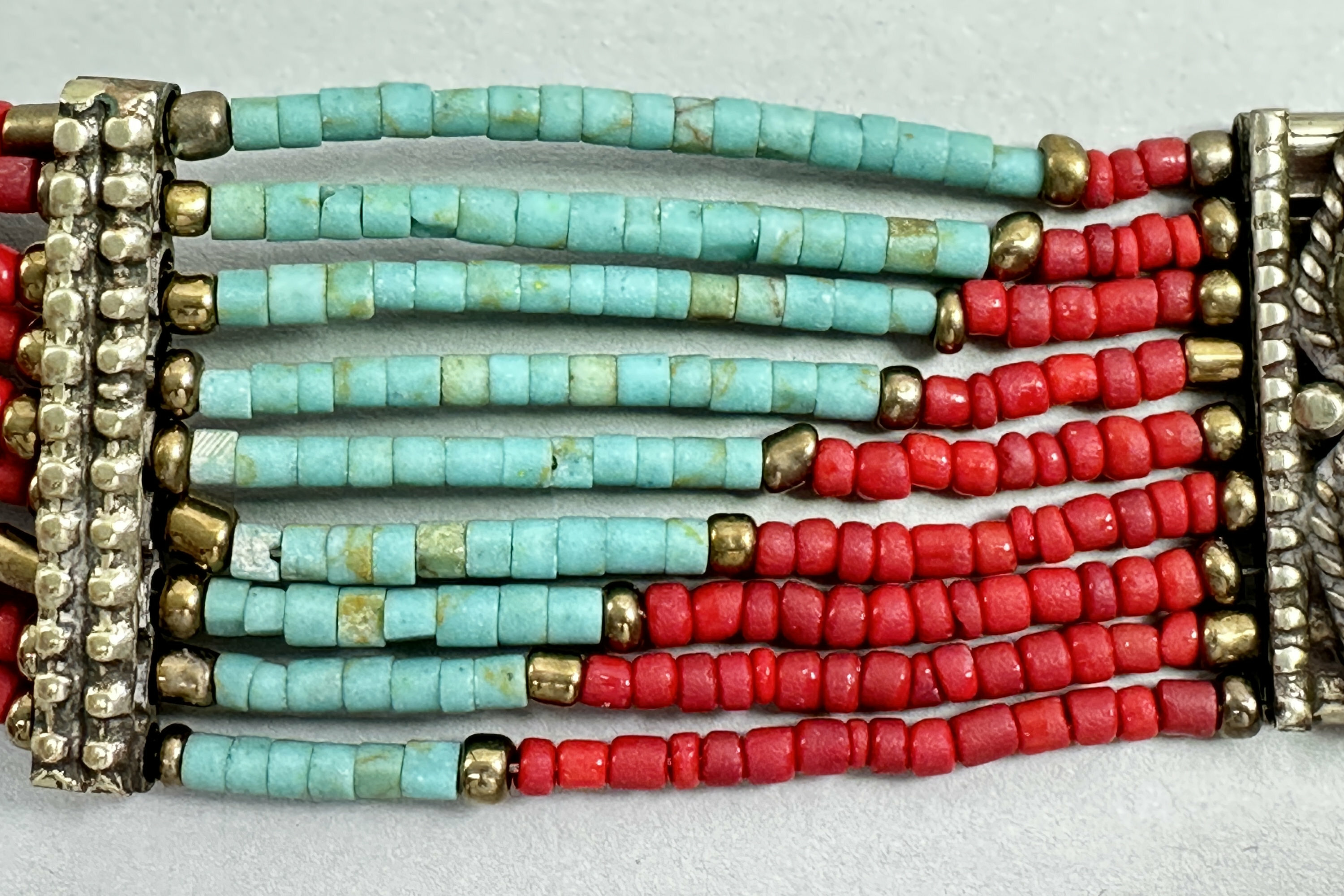 This a very elegant necklace comprising a central pendant with a typical Berber design with turquoise and coral mosaic inlay. This pendand is connected with nine strands of coral and turquoise micro beads. This design is repeated all the way around with a further 4 connecting stations.| Size: | Central pendant is 55 x 25 mm, 40 cm lengh |
