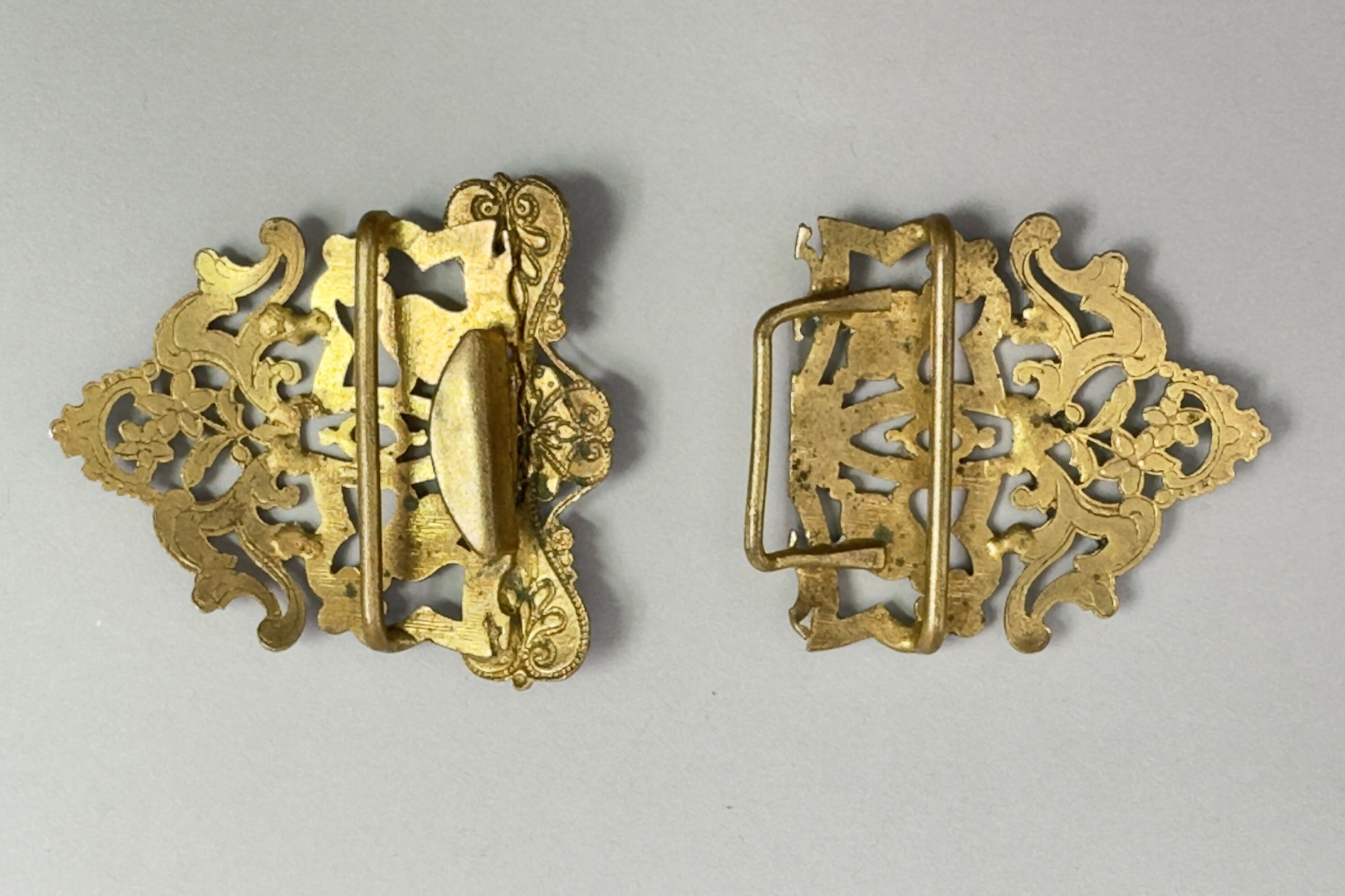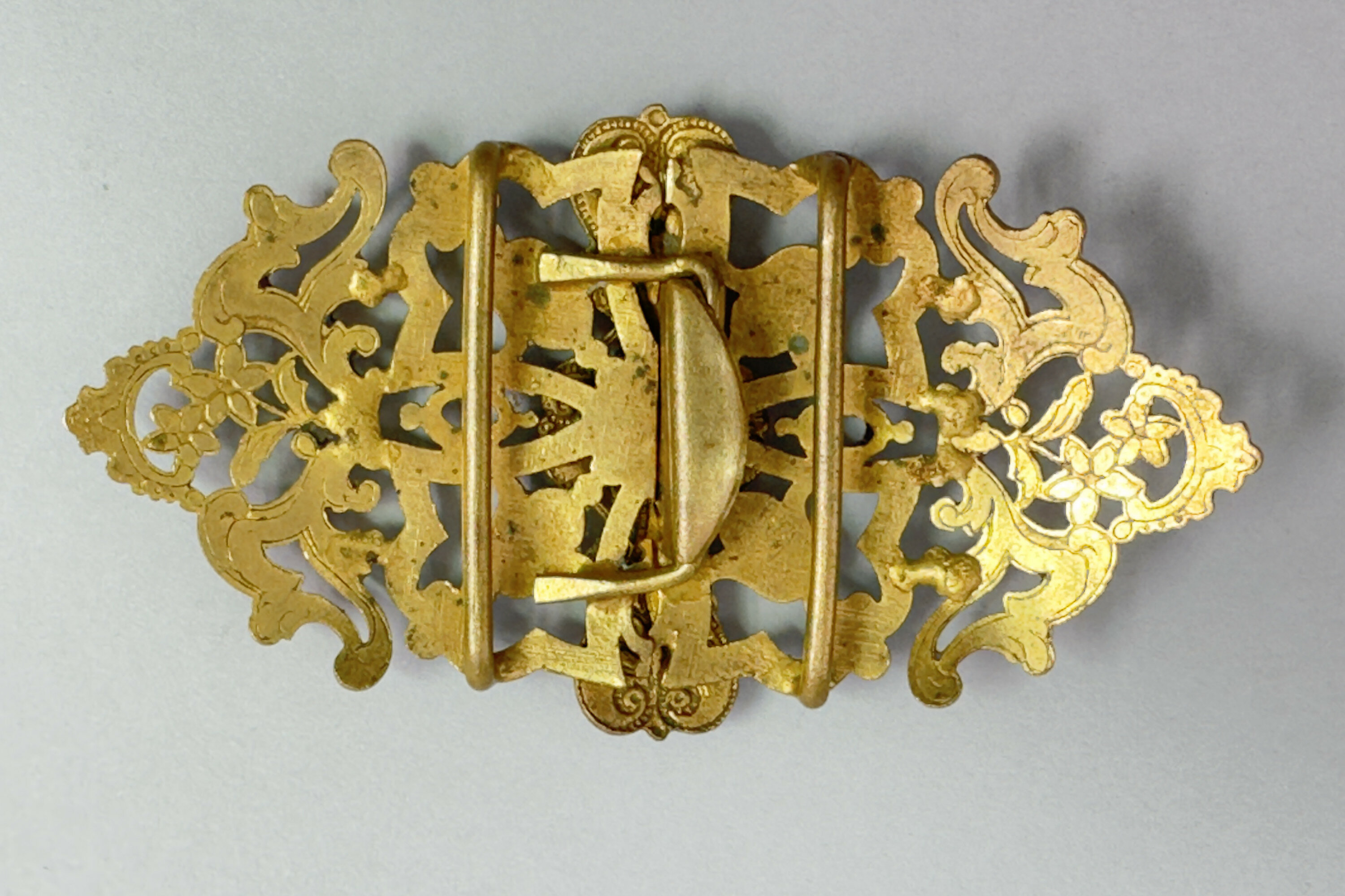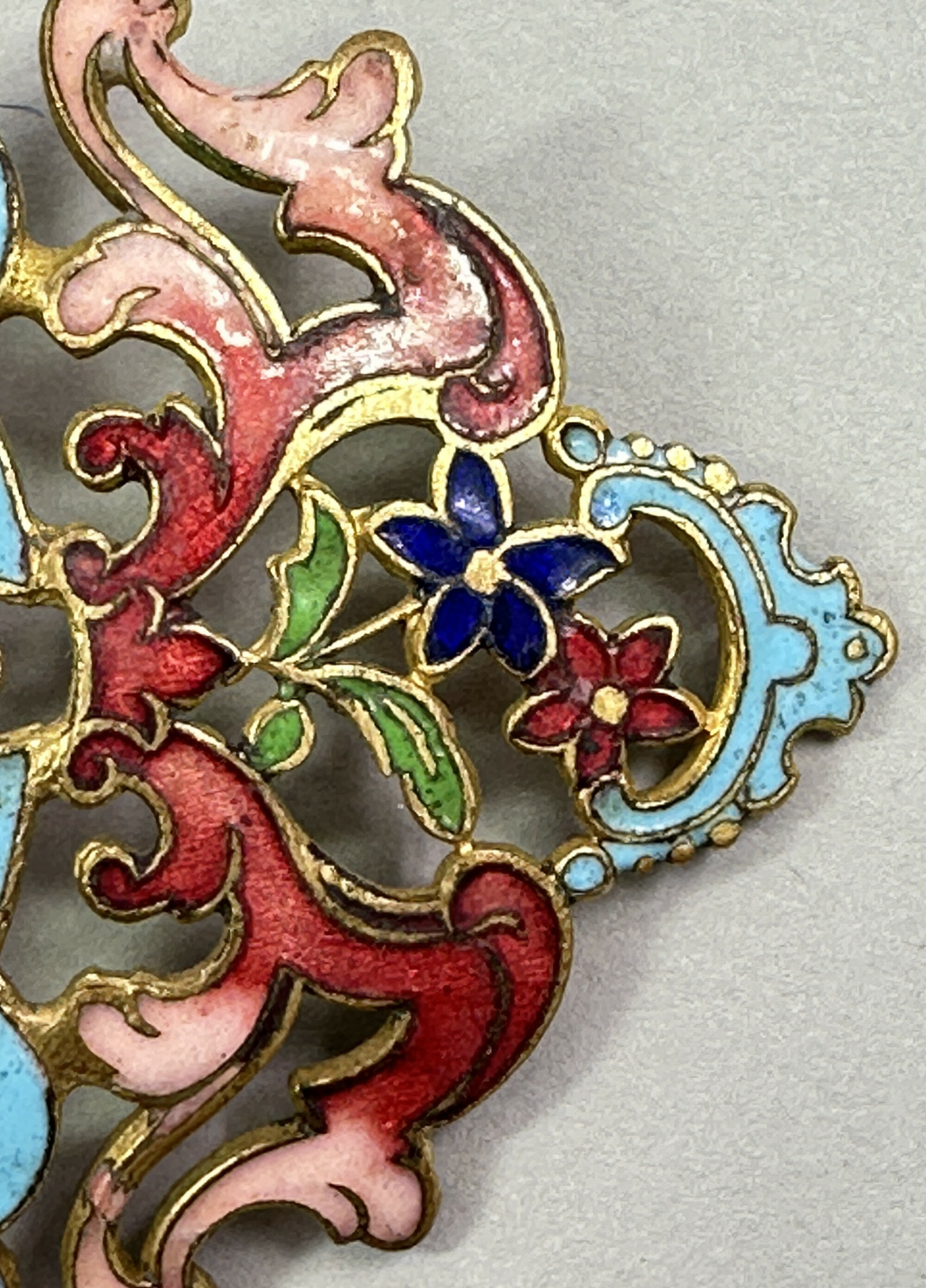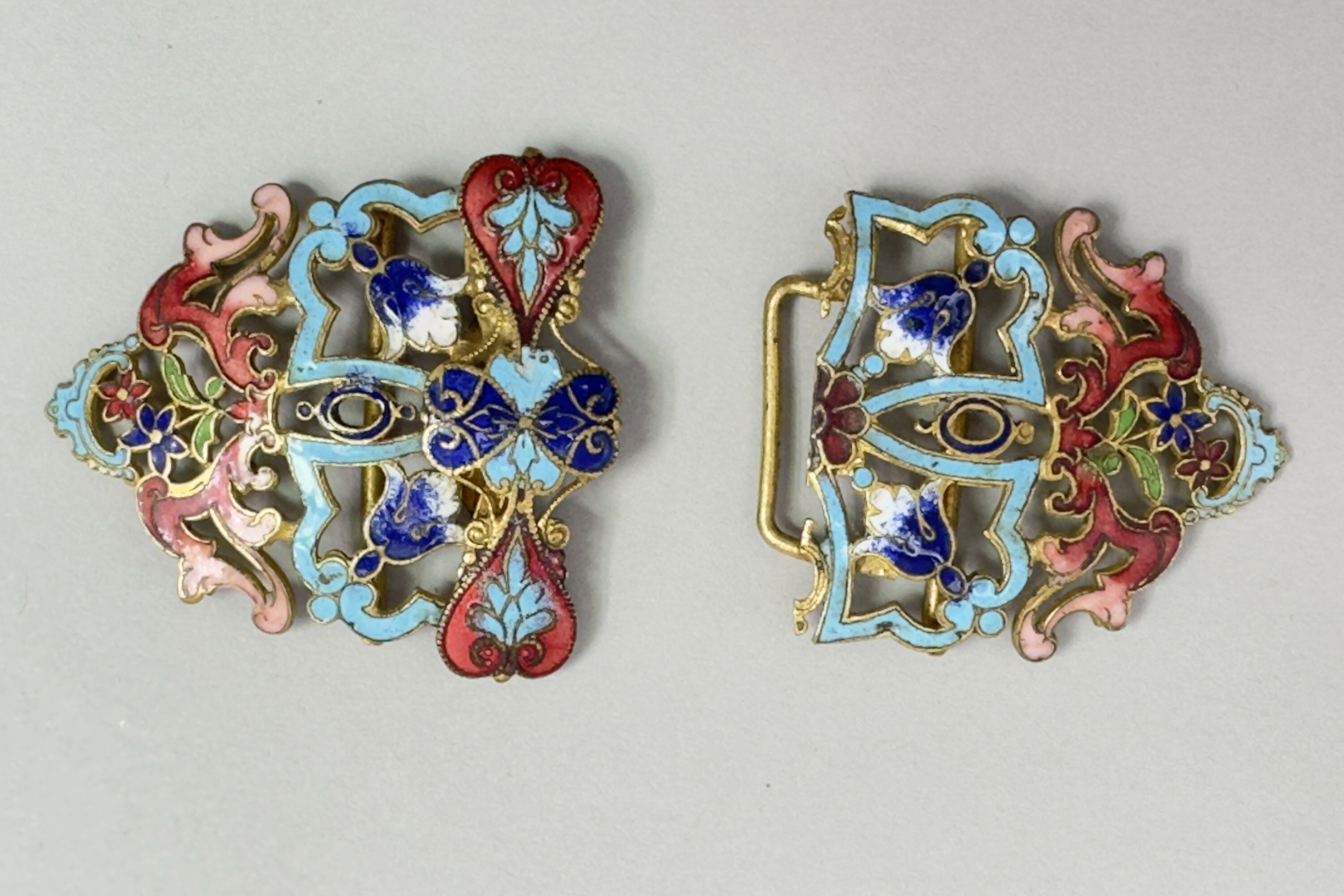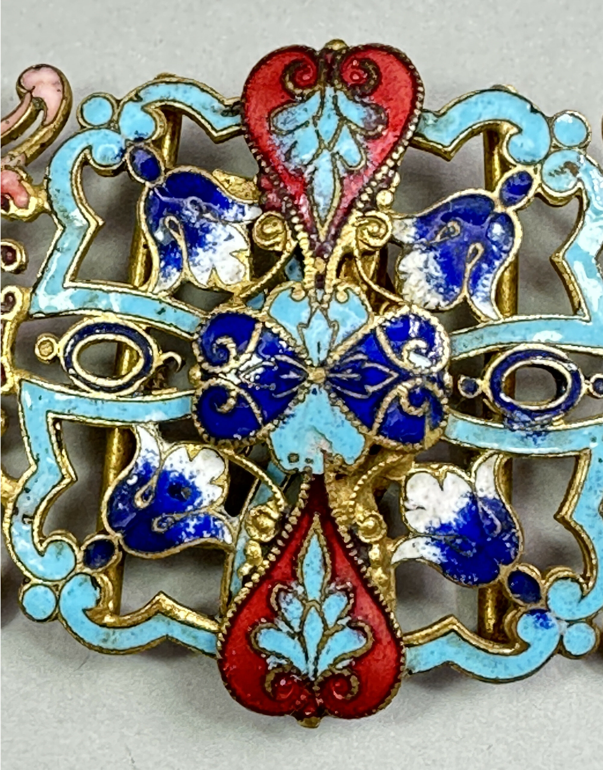 This is a lovely example of these buckles in a scrollwork design with bright enameling in turquoise and pinks. It is brass.| Size: | 9 x 4 cm when the two pieces are together |