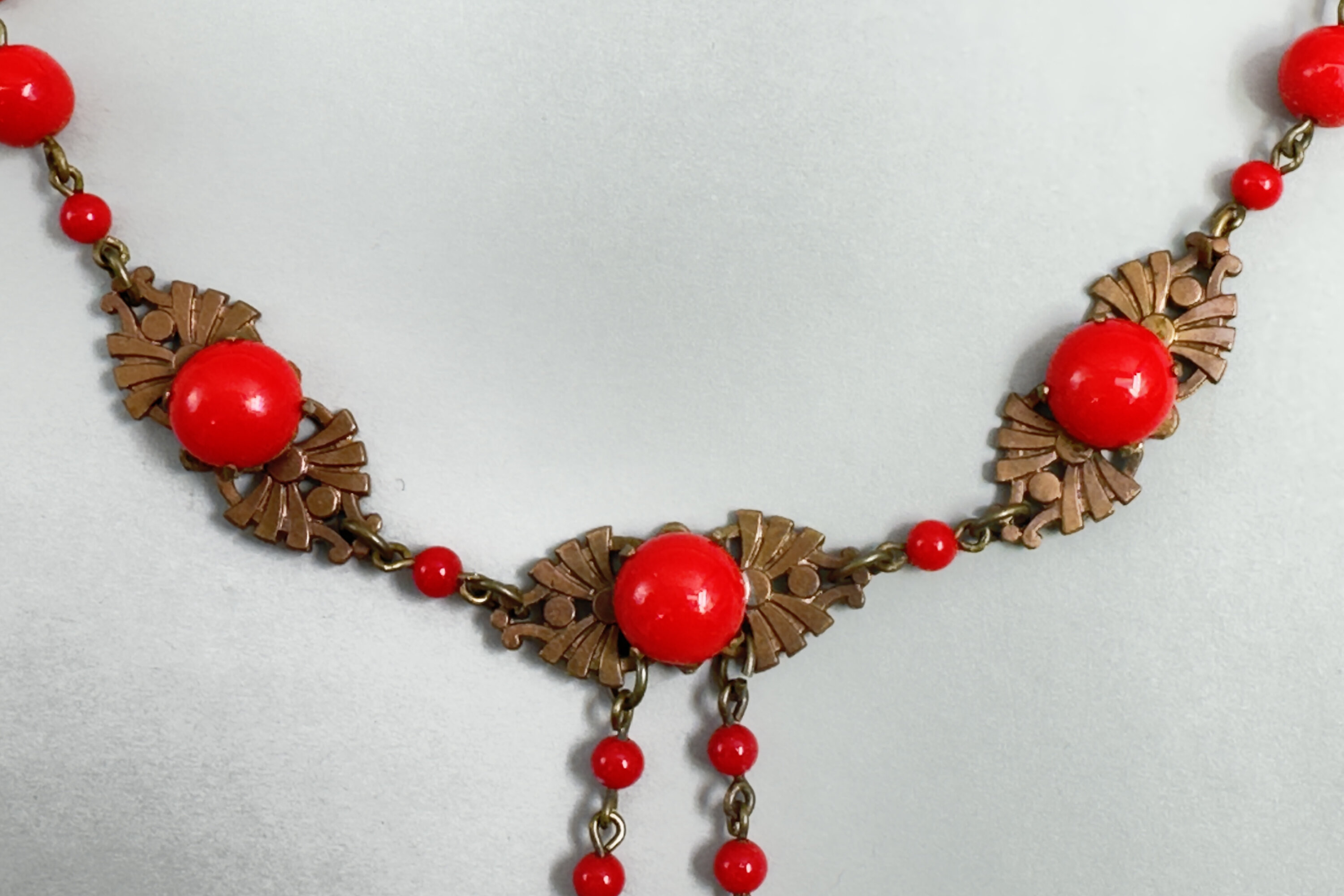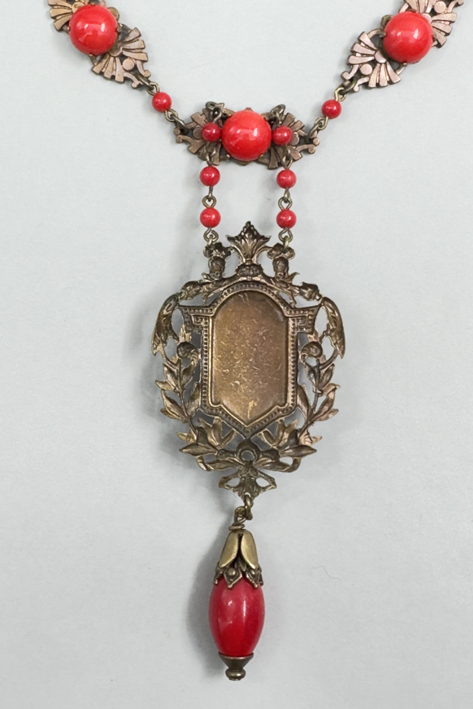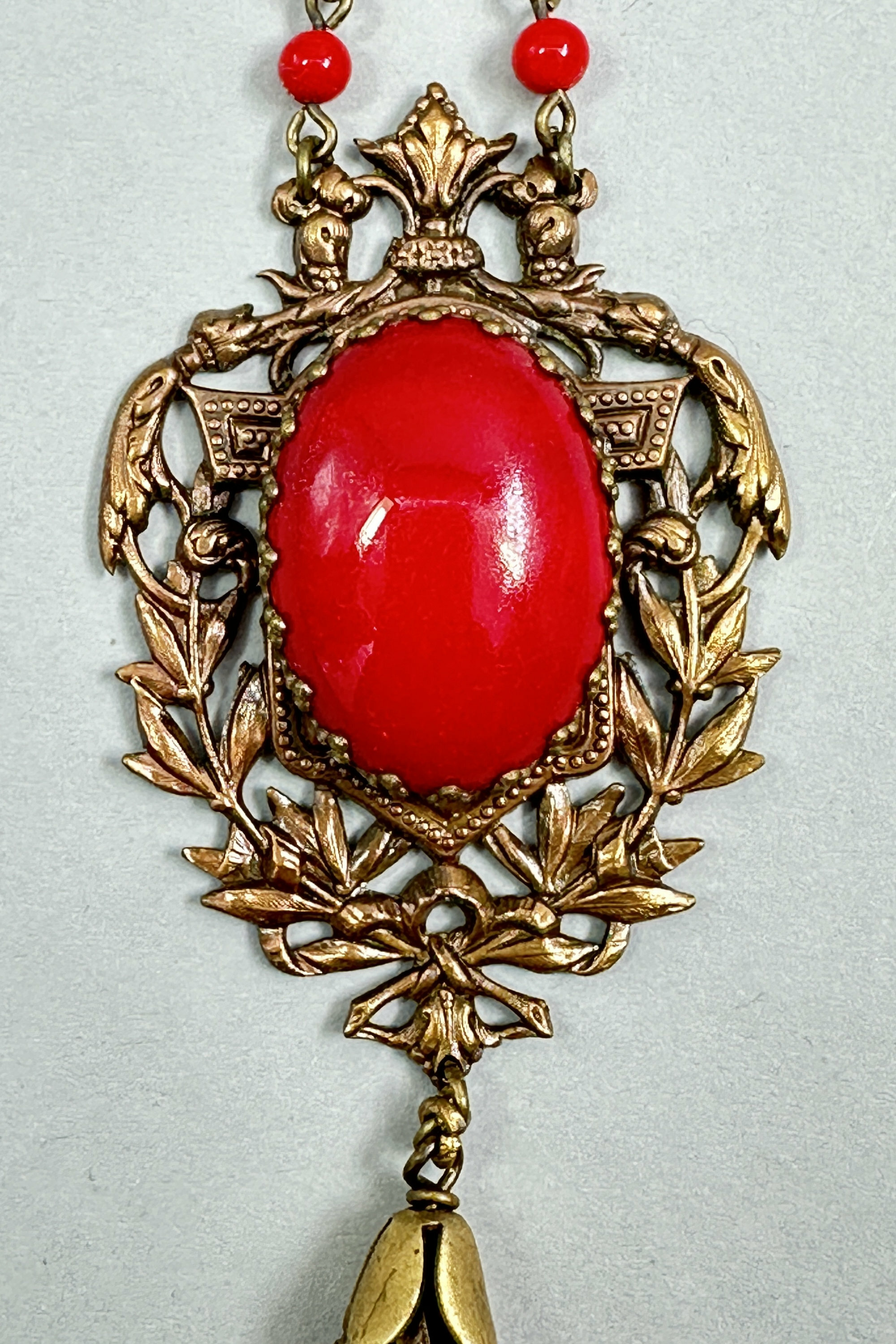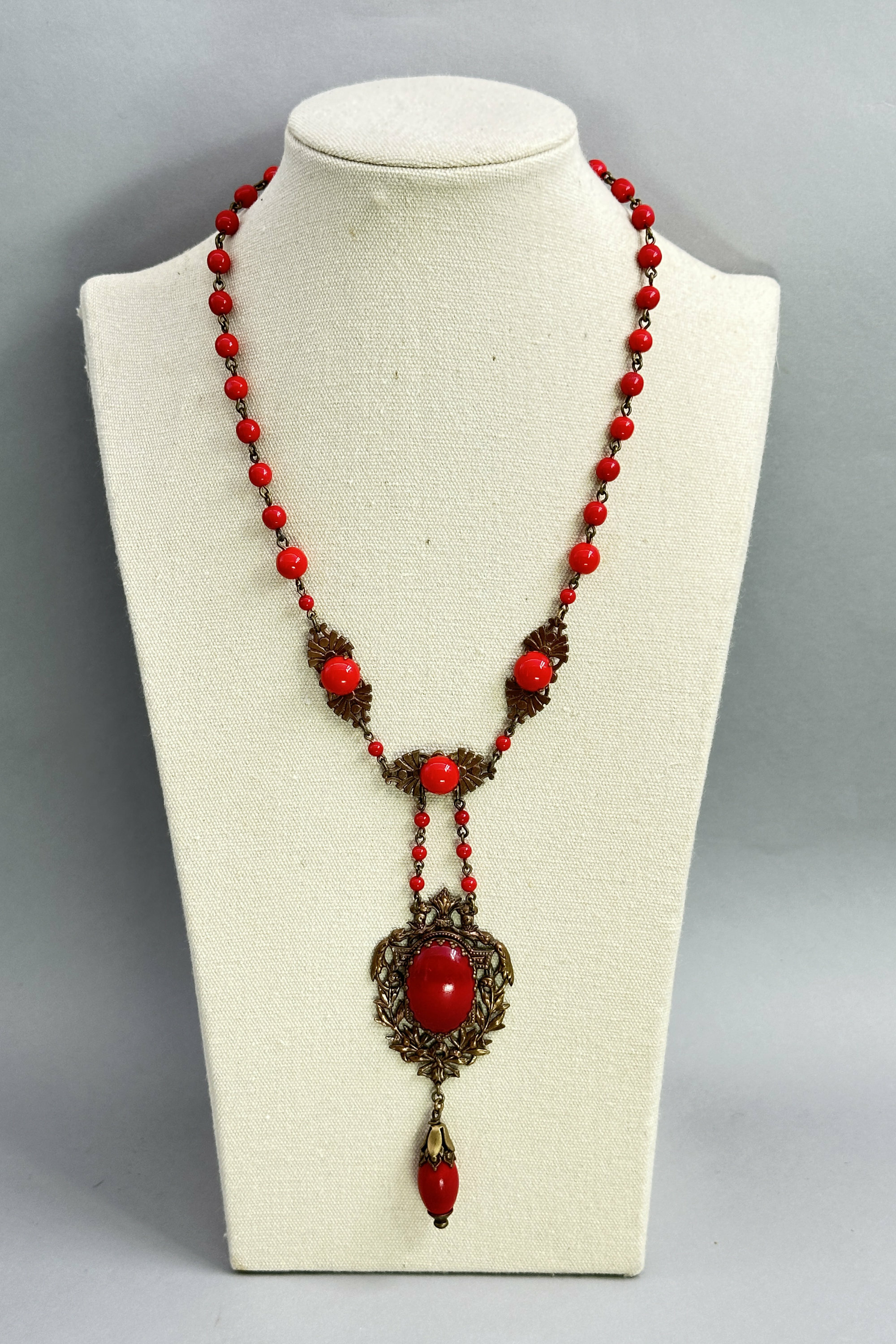 This is a beautifully designed necklace that features a central lariat pendant set with red glass stones. The necklace has corresponding red beads.| Size: | Central pendant 5.3 x 3.6 cm, drop is 8.9 cm Necklace is 40 cm long |