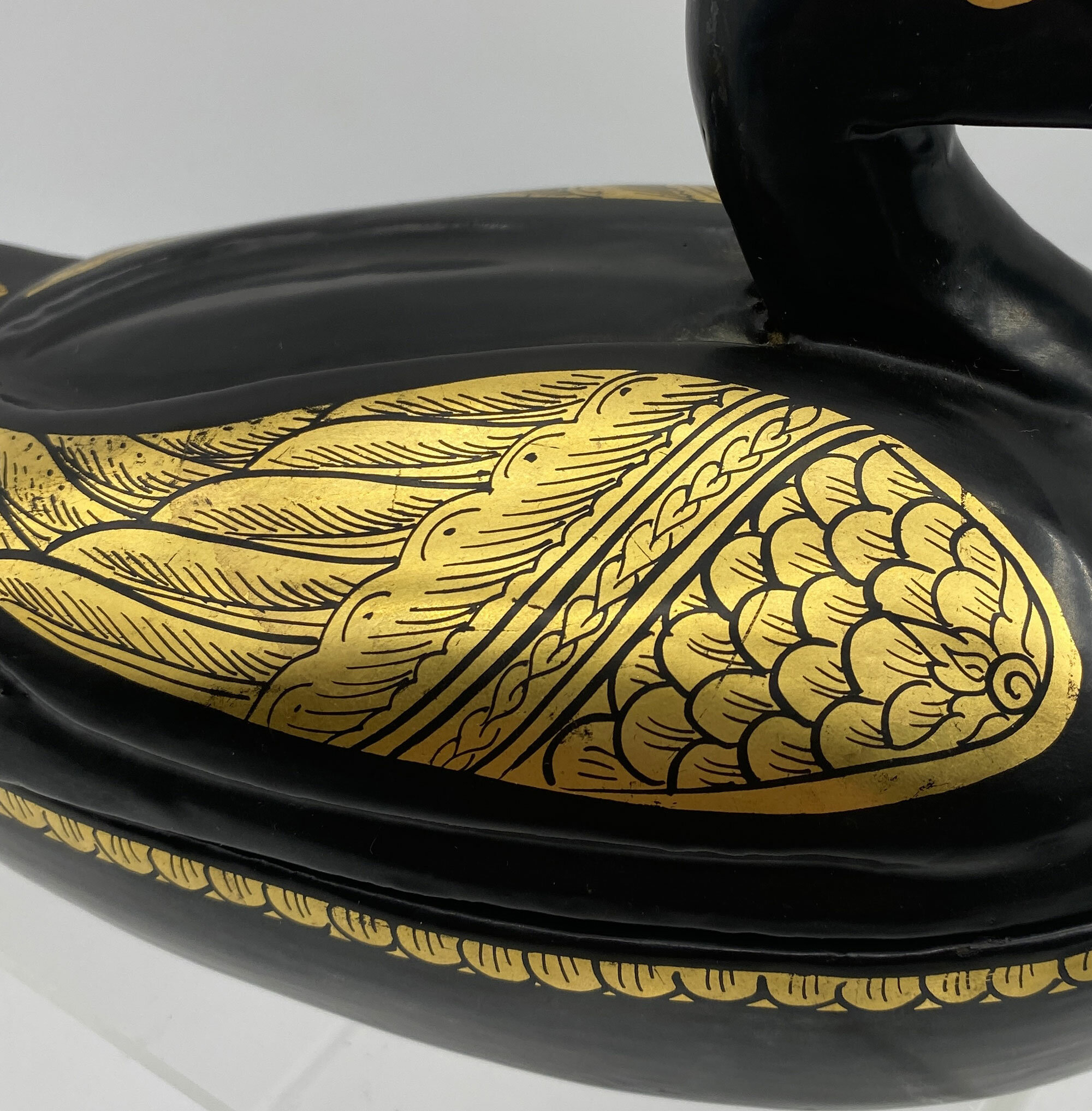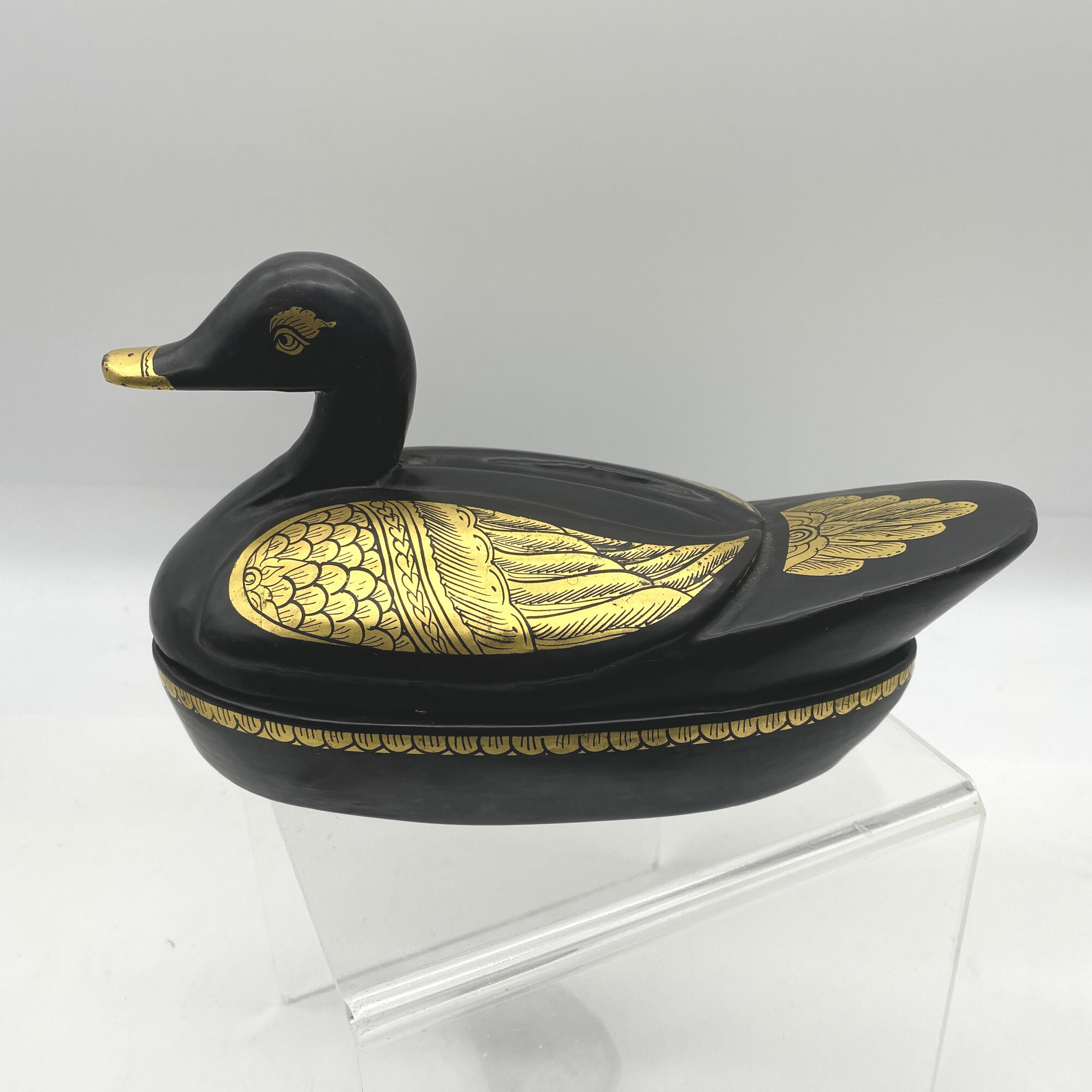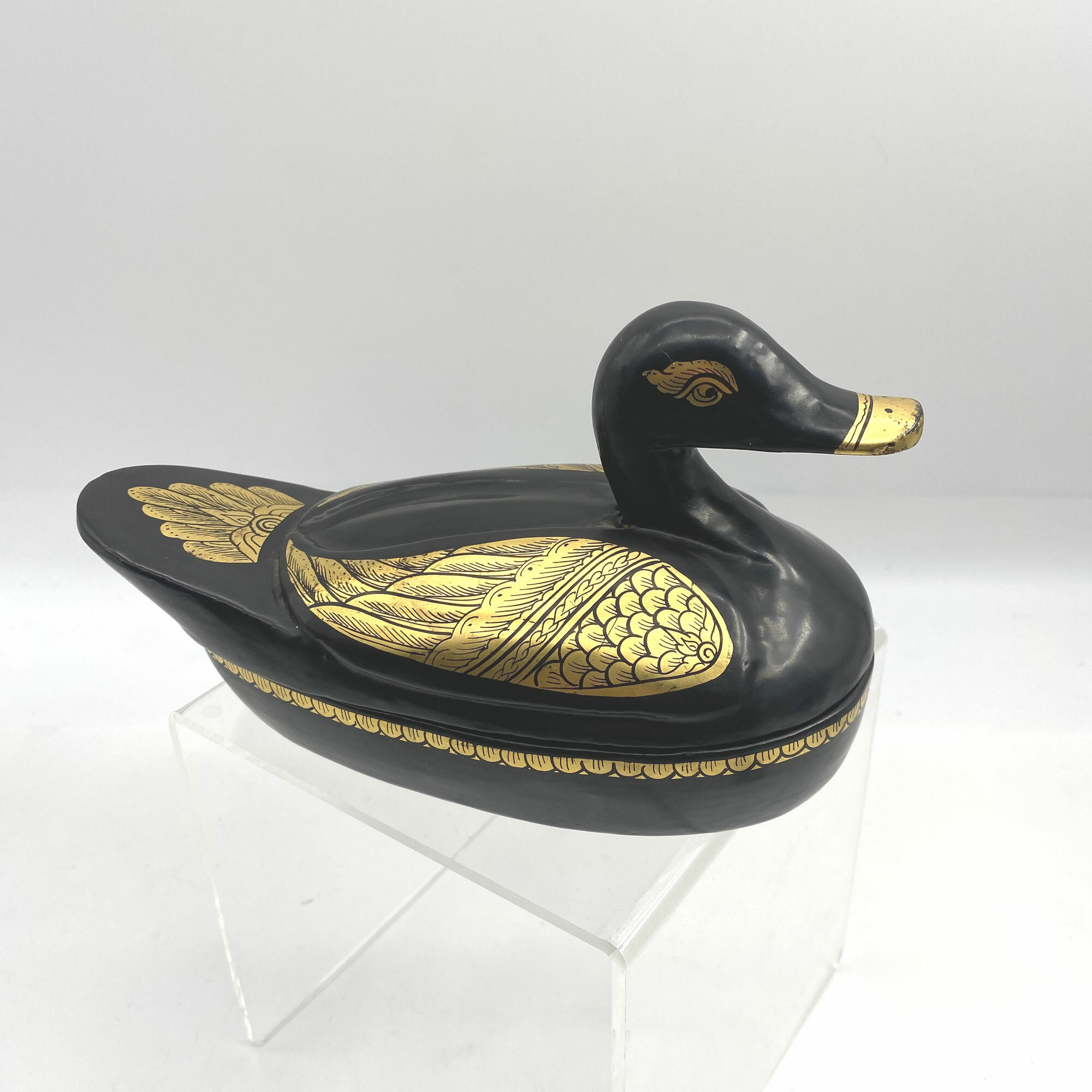 This is an amusing trinket box in the form of a duck made from black lacquer with gilt decoration, the lid with wings and a feathered tail and the head with gilt eyes and beak. The base has a simple band of a repeating gilt geometric design. The form resembles the well known Chinese export porcelain 'goose' tureens made in the eighteenth century but the lacquer technique has more of Persian feel to it and this may be a more likely provenance. The whimsical style also suggests a date of manufacture in the 1960s or 1970s.| Size: | 22 cm long, 13 cm high and 10 cm wide |