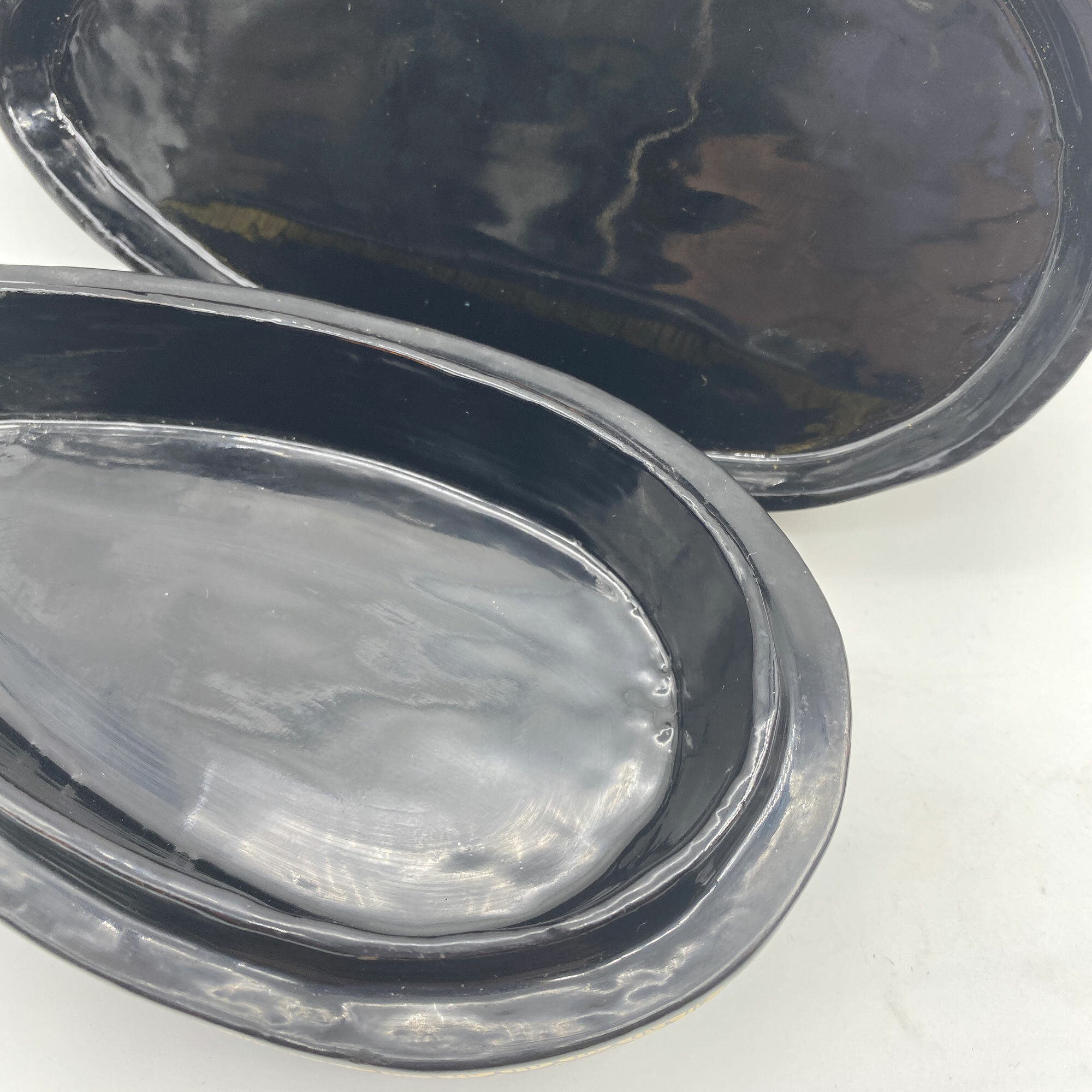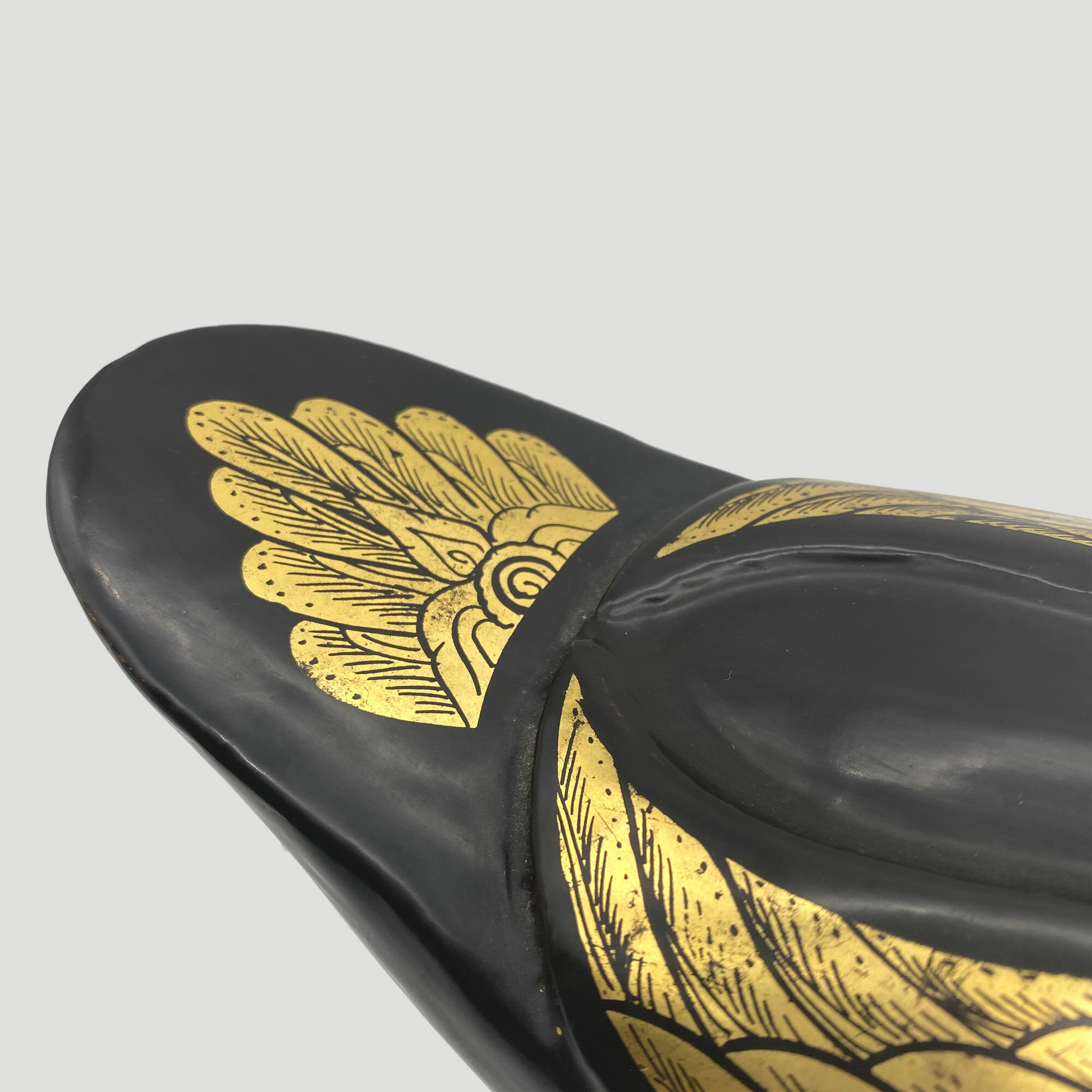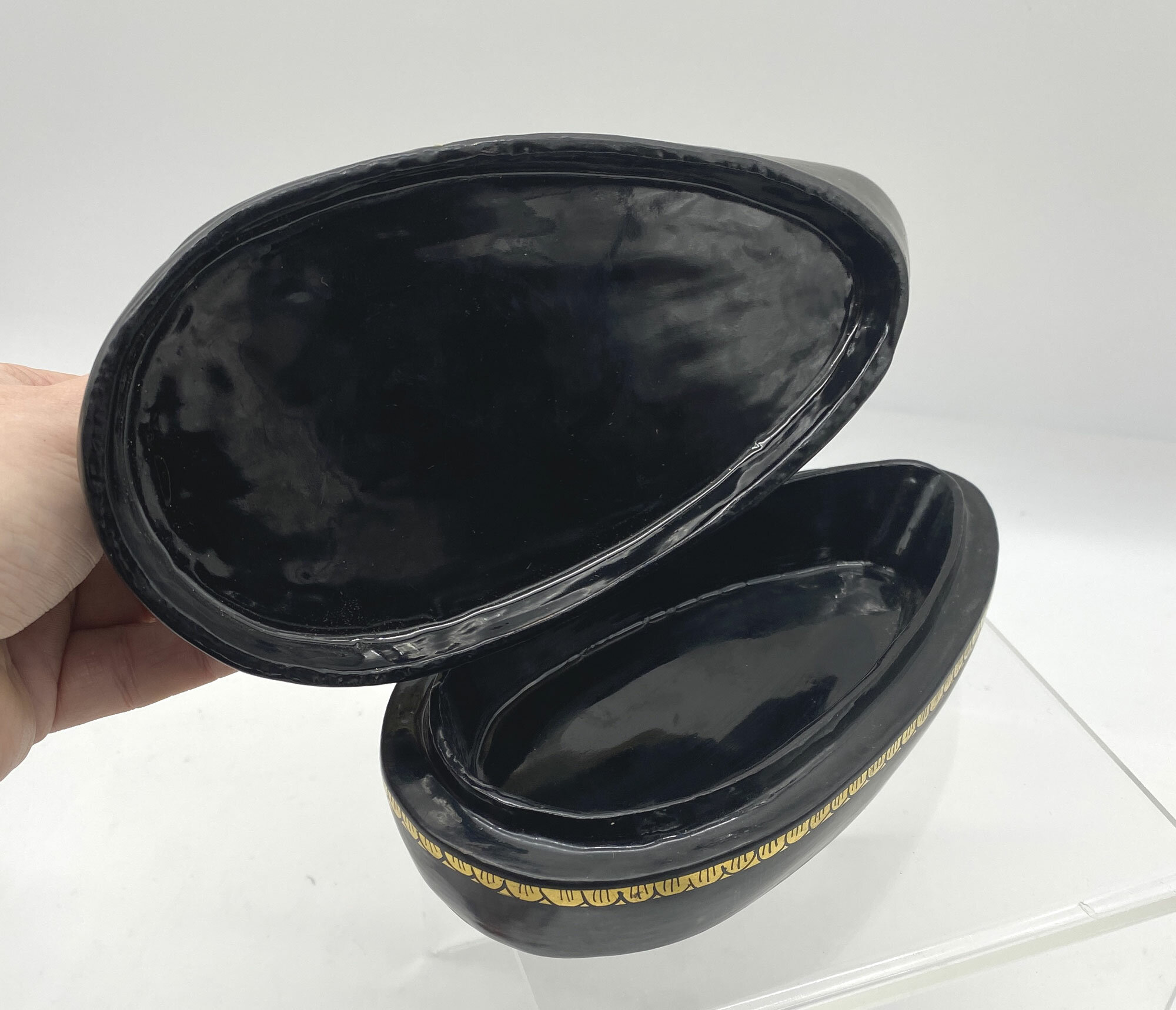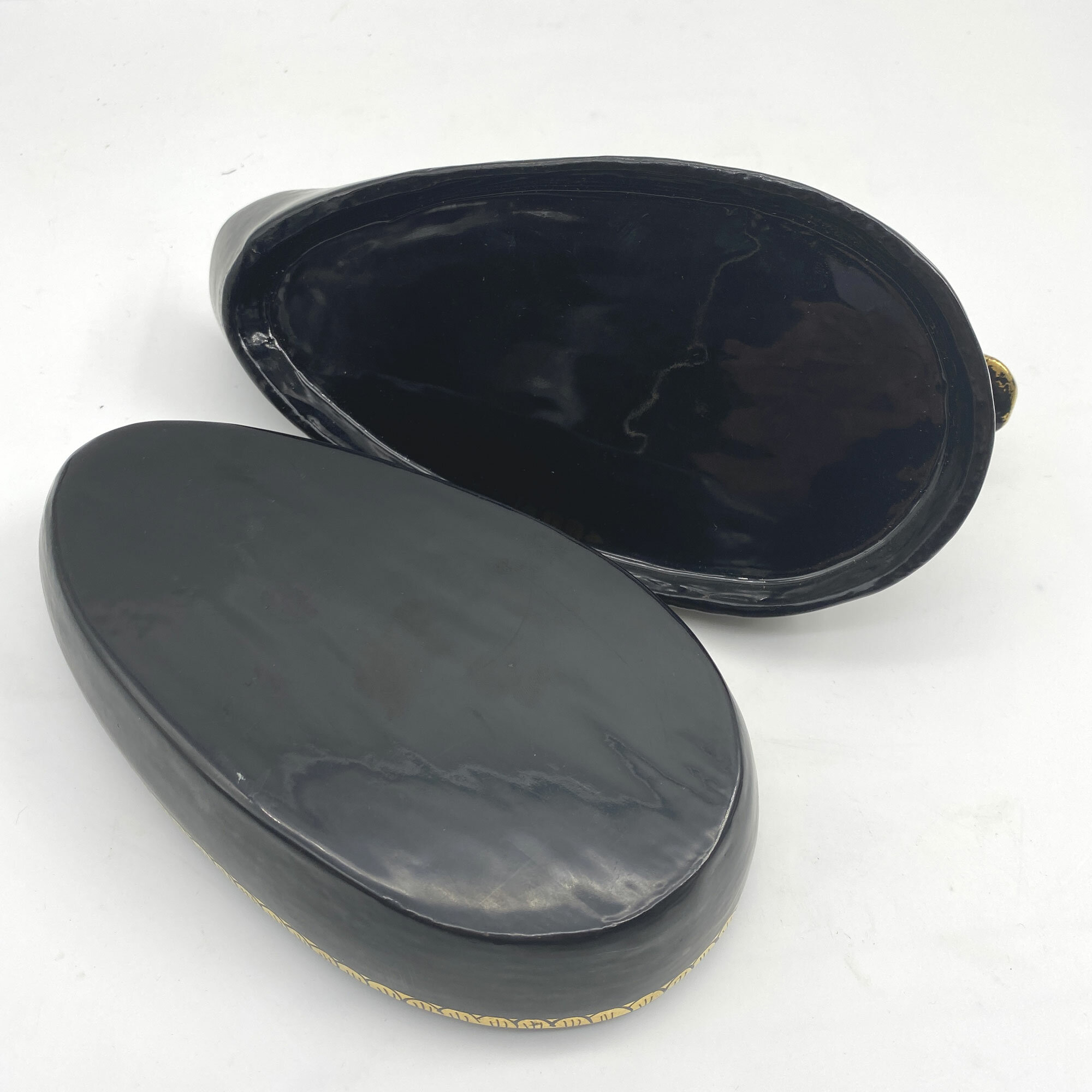This is an amusing trinket box in the form of a duck made from black lacquer with gilt decoration, the lid with wings and a feathered tail and the head with gilt eyes and beak. The base has a simple band of a repeating gilt geometric design. The form resembles the well known Chinese export porcelain 'goose' tureens made in the eighteenth century but the lacquer technique has more of Persian feel to it and this may be a more likely provenance. The whimsical style also suggests a date of manufacture in the 1960s or 1970s.| Size: | 22 cm long, 13 cm high and 10 cm wide |