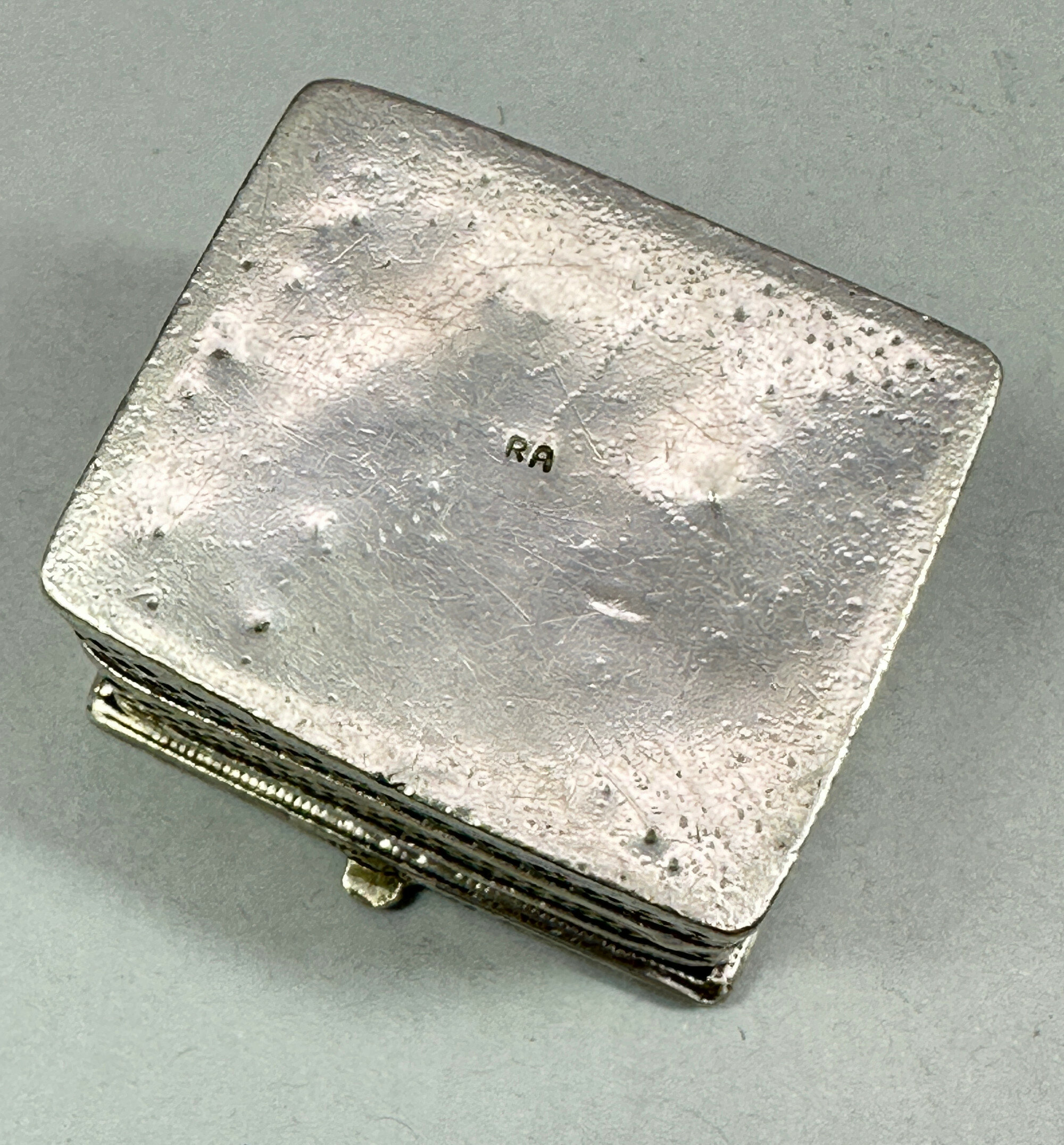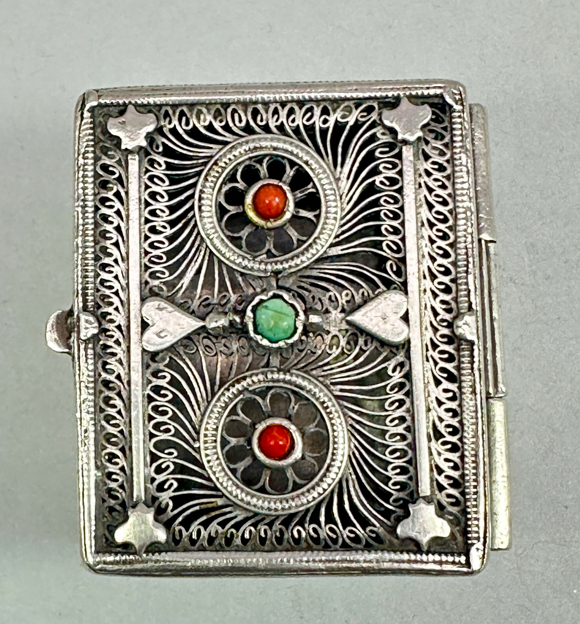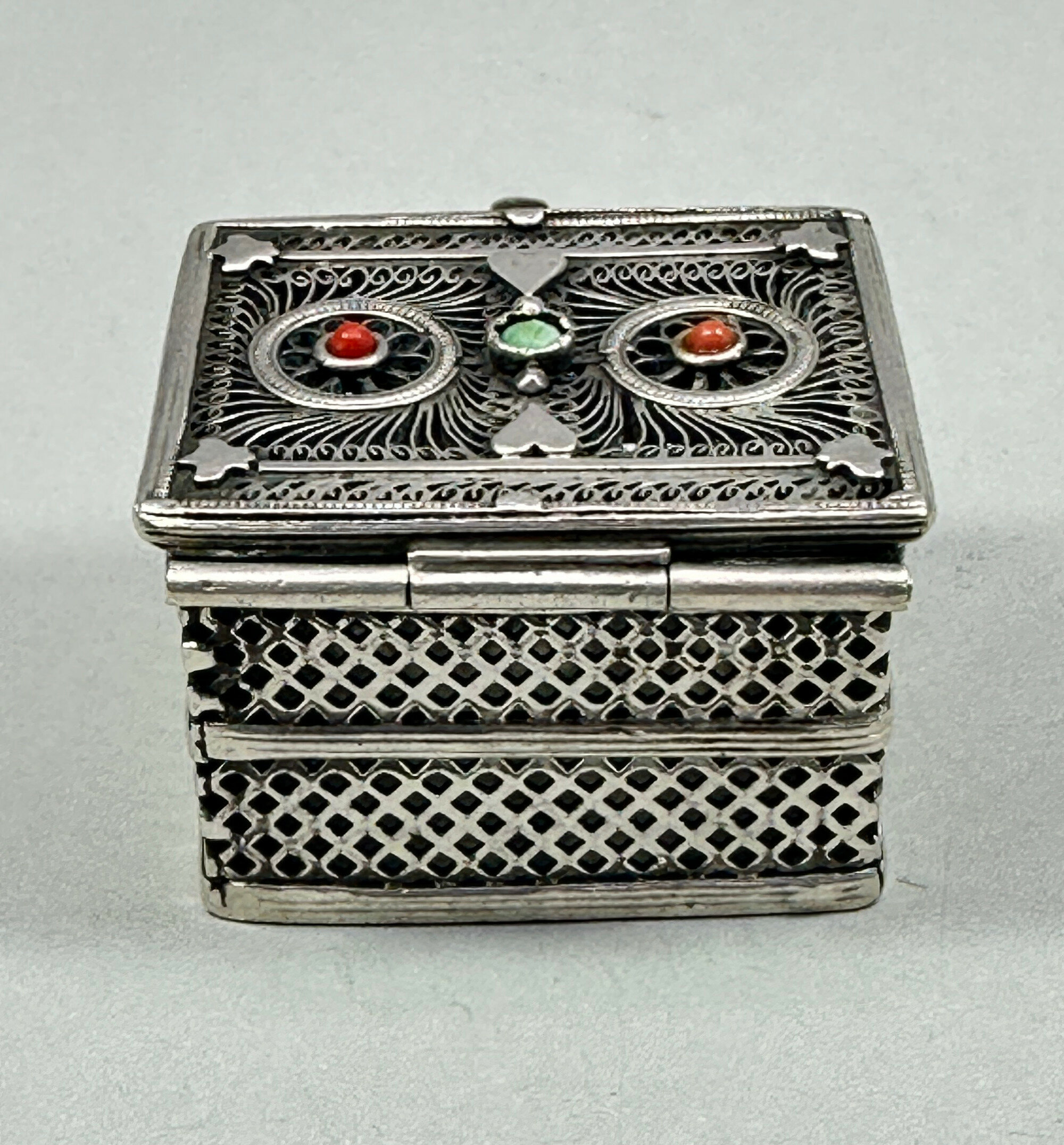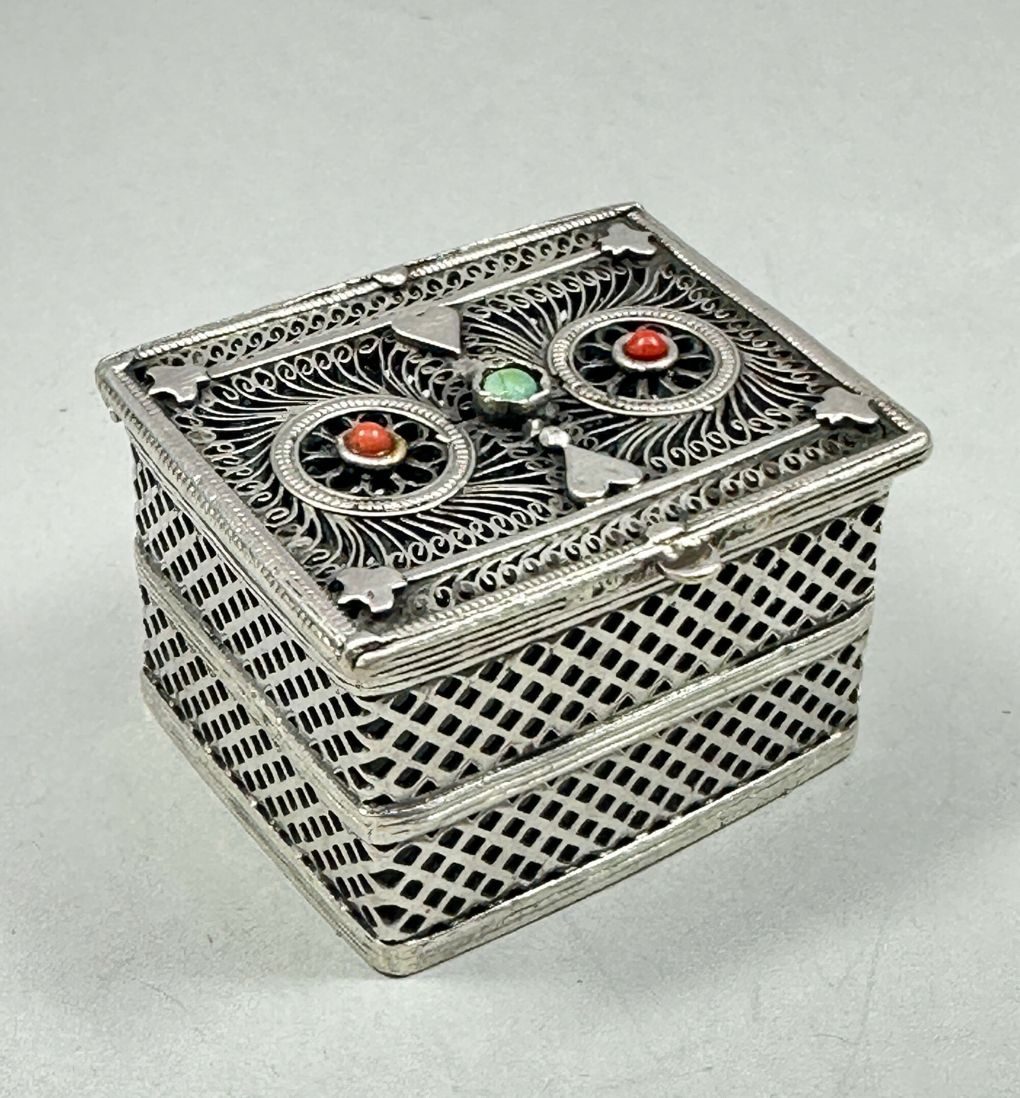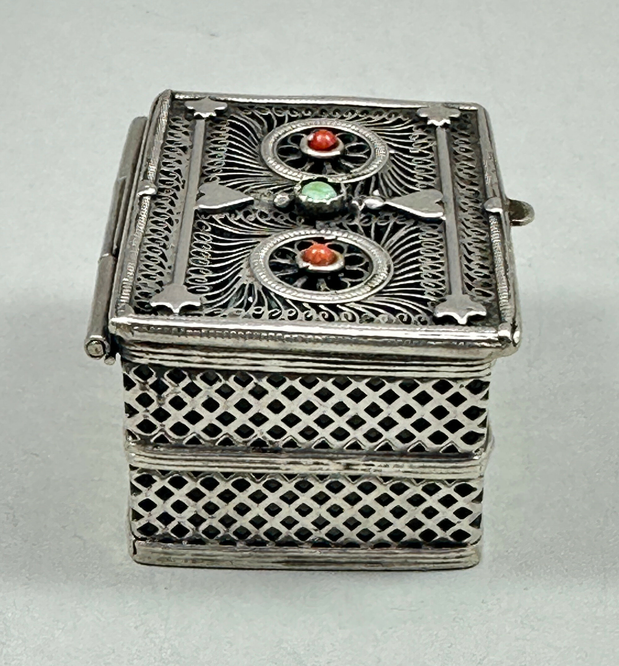 A silver box with openwork sides and a pierced cover most likely intended as a portable cricket cage, in the manner of similar Chinese designs, the sides with two geometric openwork bands between raised grooved borders, the cover with an elaborate openwork design incorporating swirling stylised foliage, raised heart and bird form plaques, and two roundels, inset with three hardstones in amber and celadon, the base flat and stamped 'R A'. The style of decoration suggests Islamic work, probably Persian in origin. Weight and quality of decoration indicate a circa date in the early C20th| Size: | 49.5mm x 42mm x 33mm |