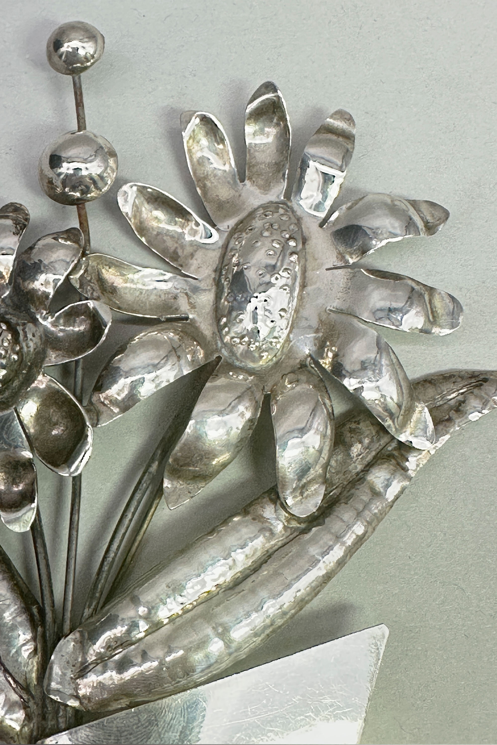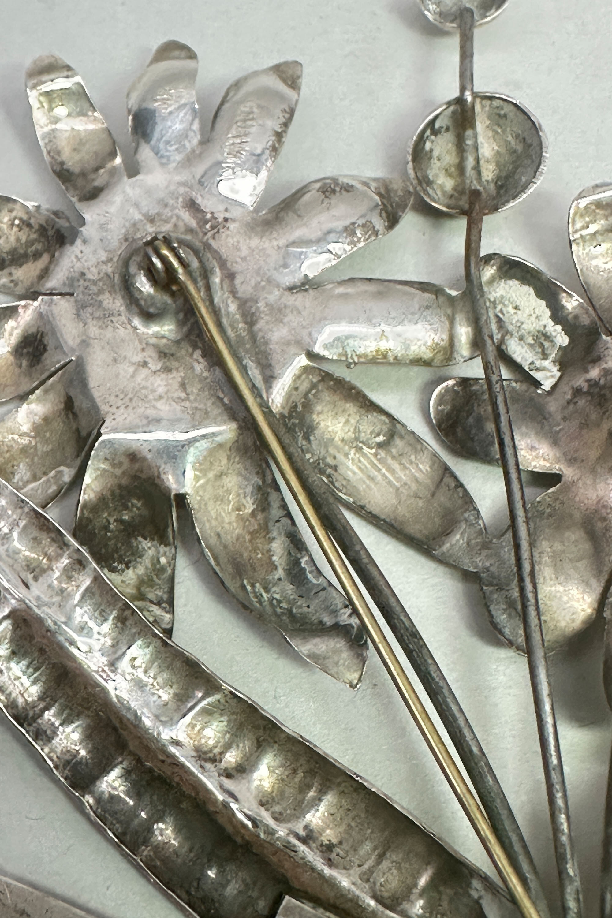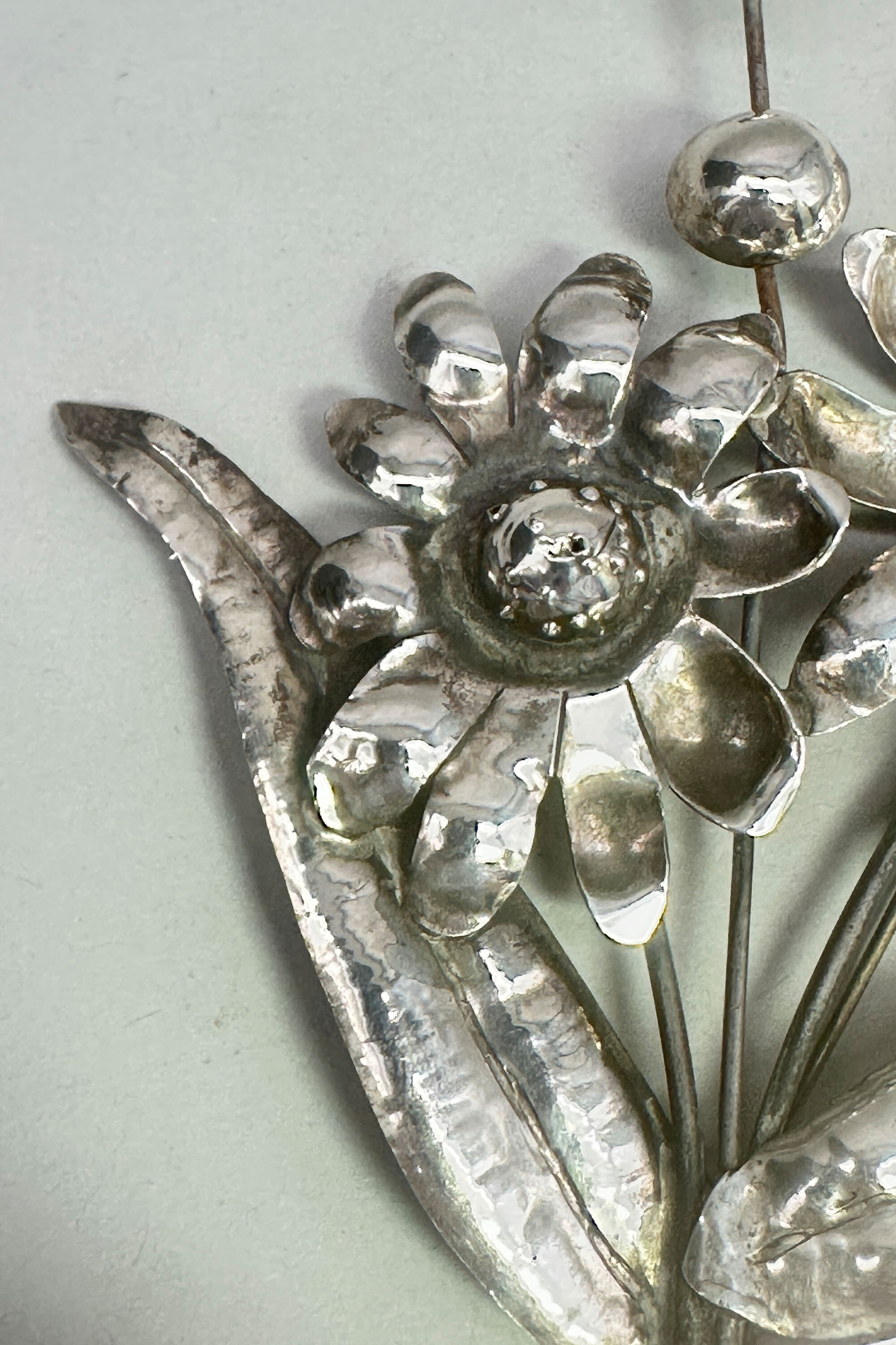 This is a very large floral spray brooch in silver with a slightly abstract modernist design, marked Sterling. Hammering of silver sheets like this was a popular technique in Mexican silver and this is an excellent example.| Size: | 14 x 10 cm |