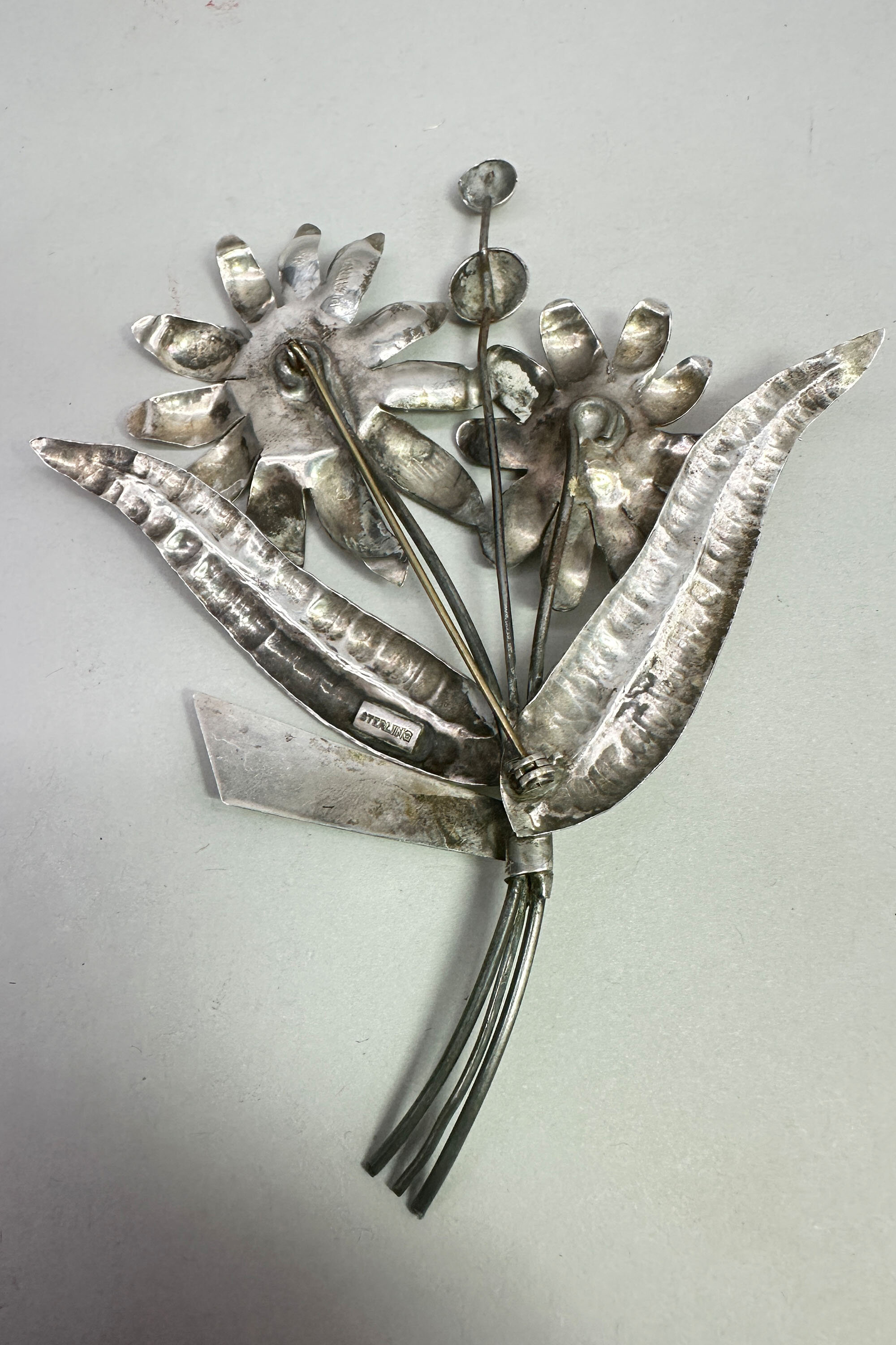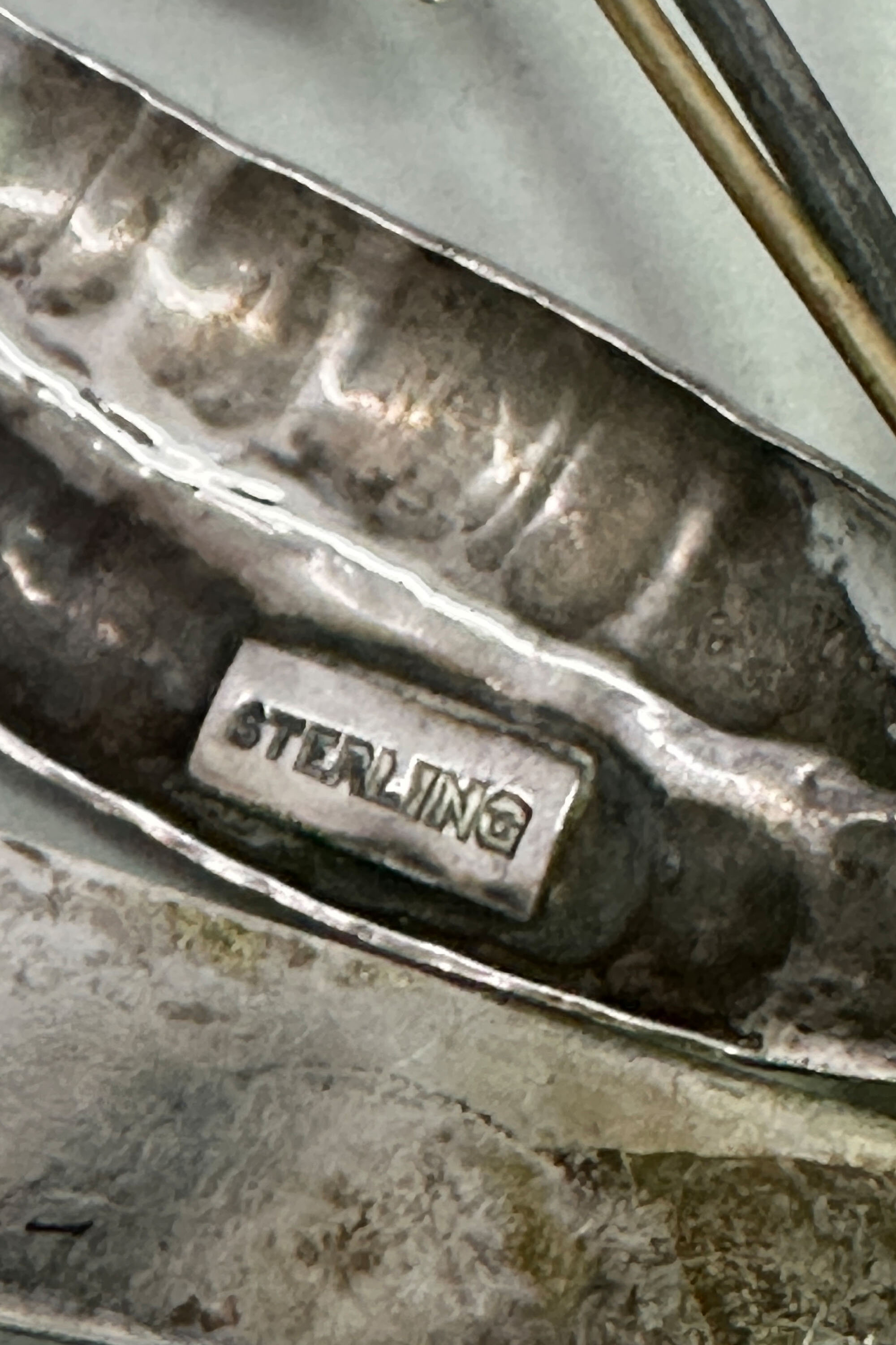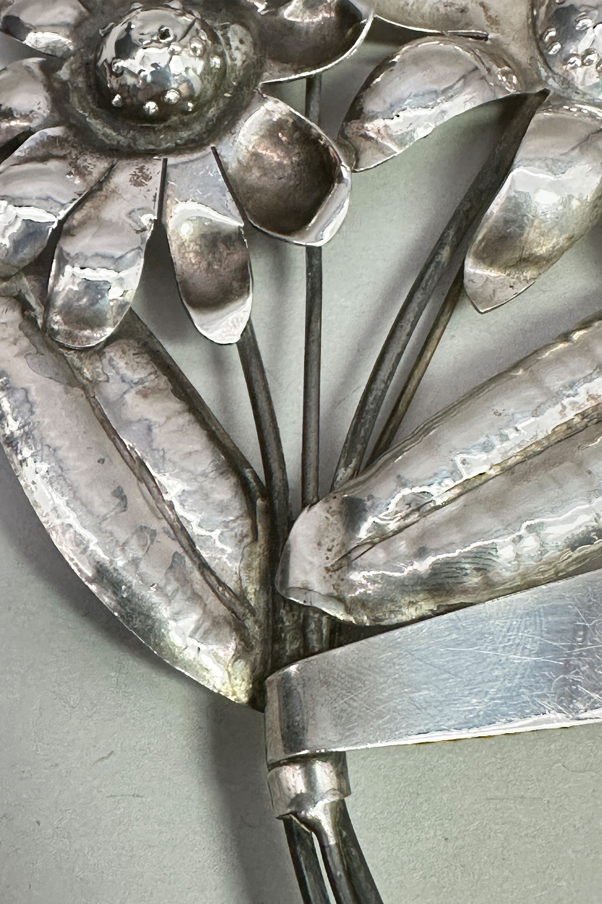 This is a very large floral spray brooch in silver with a slightly abstract modernist design, marked Sterling. Hammering of silver sheets like this was a popular technique in Mexican silver and this is an excellent example.| Size: | 14 x 10 cm |