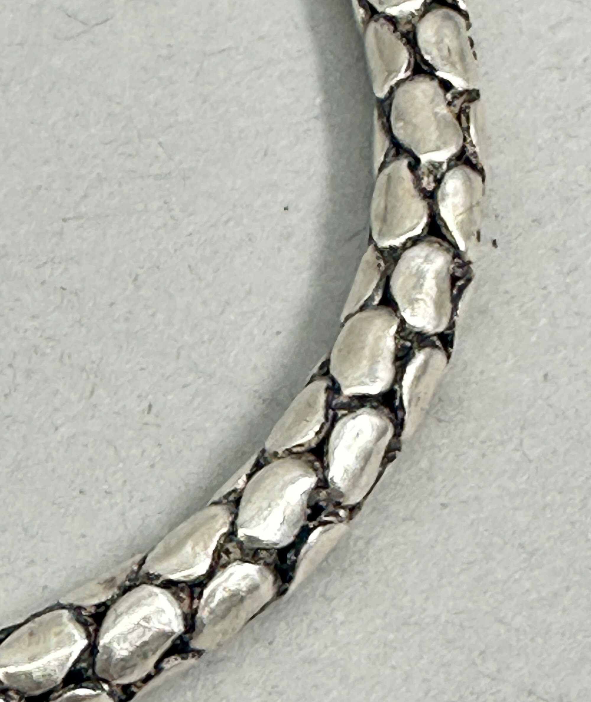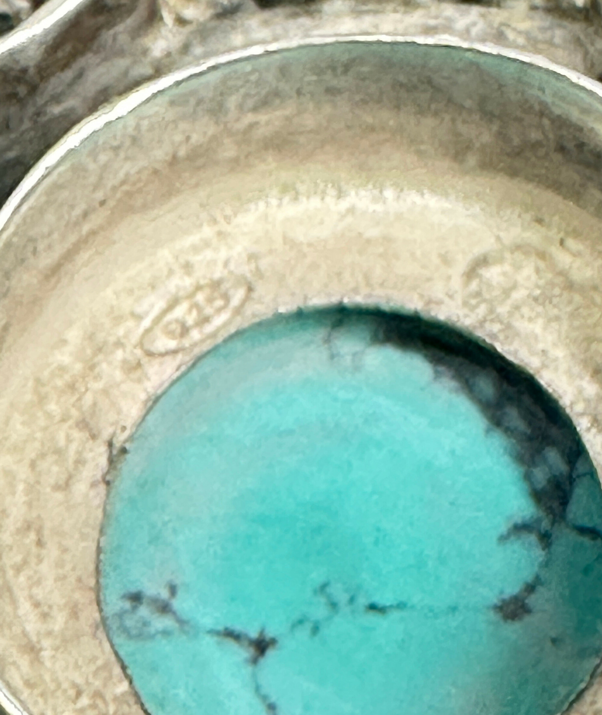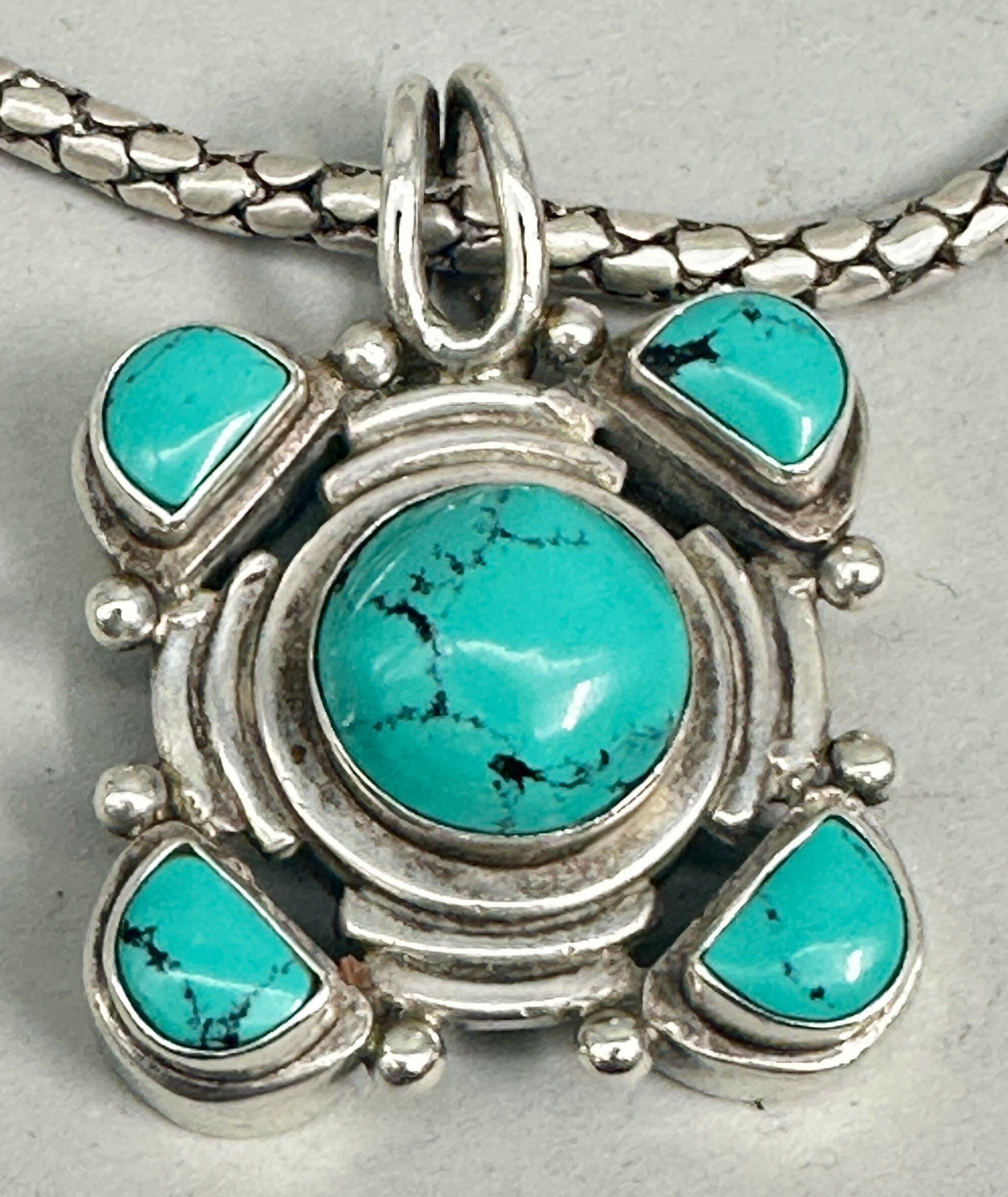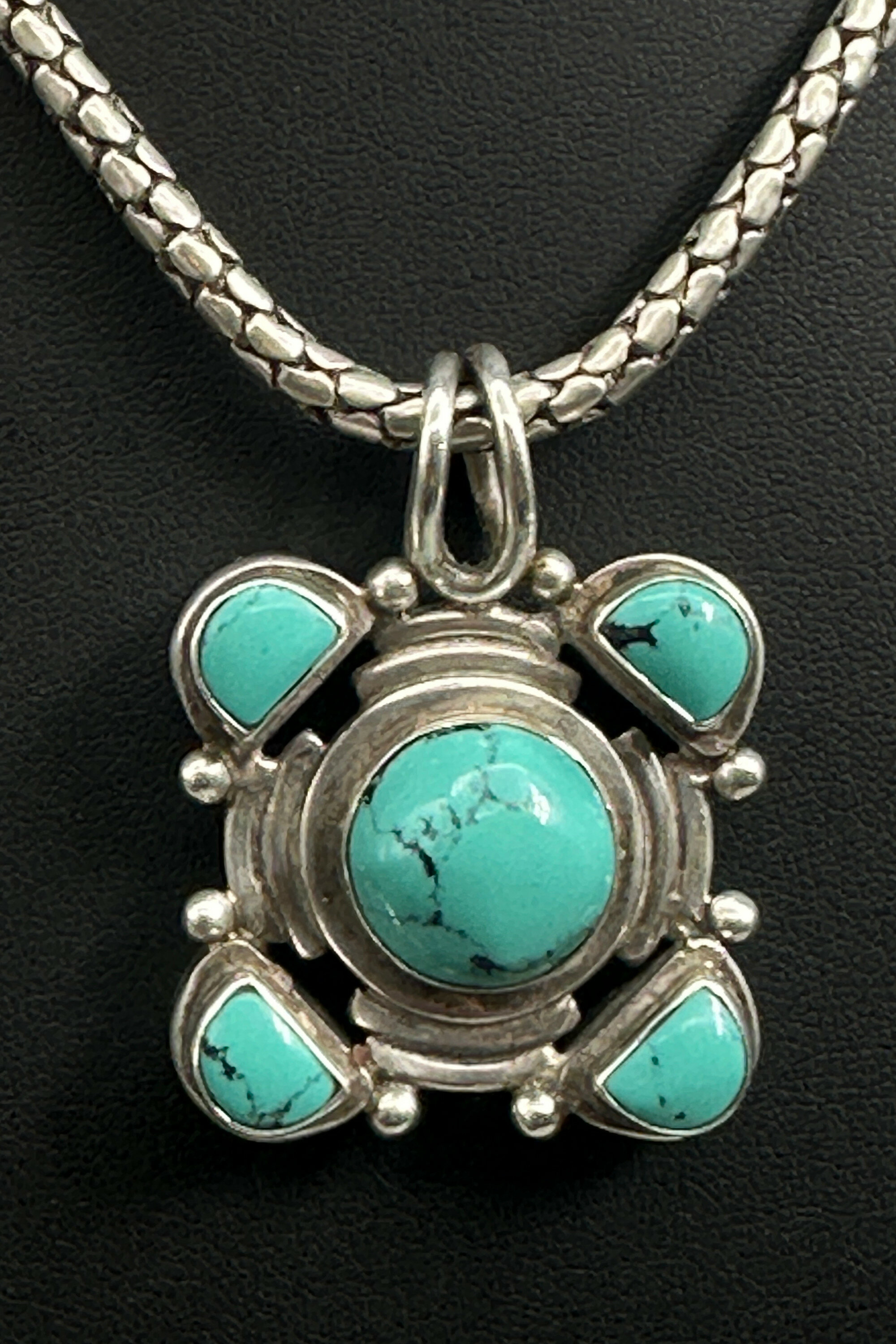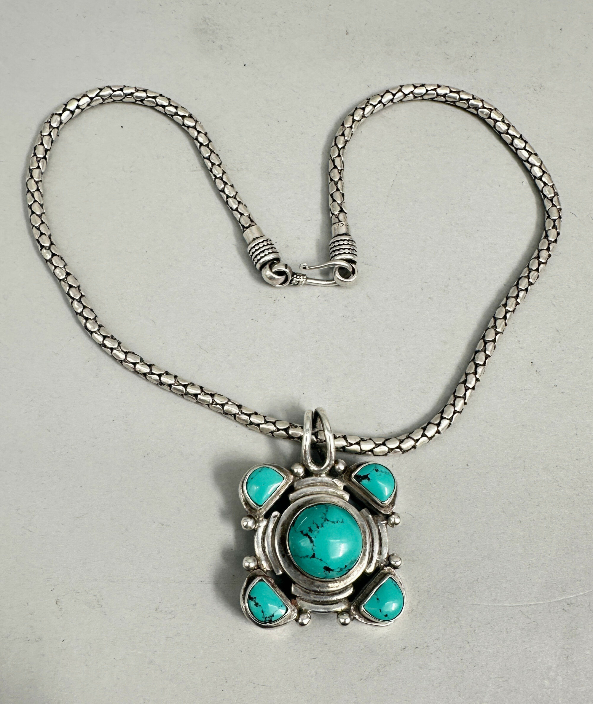 This is a very striking necklace comprising a large pendant with a modernist design set with North American turquoise, most likely from the Kingman mine. The pendant is marked 925 and has been later paired with a complementary and heavy Balinese chain which is unmarked.| Size: | Pendant measures 34mm x 34mm x 10 mm, Necklace is 3.8 mm thick and 45 cm long |