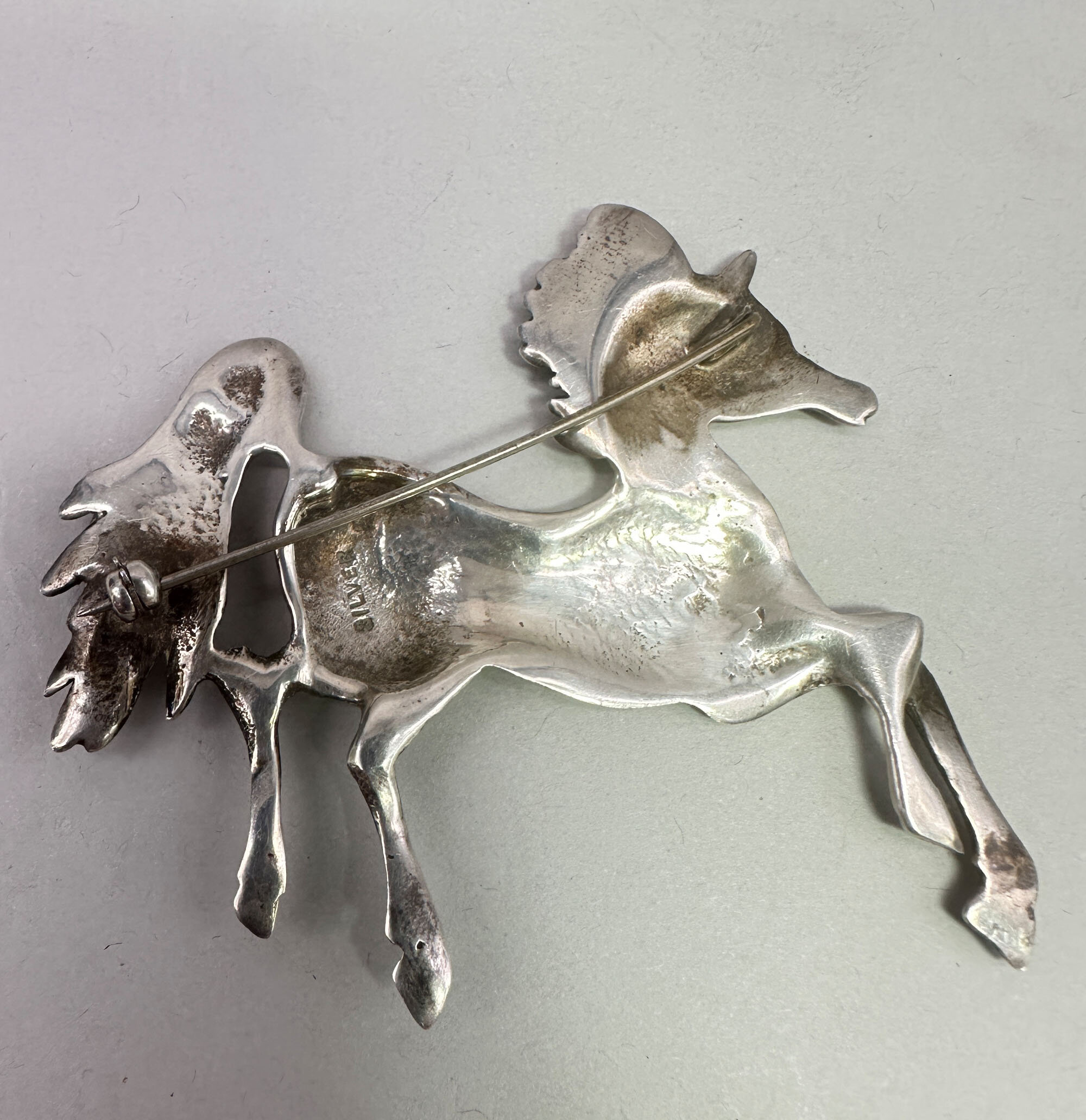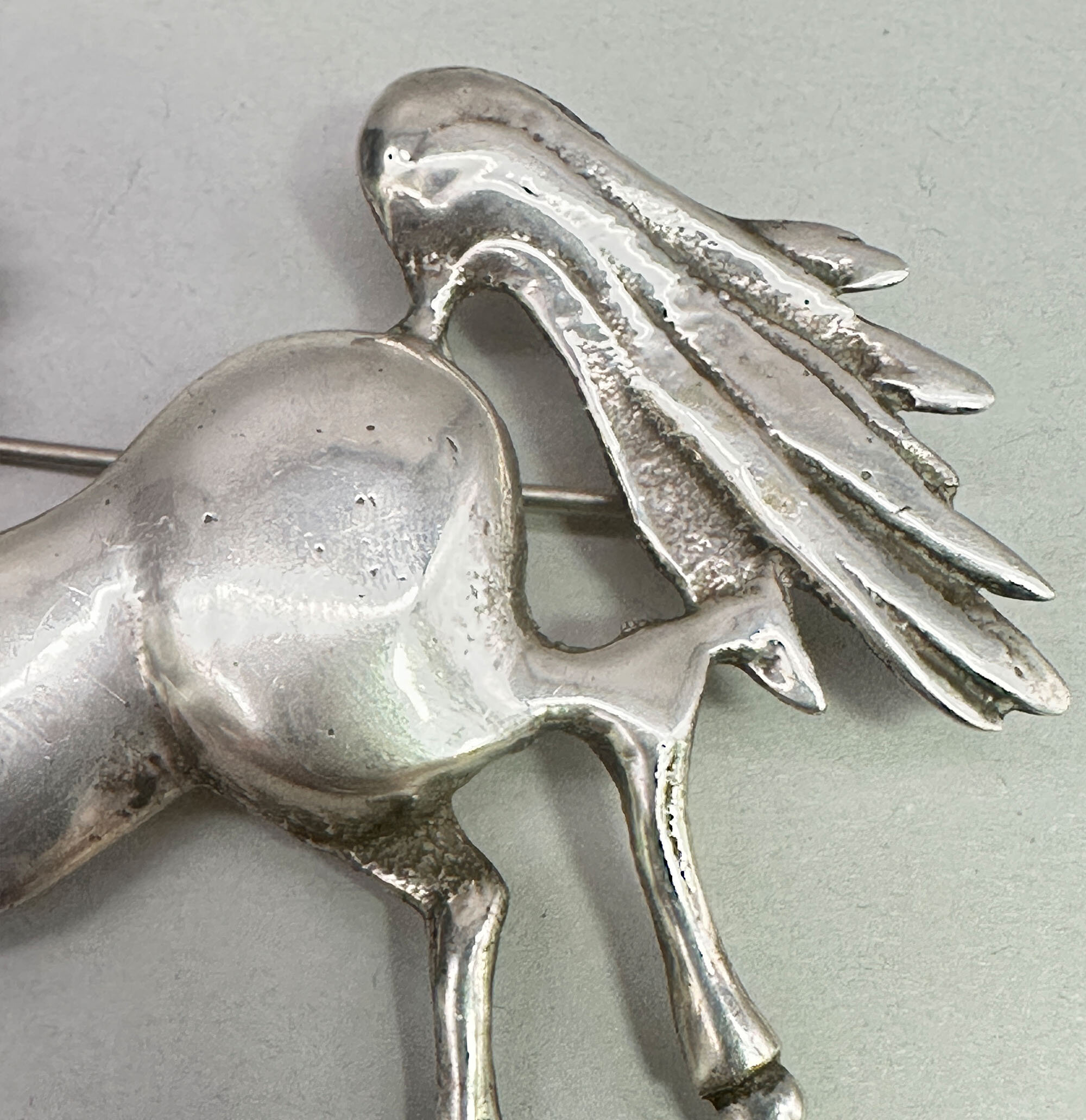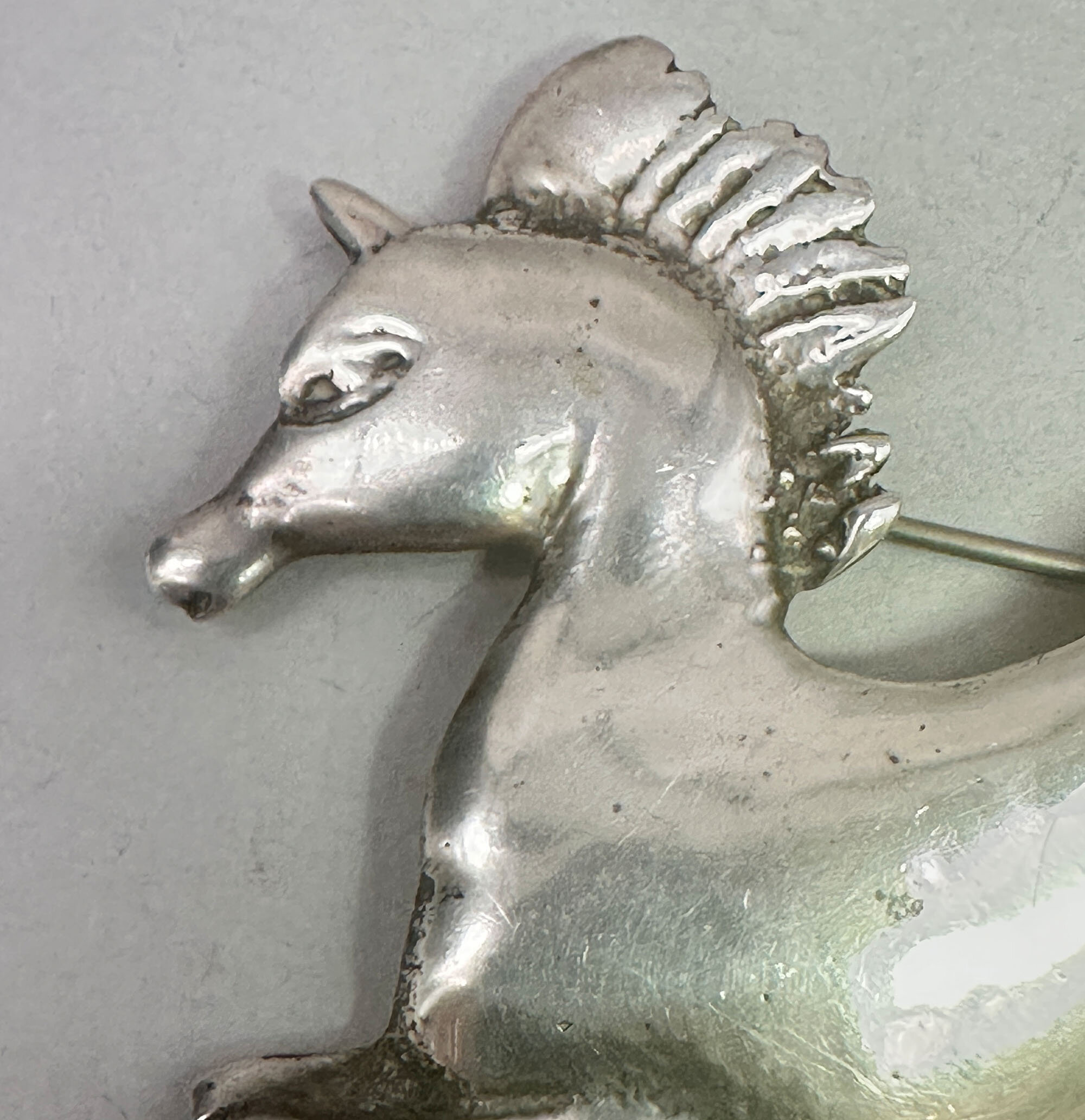 This brooch makes a real statement. It is a stylised image of a rearing horse and is marked silver.| Size: | 7.5 x 6 cm |