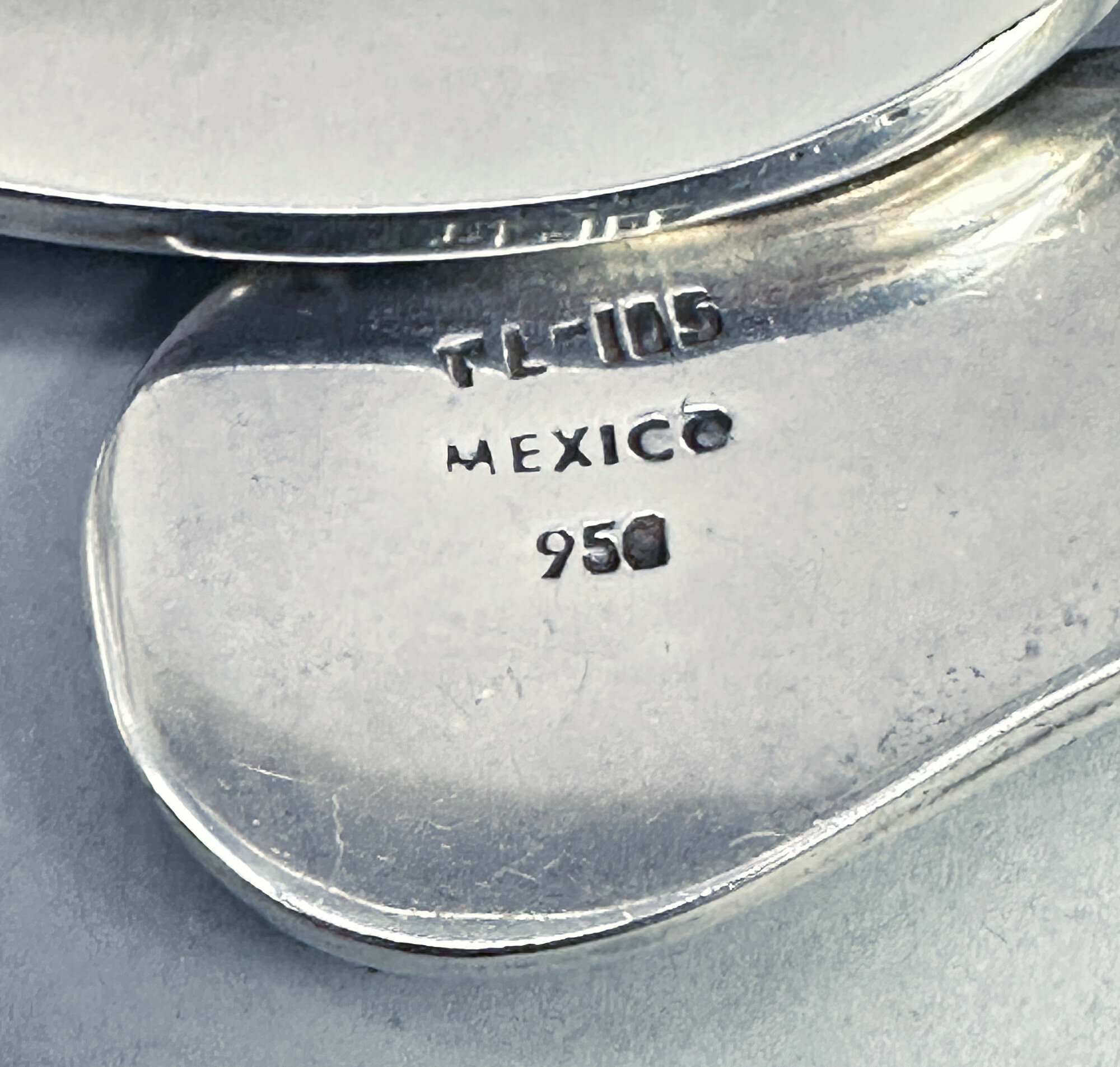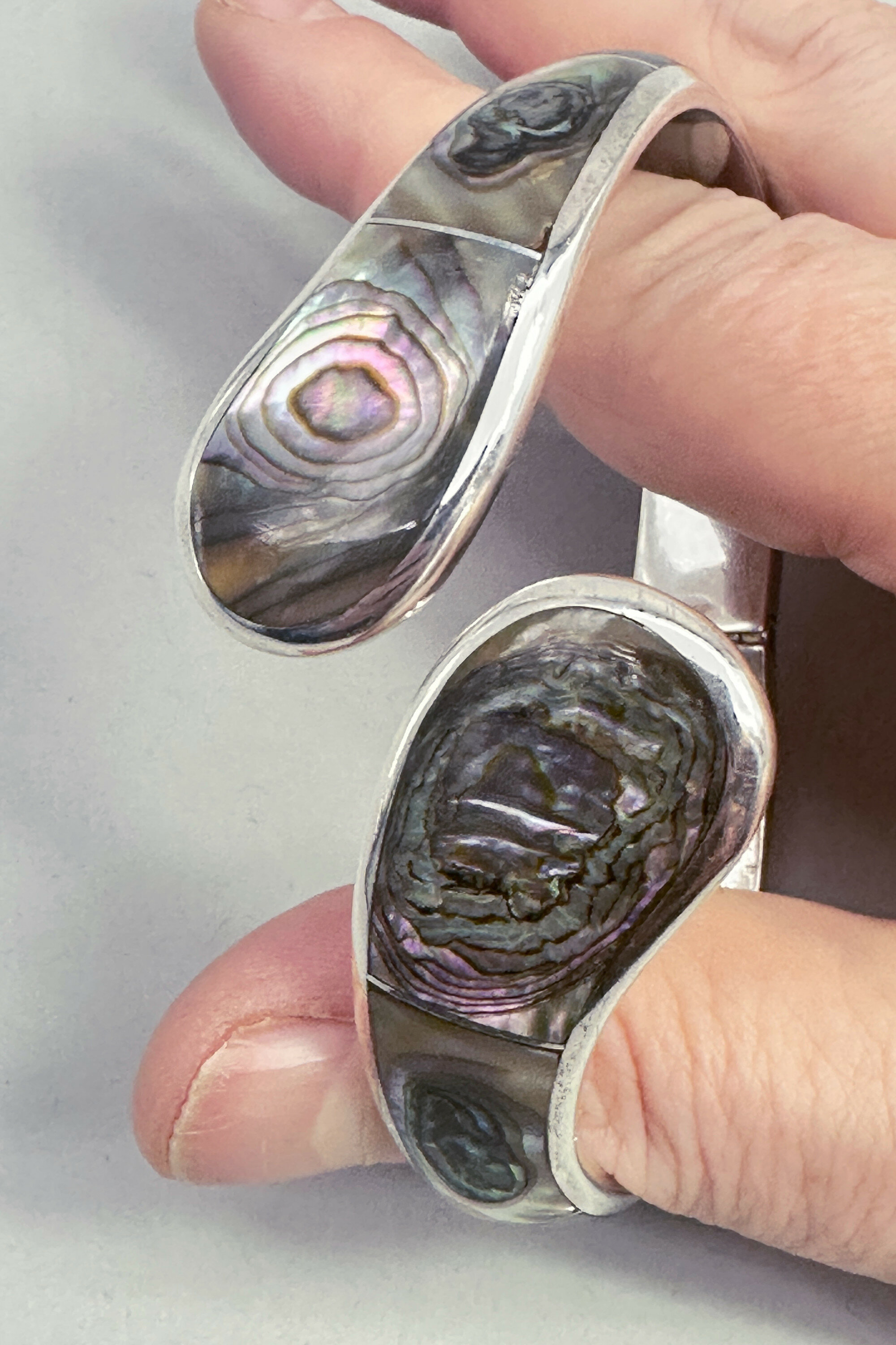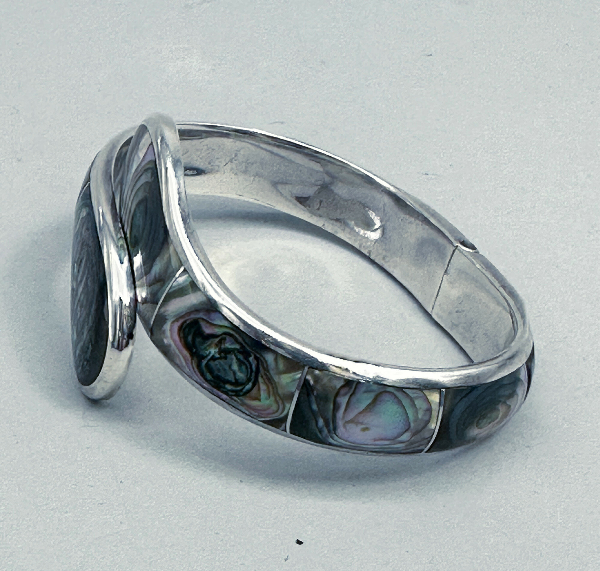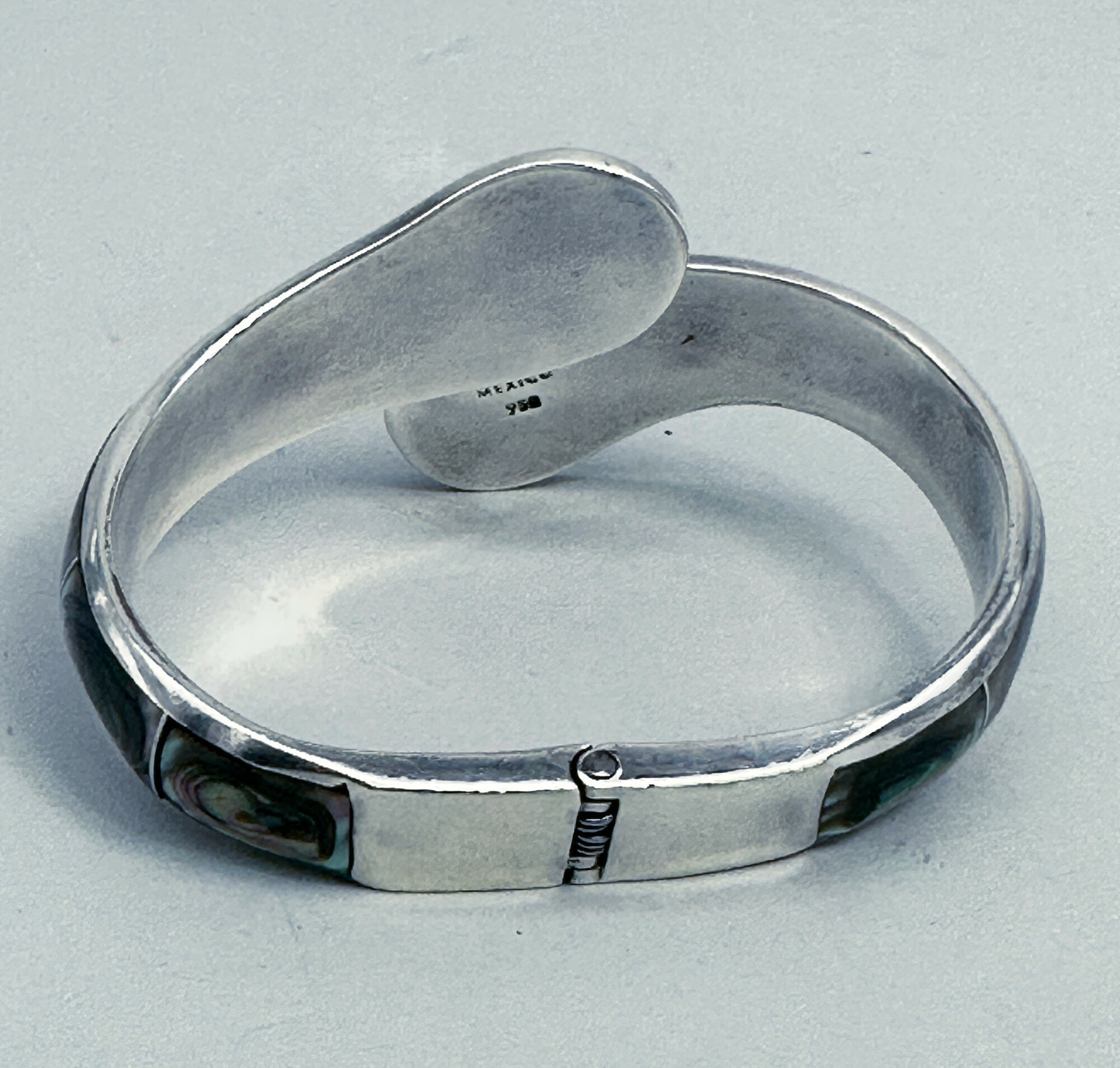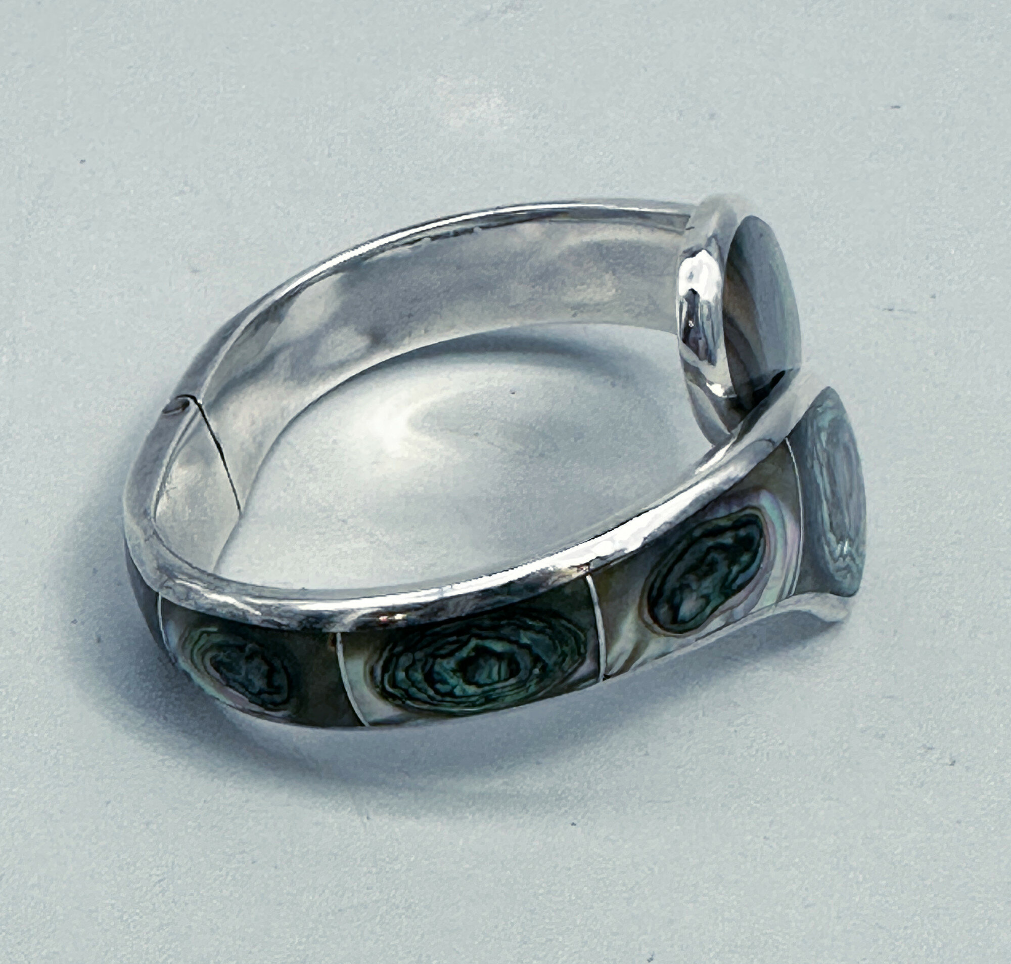 This is a very elegant bangle bracelet in a crossover design. It has a hinged opening so it is free sized. It is set with abalone stones and marked TL-105 950 Mexico.| Size: | Free size : Width 20 mm at widest point, Depth 3.5mm |