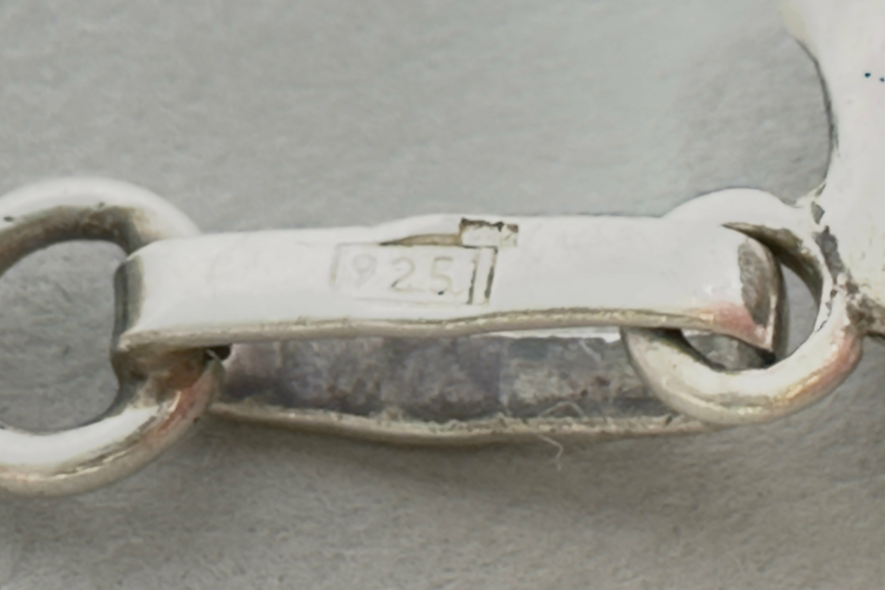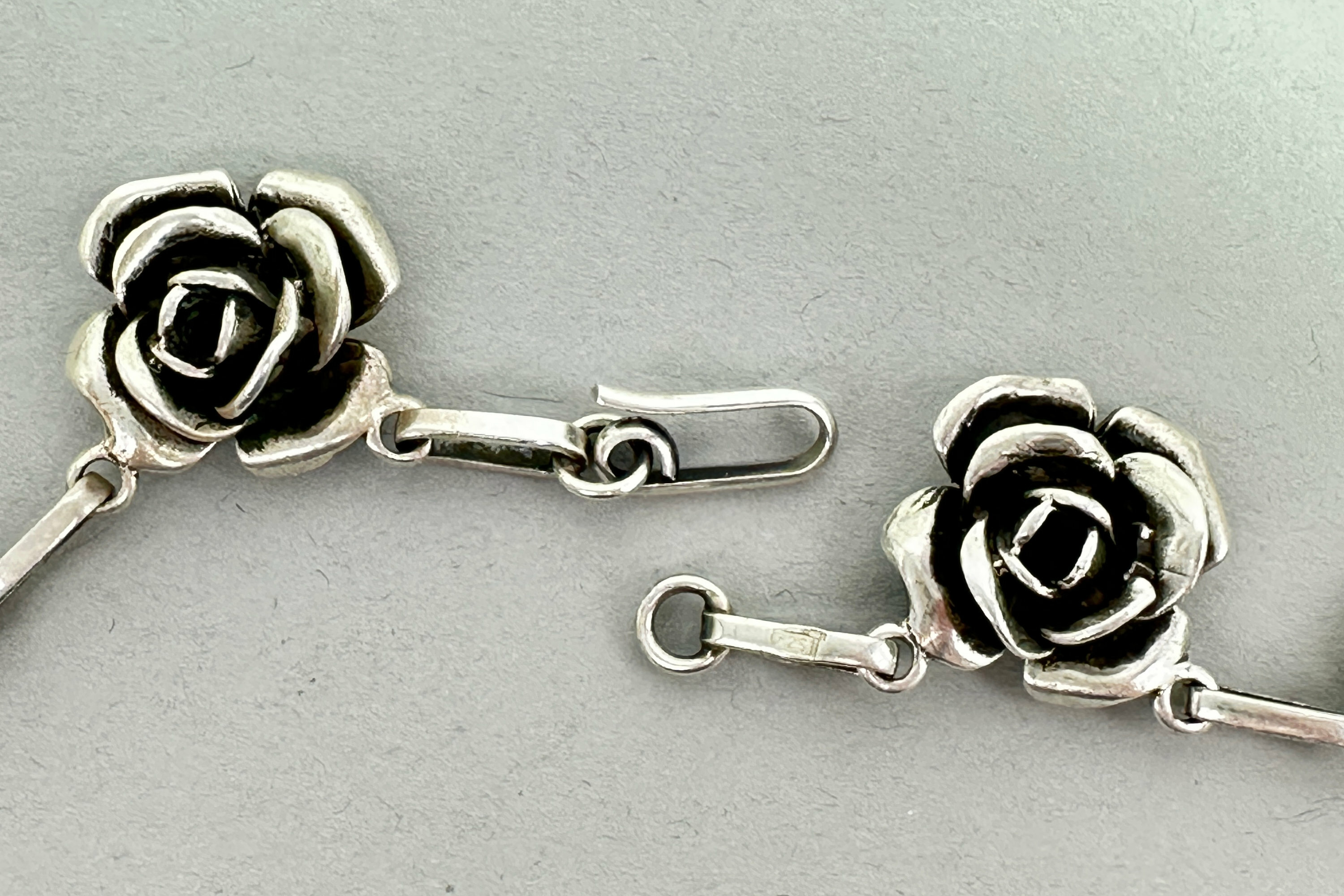 This is a beautiful necklace comprising stations of very finely modelled roses alternating with bar links that encircle the whole necklace and are joined with a hook clasp. It is marked 'B-27' (for the maker) and ' 925' and dates to the mid twentieth century.| Size: | Length : 41cm; the rose stations :13mm x 15mm |
