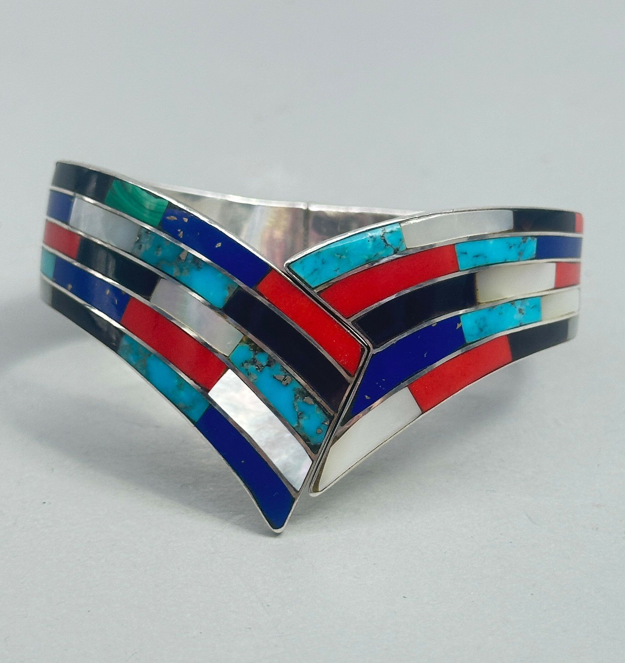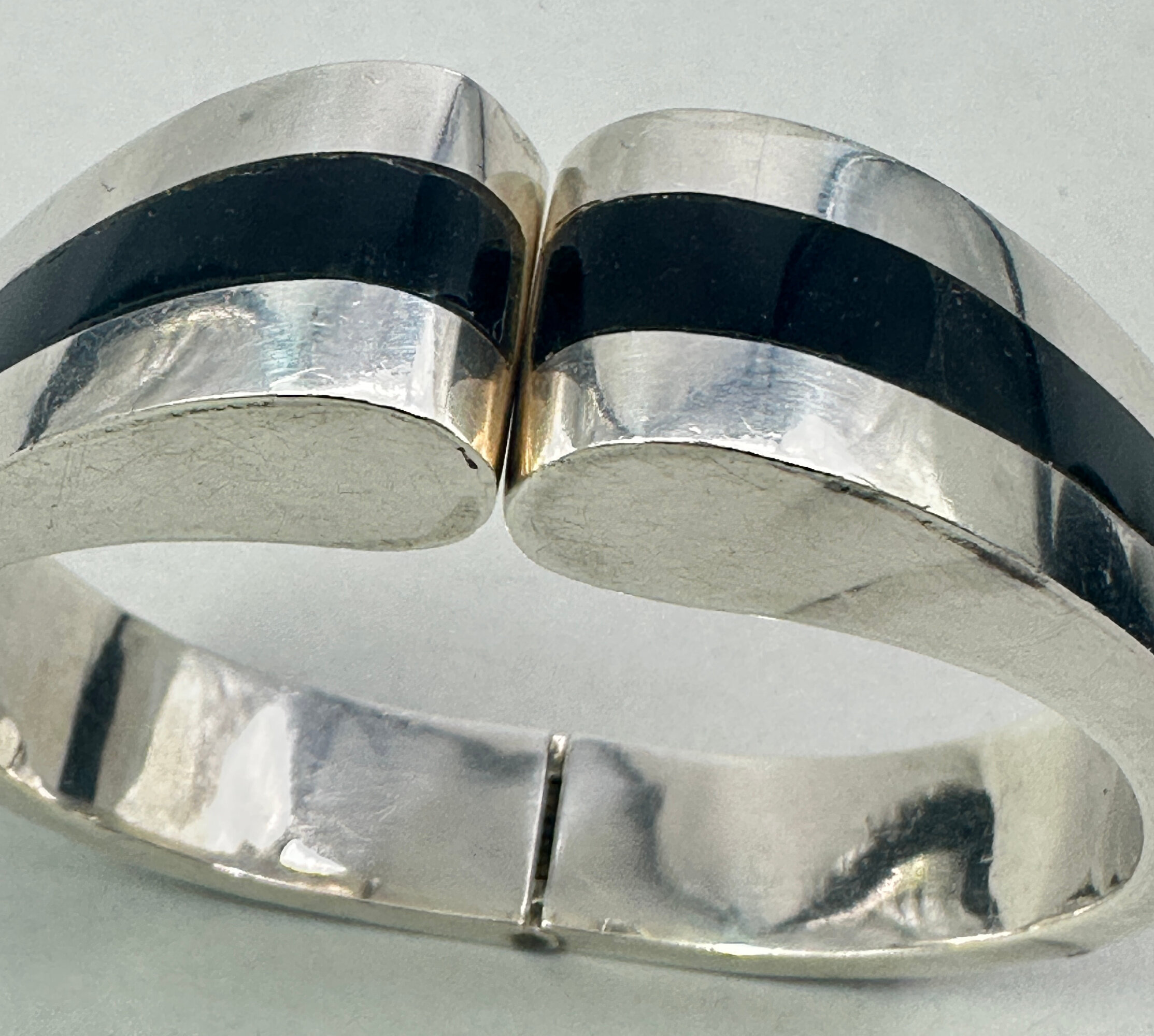 Taxco silver bangle with onyx and sodalite mosaic decoration, 1990s