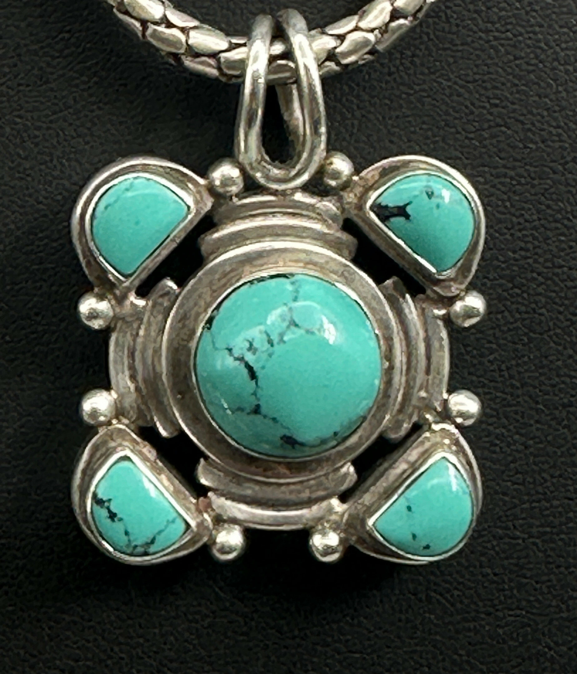 Round pendant set with turquoise, Mexico, c1970, the chain later.