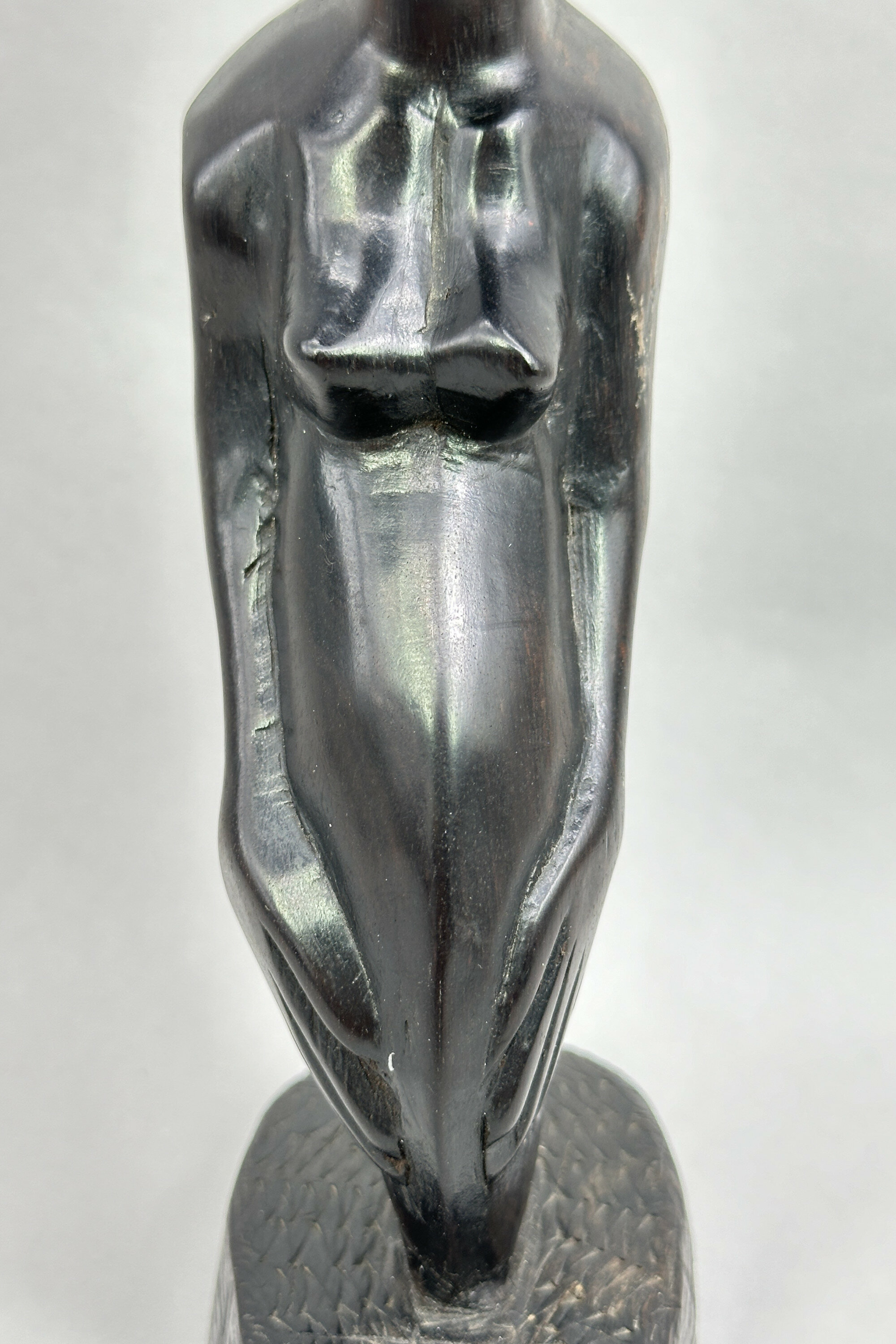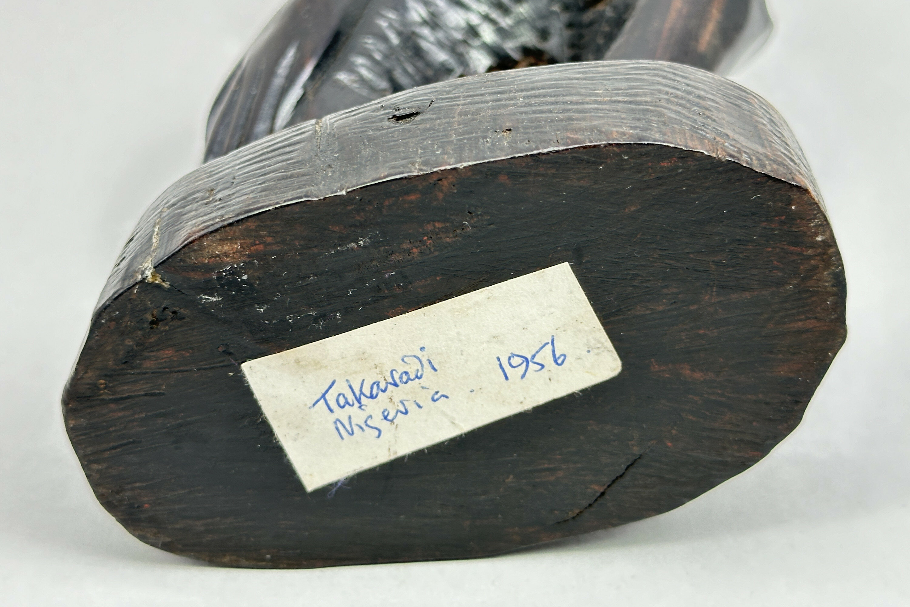A carved wood figure of a lady in abstract expressionistic style represented kneeling with her legs presumably tucked up behind her, the body smooth and with detailing to the hair which flows down onto her back, the base in the form of a sketchily modelled rock. The colour and patina of the wood suggests ebony and the style seems African - Nigerian, in fact, if the label is to be believed, although the town indicated, Takarodi, seems to be located in Ghana. Dating, though, is probably as the label suggests and this was, no doubt, one of the many pieces made by local craftsmen as tourist souvenirs.| Size: | Ht 26cm (max); Width 10cm (max); Depth 6cm (max) |