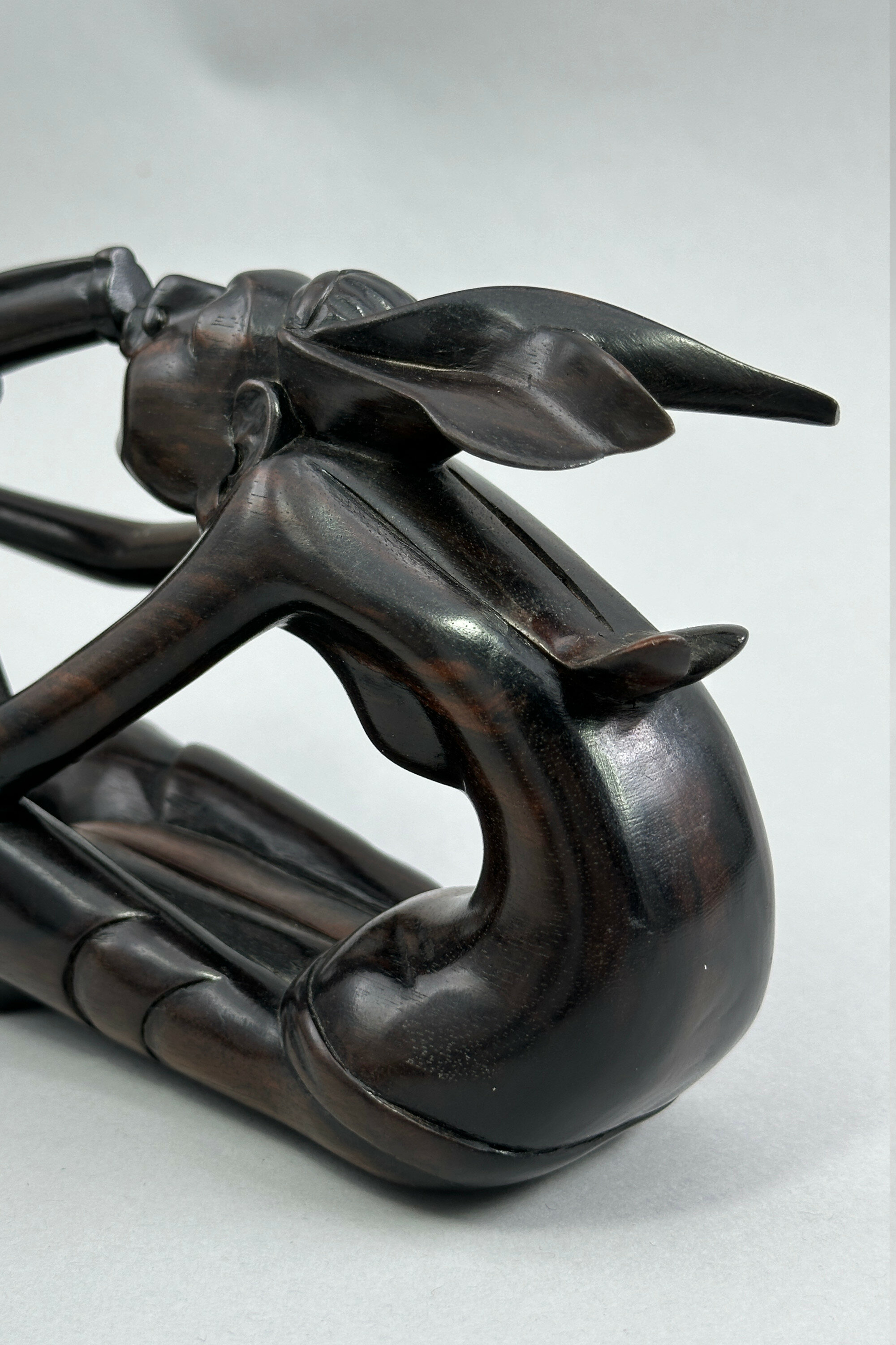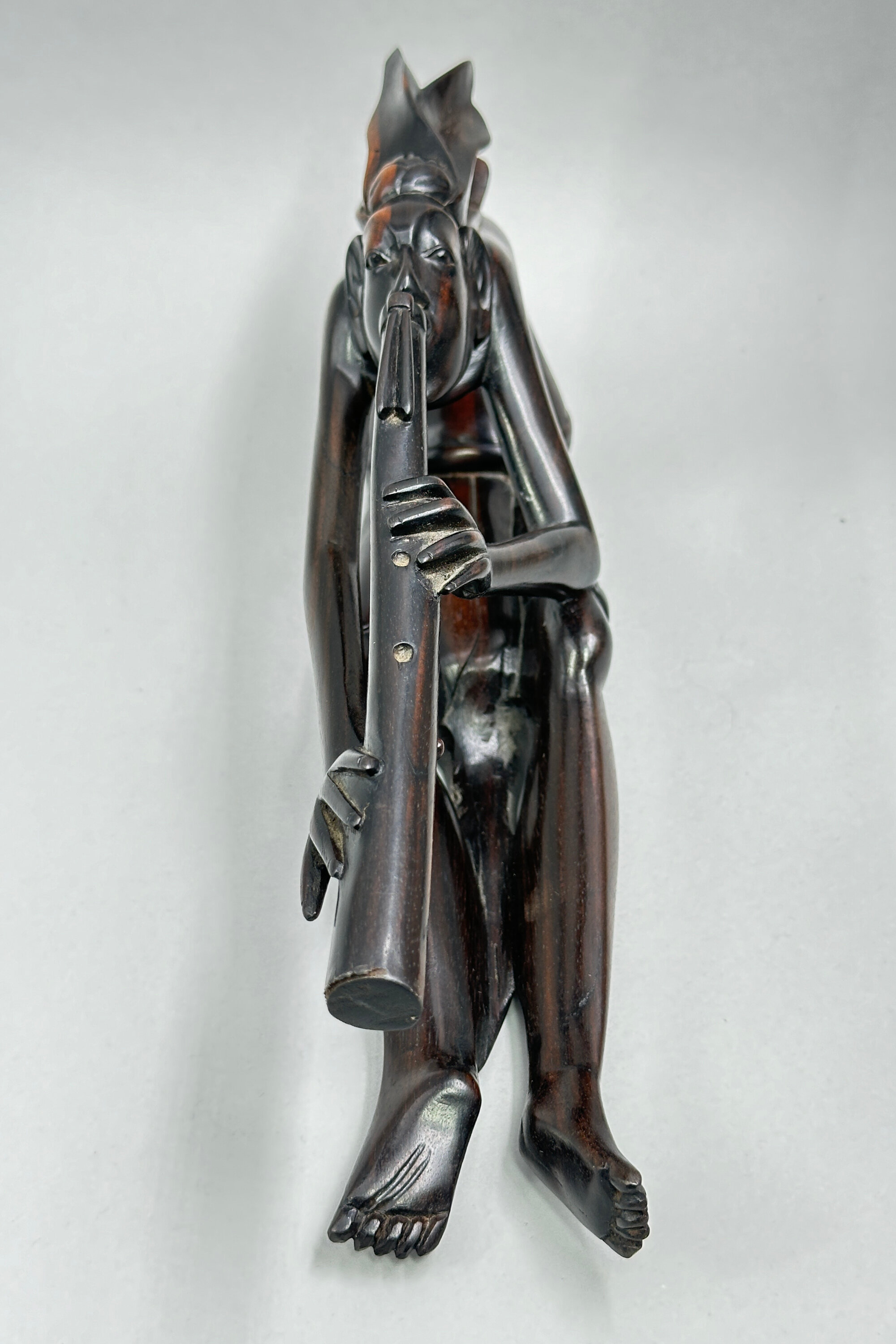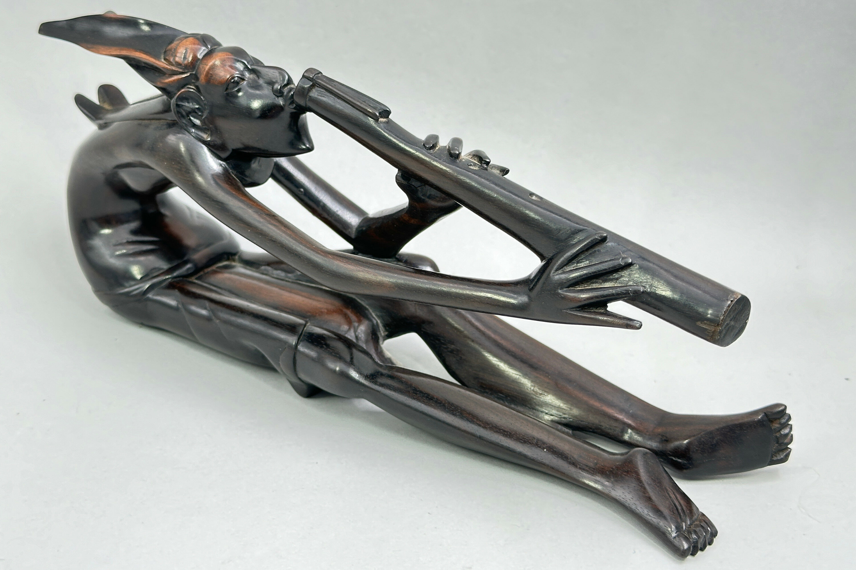 A rosewood figure of a seated musician playing a wind instrument, carved in a semi abstract style and with elongated proportions, the surface highly polished and showing in places the variegated patina of the wood. The style suggests African work similar to the pair of Makonde style figures also included in this sale but while similar pieces can be found there are no direct parallels. But the composition is striking and the quality of the wood enhances the carver’s skill. Dating to the second half of the C20th seems likely, perhaps to the 1960s.| Size: | 26.5 cm long |