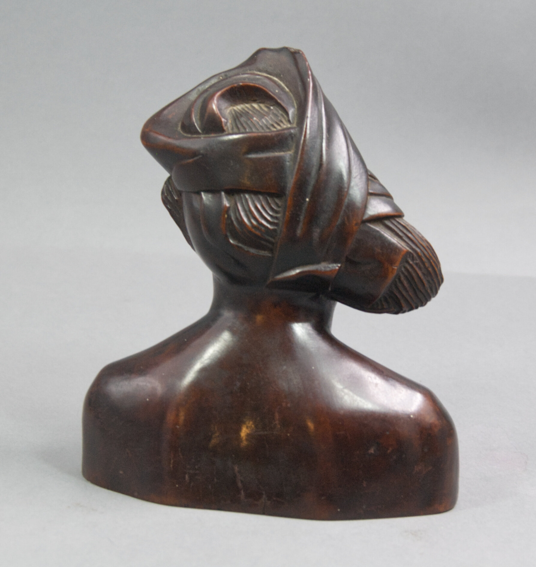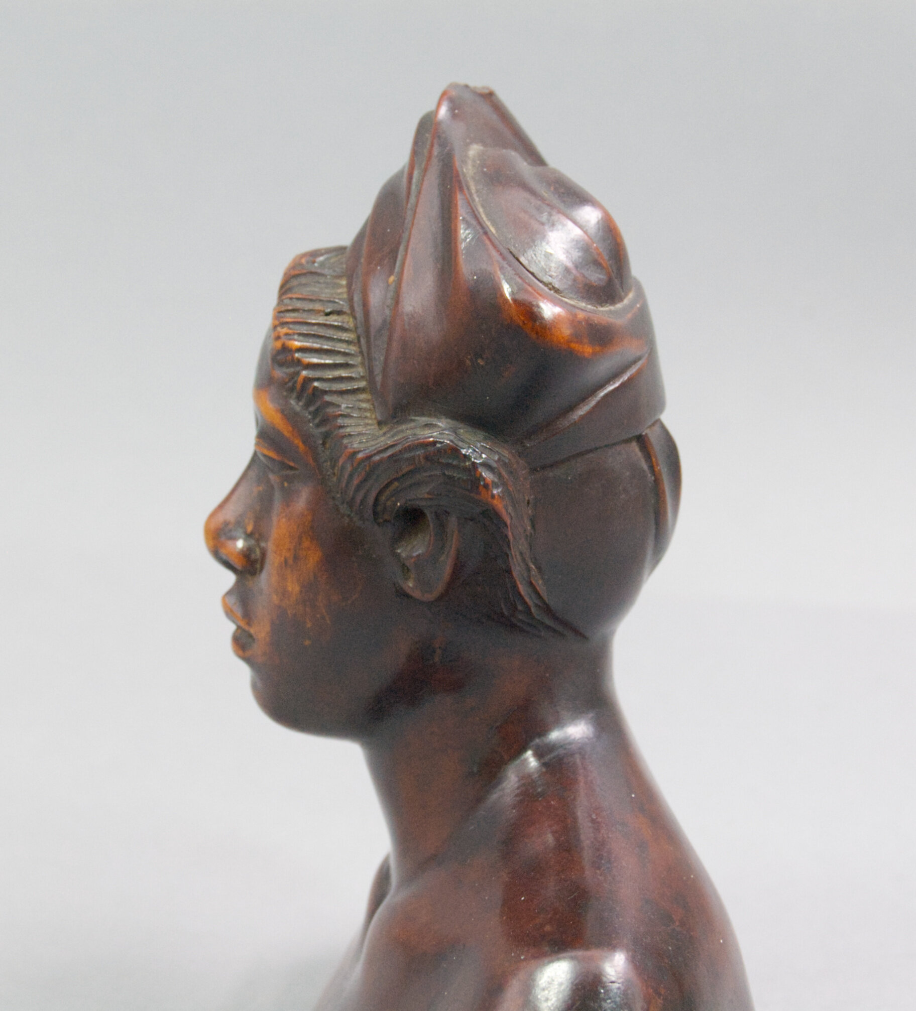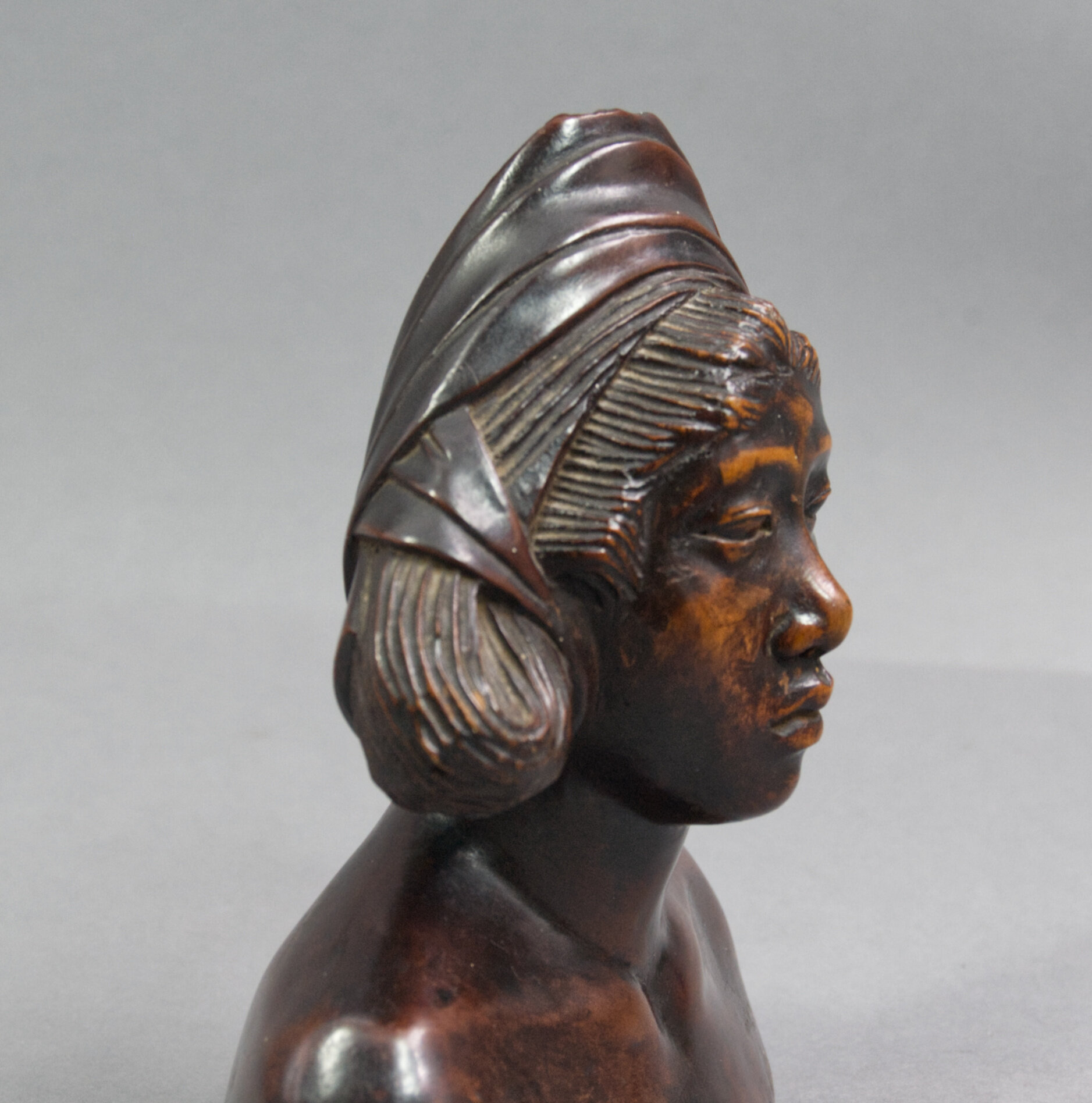 Balinese hardwood Portrait Bust depicting the head a young man wearing traditional headdress. Figures of this type were made in Indonesia on the island of Bali and are sometimes found in pairs of a man and a lady, giving rise to the suggestion that they were wedding sculptures. Dating is usually ascribed to the early 1900s and this piece would then reflect the interest in ethnic art which was quite widespread at that time.| Size: | 15.5cm x 13 cm |