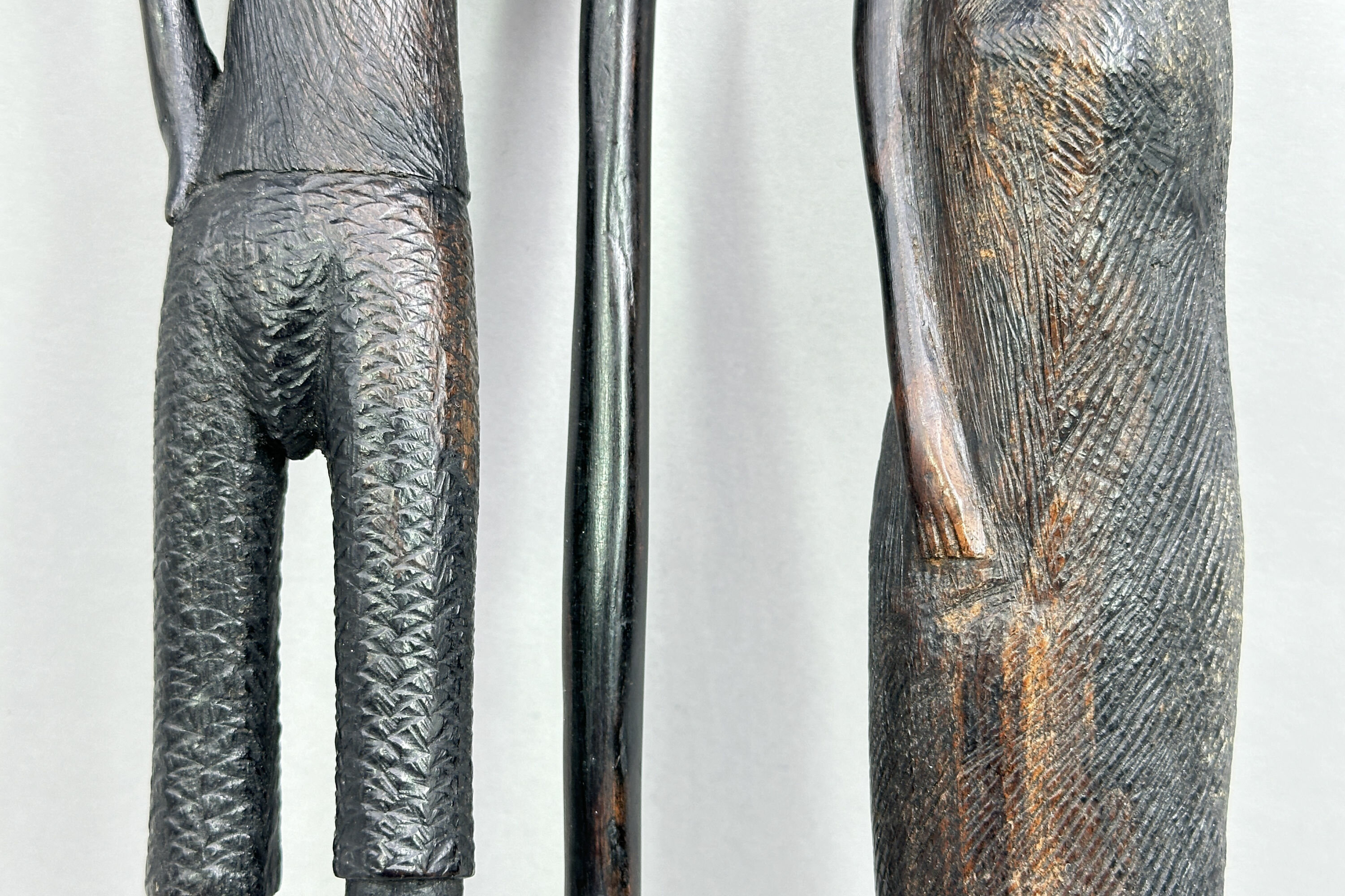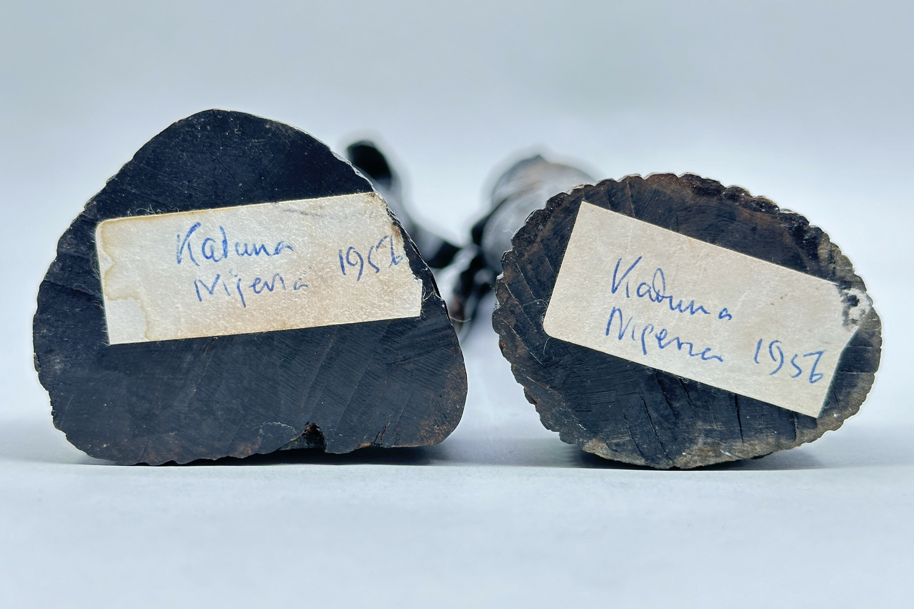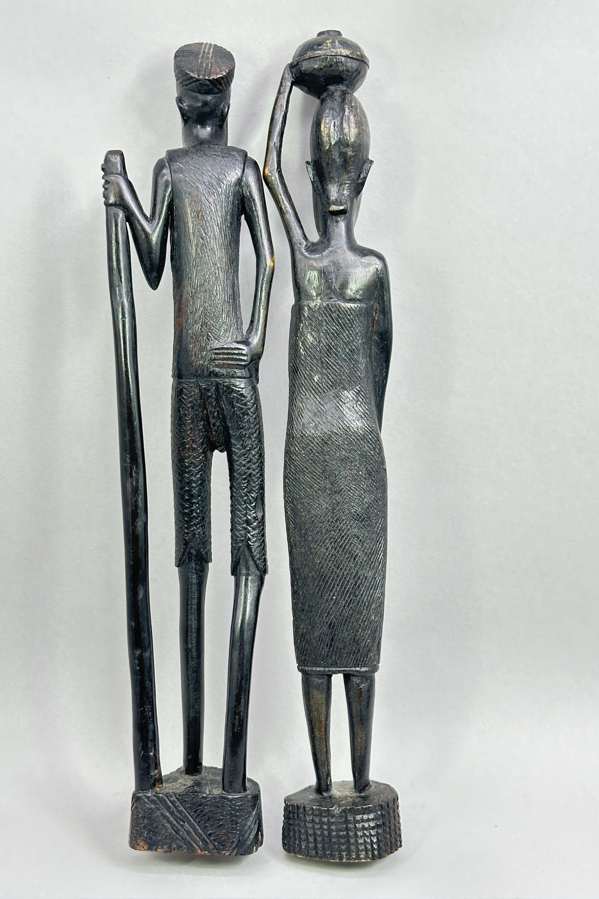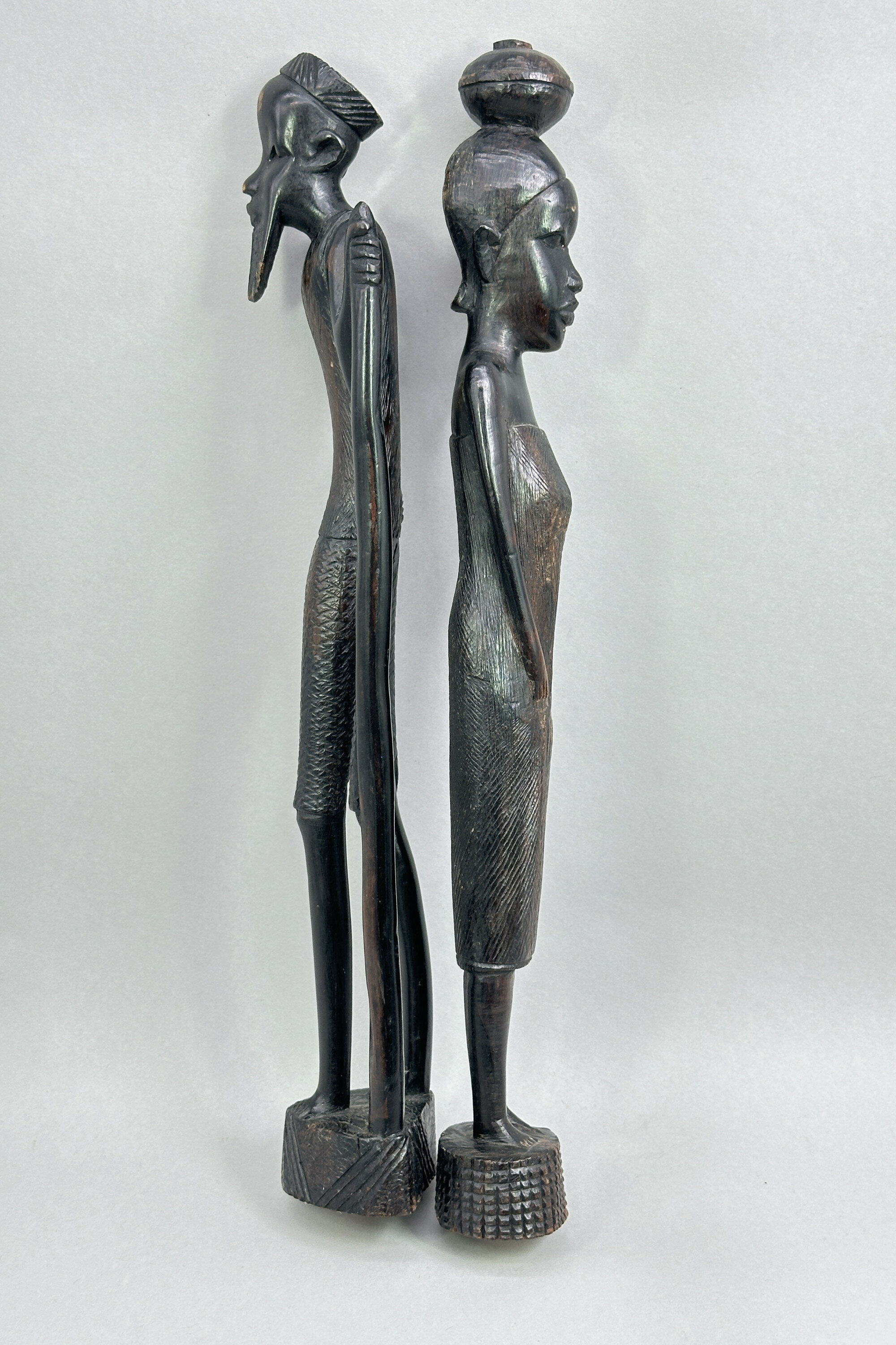 A pair of wood figures of a man and a woman carved in an abstract style with slender proportions, the man holding a long staff and the woman balancing a vessel (presumably for water or wine) on her head, the clothing of both with etched patterned decoration and their complementary bases with contrasting geometric designs. The patina and colour of the wood suggests ebony and the style is African. As with the previous lot there is a label indicating manufacture in Nigeria and Kaduna is the capital city of Kaduna State, and the former political capital of Northern Nigeria. It was a trade centre and a likely source of artefacts made for tourists of which these are most likely an example. Dating is probably as the label indicates and many other similar pieces were produced at that time.| Size: | Man : Ht 36cm (max) Lady : Ht 37cm (max) |