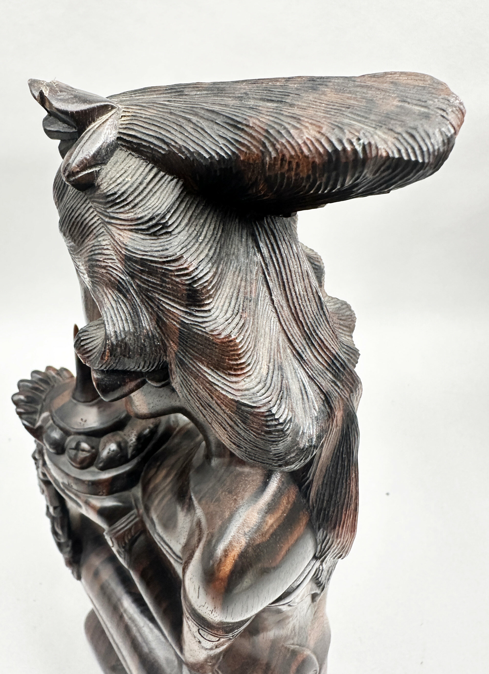 A finely carved wood figure with a rich patina and veining of a young woman crouching, her head, which is elaborately coiffured, slightly inclining as she looks at the devotional stupa like object which she is holding. The style of this piece indicates that it was the work of a Balinese craftsman and the signature underneath confirms this. The island of Bali in Indonesia has a rich tradition of wood carving dating back hundreds of years. Known in the Balinese language as 'Batuan', wood carving has its roots in Bali's Hindu-Buddhist culture. Typically, the pieces are made from hardwoods with a coarse grain including teak, chempaka wood and sandalwood. The decorative grain effects here, though, suggest mahogany and the highly polished finish is quite striking and far less commonly found today. Dating is probably to the 1960s and the artist (with the Balinese surname ‘Mudita’; his first name cannot be made out) has revealed the place of manufacture which is Sanur, a famous beach resort. These figures were often bought by tourists which explains why they are found today in Europe. Like the portrait head of a lady also included in this sale there is an aura of calm contemplation here almost reminiscent of Chinese work.| Size: | 30 x 12 x 13 cm |