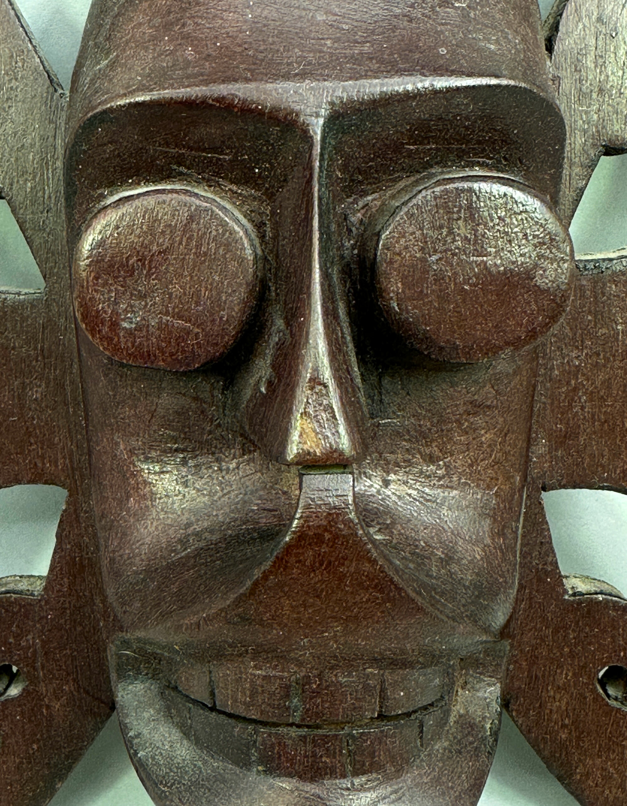 This is a striking wood mask, probably ebony, carved in a bold, semi abstract style, the facial details flanked on each side by two volute decorated ‘ears’, the back hollowed out and pierced at the top for hanging. These gargoyle like creations were made in Borneo, the island north of Java whose sovereignty is shared between Indonesia, Malaysia and Brunei. They are held to be the work of the Dayak tribe and were sometimes used for harvest festival or fertility rites, soul catching and death ceremonies and spiritual dances, but were also, no doubt produced as tourist souvenirs which is most likely what we have here. The decorative appeal is obvious and the potential spiritual functions an added bonus.| Size: | 20 x 18 cm |