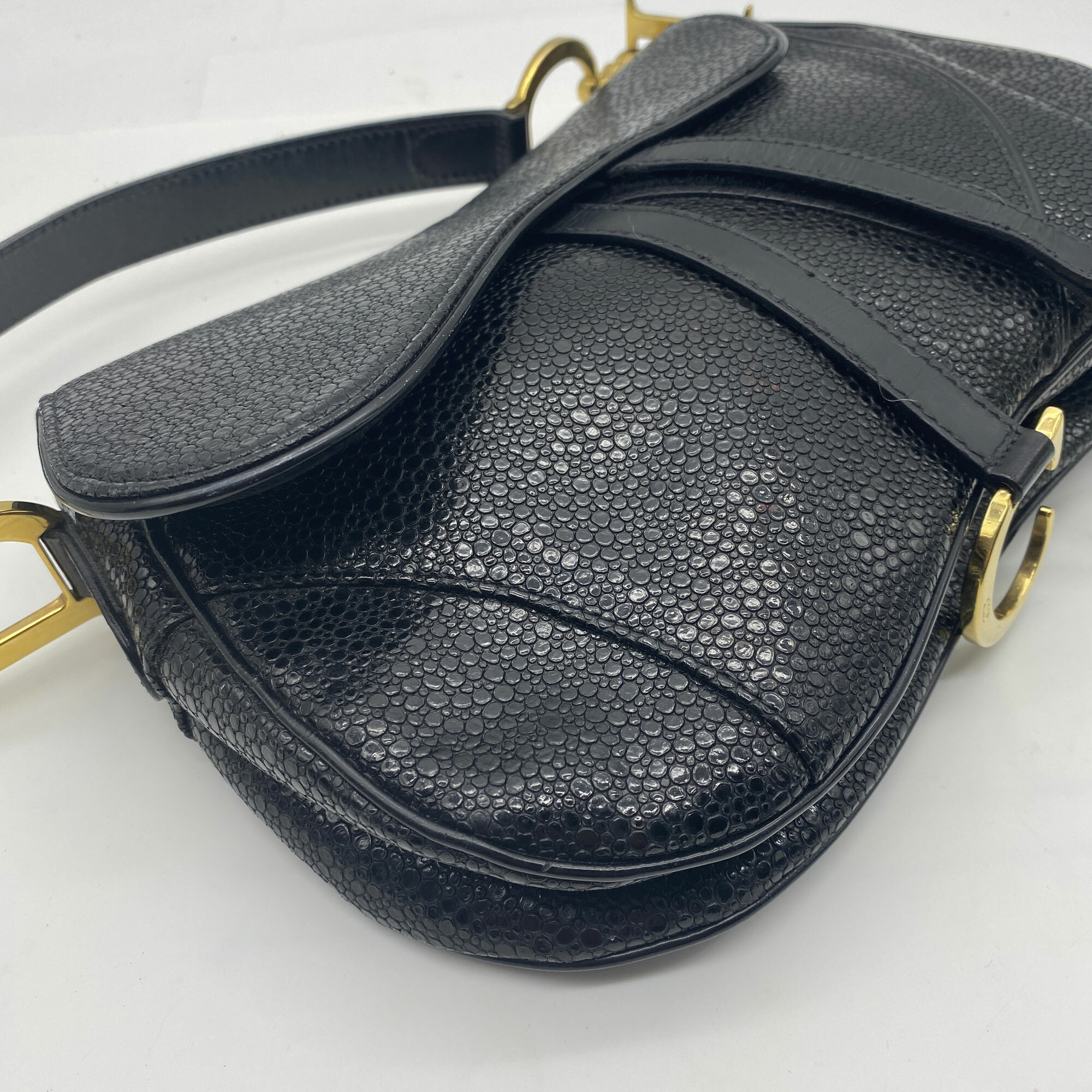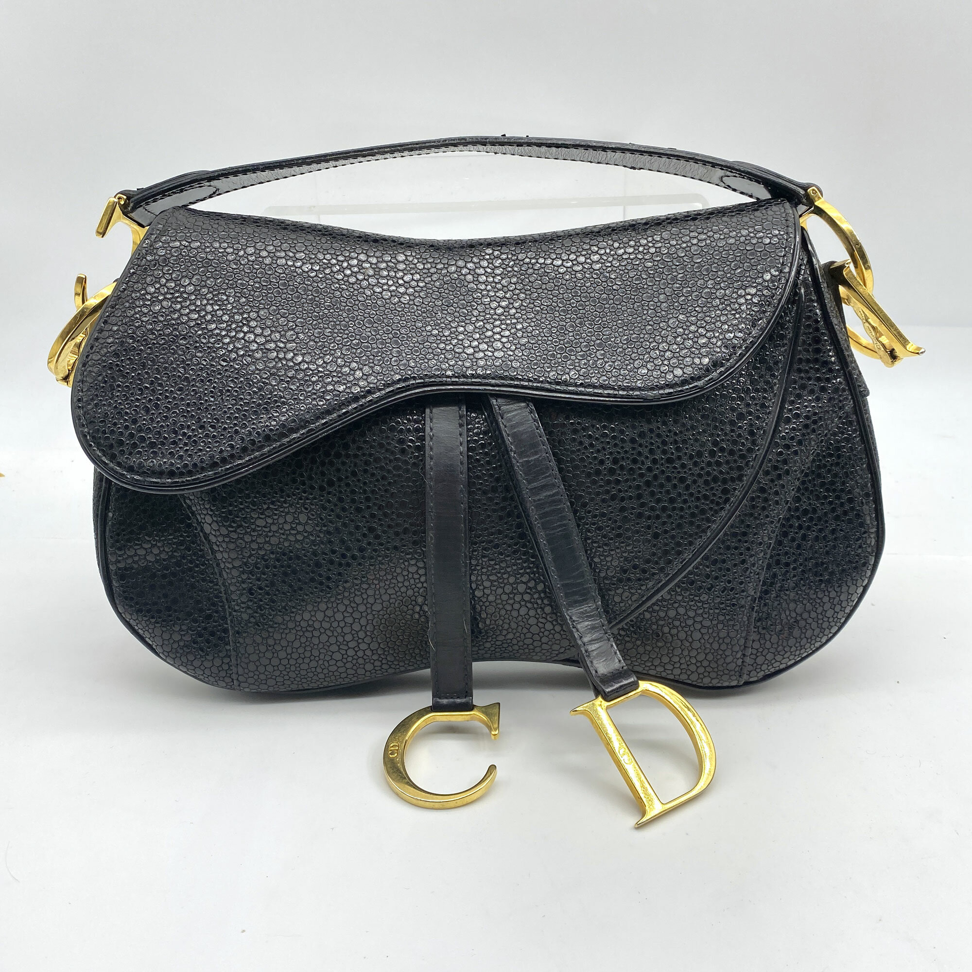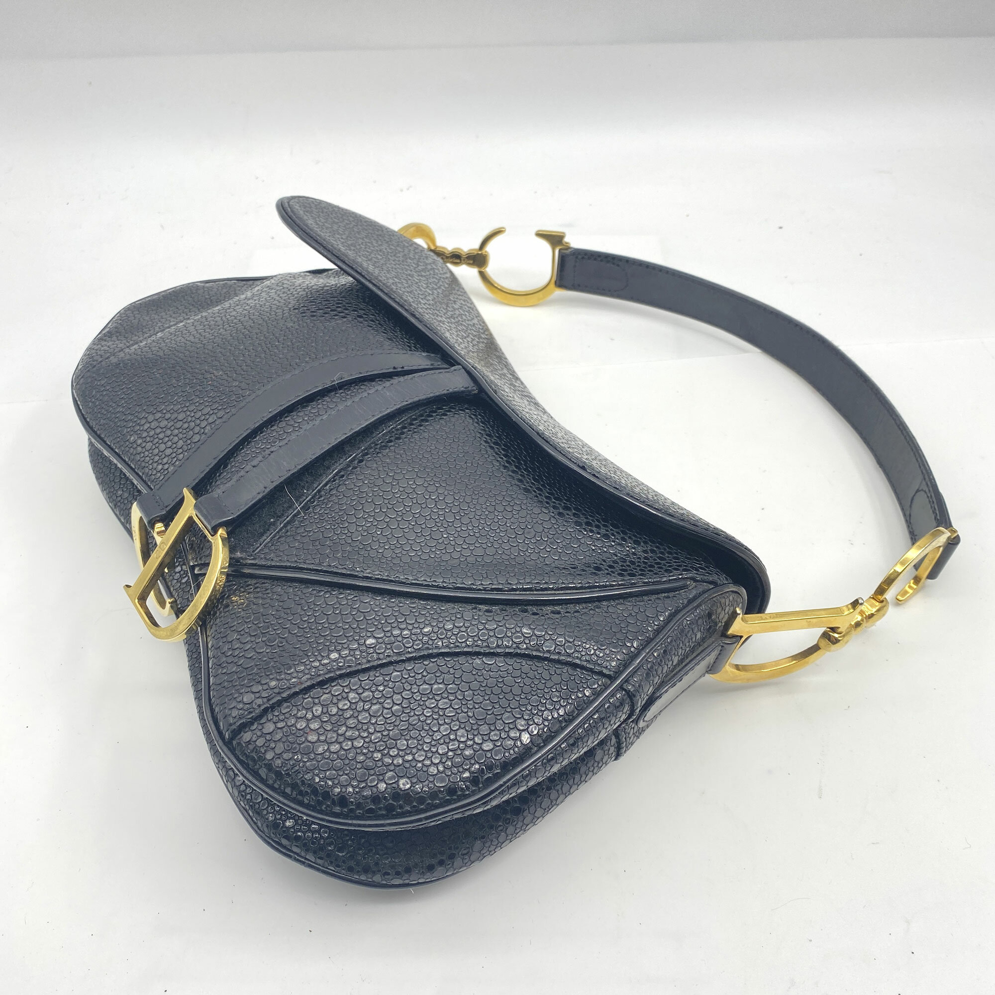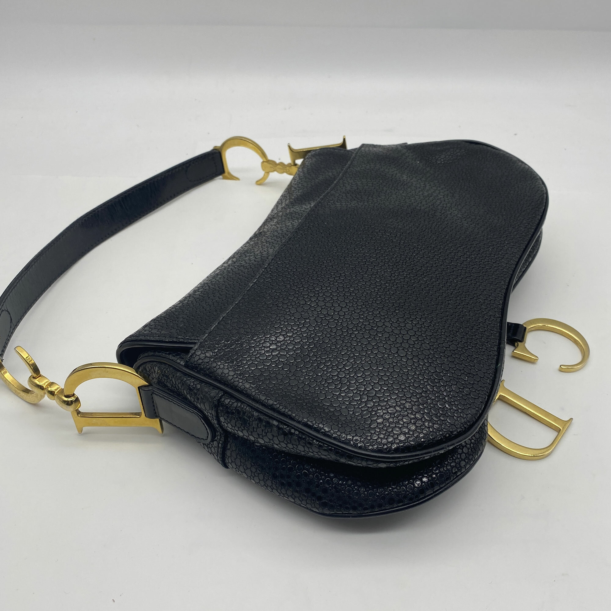 This is a very rare bag by Christian Dior as it is from 2001, just one year after it debuted. Designed by John Galliano for the Spring/Summer collection in 2000, the saddle bag is one of Dior's most recognisable and popular designs. It also has the unusual sting ray finish to the leather.| Size: | 29 x 19 x 7 cm Handle 49 cm |