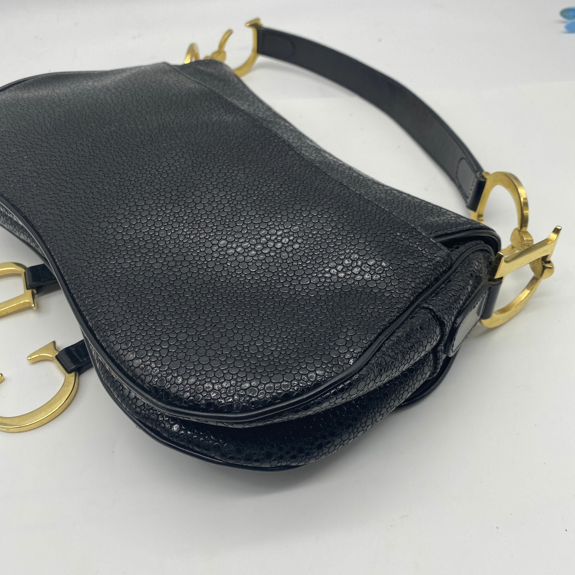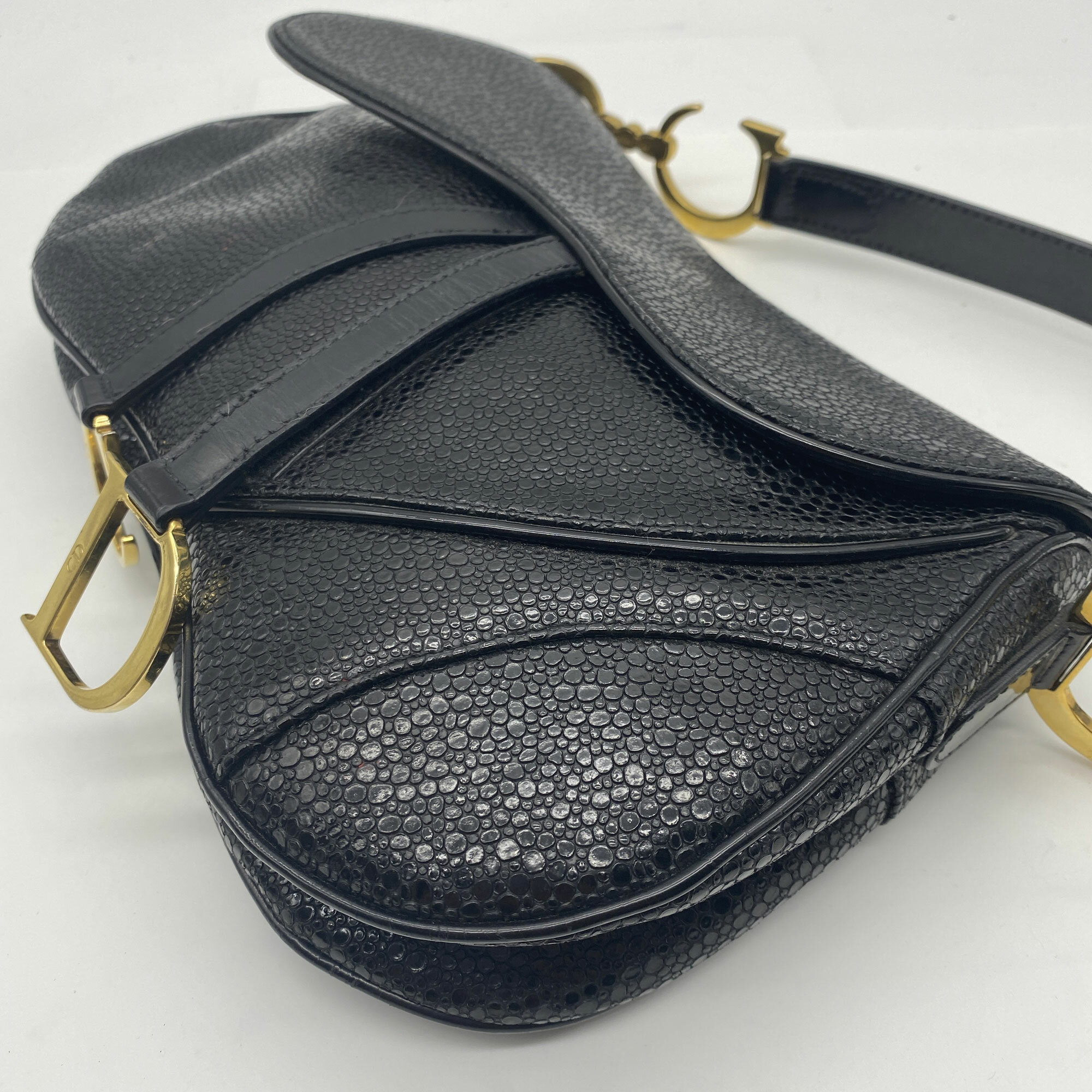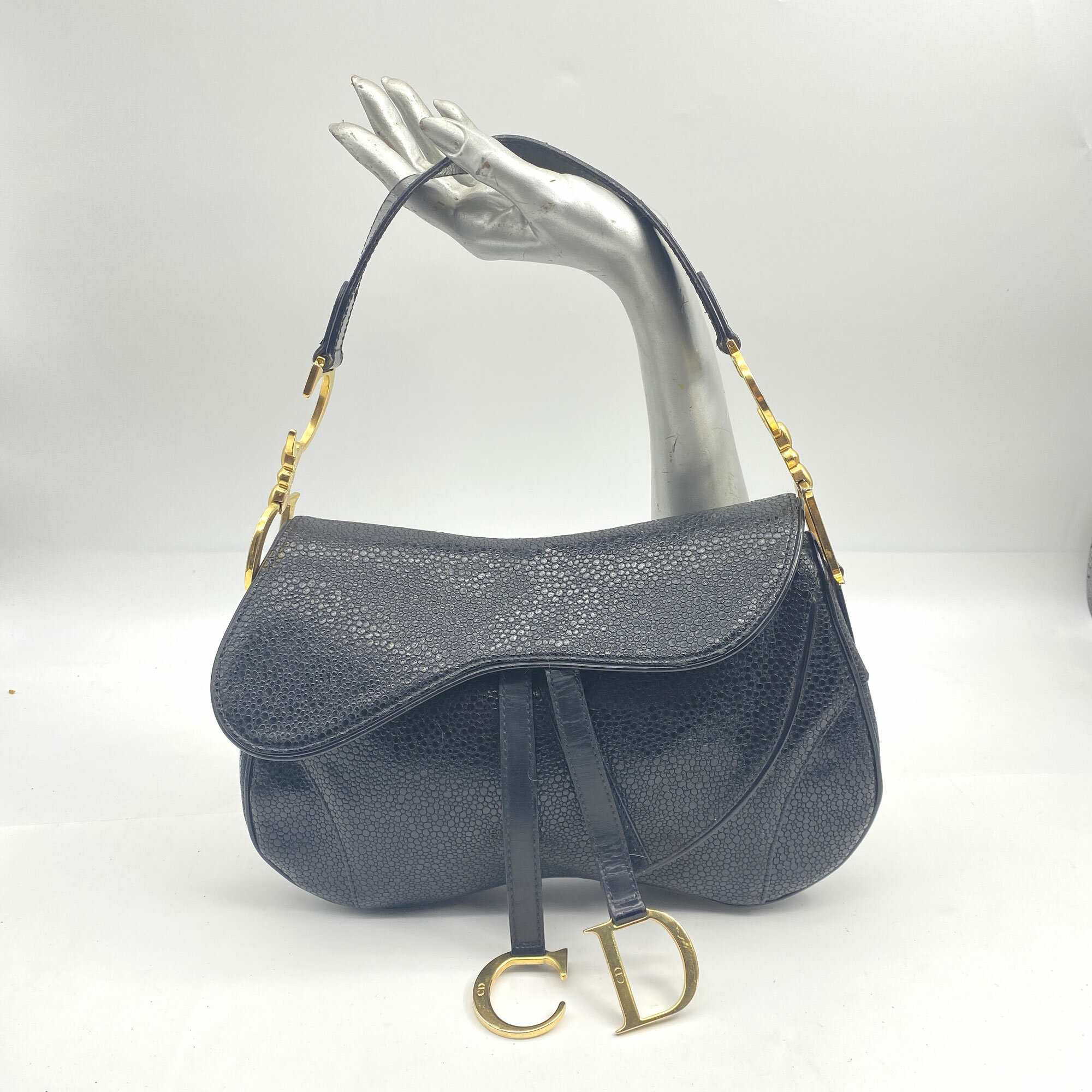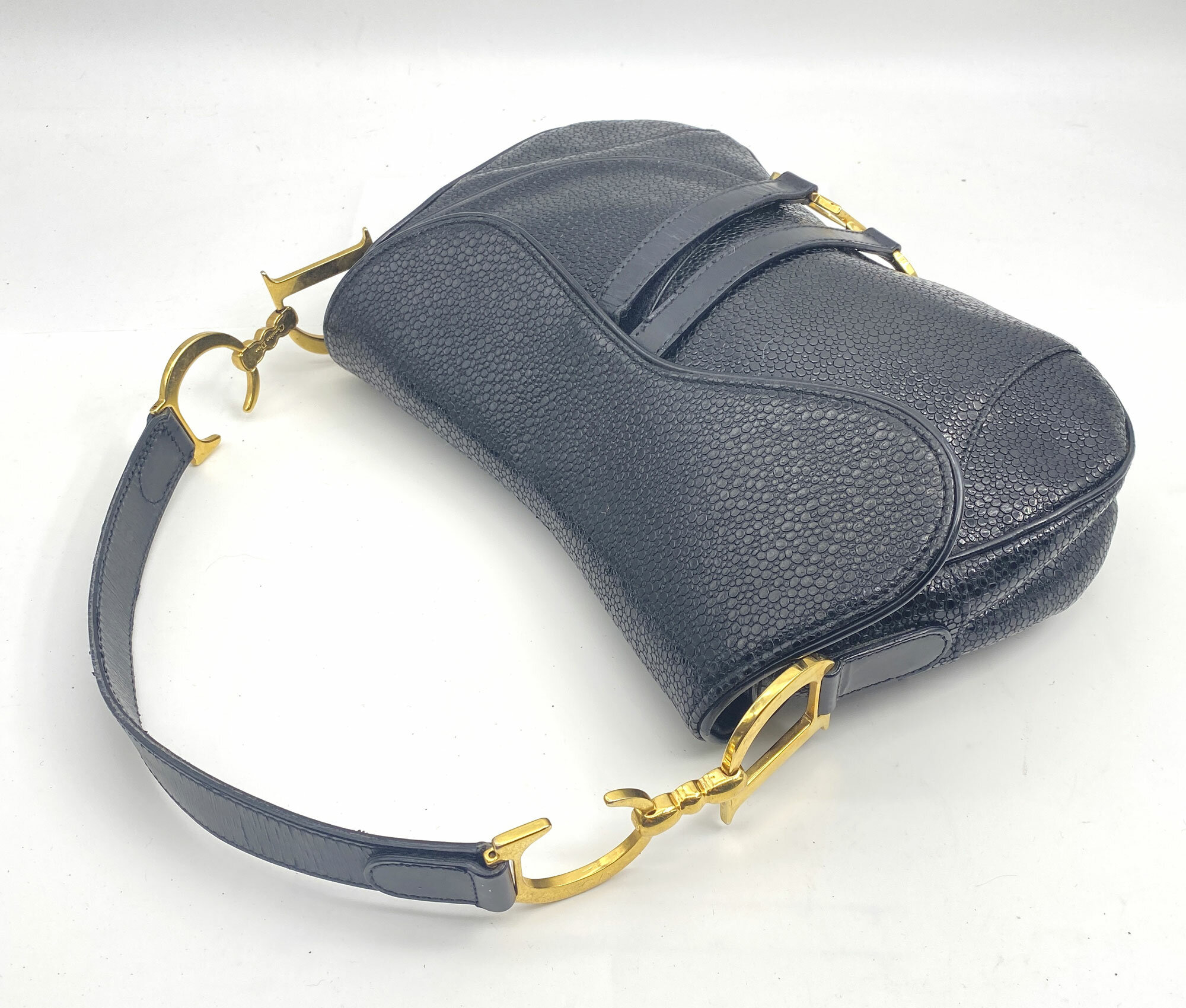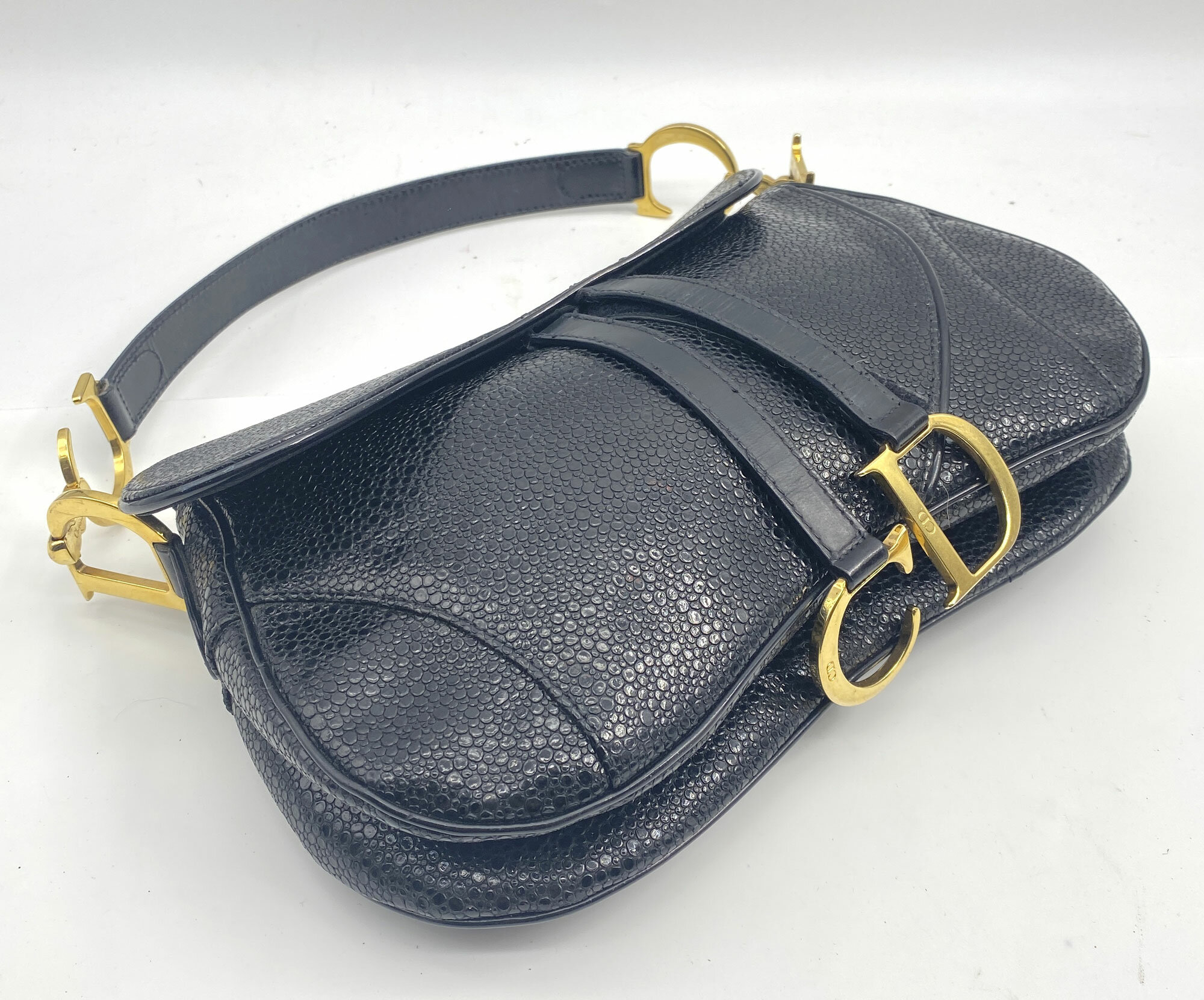 This is a very rare bag by Christian Dior as it is from 2001, just one year after it debuted. Designed by John Galliano for the Spring/Summer collection in 2000, the saddle bag is one of Dior's most recognisable and popular designs. It also has the unusual sting ray finish to the leather.| Size: | 29 x 19 x 7 cm Handle 49 cm |