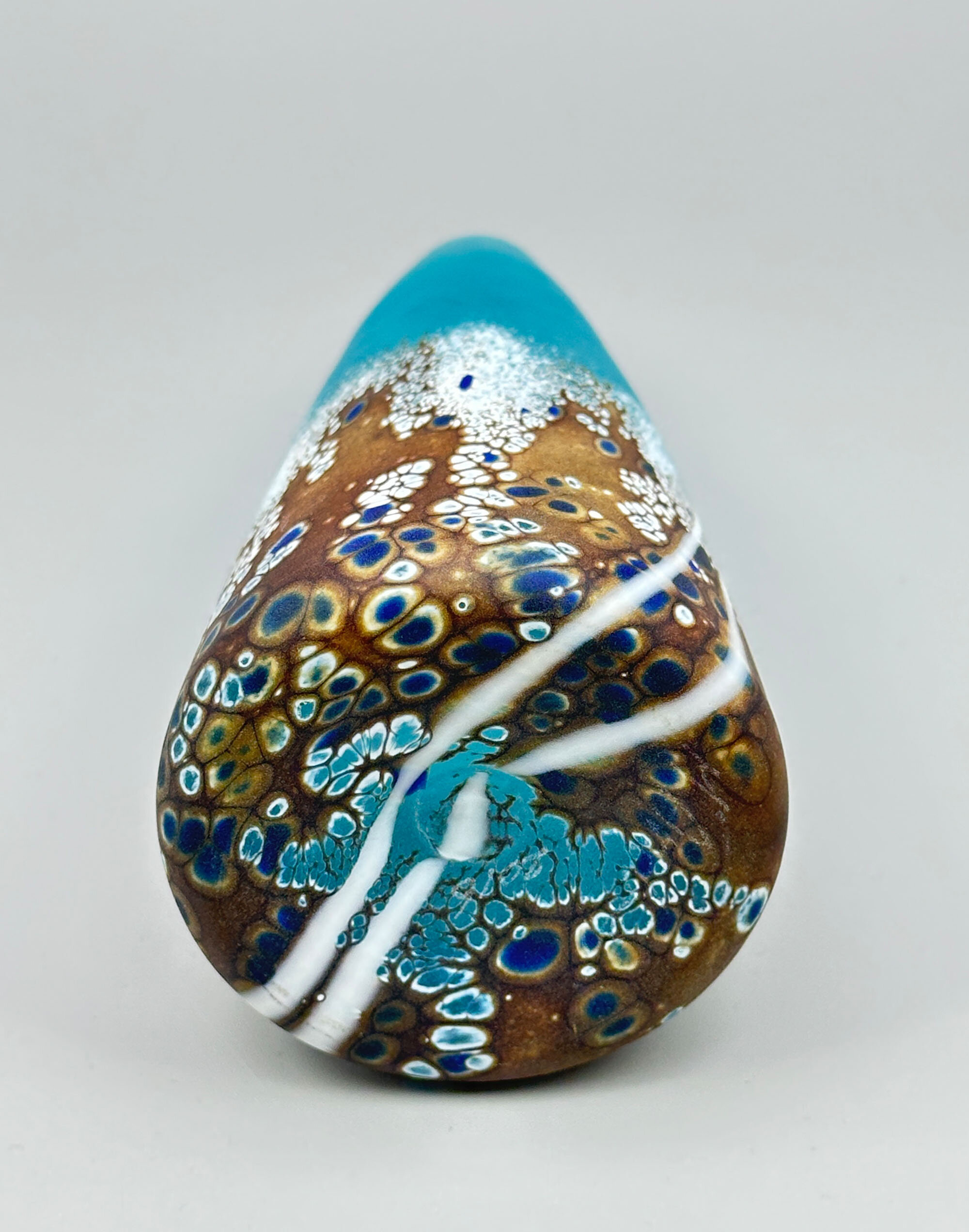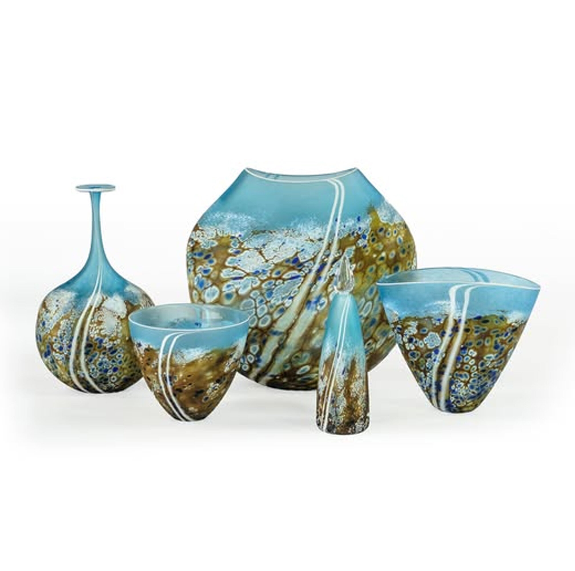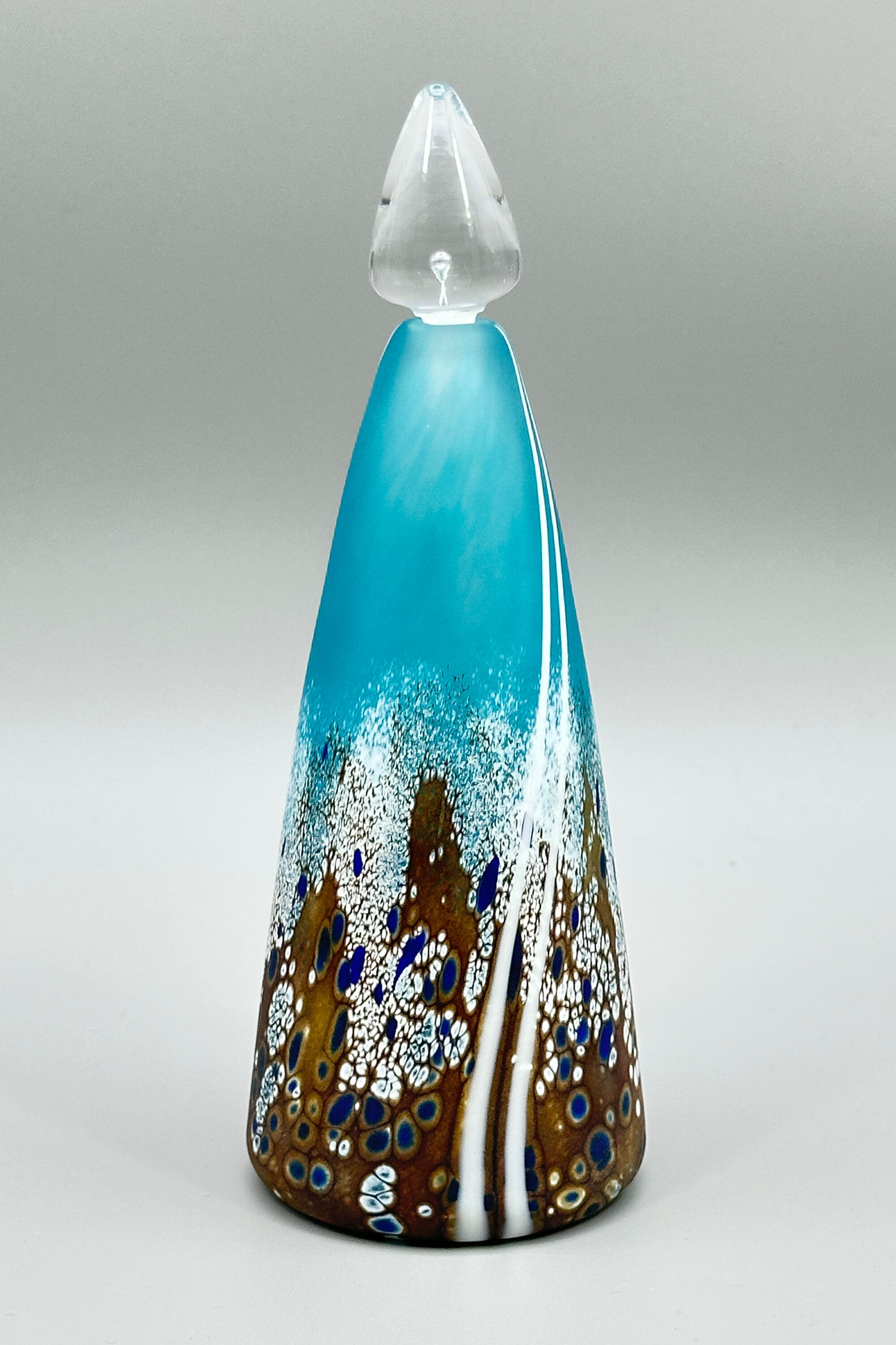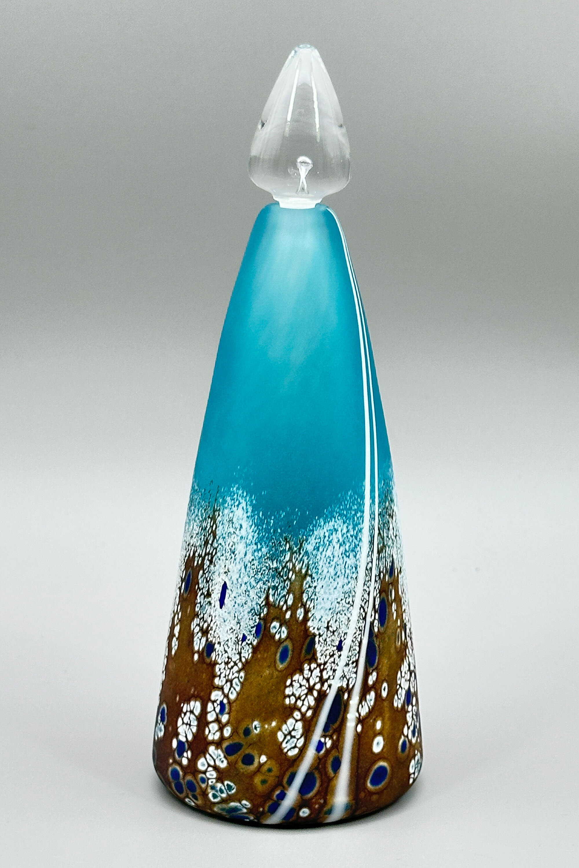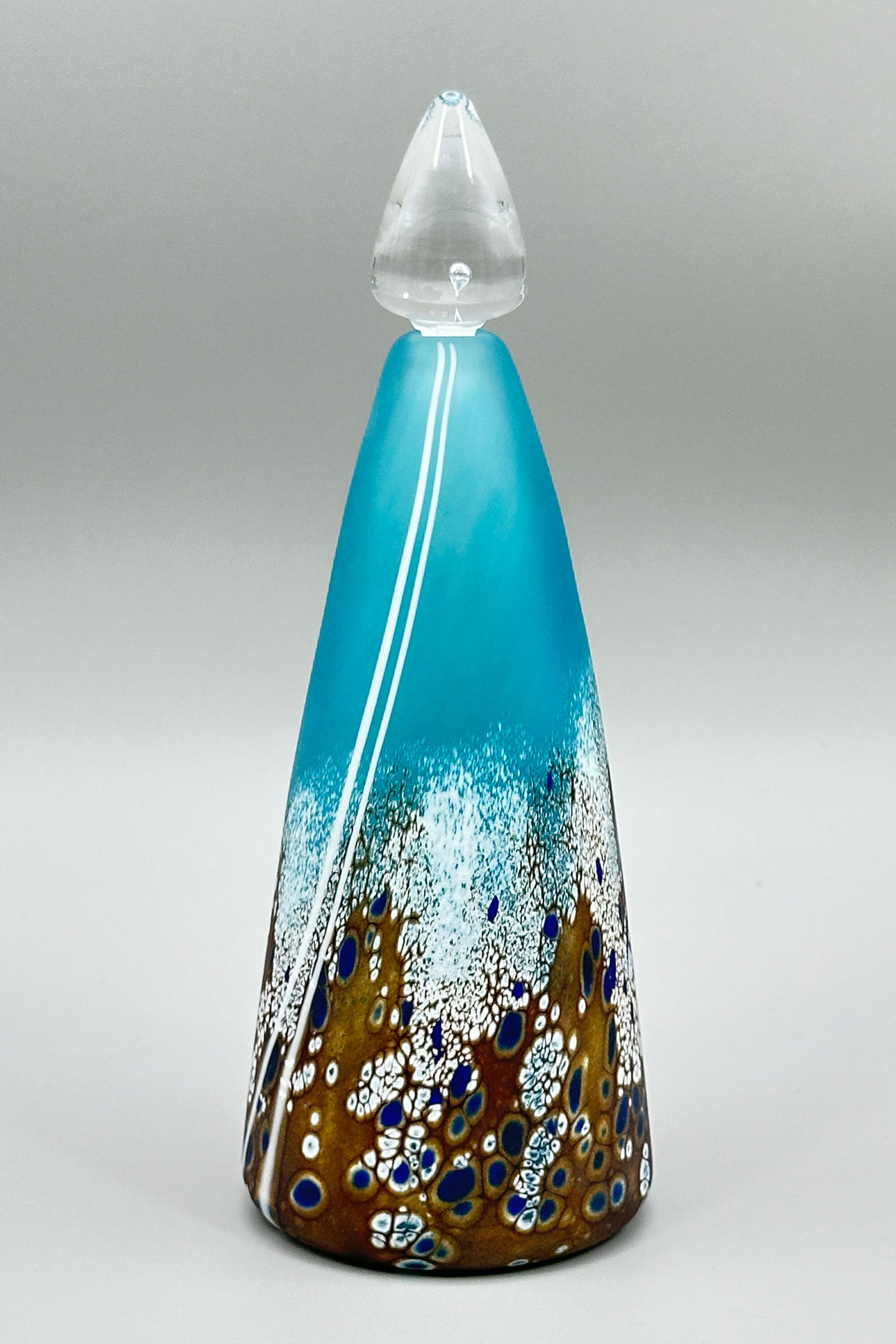 A perfume bottle and stopper, the body of slender conical form with a short slender conical stopper, the glass with mottled and bead cluster effects in blues on a brown ground towards the base blending into clear blue glass above, the whole with two double swirling white stripes, the stopper in clear glass with a small interior bubble. This piece comes from the ‘beach’ range produced by Martin Andrews glass in recent years. A selection of these pieces including a perfume bottle which is nearly identical can be seen in image 10 which is taken from a 2016 Facebook page from the studio.Martin Andrews (see image 9) graduated from West Surrey College of Art and Design with a BA (hons) Glass in 1991. Following this he was based in London until 2000 when he then launched his current workshop at the Ruskin Glass Centre in Stourbridge. His work often draws on the earth's natural forms and patterns and his ‘beach’ range is a prime example of this. Most of his pieces are signed, but this bottle is not, perhaps because of its size, but its inclusion in the studio’s inventory makes its provenance beyond doubt.