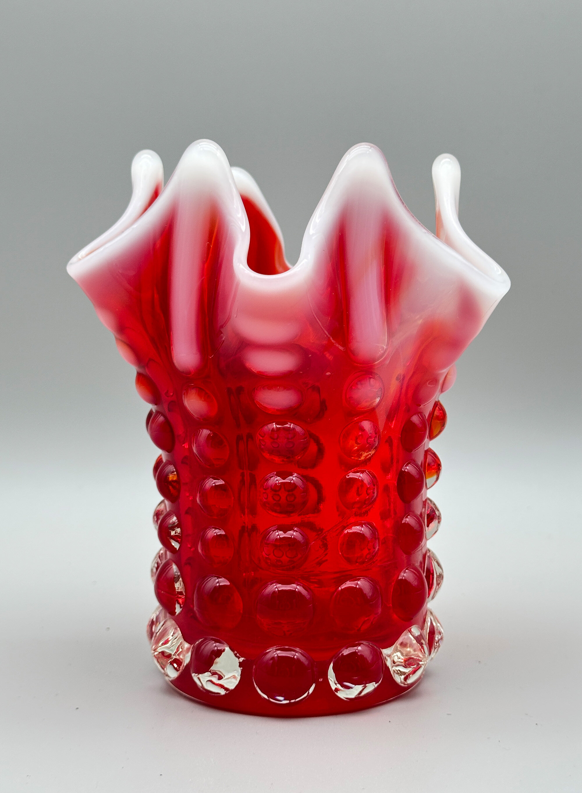 A glass vase of beaker form slightly flaring towards the exaggeratedly crimped top rim with six ‘peaks’, the cranberry coloured glass blending into white towards the top and studded with small raised spheres. The decoration here is termed ‘hobnail’ from its resemblance to the small studs used on the soles of boots. Mould made, it enjoyed great popularity in the Victorian era, usually in coloured glass. Lemonade sets in the design with a jug and matching glasses were particularly popular. The hobnail design was taken up by the American glassworks, Fenton Glass, in 1939 and was sold in great quantities during the second world war and thereafter. At first the pieces were made in French opalescent, green opalescent and cranberry opalescent glass but in 1950 an additional milk glass range was introduced which was to become the most popular of all. The shapes were often elaborate with frilled rims as here, but the beaker shape seems to have been less common. Dating is most likely to the 1940s.| Size: | Ht 16cm, Width (max) 14cm, Base 7.5cm |