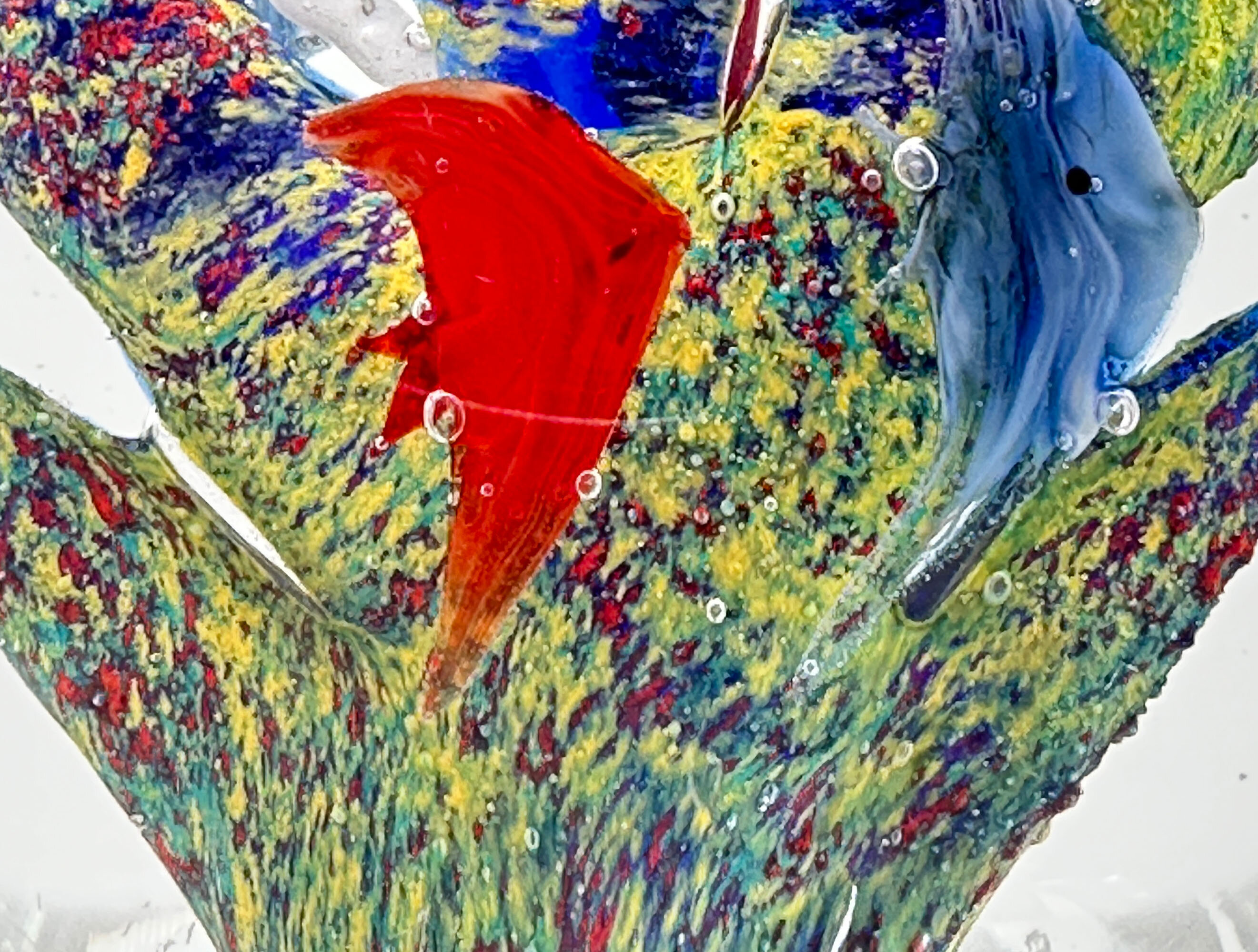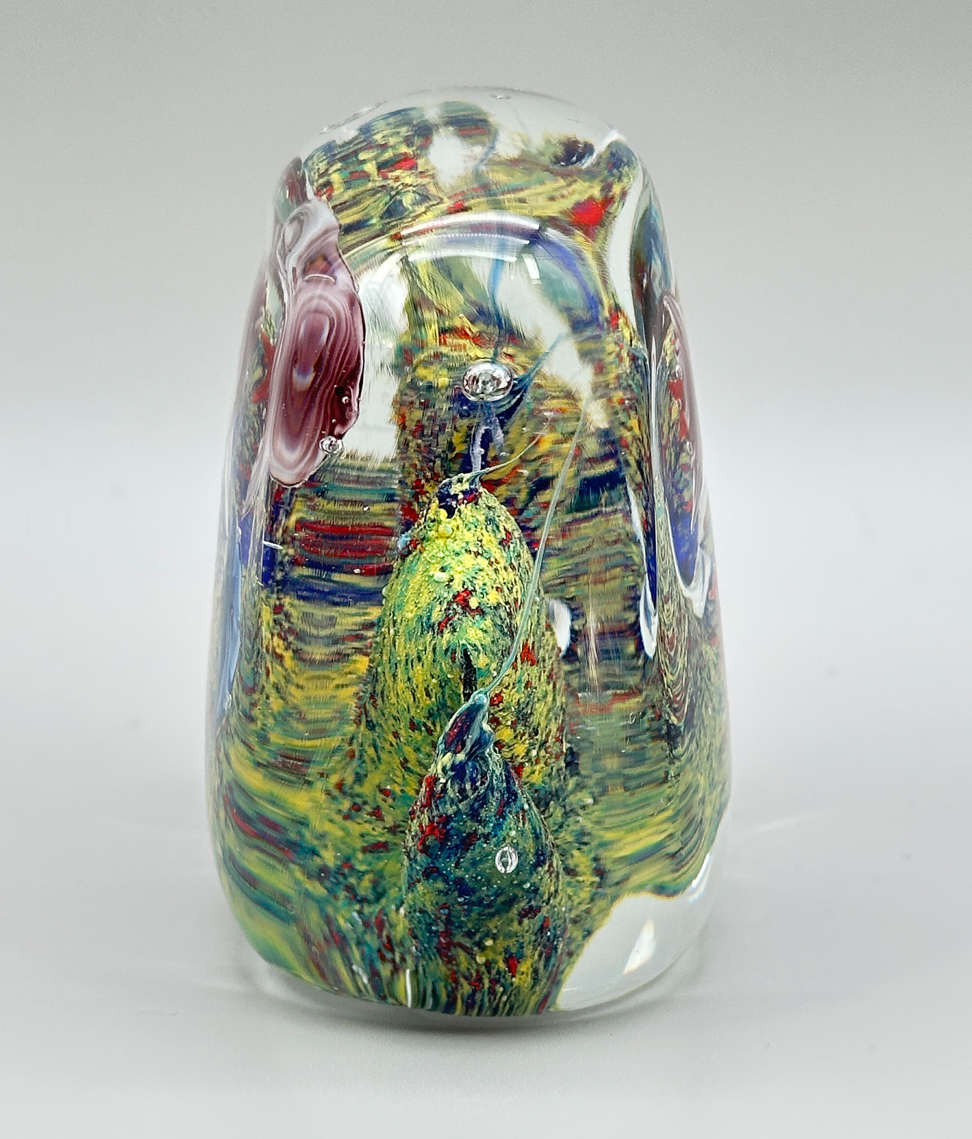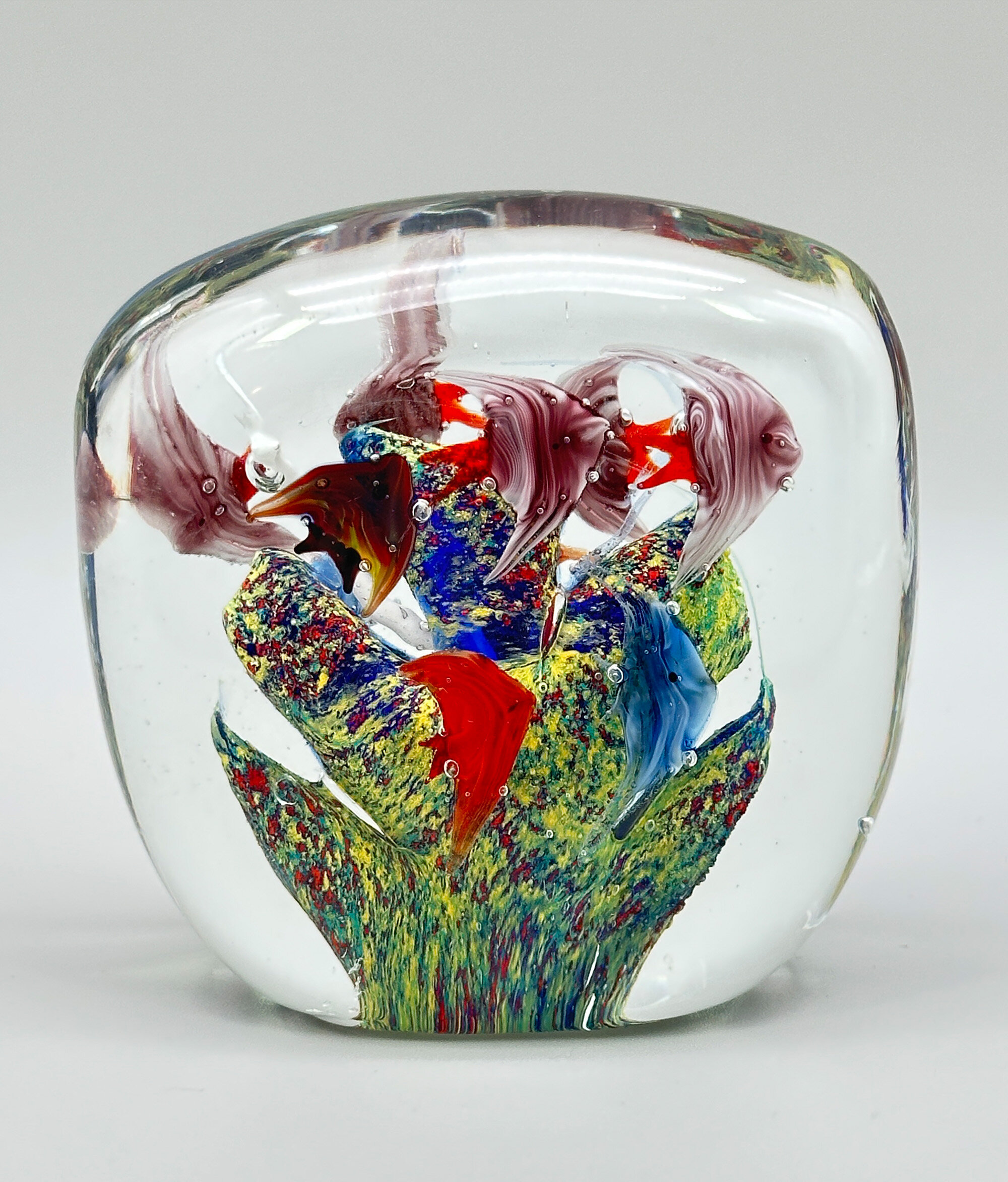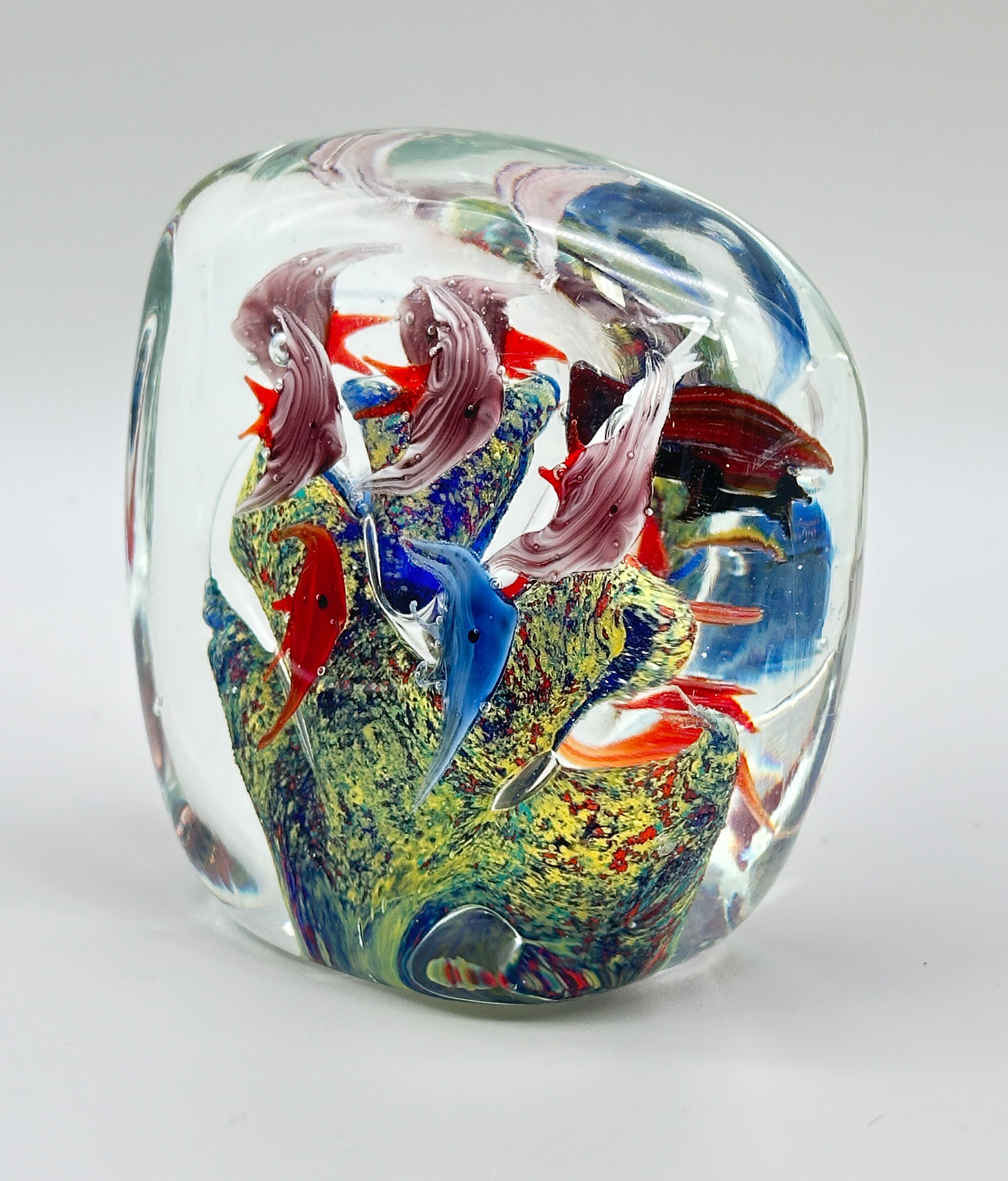 A glass boulder of rounded rectangular form with a flat base, the clear glass enclosing ten multicoloured fish, five on each face, swimming around a mottled central boulder with scattered bubbles. While other manufacturers have produced similar designs the best and best known were made at the glassworks at Murano, Venice, and the quality of the craftsmanship here with its imaginative and densely filled design employing a wide variety of colourings and colour effects within a skilfully blown form point to one of these as its maker. Dating most likely to the 1960s or 1970s the charm and humour of the design is obvious contributing to a most attractive desk ornament.| Size: | Ht (max) 9cm, Width (max) 9.5cm, Depth (max) 5.5cm |