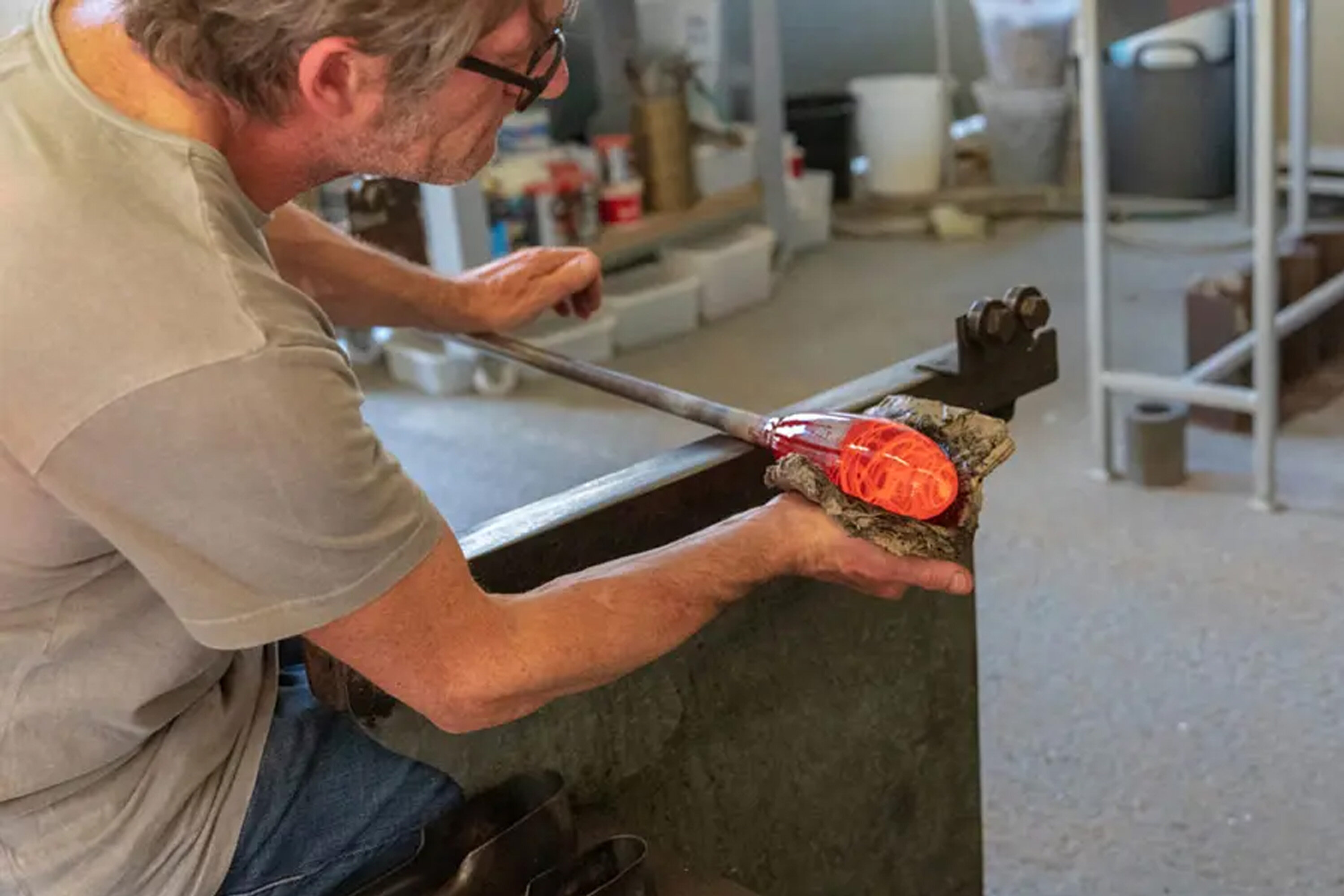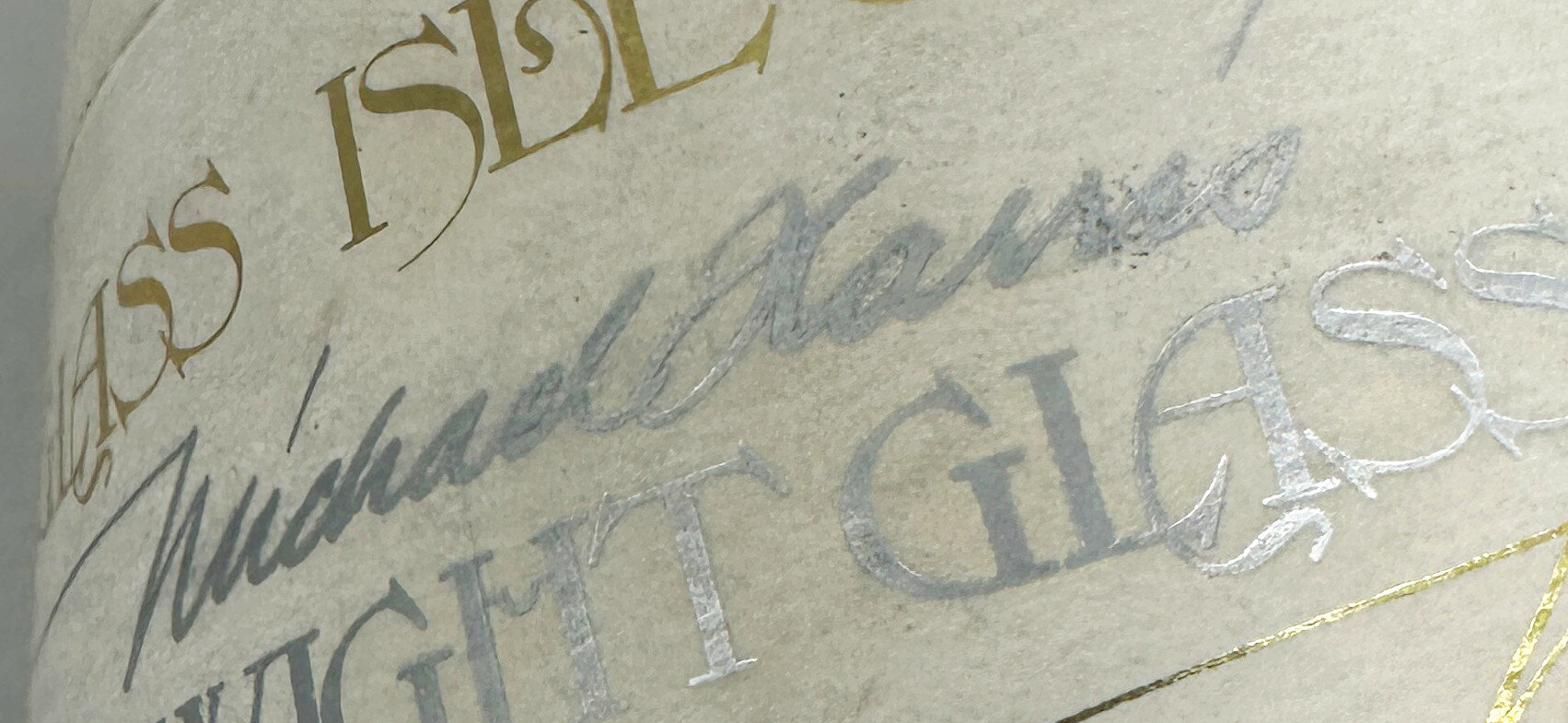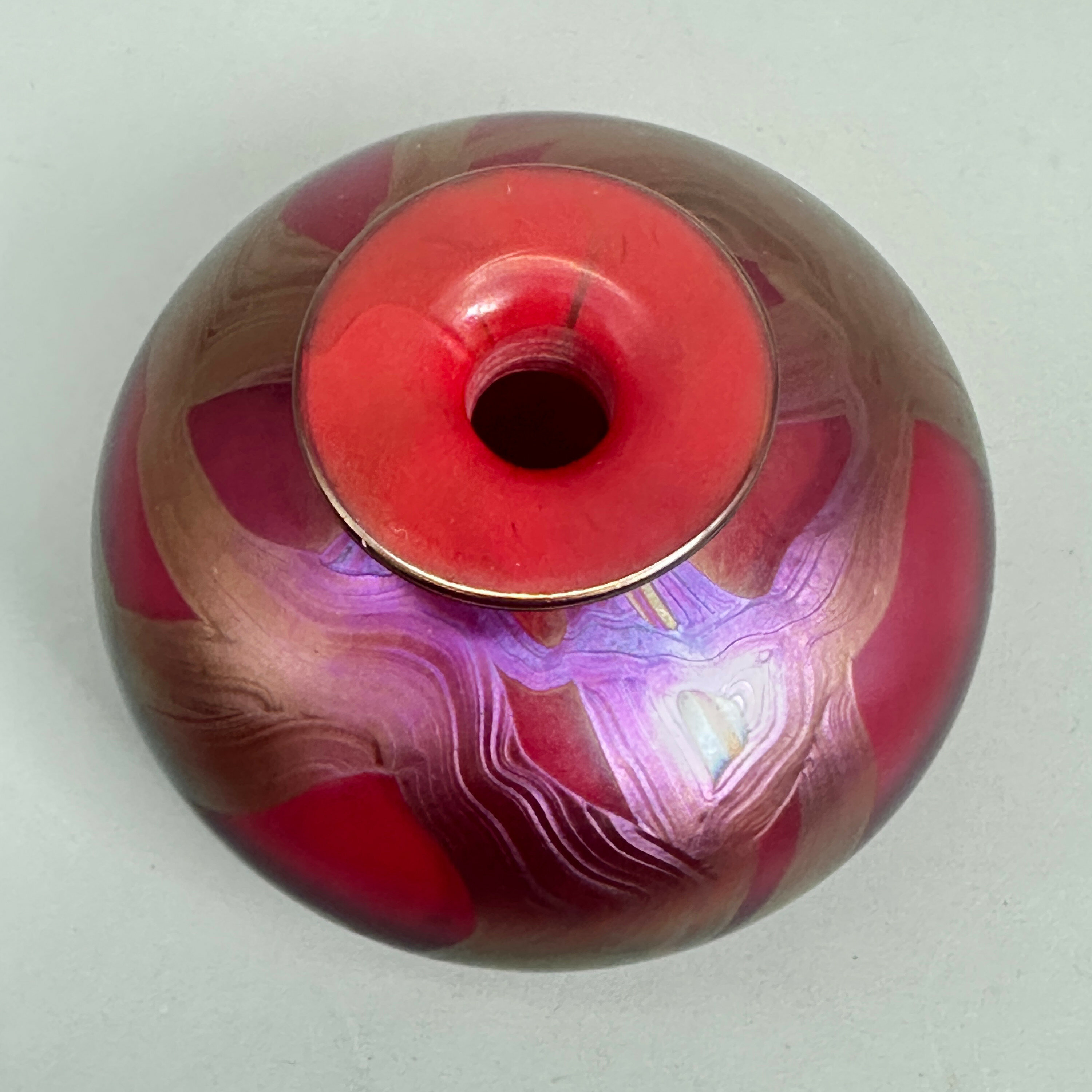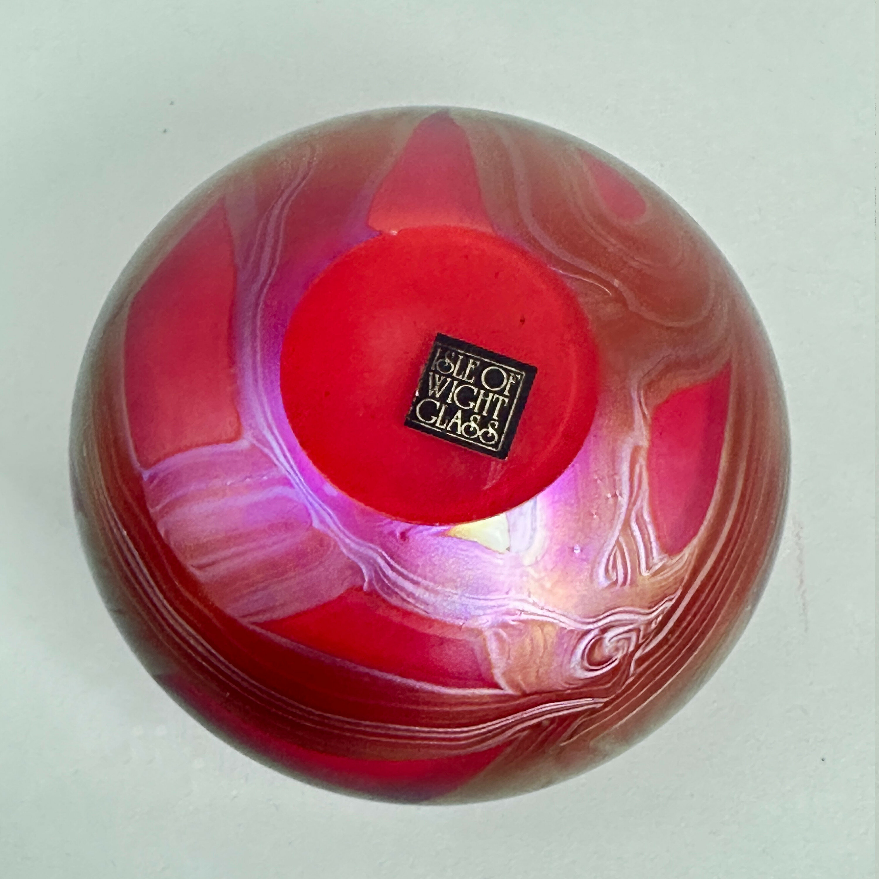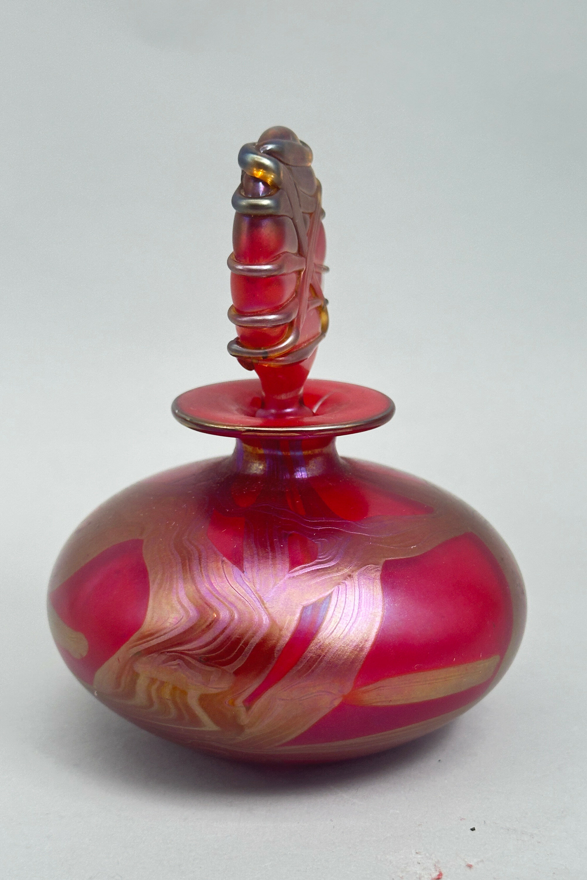 A perfume bottle and stopper, the body of squat globular form with a short concave neck and a wide flaring rim, the stopper of ‘lollipop’ shape with raised glass trails, the deep pink or red glass with a design of gilt swirls and the stopper with the red colouring merging into amber at the top, the base with a label ‘Isle of Wight Glass’.The Isle of White Glass studio was established by the celebrated glass maker Michael Harris in 1972 after he left his first glassworks based in Malta, the well known Mdina Glass. Some of the Mdina designs continued to be made in his new location but new ranges were introduced as well, among them the ‘Golden Peacock’ design which was made from 1982 to 2003. The particular variation we have here is ‘Royale’ which was made from 1987 to 1998 allowing a fairly precise dating for this piece. Michael Harris died in 1994 and the business was continued by one of his sons, Timothy (see image 12), and his wife, Elizabeth, until it unfortunately went into liquidation in 2012. But Timothy’s younger brother, Richard, came to the rescue and business resumed in 2014, continuing until the present day in new premises at the Arreton Barnes Craft Village.