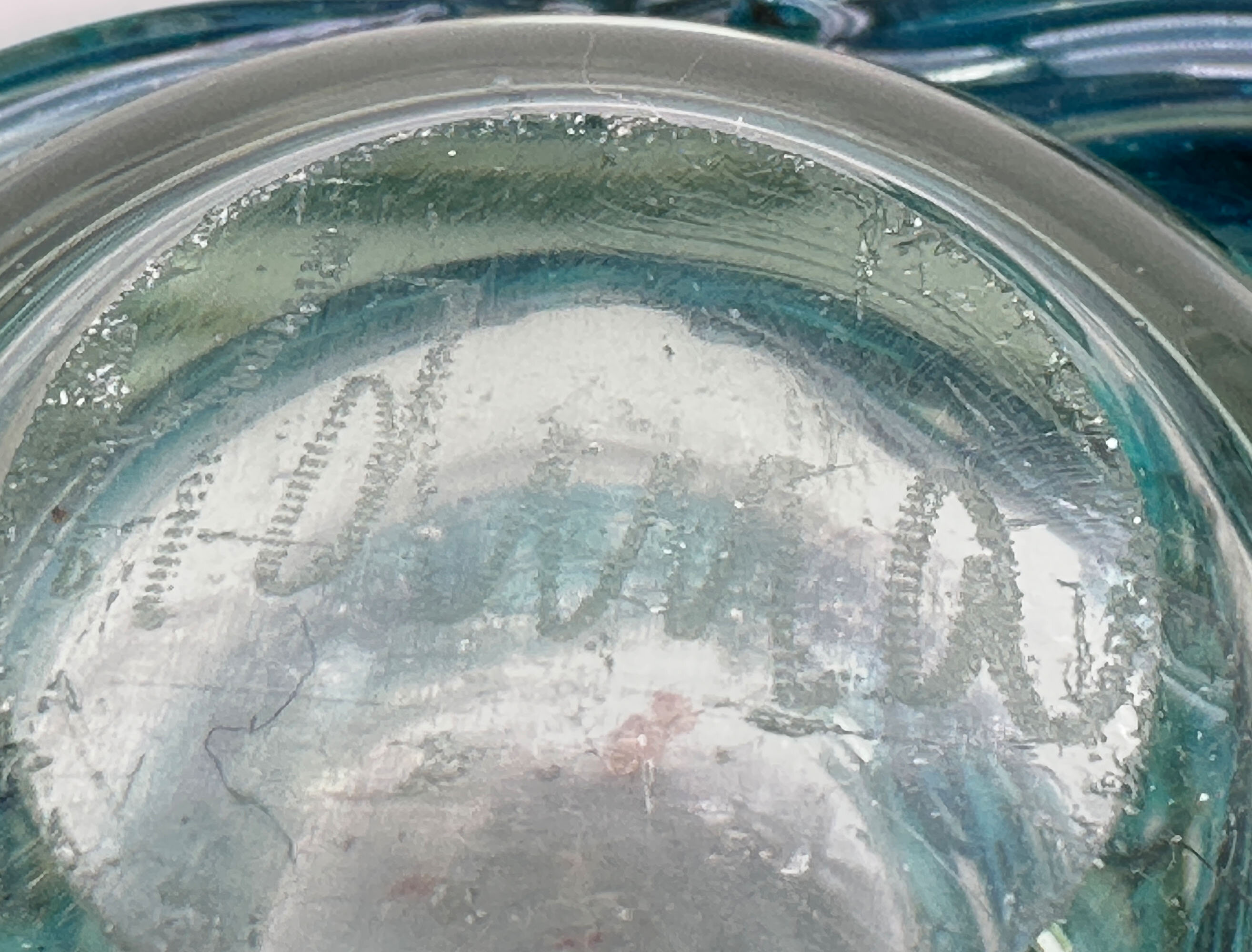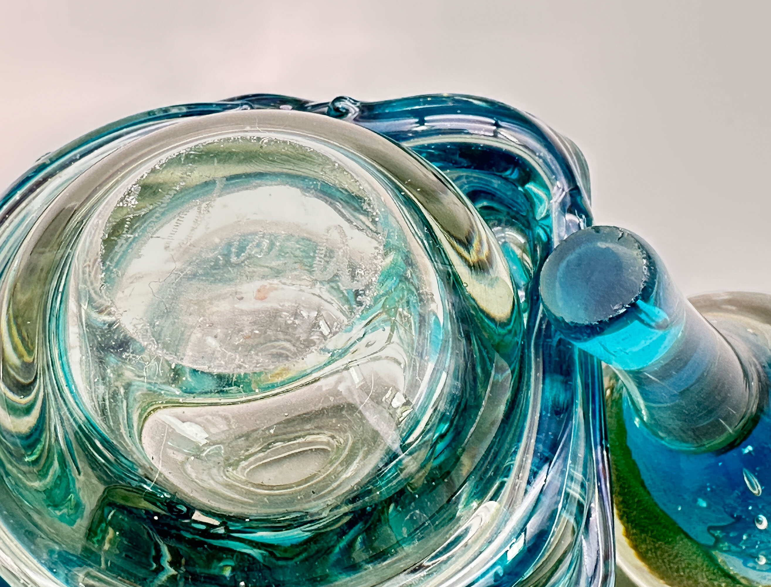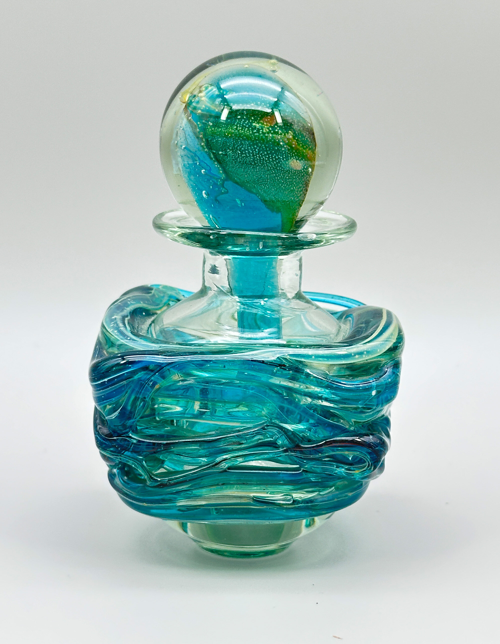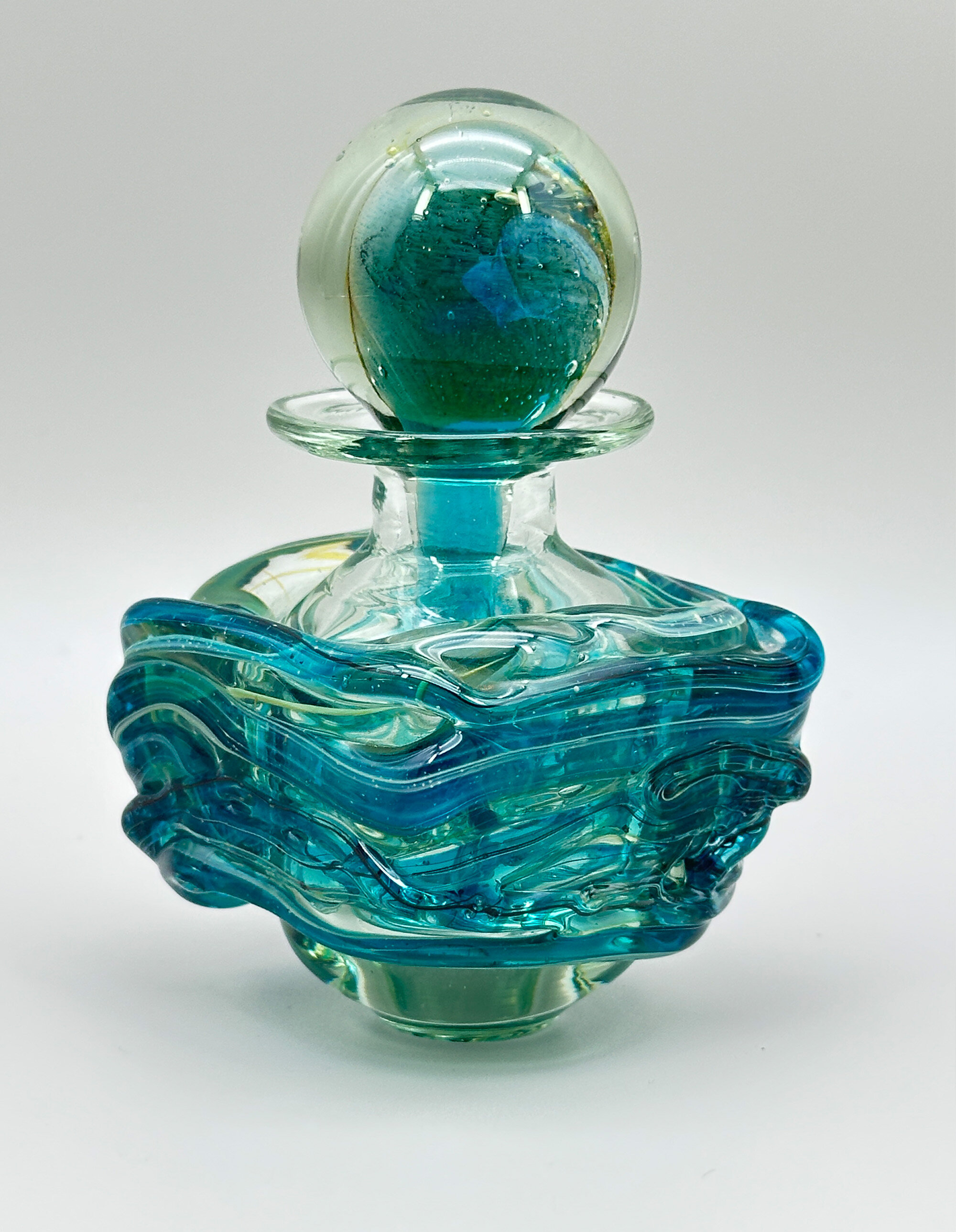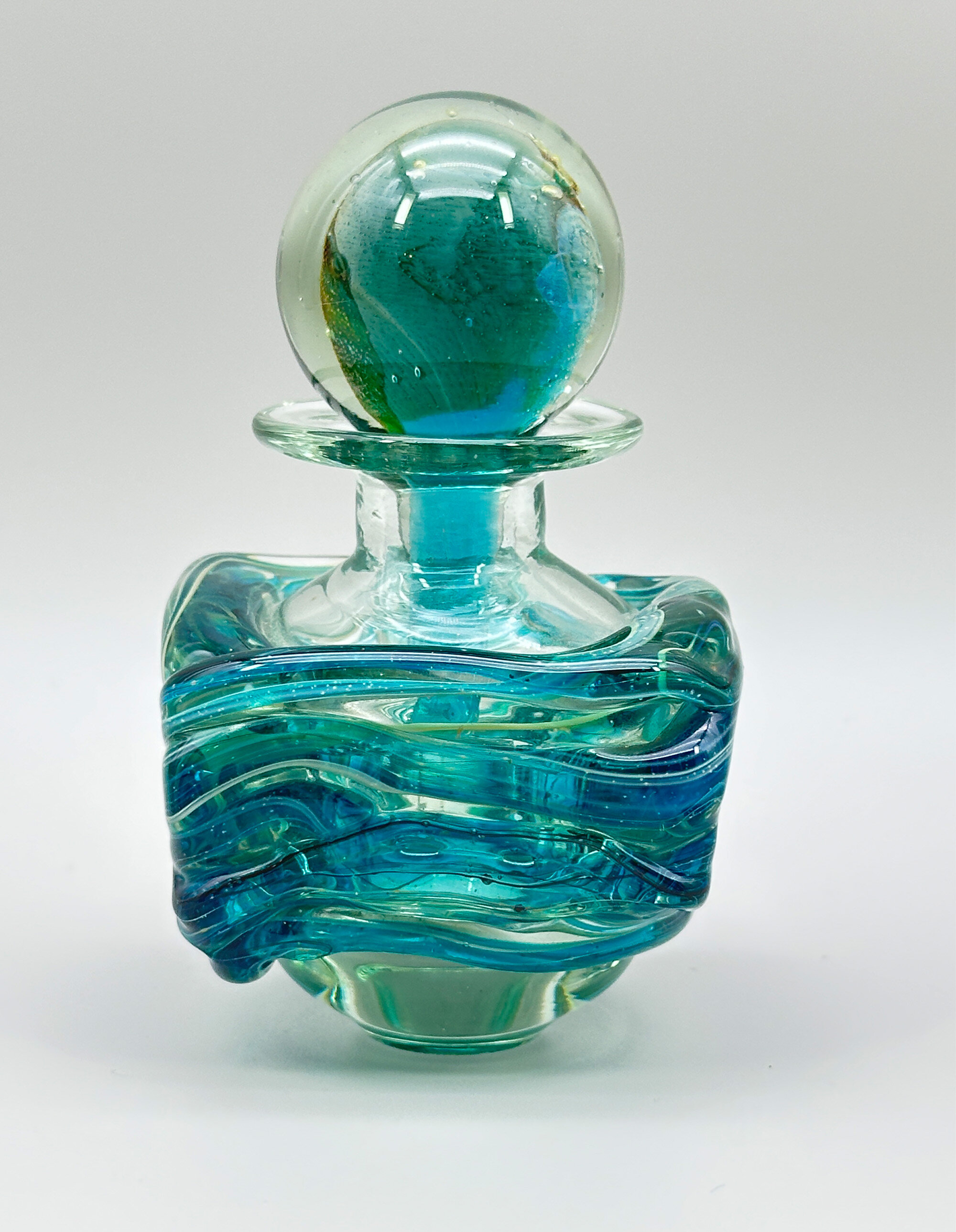 A perfume bottle and stopper, the blue glass body of rounded square form with pronounced applied trailing and traces of green and yellow, the stopper ball shape and in similar colourings with ‘sommerso’ effects and minute bubbles, the stout ‘wand’ faintly concave, the base with an incised signature ‘Mdina’.Mdina Glass was founded in the Maltese town of Mdina in 1968 by Michael Harris and Eric Dobson. The town had no history of glass making but the venture proved to be a success. Its wares, free formed organic glassware, often in colours inspired from the sea, sand, earth and sky, proved very popular with tourists visiting Malta. Michael Harris left Mdina in 1972 and formed a new company, Isle of Wight Studio Glass, on the Isle of Wight, UK, leaving Eric Dobson in charge, but many of the designs he created continued to be made at Mdina Glass after his departure. This perfume bottle may possibly be an original Michael Harris design. Certainly it reflects the organic forms he created and the colourings, resembling the popular ‘sea and sand’ range, are consistent with this although the pattern here is more correctly referred to as ‘blue summer’ and the stopper of this bottle is a better match in colouring and design than some of the other examples currently on the market.