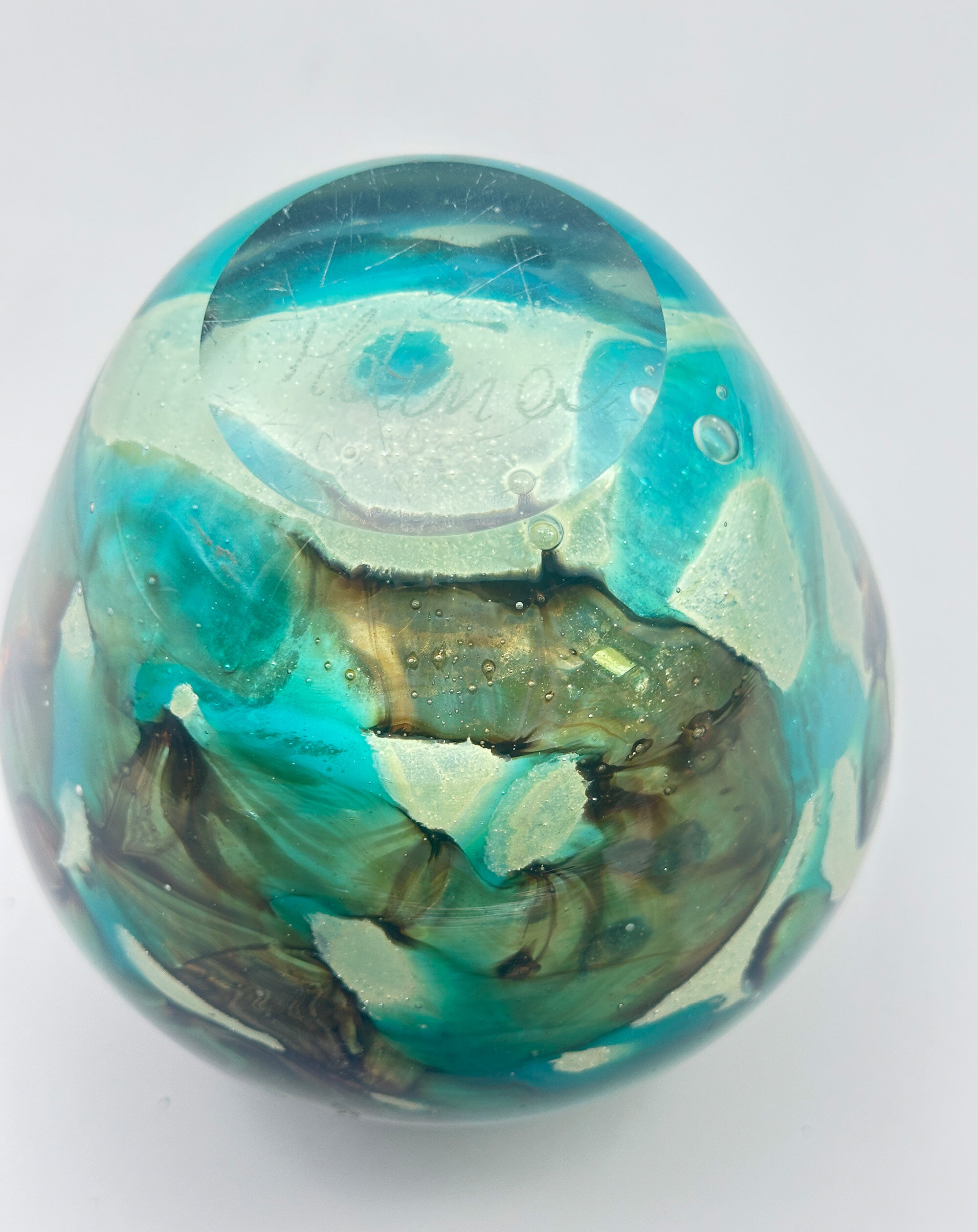 A stoutly blown glass vase of tapering ovoid form with a broad neck and a flaring rim, the base flat with an etched signature ‘Mdina’, decorated in browns and blues with a marble effect pattern.Mdina Glass was founded in the Maltese town of Mdina in 1968 by Michael Harris and Eric Dobson. The town had no history of glass making but the venture proved to be a success. Its wares, free formed organic glassware, often in colours inspired from the sea, sand, earth and sky, proved very popular with tourists visiting Malta. This vase is one of the earlier productions made by Mdina (the format of the signature confirms this) probably dating to the 1970s. The design is known as the ‘tiger pattern’ and is believed to have been created by Eric Dobson himself. All the pieces in the range have individual variations but this particular version is extremely pleasing and highly characteristic of Mdina’s naturalistic style.