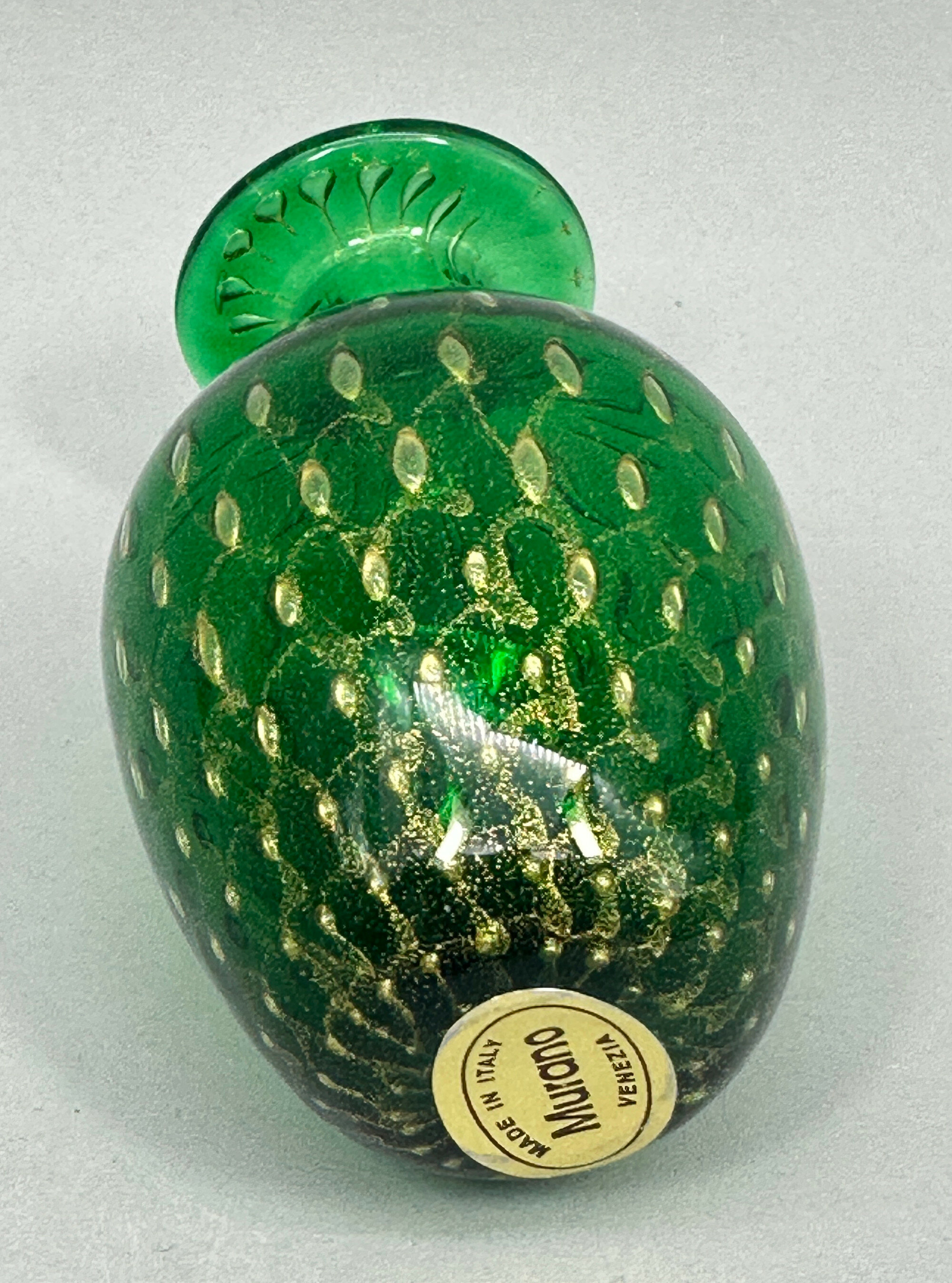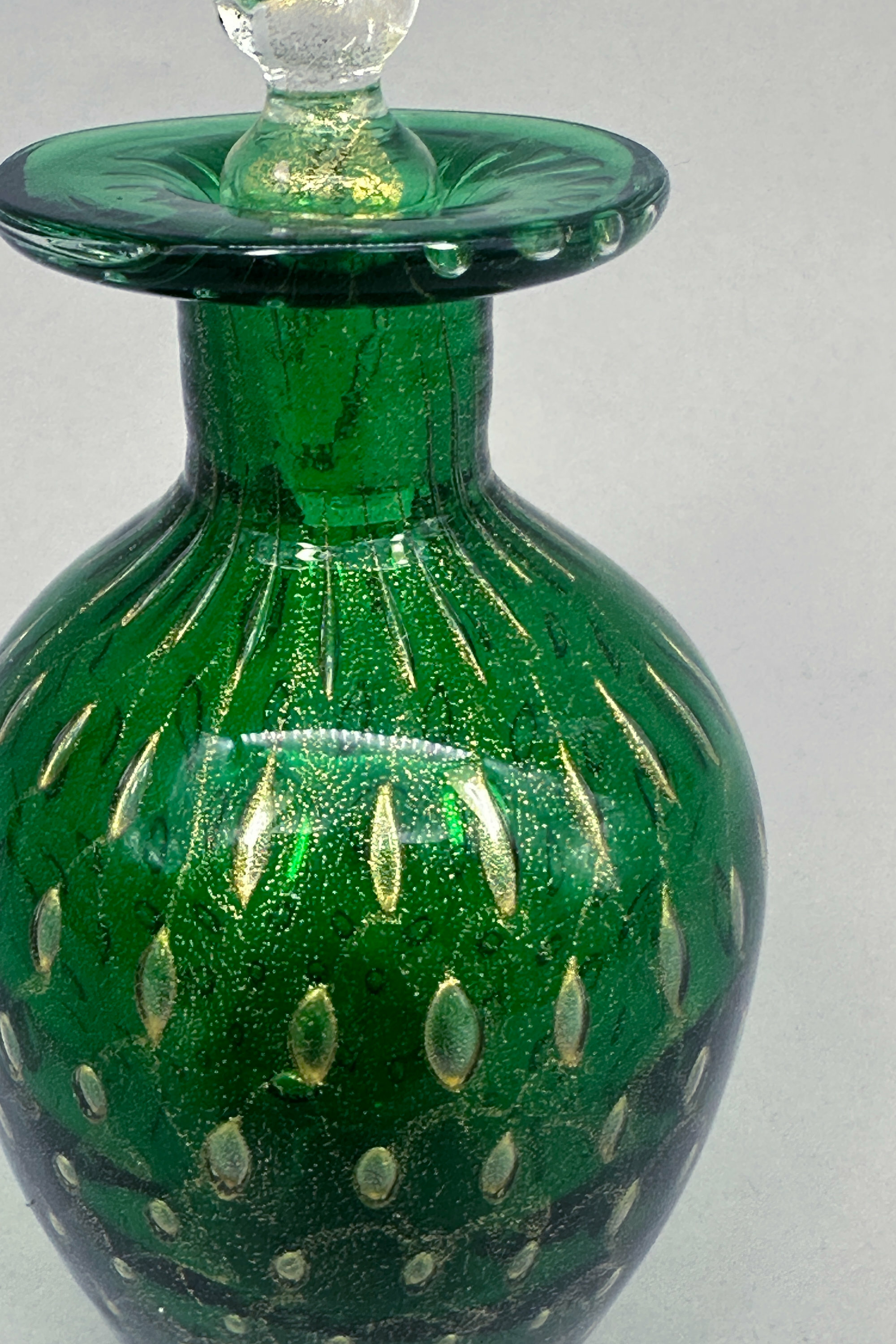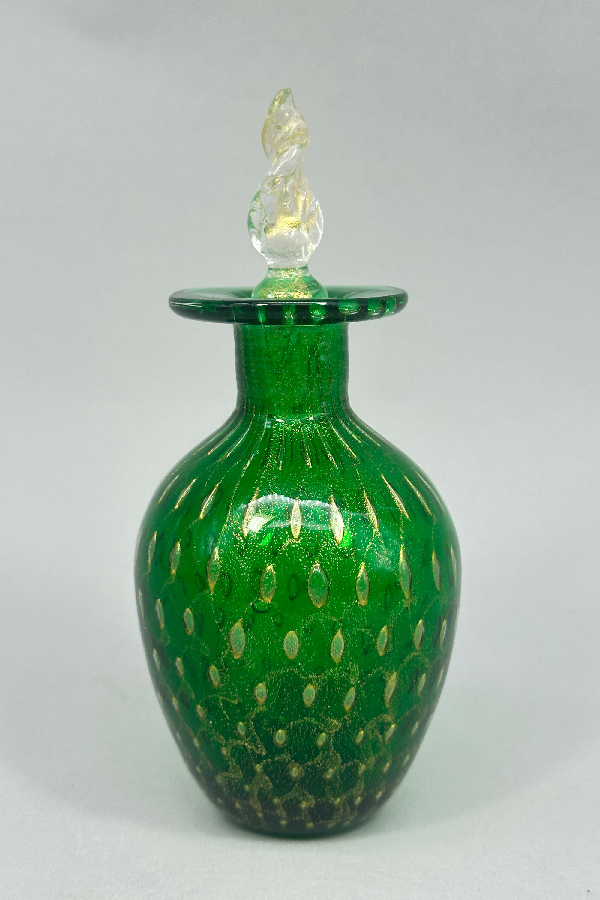 A perfume bottle and stopper, the body of ovoid form with a short cylindrical neck and a wide flat rim, the stopper twist shaped, the deep green glass with minute ‘bubbles’ both clear and coloured, the stopper with gilt detailing. At the base is a paper label reading ‘Made in Italy’ ‘Murano’ ‘Venezia’ and apart from the general style, the ‘bubble’ effects seen here, known as the ‘bullicante’ technique (the word means ‘boiling’), are typical of Murano craftsmanship. The bullicante process was developed and perfected during the 1930’s by Archimede Seguso, but its use continued and the format of the label here suggests a dating to the 1970s or 1980s.| Size: | Ht 12.5cm (overall), 9cm (bottle), Width (max) 5.5cm, Base 2.5cm, Stopper 5.5cm |