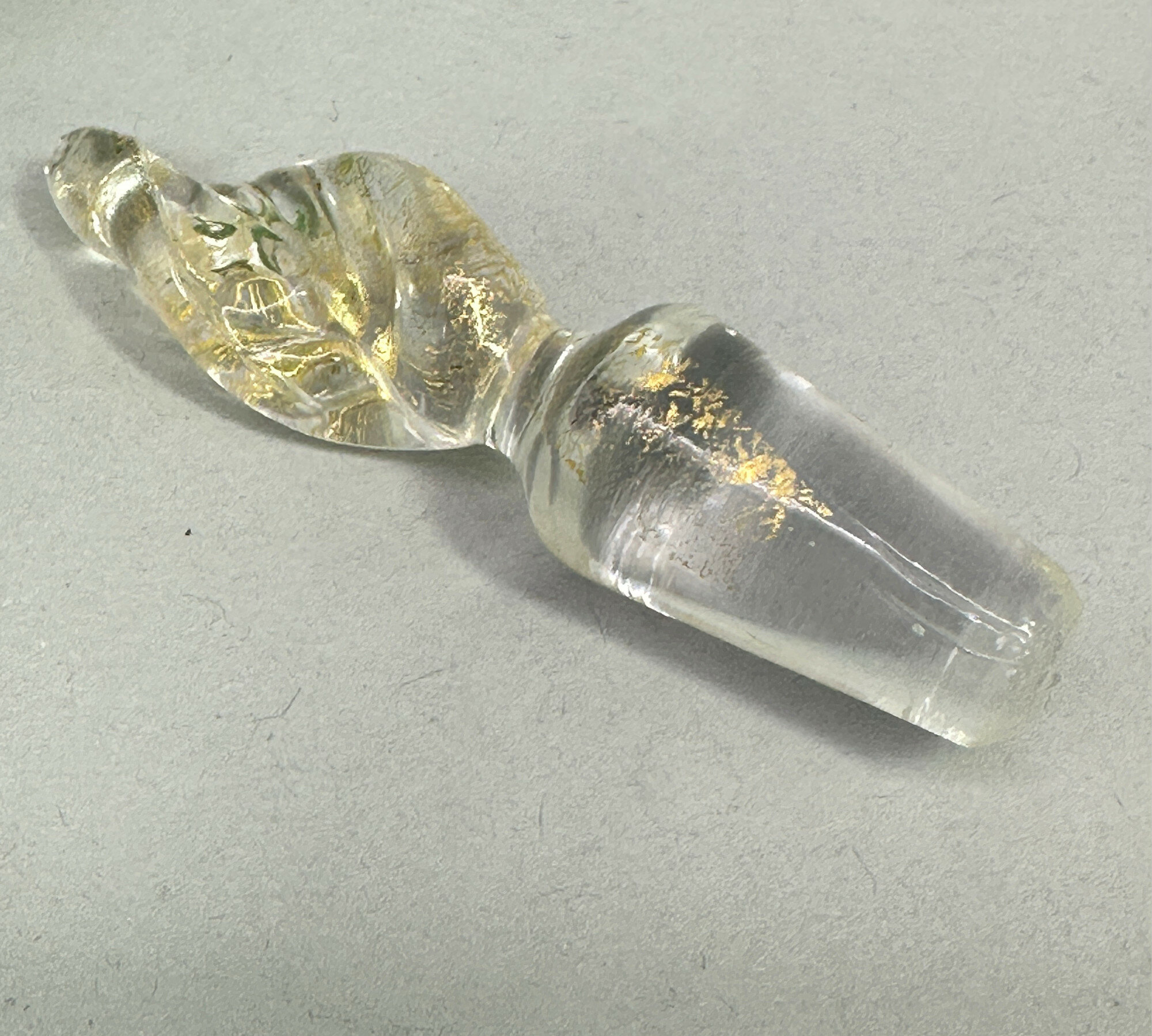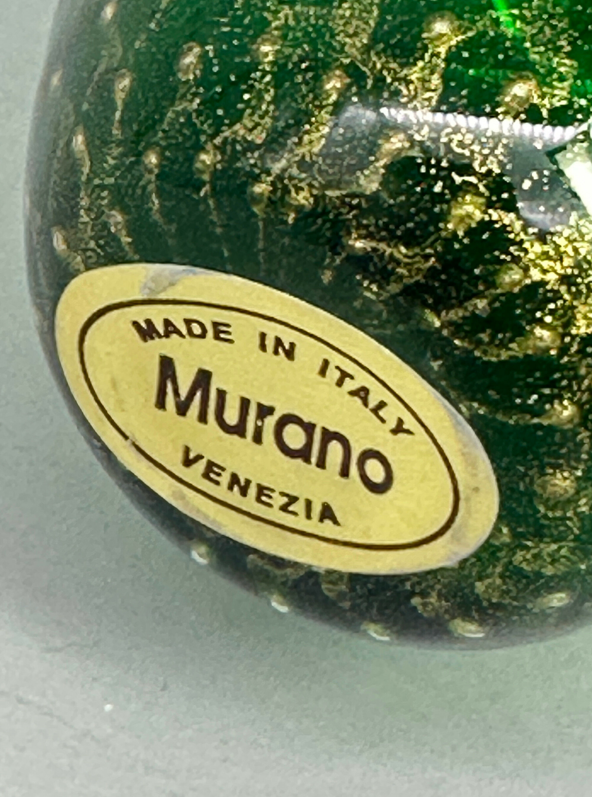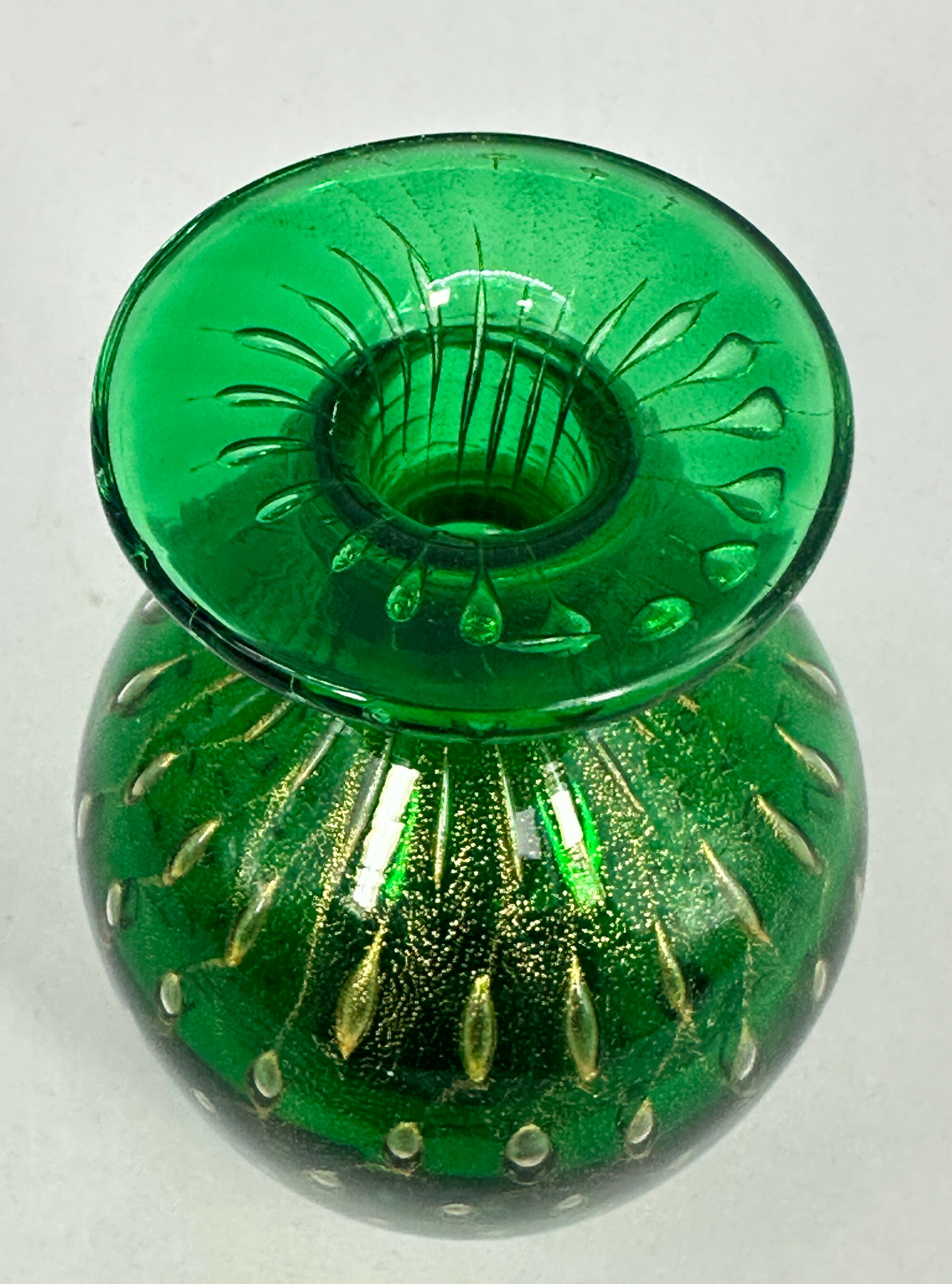 A perfume bottle and stopper, the body of ovoid form with a short cylindrical neck and a wide flat rim, the stopper twist shaped, the deep green glass with minute ‘bubbles’ both clear and coloured, the stopper with gilt detailing. At the base is a paper label reading ‘Made in Italy’ ‘Murano’ ‘Venezia’ and apart from the general style, the ‘bubble’ effects seen here, known as the ‘bullicante’ technique (the word means ‘boiling’), are typical of Murano craftsmanship. The bullicante process was developed and perfected during the 1930’s by Archimede Seguso, but its use continued and the format of the label here suggests a dating to the 1970s or 1980s.| Size: | Ht 12.5cm (overall), 9cm (bottle), Width (max) 5.5cm, Base 2.5cm, Stopper 5.5cm |