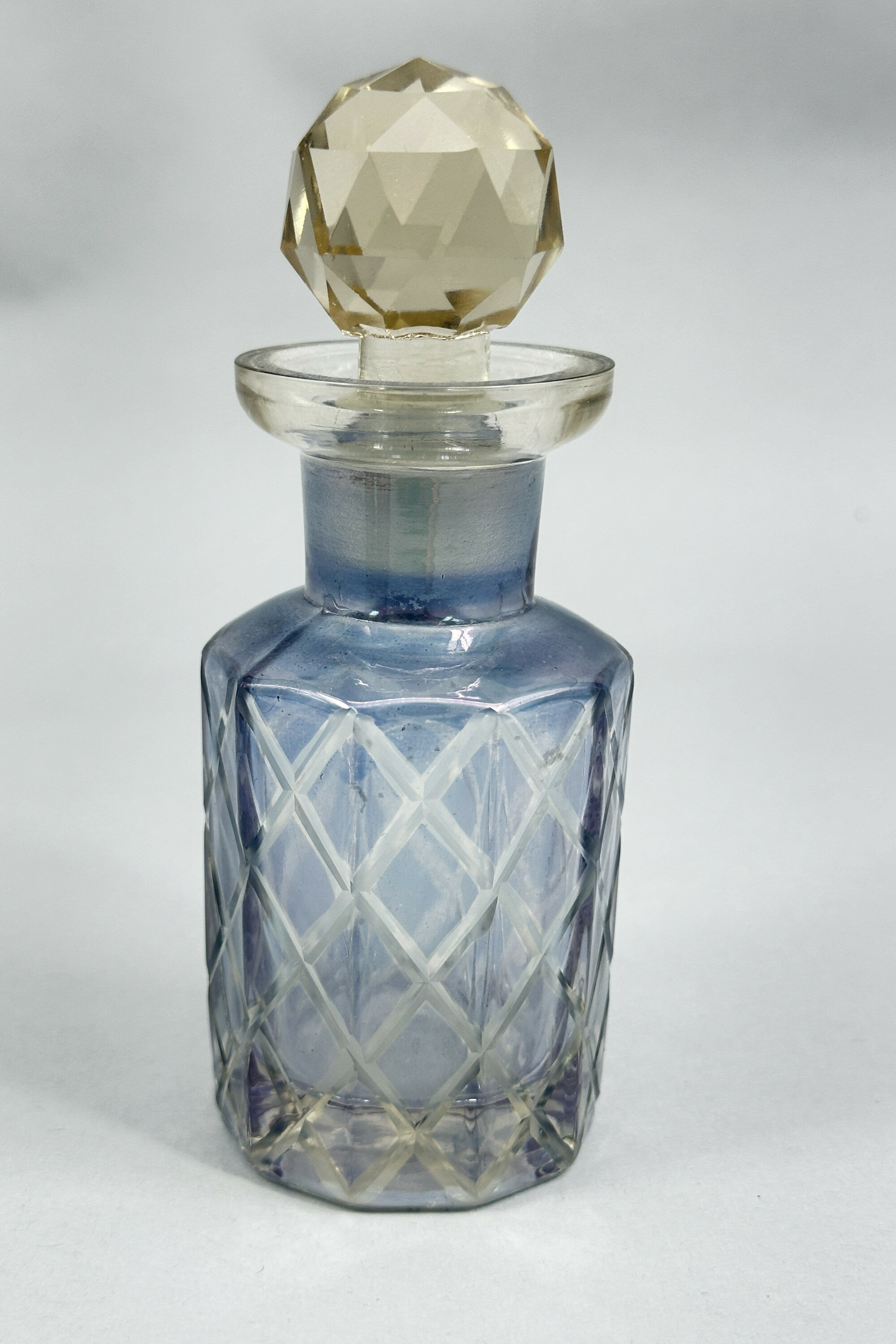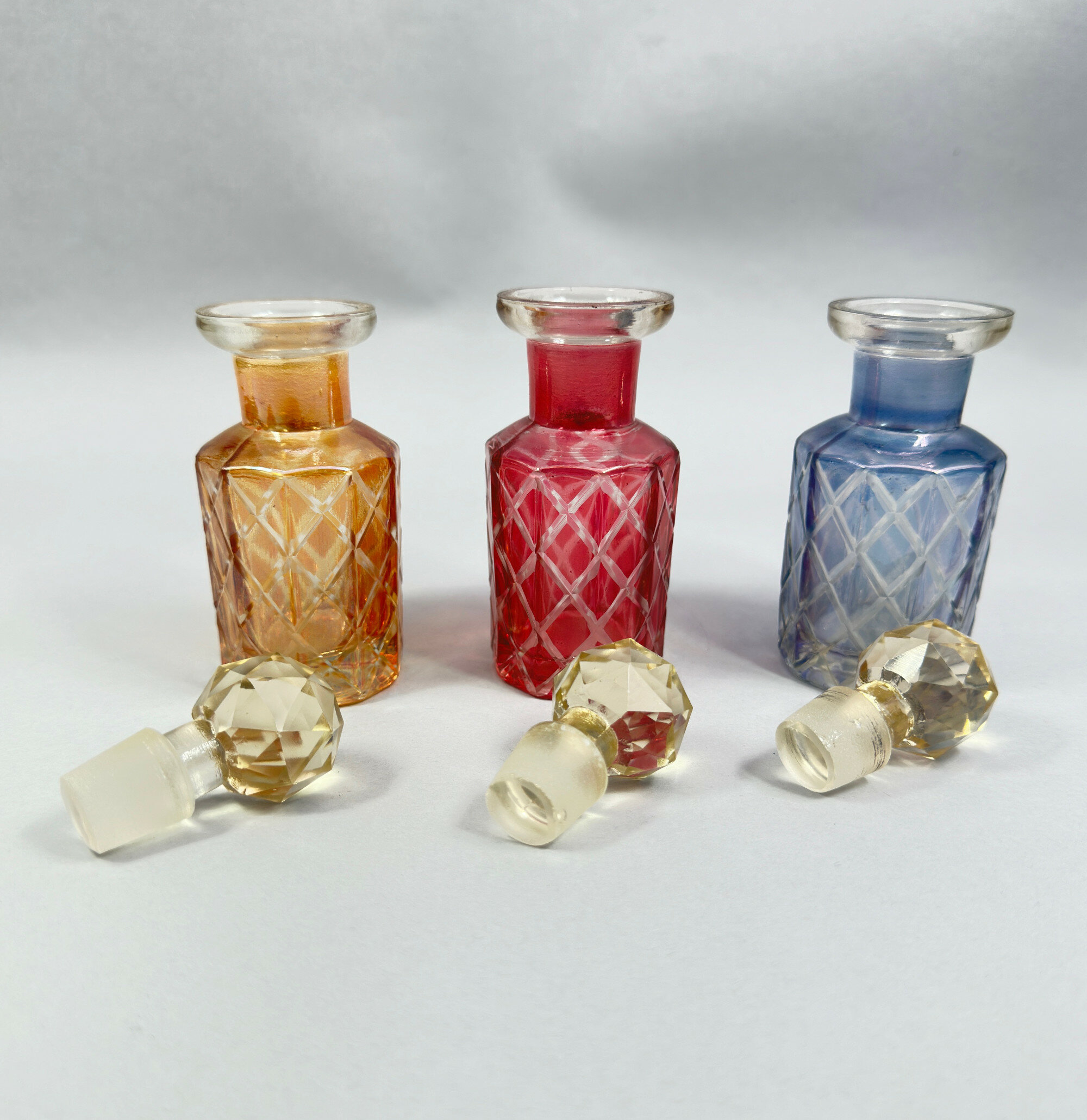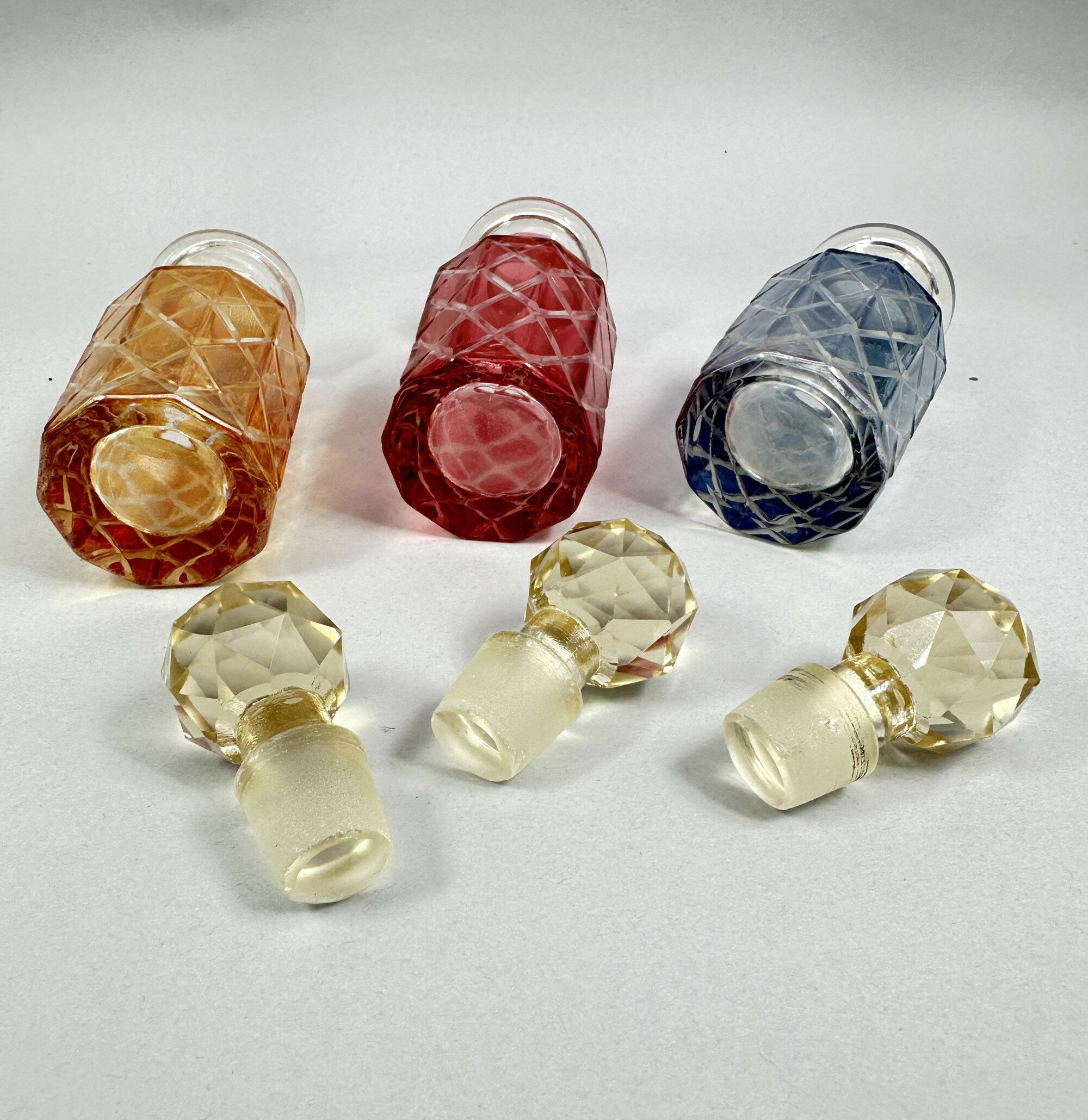 A set of three perfume bottles and stoppers, each of hexagonal form with short cylindrical necks and a galleried rim, the stoppers facetted, the bodies with a cut glass pattern of diamonds and flash glass complementary colourings of red, orange and blue to the interior. The technique of ‘flash glass’ employed here involves coating clear glass with a thin layer of coloured glass by placing a piece of coloured melted glass into another piece of clear melted glass and then blowing the two together. It is particularly associated with so called ‘Bohemian’ glass produced for export from the nineteenth century onwards by the workshops from the regions of Bohemia and Silesia, now parts of the Czech Republic. Dating here is probably to the mid twentieth century and this is an attractive set which has survived in excellent condition and would form an elegant accessory for the dressing table.| Size: | Ht 12cm, Diam 4cm |
