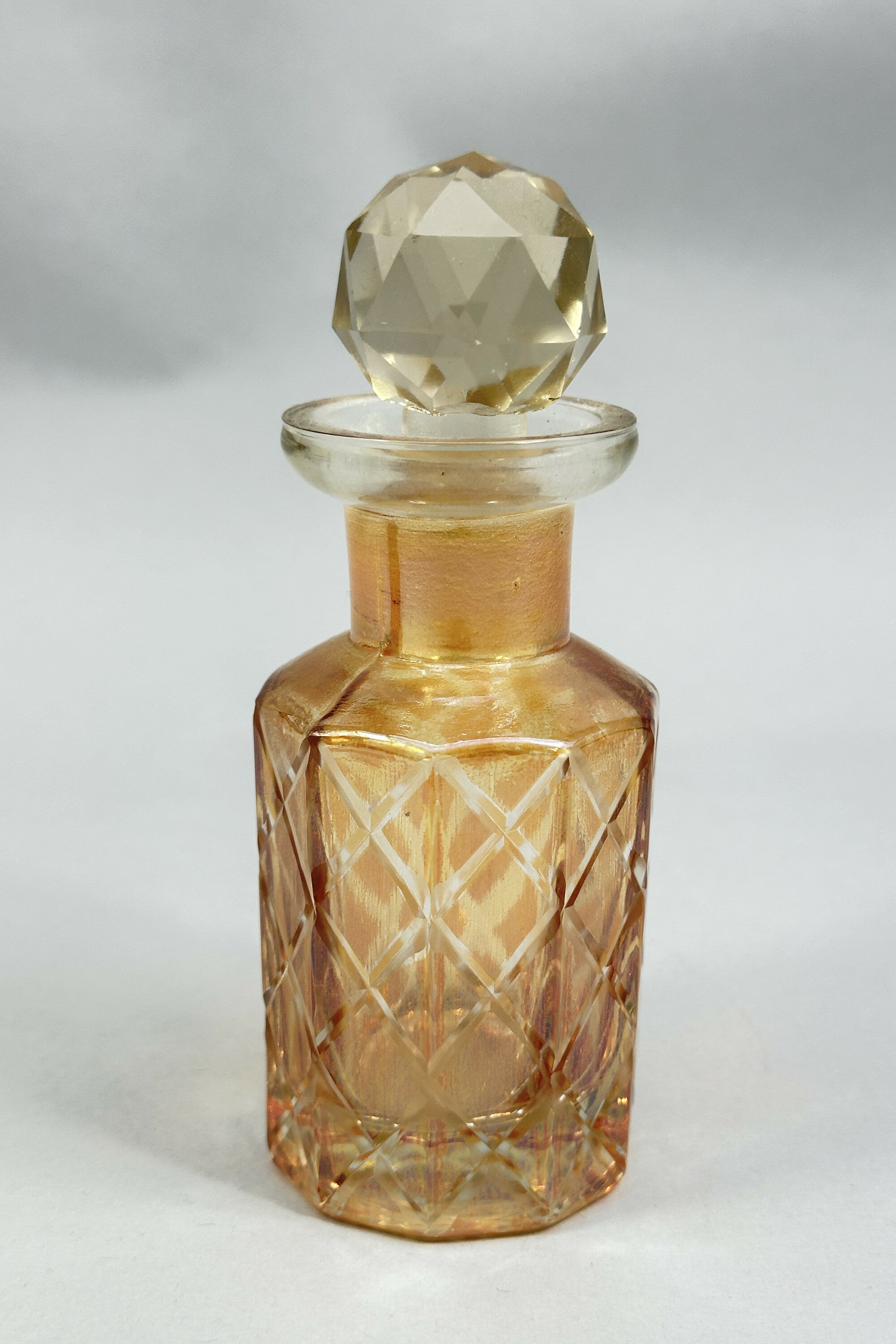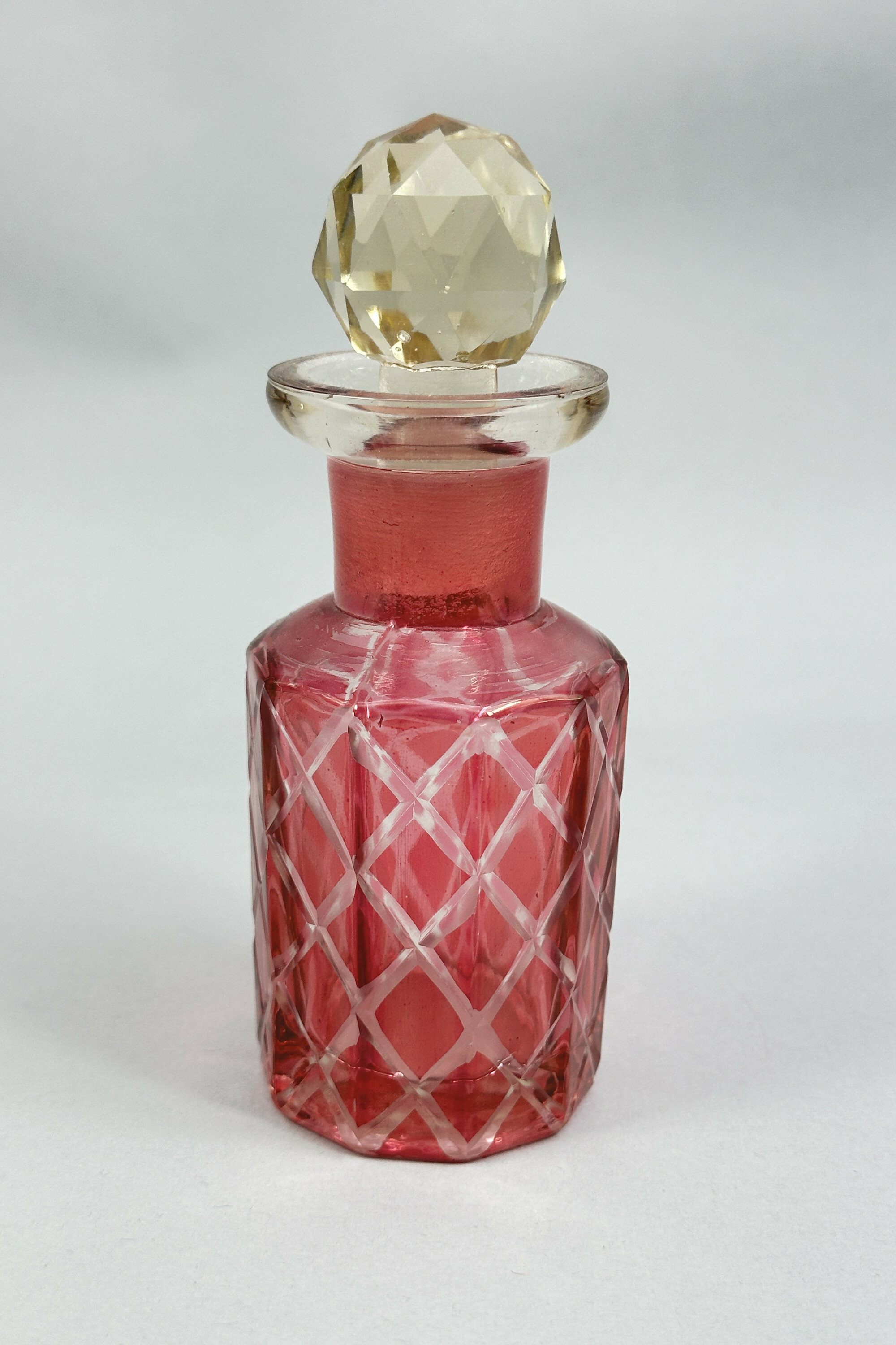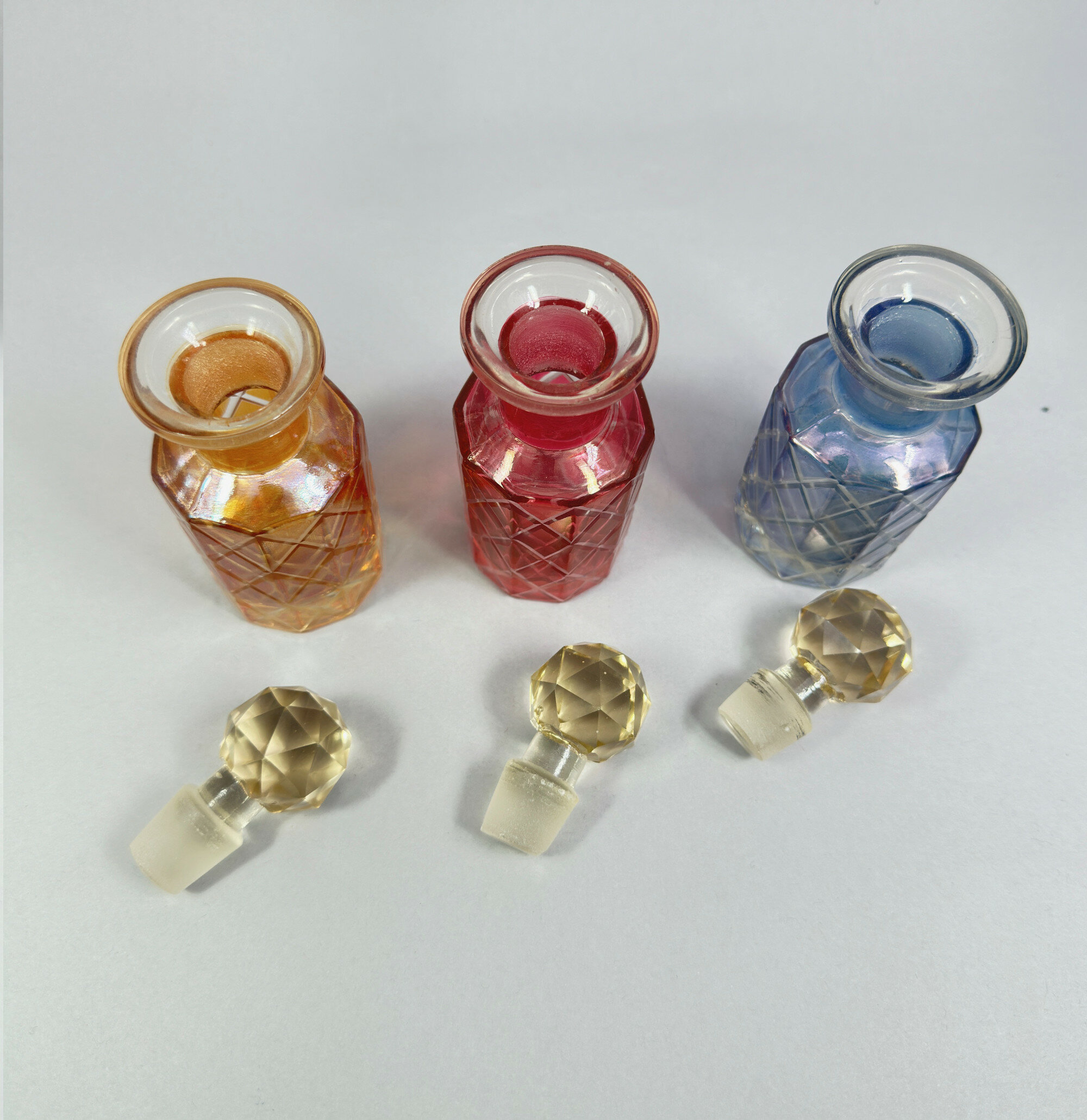 A set of three perfume bottles and stoppers, each of hexagonal form with short cylindrical necks and a galleried rim, the stoppers facetted, the bodies with a cut glass pattern of diamonds and flash glass complementary colourings of red, orange and blue to the interior. The technique of ‘flash glass’ employed here involves coating clear glass with a thin layer of coloured glass by placing a piece of coloured melted glass into another piece of clear melted glass and then blowing the two together. It is particularly associated with so called ‘Bohemian’ glass produced for export from the nineteenth century onwards by the workshops from the regions of Bohemia and Silesia, now parts of the Czech Republic. Dating here is probably to the mid twentieth century and this is an attractive set which has survived in excellent condition and would form an elegant accessory for the dressing table.| Size: | Ht 12cm, Diam 4cm |