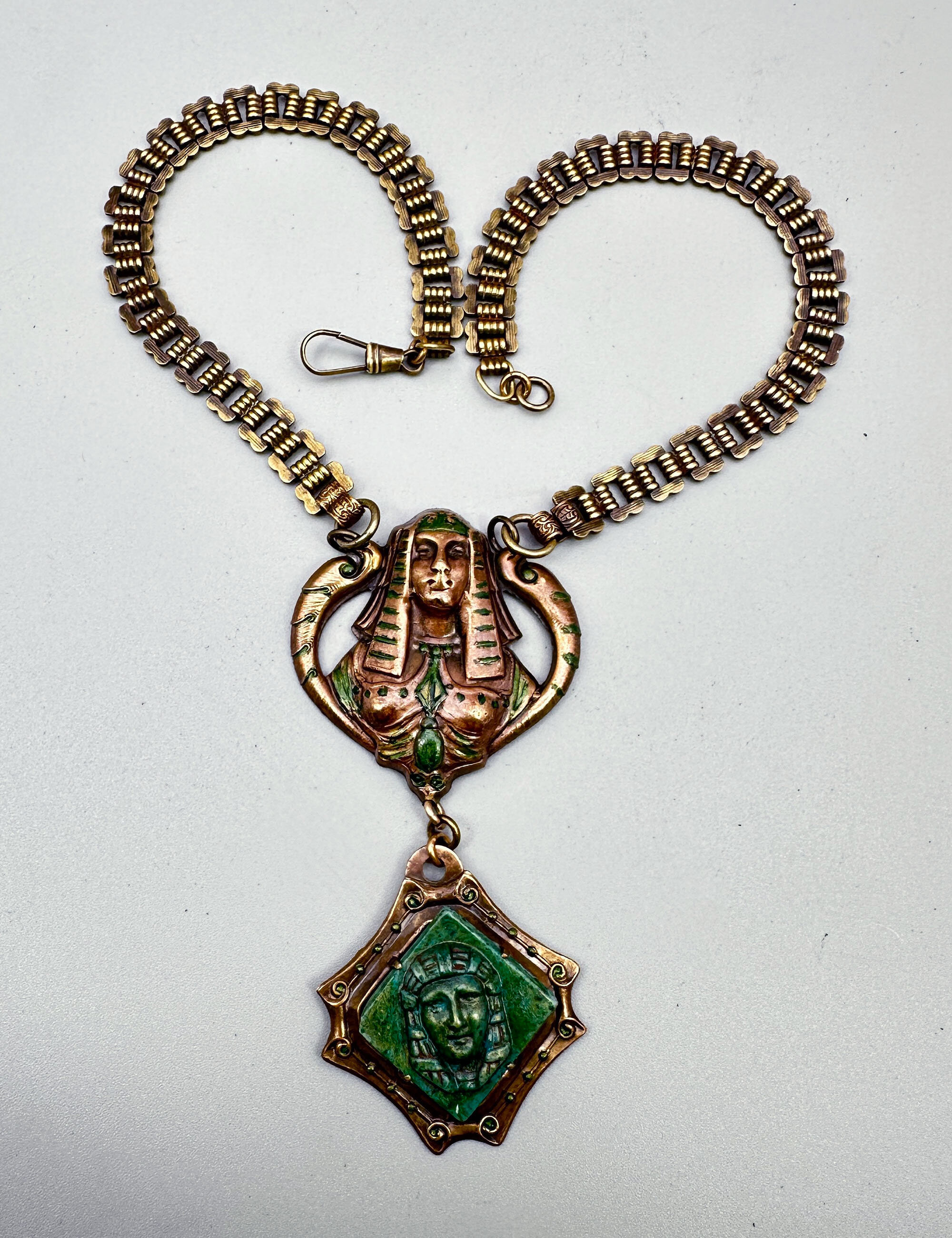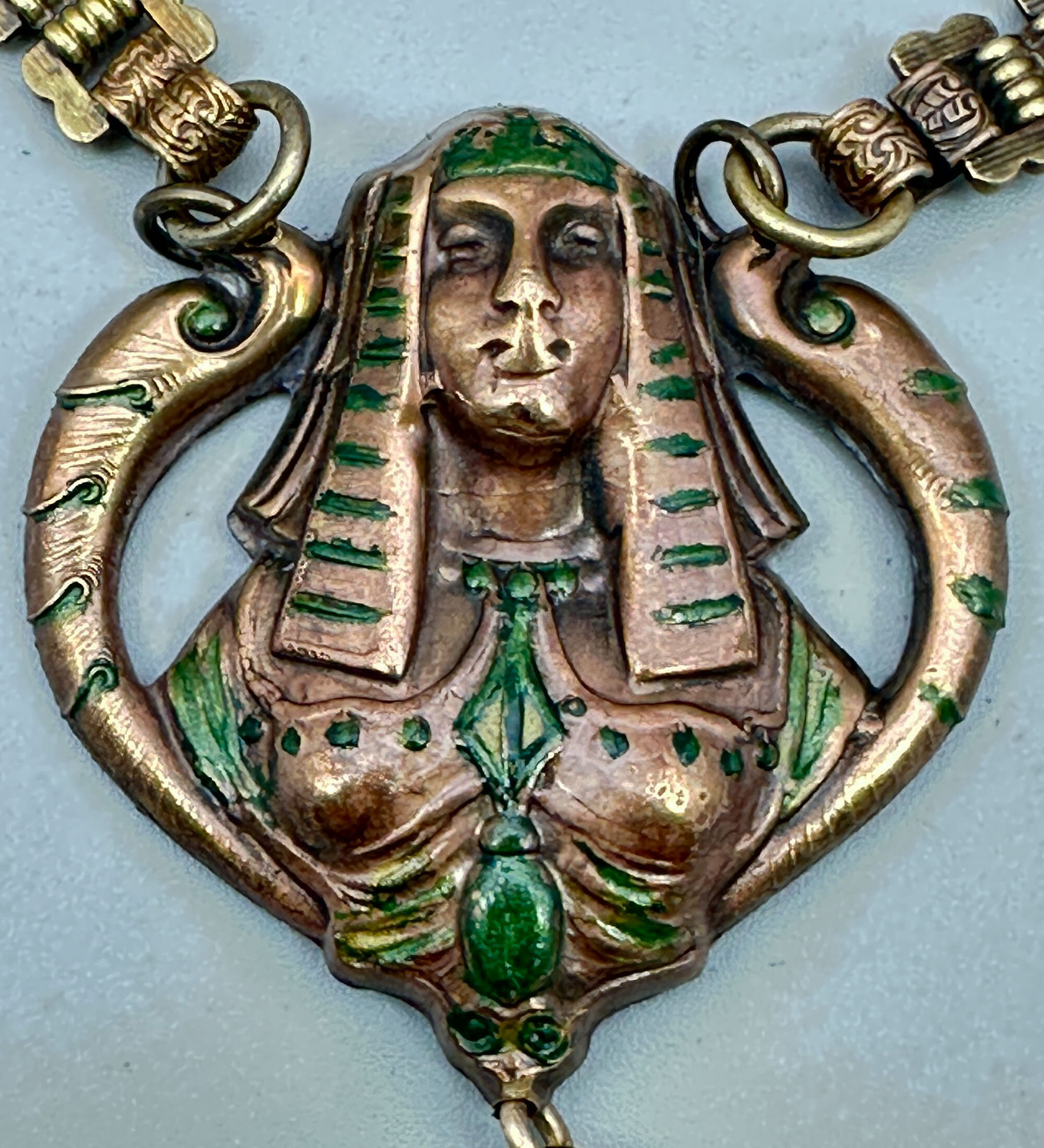 This is quite an early necklace by the Neiger brothers that features a large stylized central pendant depicting Sobekneferu or it might be conglomeration of different figures. This then has a hanging pendant with a molded glass plaque that depicts another Egyptian figure. The chain is interesting as it is a book chain style particularly popular in the Edwardian era.