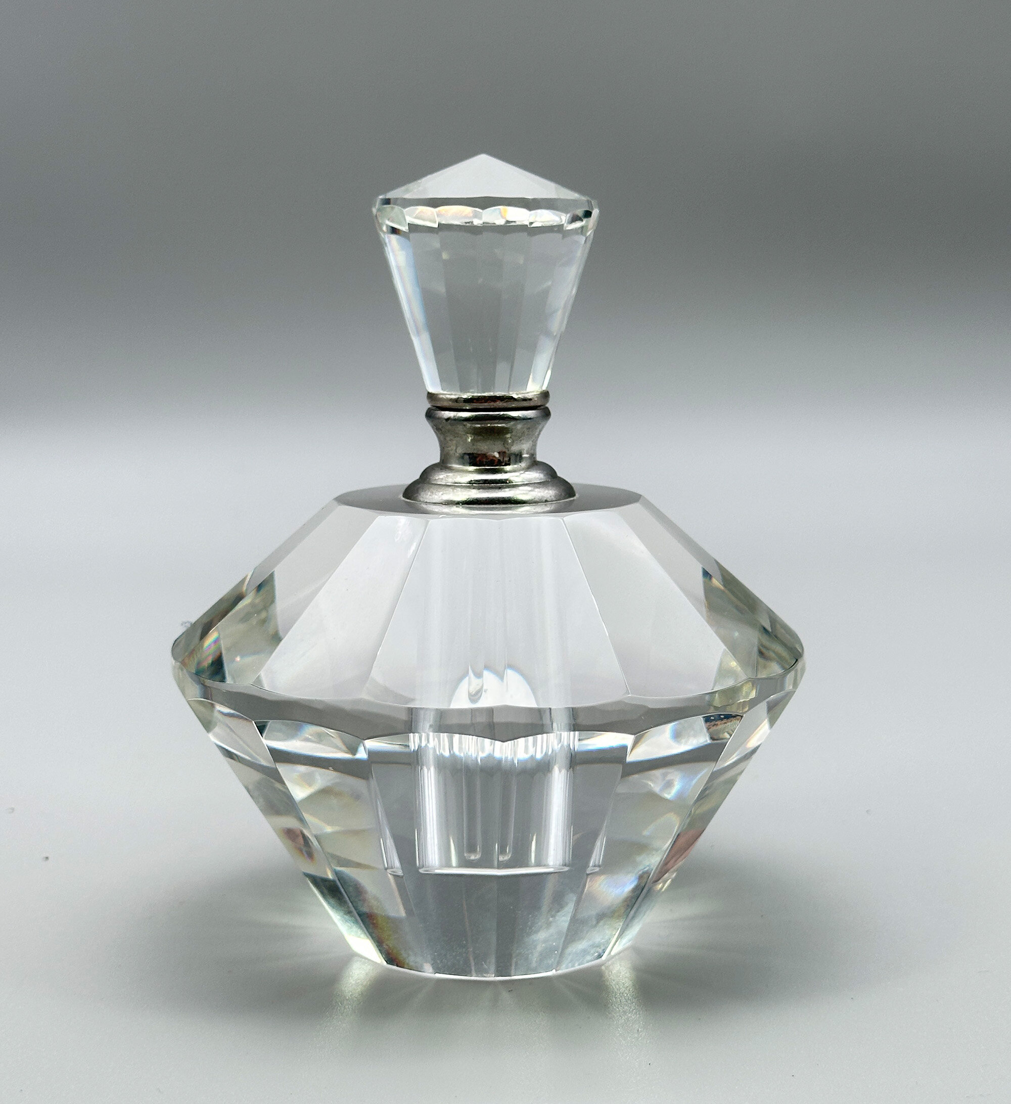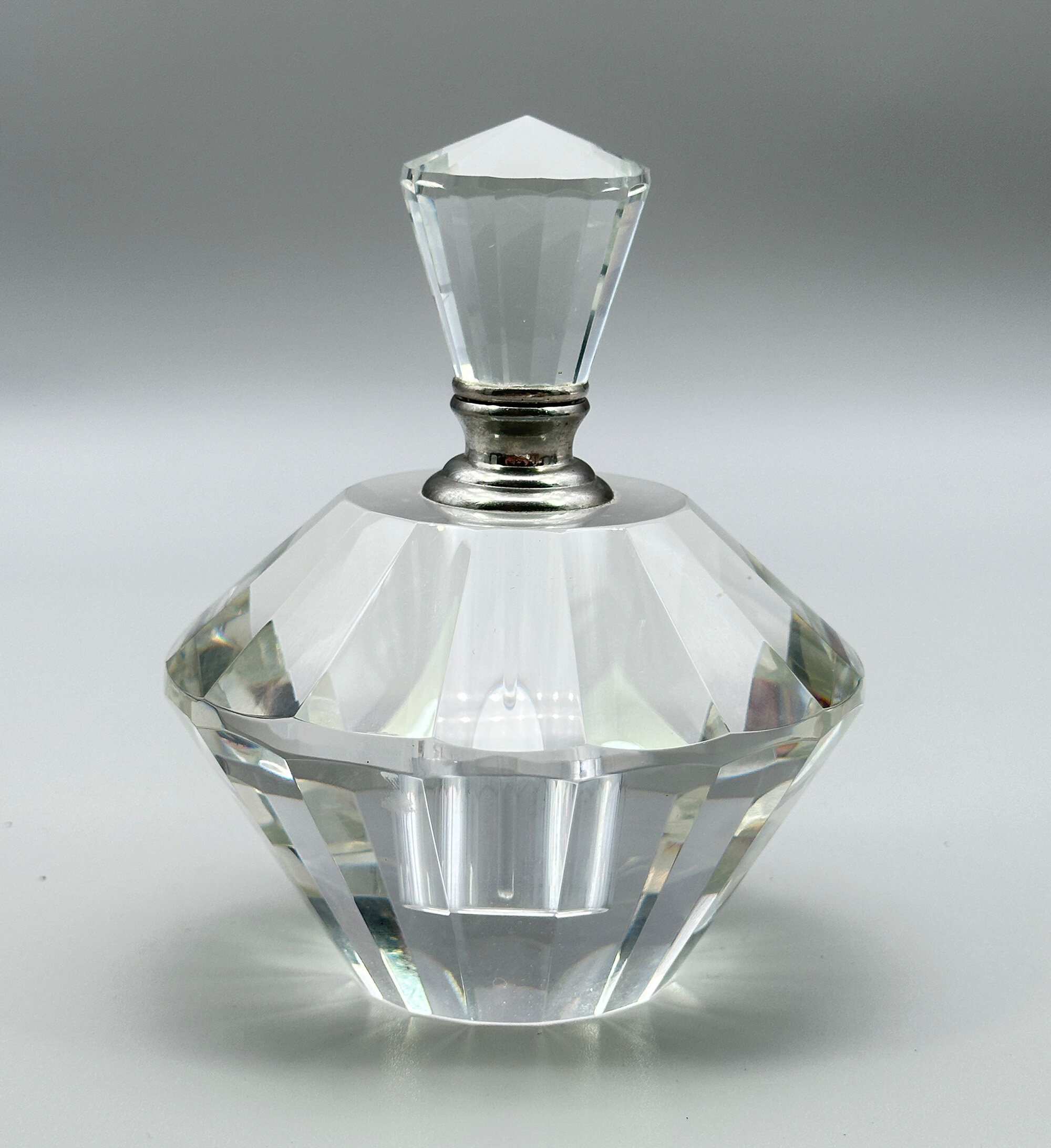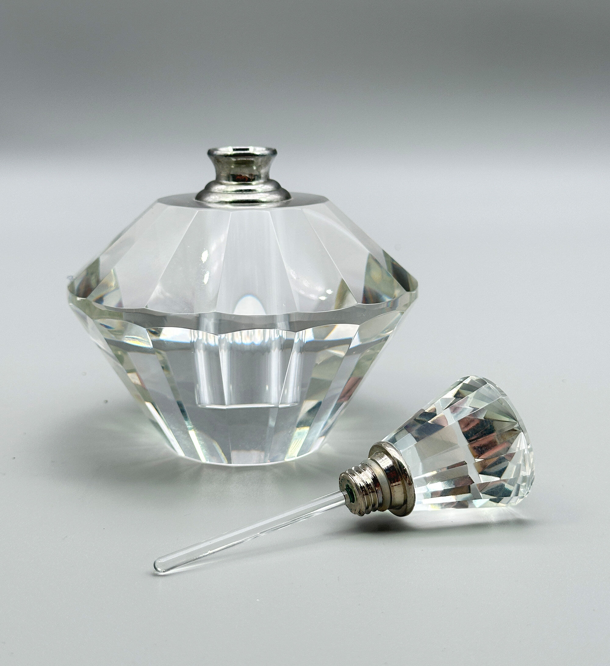 A crystal glass perfume bottle and stopper, the angular body comprising two truncated cones, one inverted, with facetted surfaces, the shoulder flat and with a white metal screw thread collar above which fits into the white metal base of the stopper which is also angular and facetted. While Art Deco in style, this attractive perfume bottle is more likely of fairly recent manufacture dating to the late twentieth century but it is a stylish piece nevertheless and the quality of the glass enhances the detail of the design making it an elegant dressing table accessory.| Size: | Ht 12cm (overall), 8.5cm (bottle), Width (max) 9.5cm, Base 4.7cm, Stopper 9.5cm |
