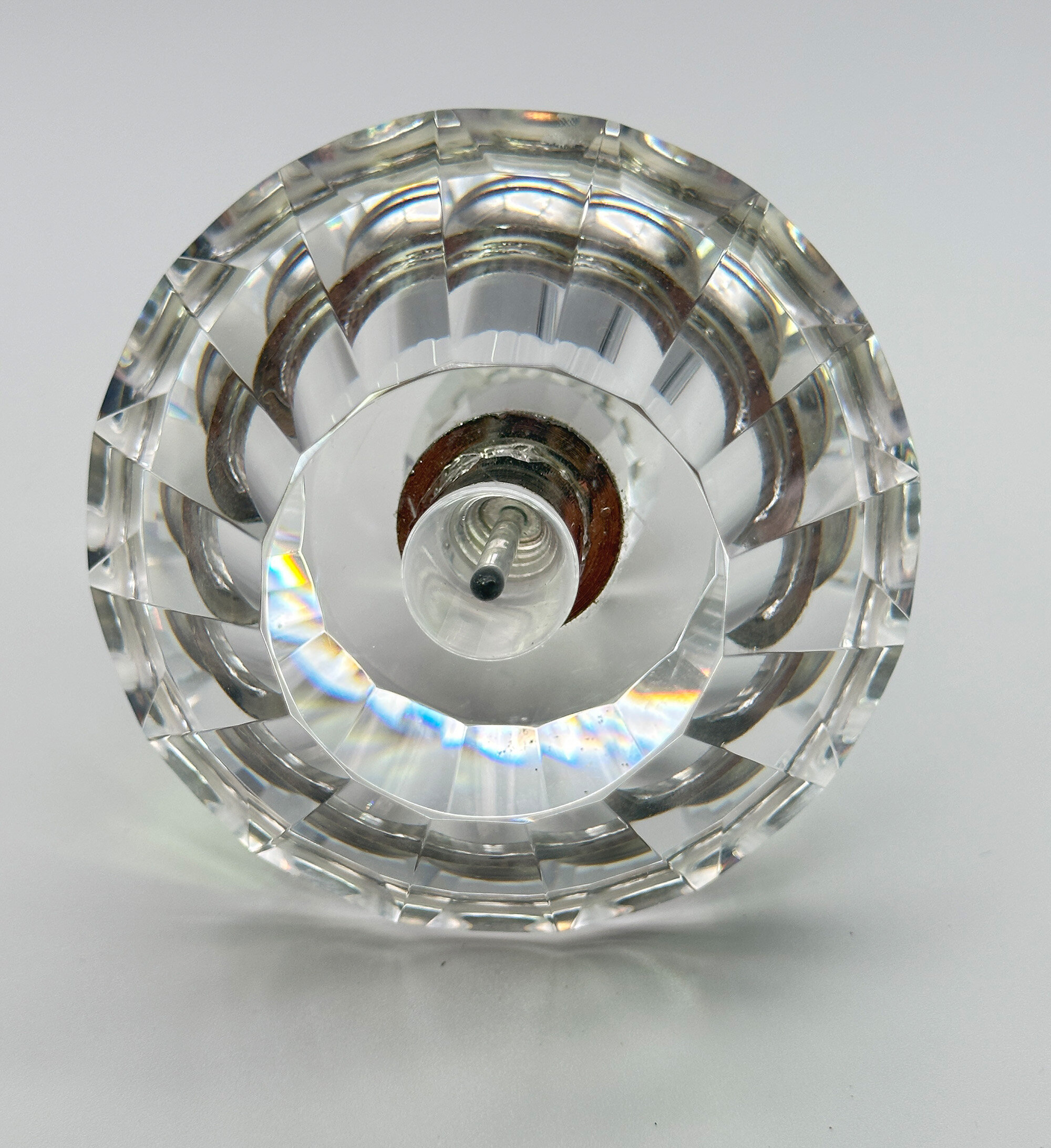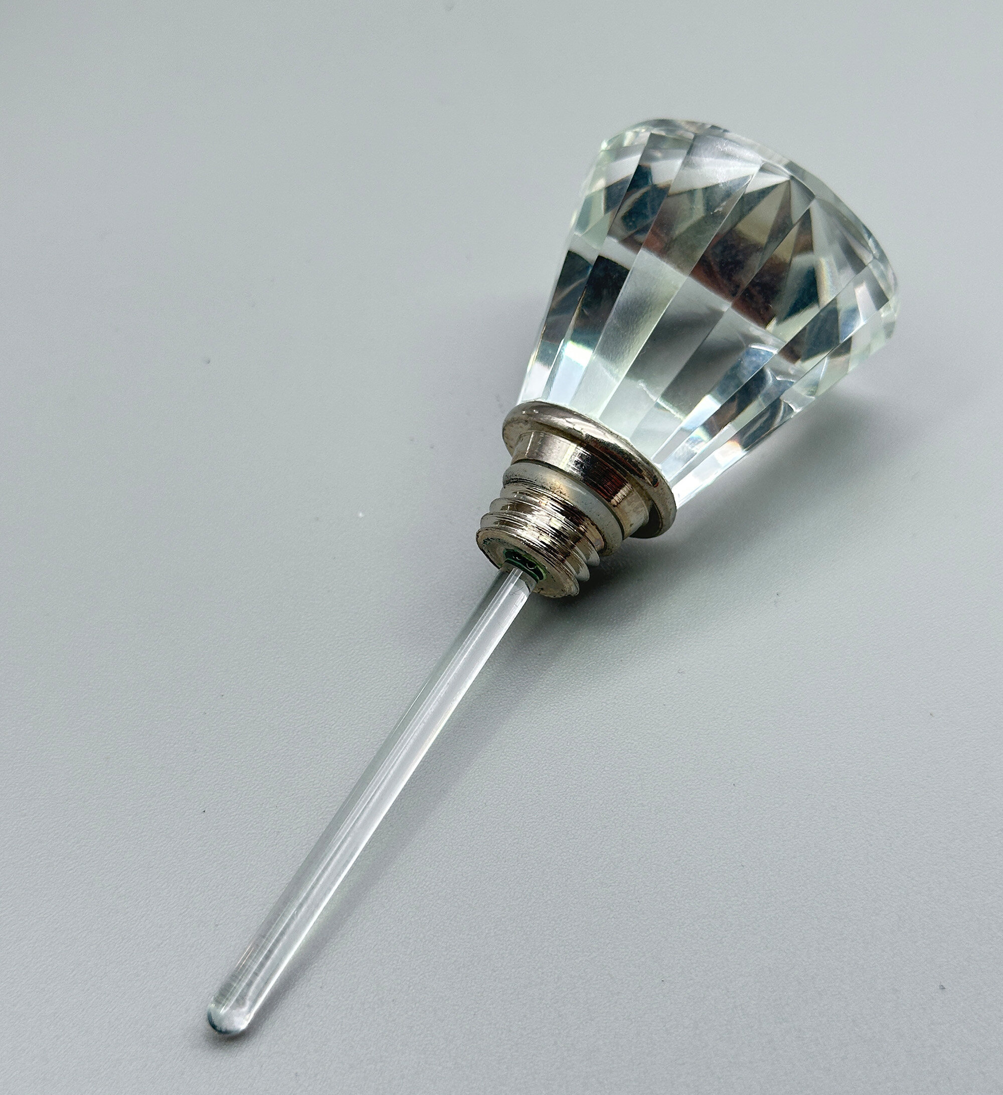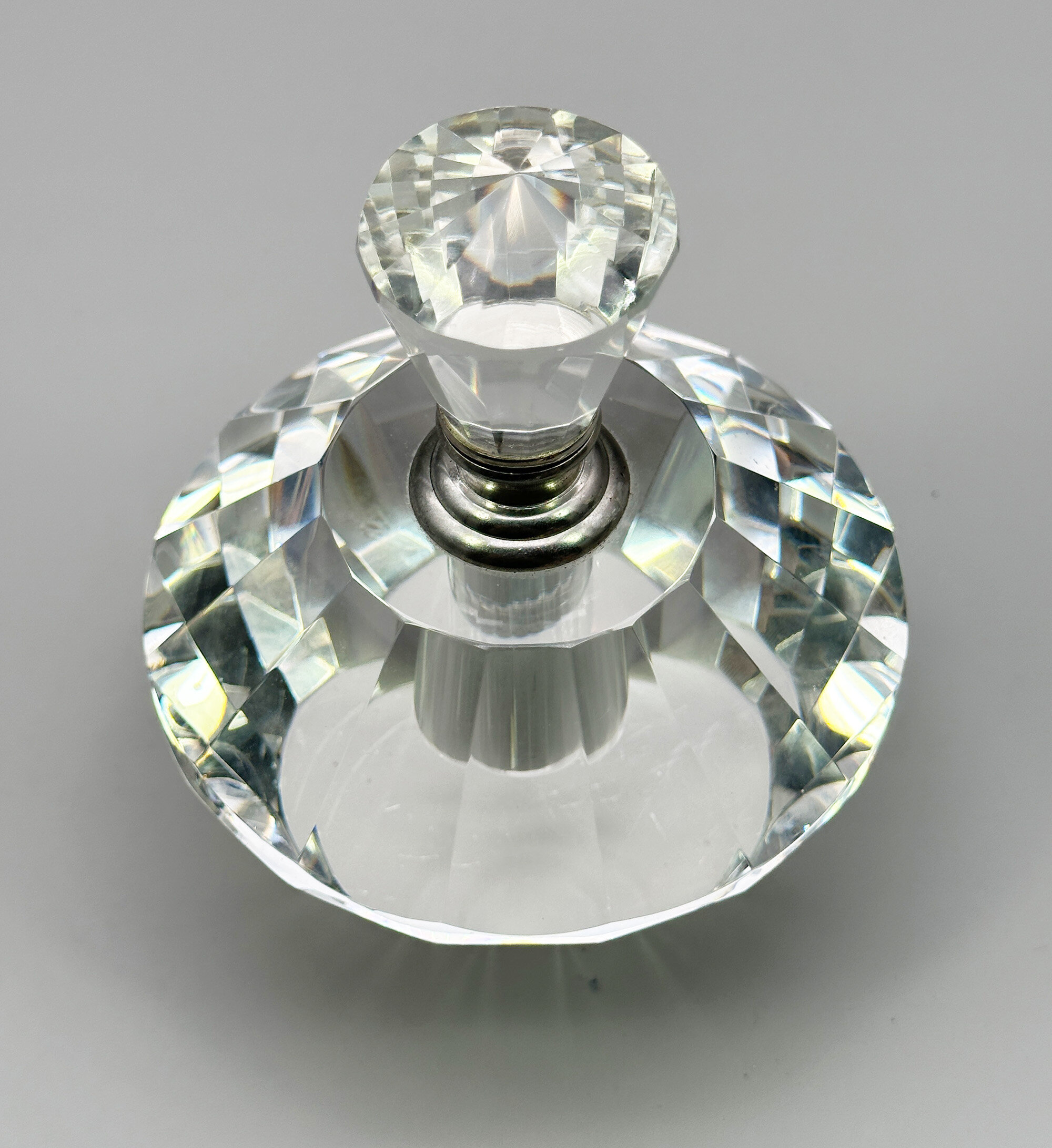 A crystal glass perfume bottle and stopper, the angular body comprising two truncated cones, one inverted, with facetted surfaces, the shoulder flat and with a white metal screw thread collar above which fits into the white metal base of the stopper which is also angular and facetted. While Art Deco in style, this attractive perfume bottle is more likely of fairly recent manufacture dating to the late twentieth century but it is a stylish piece nevertheless and the quality of the glass enhances the detail of the design making it an elegant dressing table accessory.| Size: | Ht 12cm (overall), 8.5cm (bottle), Width (max) 9.5cm, Base 4.7cm, Stopper 9.5cm |