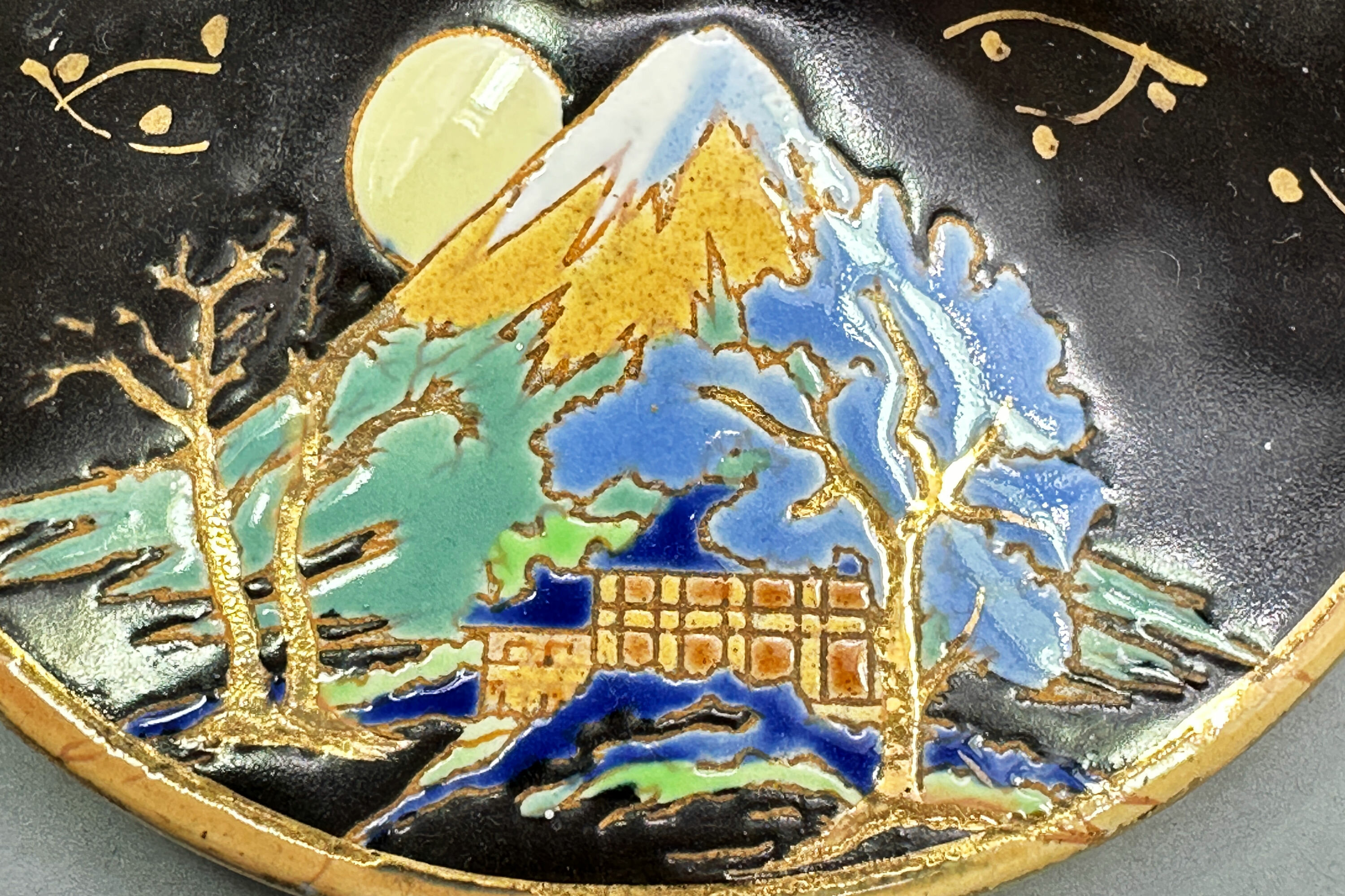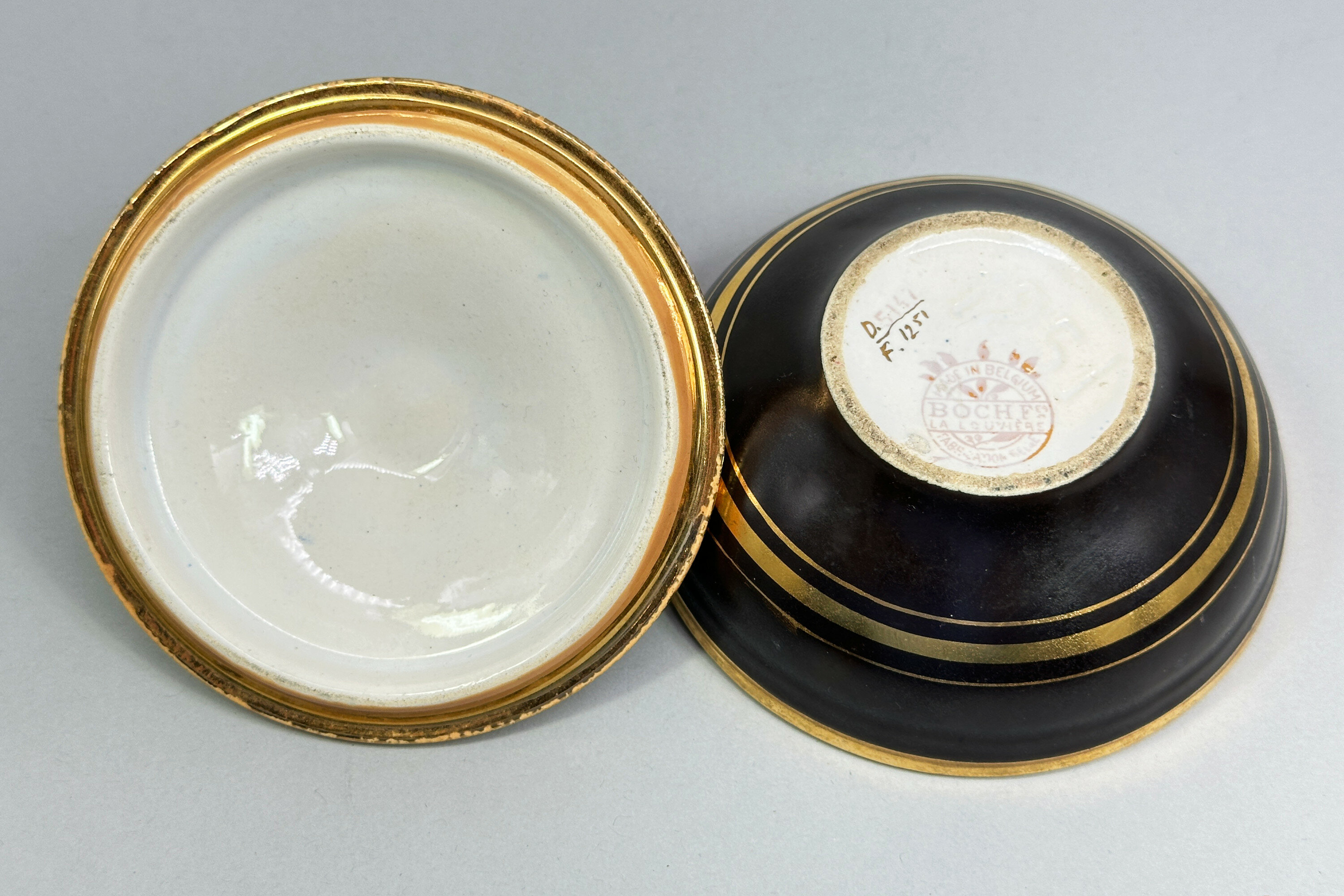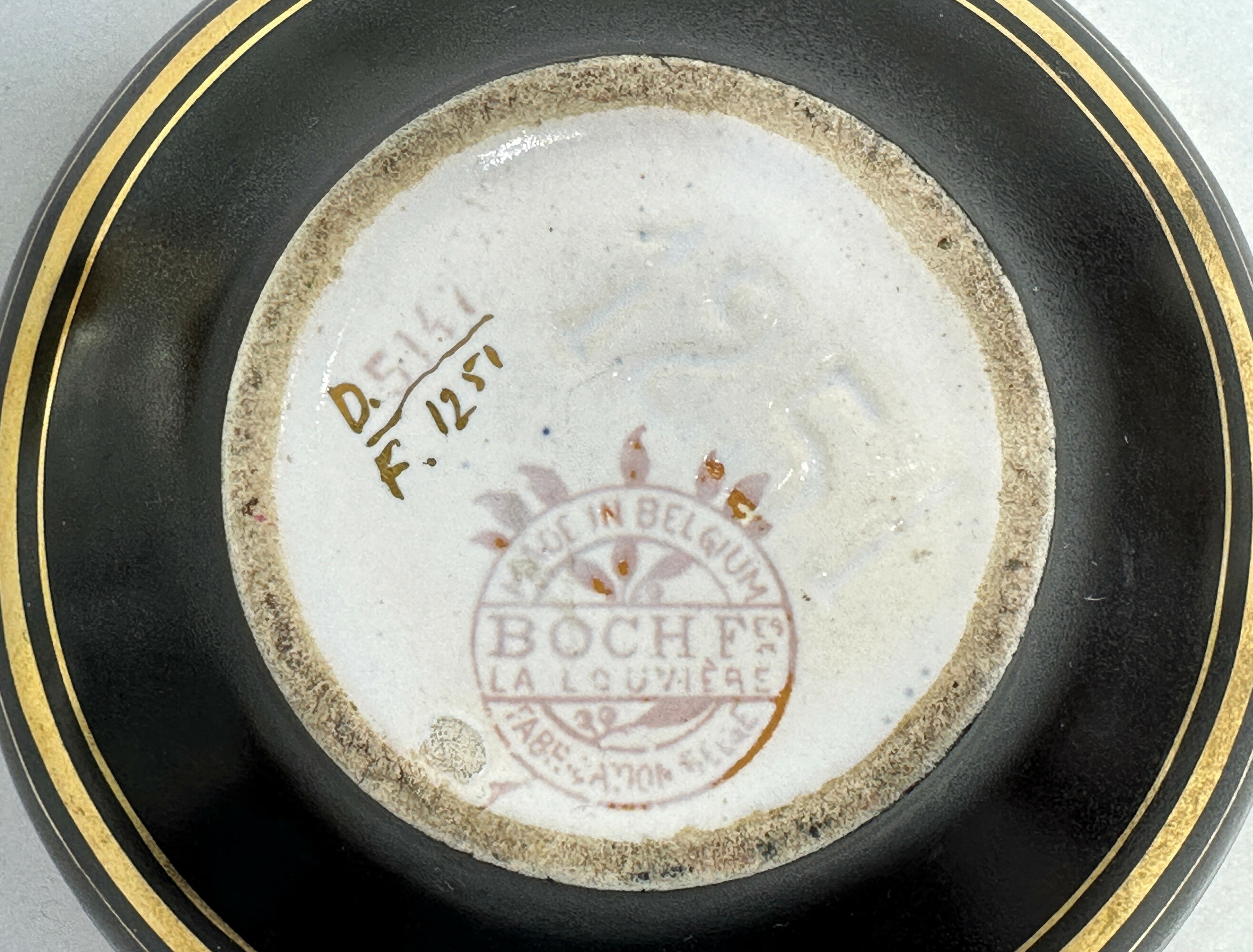 A ceramic box and cover, the base of inverted hemisphere form, the angular cover gently sloping towards the columnar knob finial, the black glaze ground with gilt bands and the lid with a stylised Japanese landscape design showing a snow capped Mount Fuji with trees and a pavilion and surrounded by two floral sprays of lotus and chrysanthemum, the base with a stamped circular mark for ‘Boch Freres’, script (? pattern) marks and impressed numbers ‘1251’.The firm Boch Freres Keramis was founded by Eugene and Victor Boch and their brother-in-law, Jean Baptiste Nothomb, in 1841 and was located in La Louviere in eastern Belgium. In 1906 Charles Catteau joined the company as artistic director and was responsible for a new and wide ranging series of designs, some under the influence of Japonisme, transitioning the company from producing utilitarian objects to highly decorative ceramics. His work can clearly be seen here in a piece which appears to be quite unusual. Both the form and the decoration reflect early twentieth century fashion in the clean lines and the images inspired by Japan. There is a hint of the aesthetic movement here producing an object of great attraction and interest.