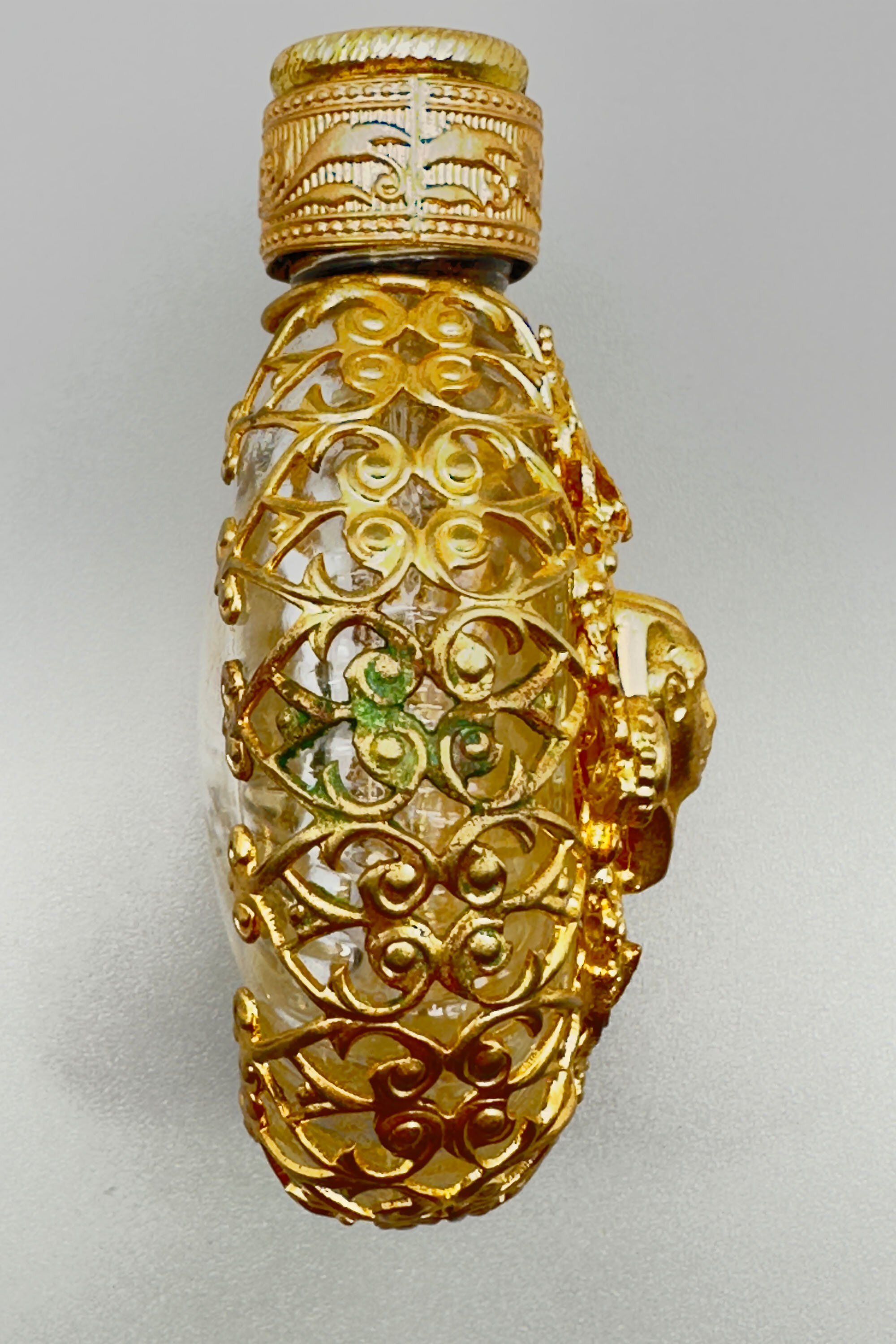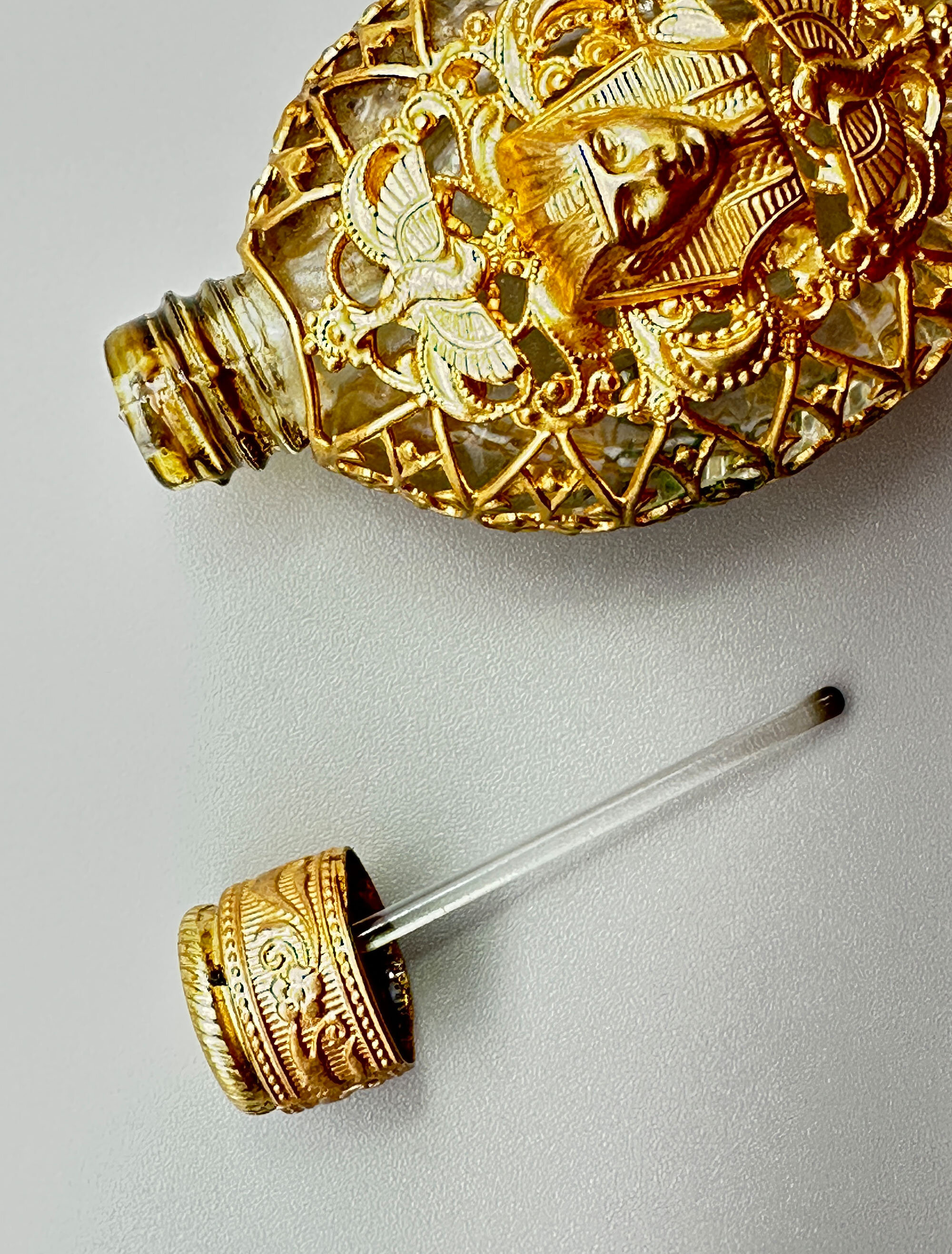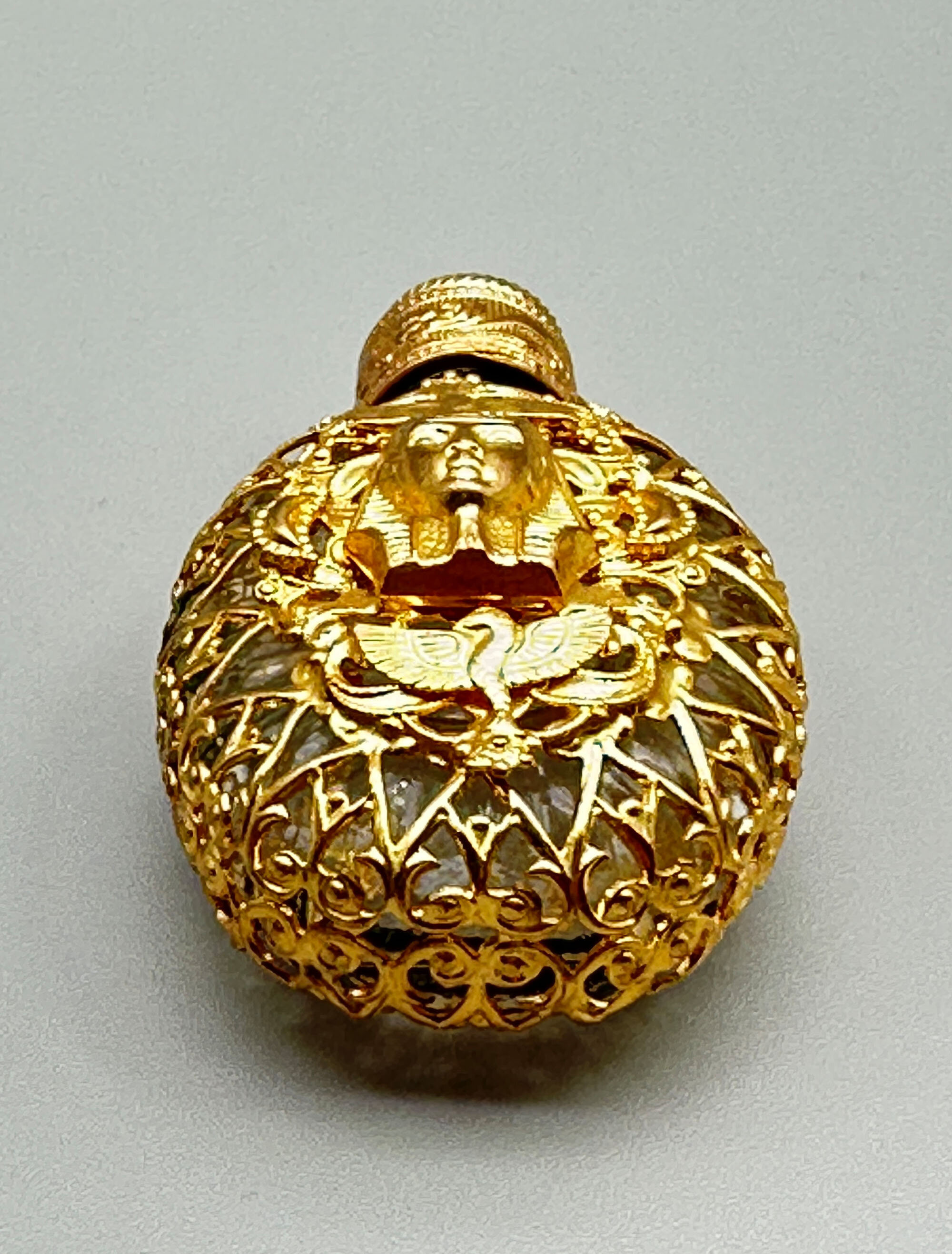 A perfume bottle with a screw top cover, the flattened oval glass body encased in gilt filigree work, the front with a portrait head of Tutankhamun between two falcons representing the Goddess Ra and the reverse with an oval opening revealing the interior of the bottle and the glass wand attached to the cover which is in gilt metal with a screw fitting matching the top of the bottle. The style here is obviously that of the ‘Egyptian Revival’ which became ever more fashionable after the discovery of Tutankhamun’s tomb by the Earl of Carnarvon and Harold Carter in 1922. Glass bottles encased in gilt filigree work are a hallmark of the Czech glassworks and while most incorporate European elements into the decoration there are other examples which are Egyptian Revival in style and so this is most likely what we have here. Dating is probably to the 1970s.| Size: | 60mm x 37.6mm x 27.5mm |