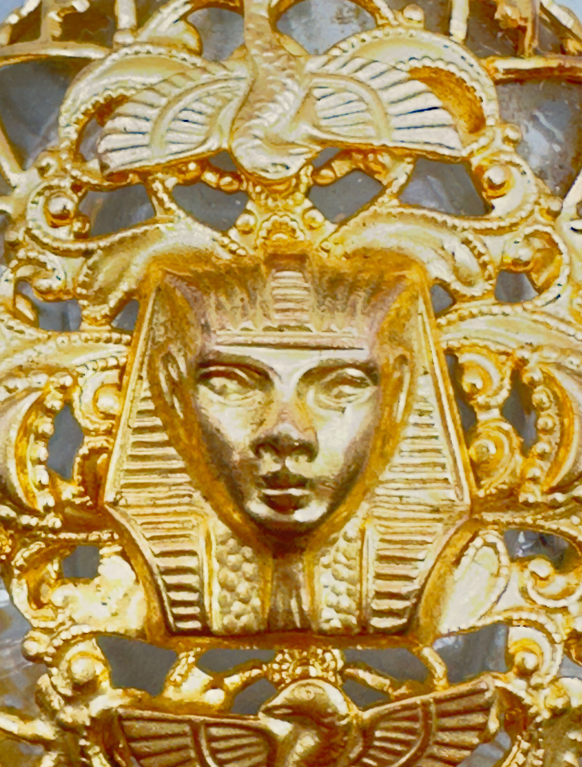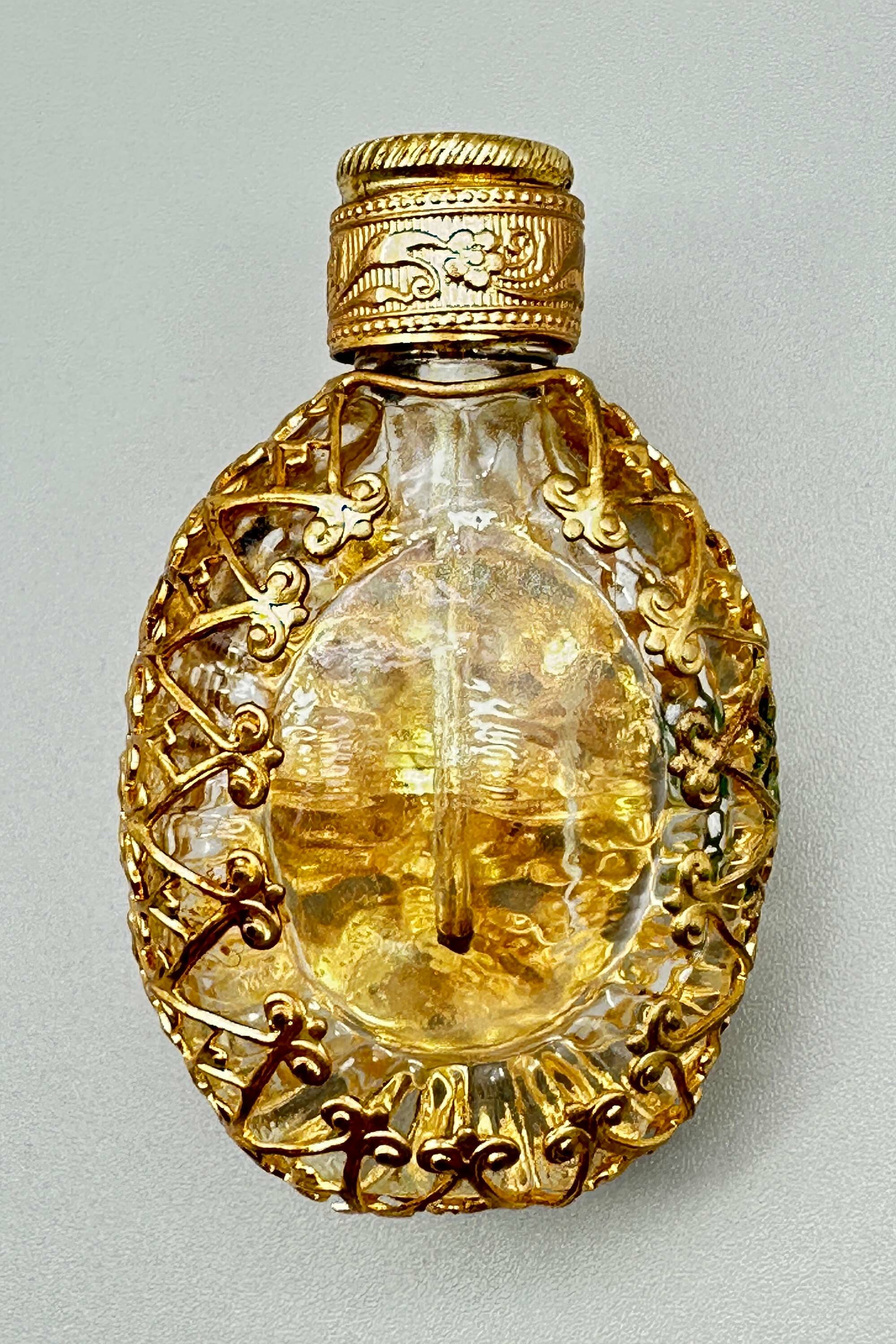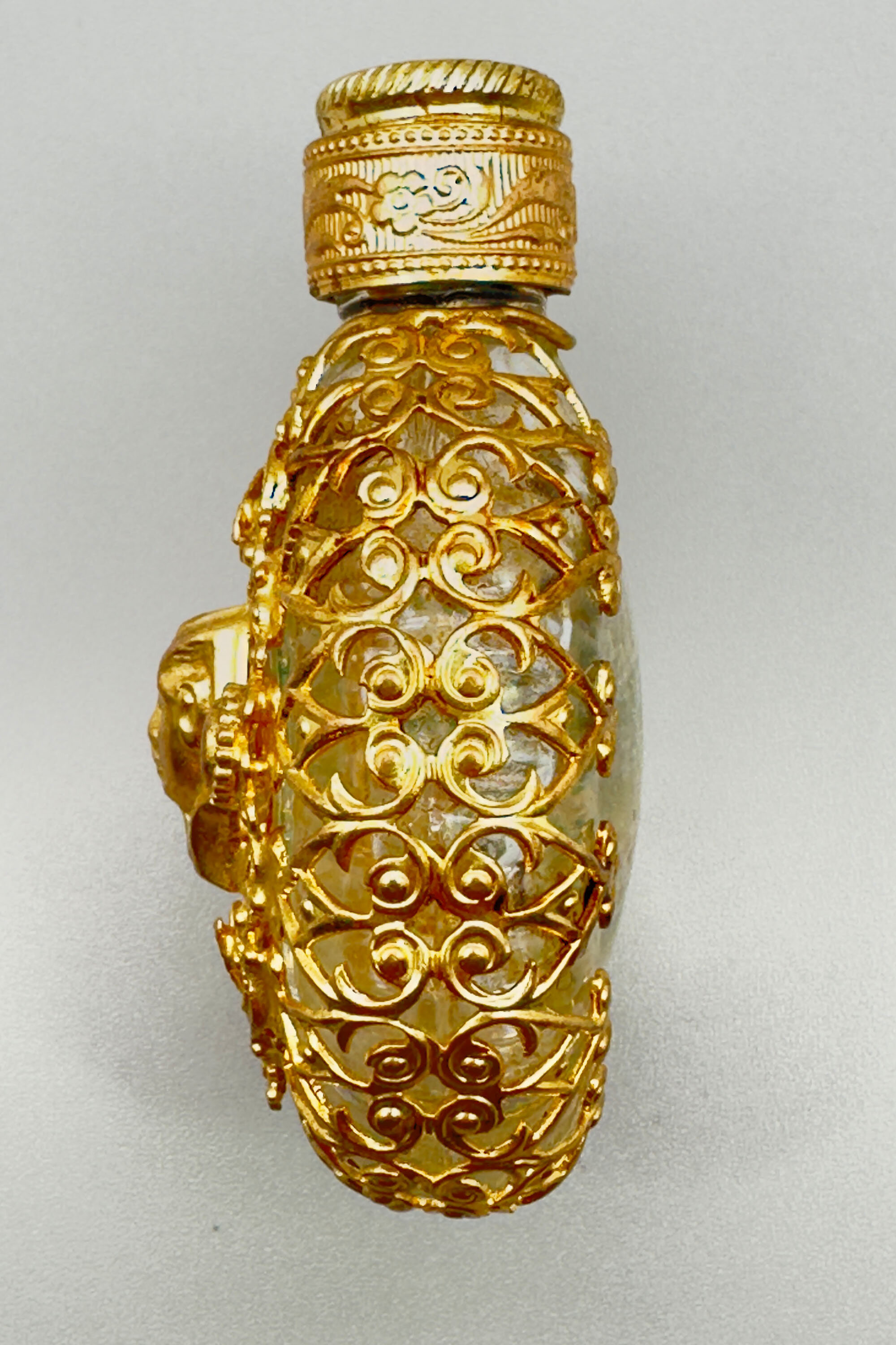 A perfume bottle with a screw top cover, the flattened oval glass body encased in gilt filigree work, the front with a portrait head of Tutankhamun between two falcons representing the Goddess Ra and the reverse with an oval opening revealing the interior of the bottle and the glass wand attached to the cover which is in gilt metal with a screw fitting matching the top of the bottle. The style here is obviously that of the ‘Egyptian Revival’ which became ever more fashionable after the discovery of Tutankhamun’s tomb by the Earl of Carnarvon and Harold Carter in 1922. Glass bottles encased in gilt filigree work are a hallmark of the Czech glassworks and while most incorporate European elements into the decoration there are other examples which are Egyptian Revival in style and so this is most likely what we have here. Dating is probably to the 1970s.| Size: | 60mm x 37.6mm x 27.5mm |