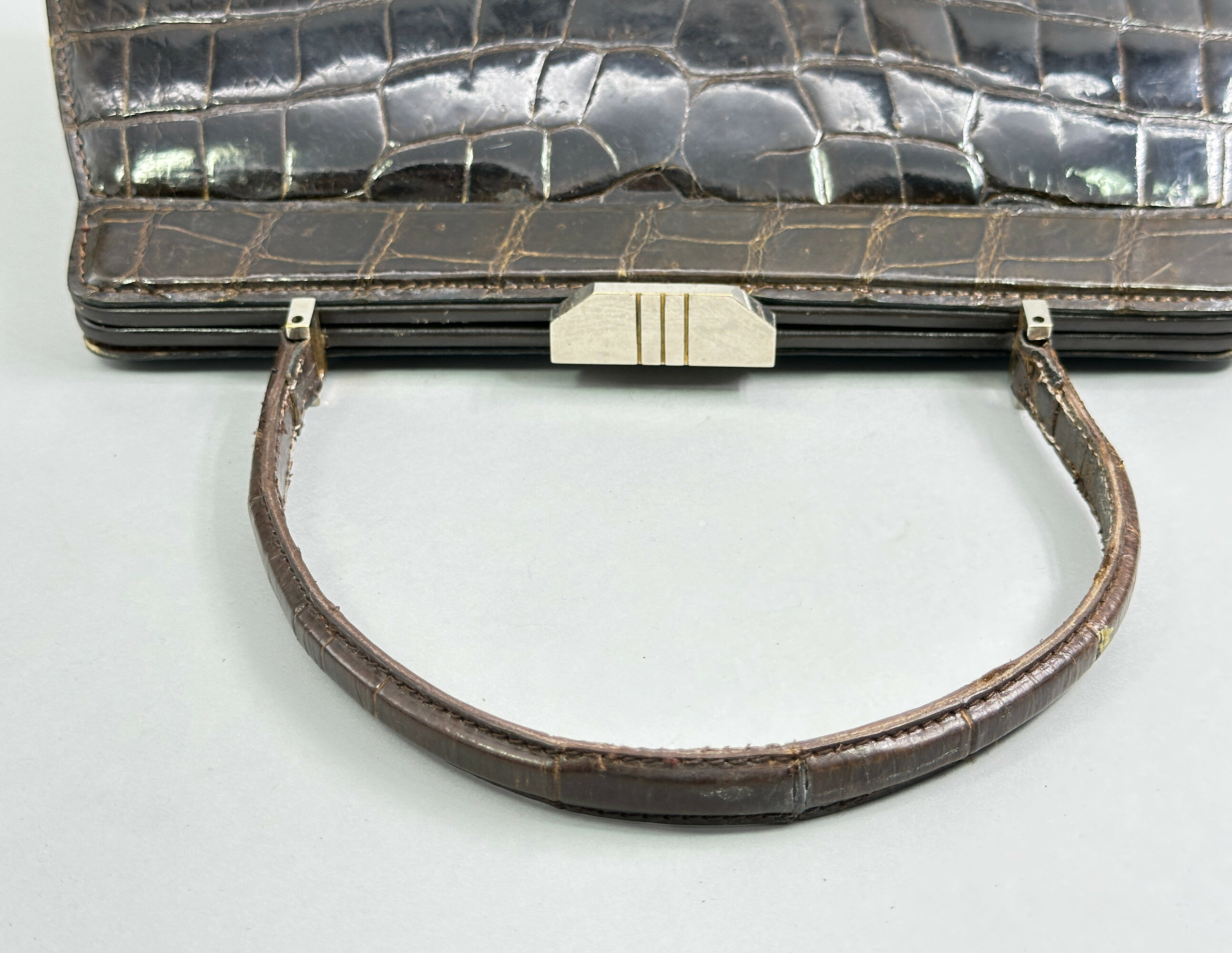 This is a stunning hard side bag that is covered in brown patent croc. It is lined with suede. It is most likely made in England although it is unmarked. The handle has been restored to it's original beauty and is ready for daily use.| Size: | Length 31cm (max), Ht 17.5cm (excluding clasp), Depth 6.5cm (max) |